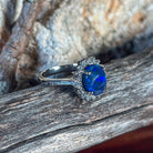 Indulge in the opulence of our Platinum cluster ring featuring a striking Black Opal, 18 dazzling diamonds totaling 0.35ct, and a unique engagement ring design. This luxurious piece is sure to make a statement and add a touch of elegance to any outfit.