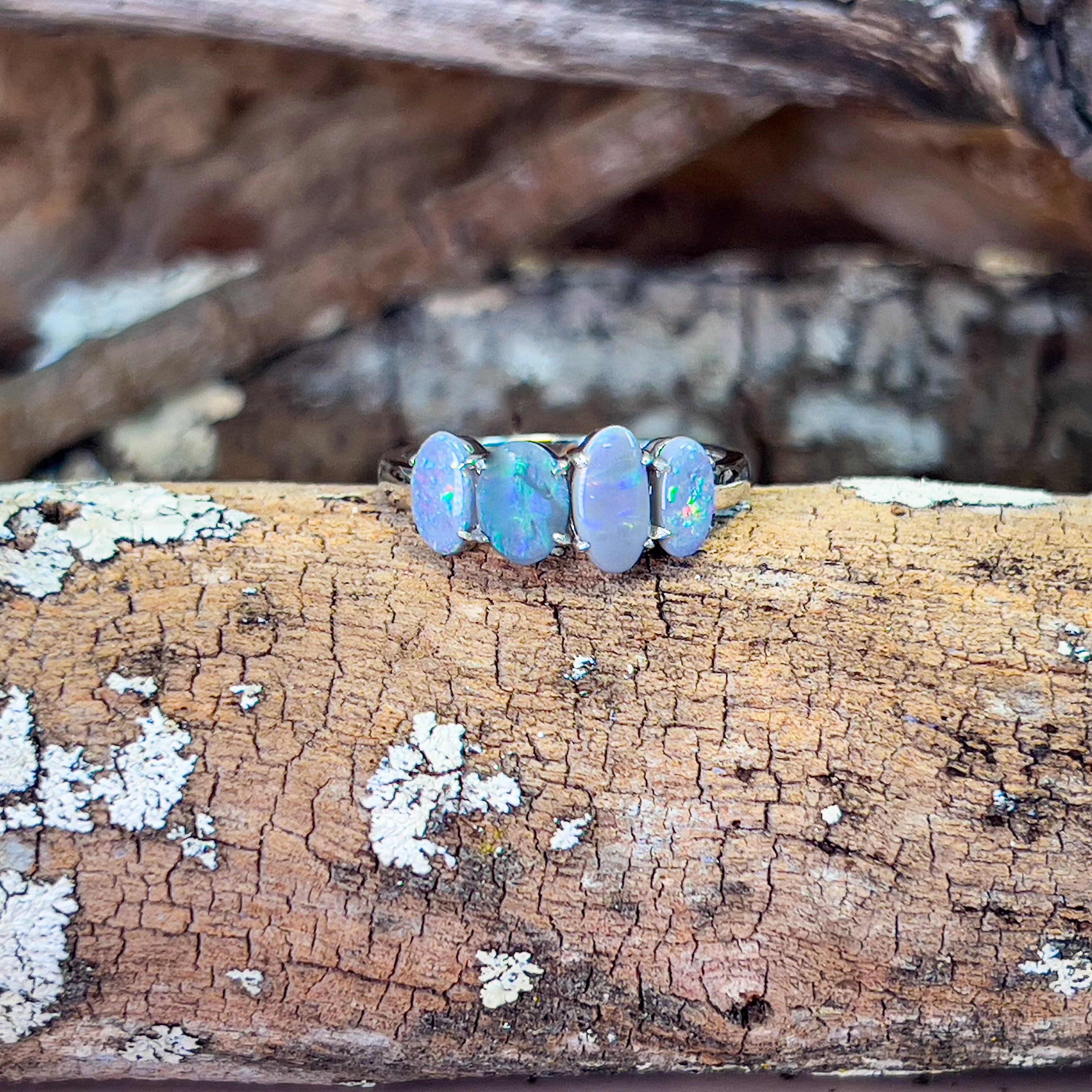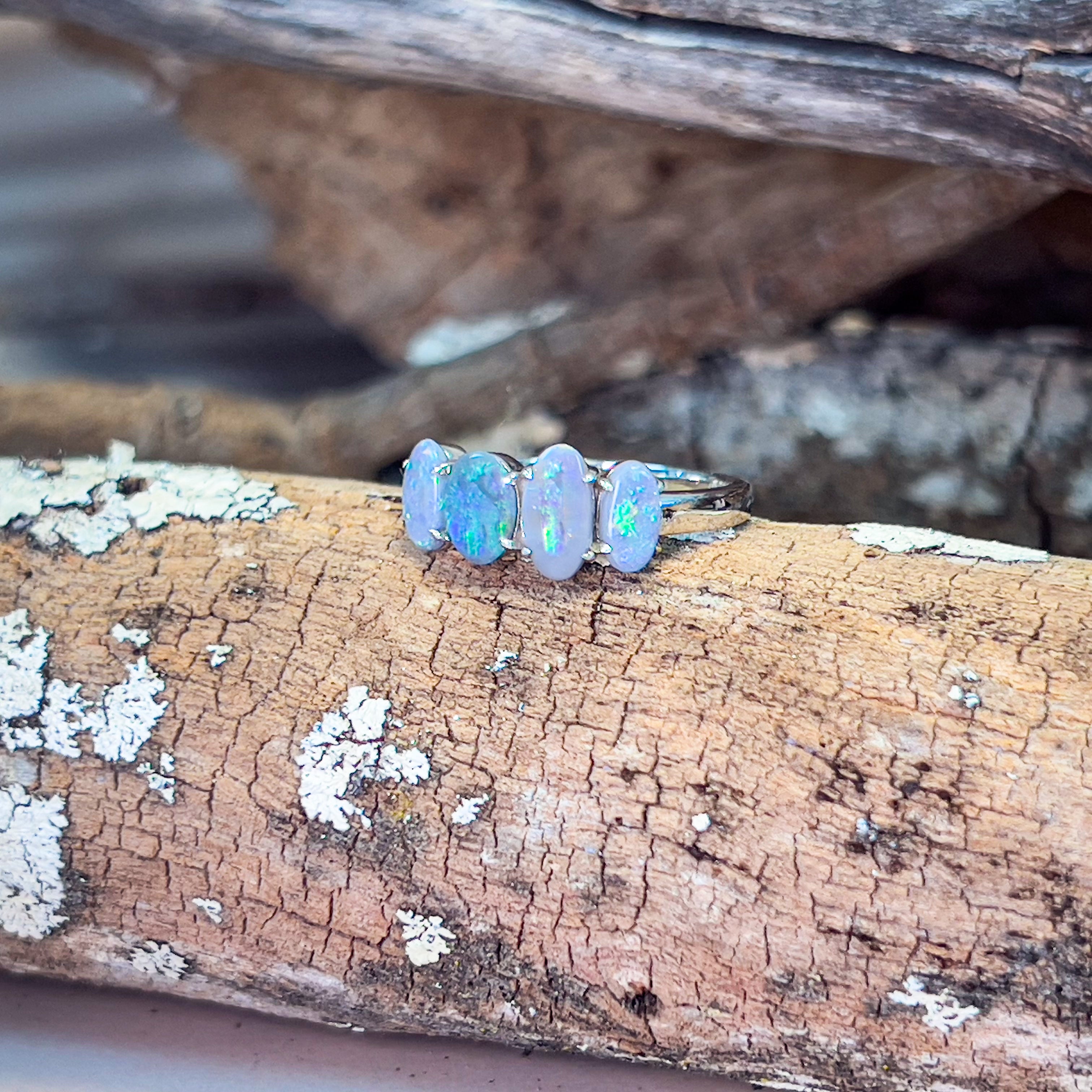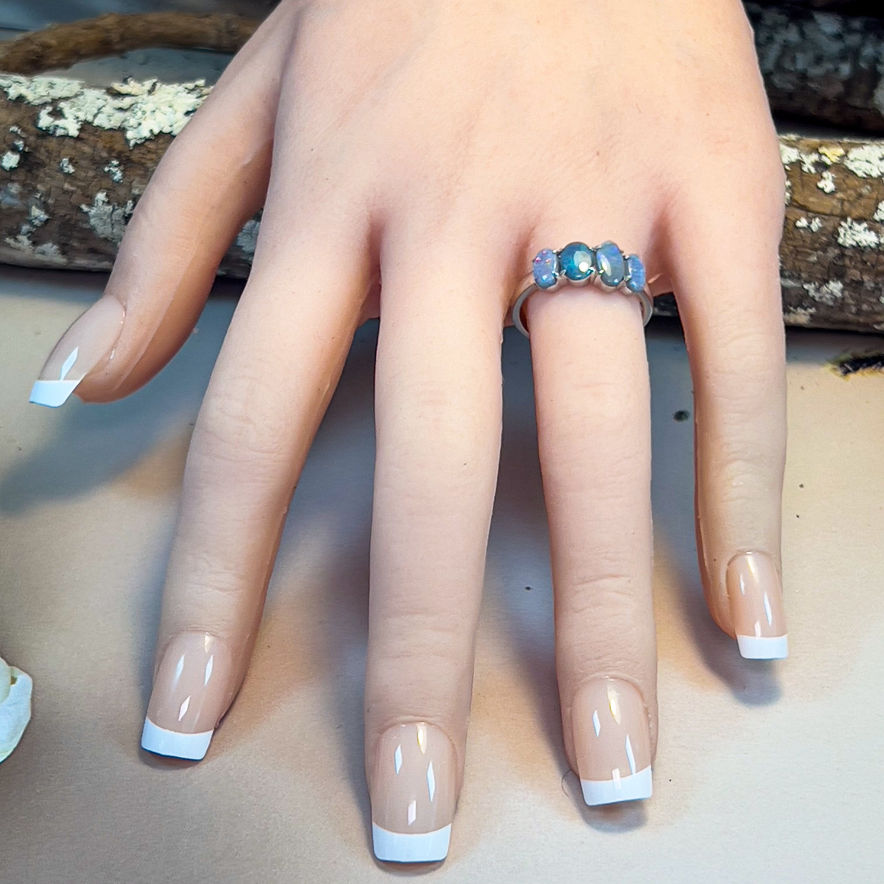 This stunning sterling silver eternity style Black Opal ring is perfect for the purple lover in your life. The unique opal design will catch anyone's eye and make for a beautiful addition to any jewelry collection. Hand-crafted with care, this ring will make a thoughtful and stylish gift.