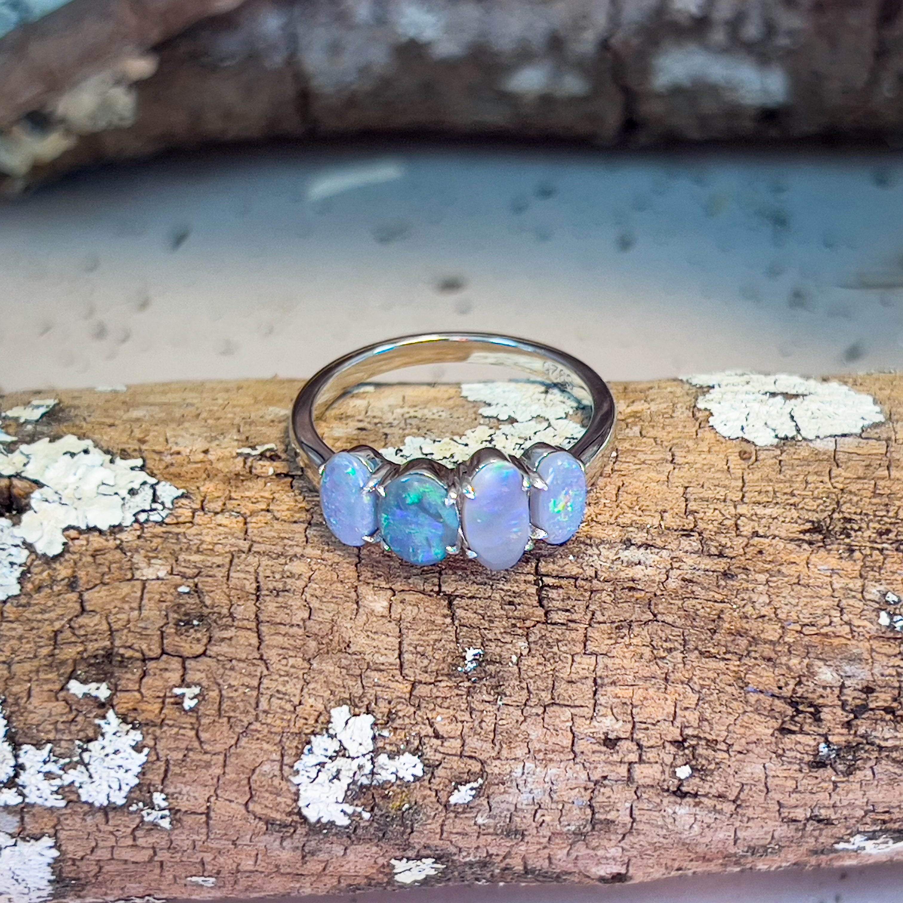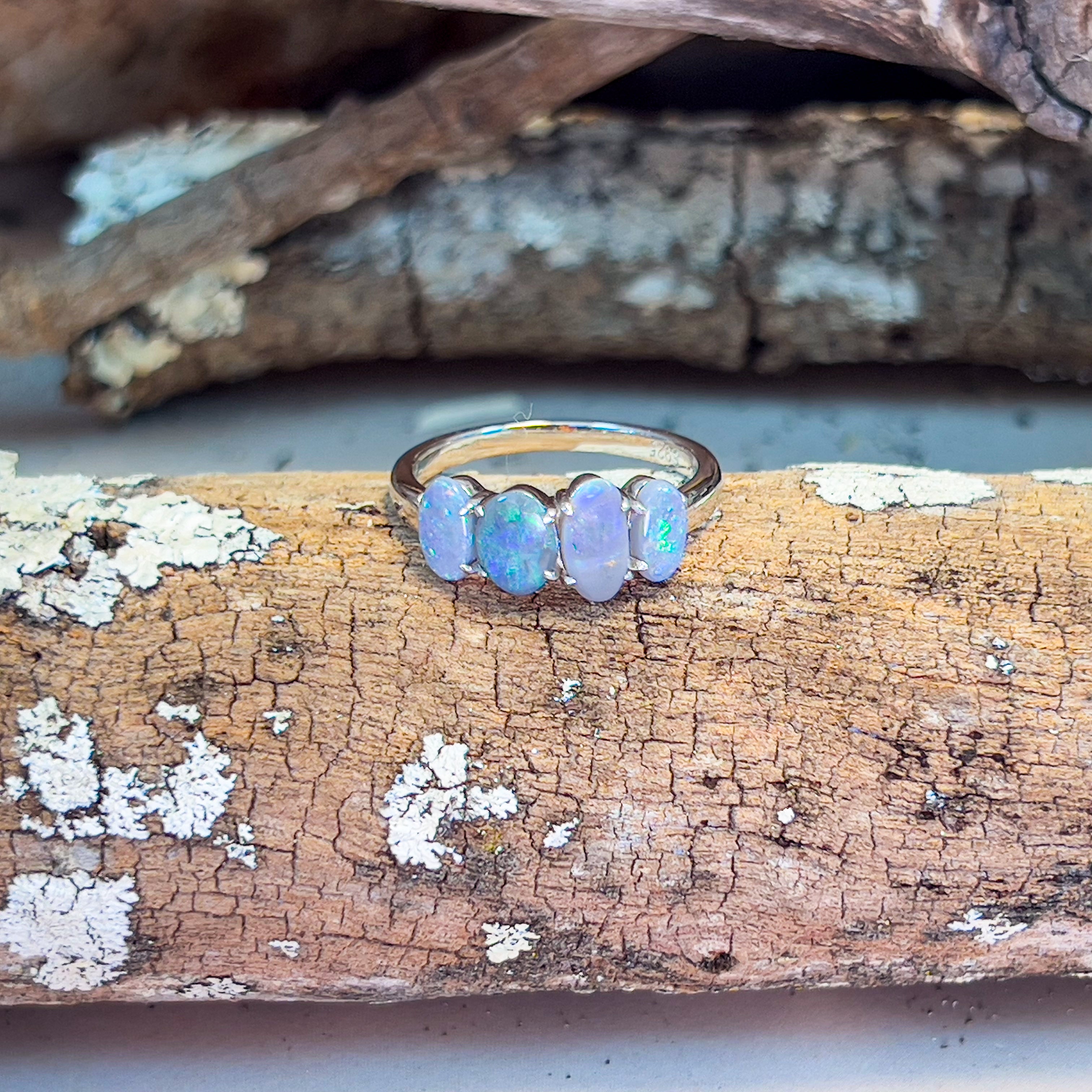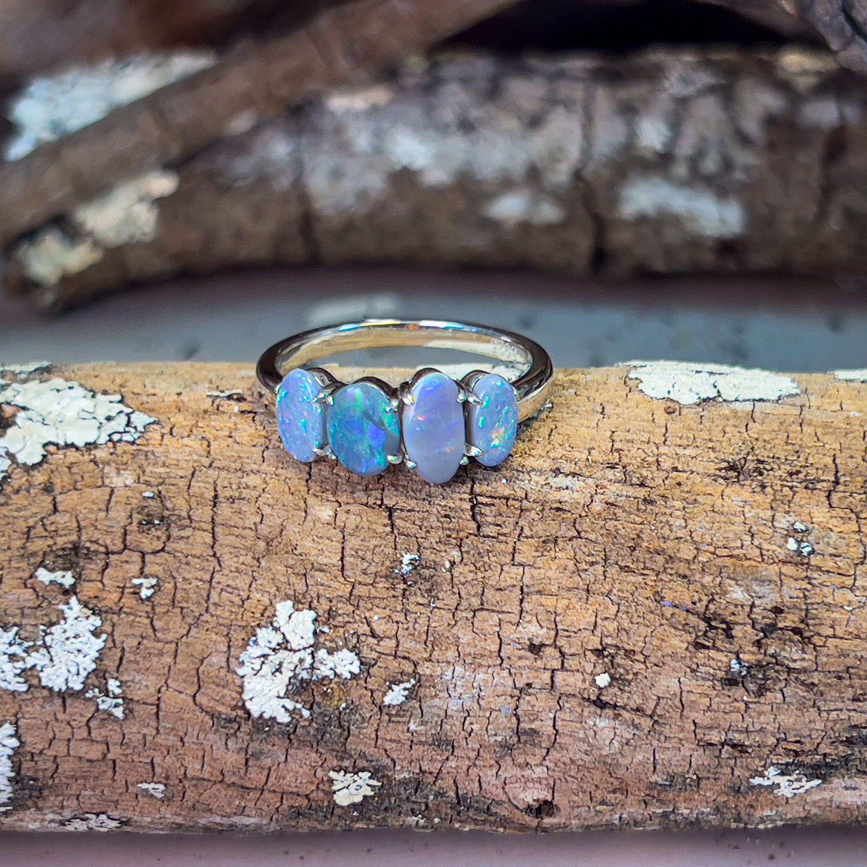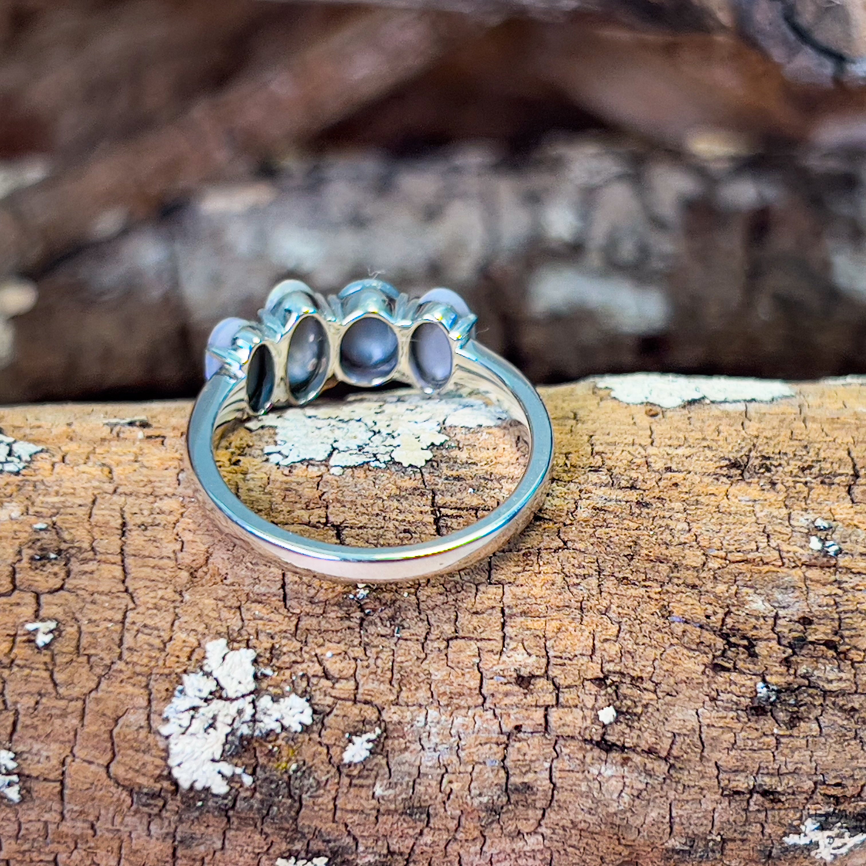 This stunning sterling silver eternity style Black Opal ring is perfect for the purple lover in your life. The unique opal design will catch anyone's eye and make for a beautiful addition to any jewelry collection. Hand-crafted with care, this ring will make a thoughtful and stylish gift.