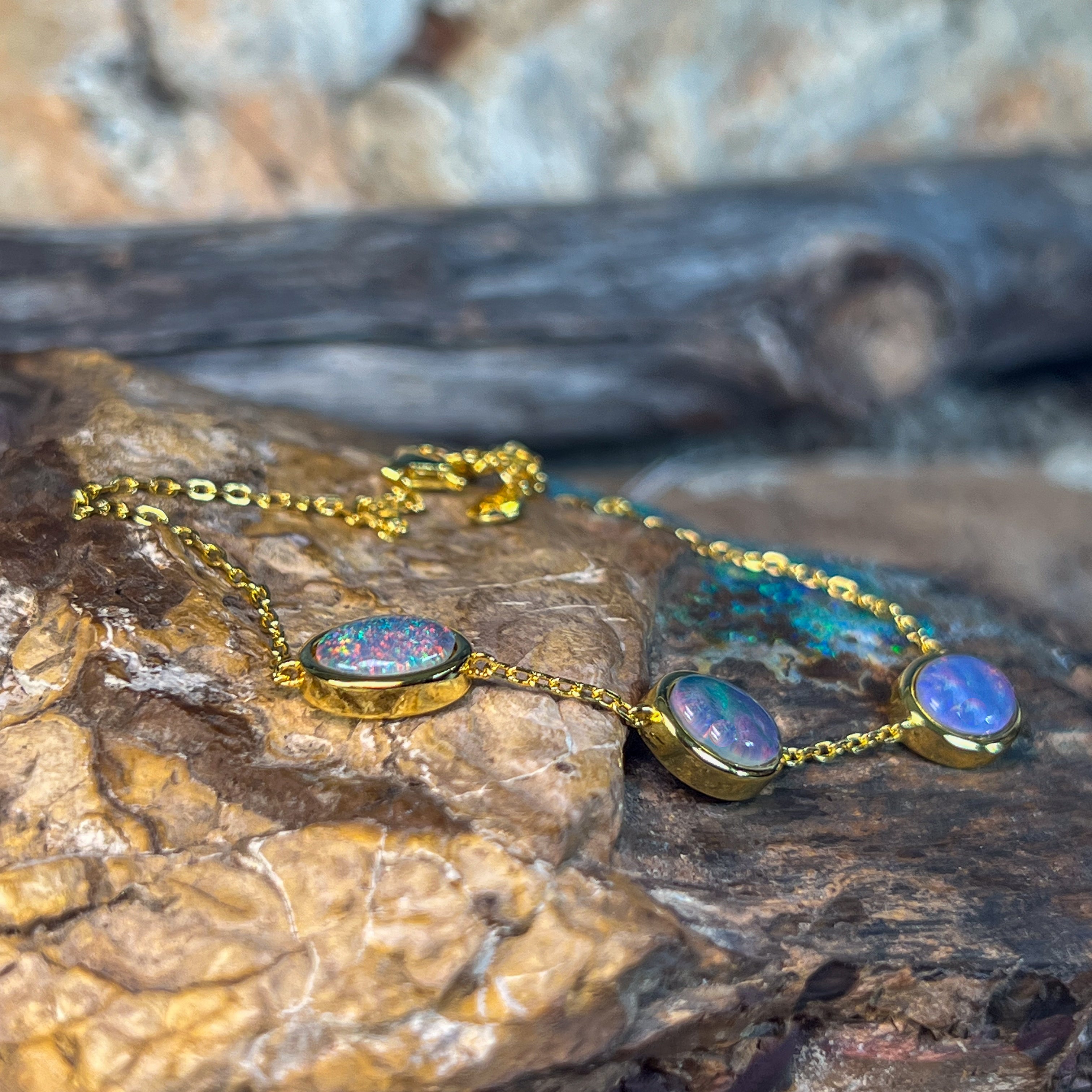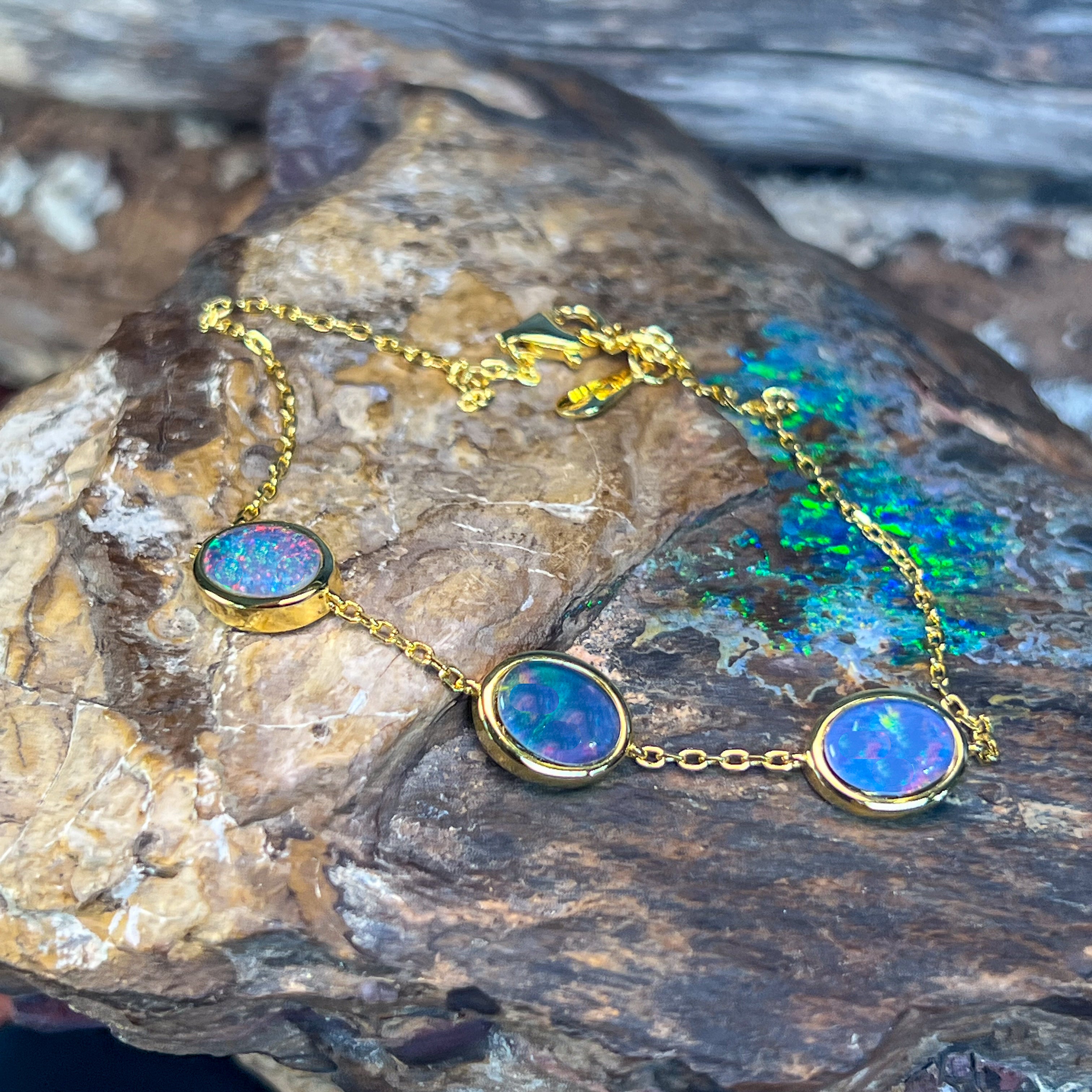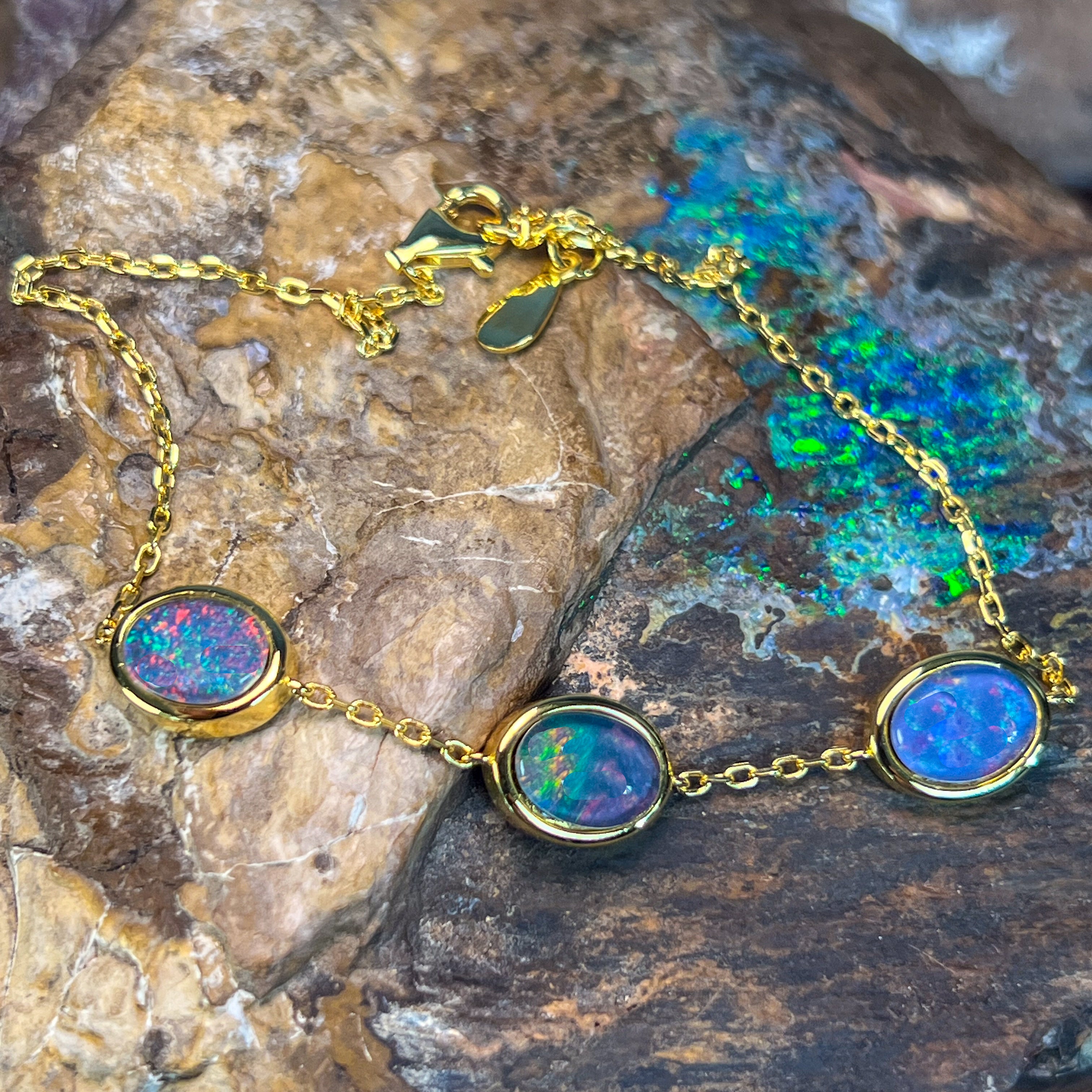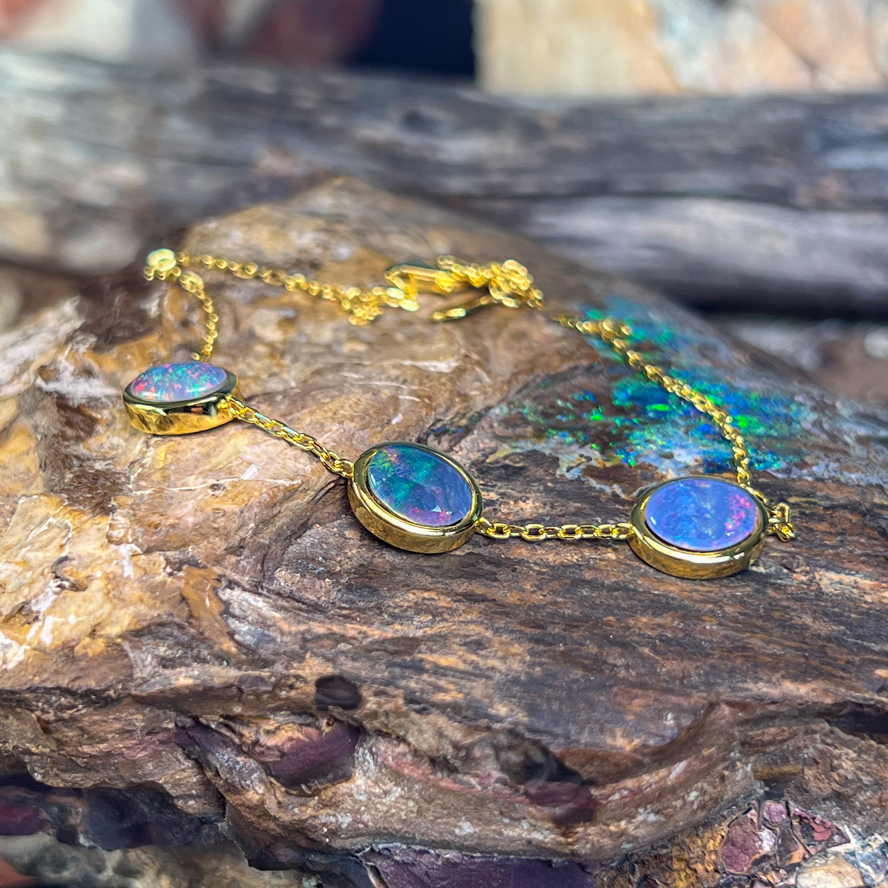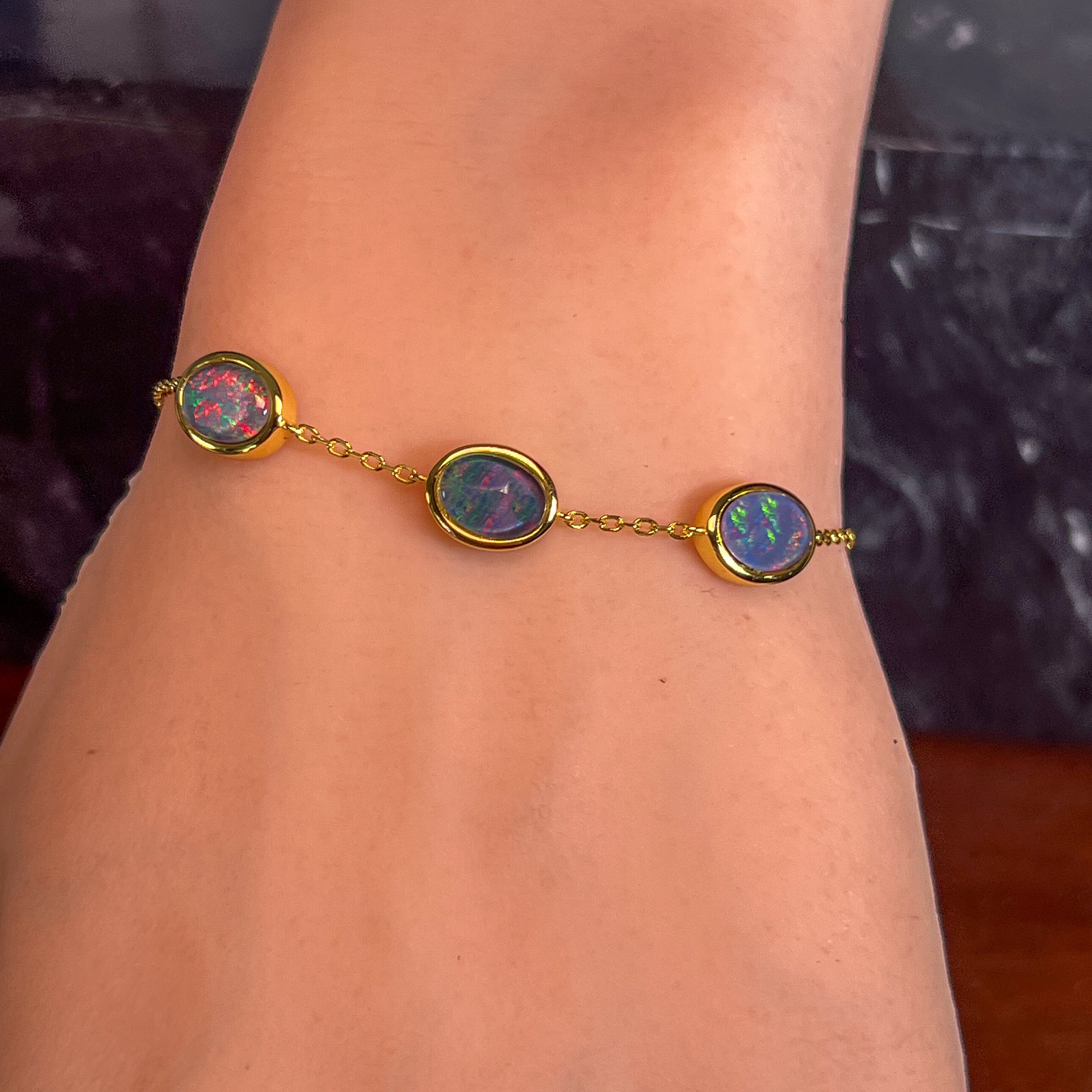 One Gold Plated Sterling Silver bracelet featuring three Australian Opal Triplets spaced elegantly along the band. Each opal measures 8x6mm, showcasing the natural play-of-colour these gemstones are renowned for. The bracelet adjusts from 19.5cm to 21.5cm, making it comfortable for most wrist sizes. Weighing just 3.35g, it's lightweight and perfect for everyday wear or special occasions. A beautiful piece that combines the warmth of gold plating with the mesmerising beauty of genuine Australian opals.