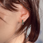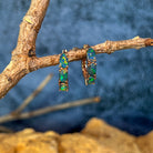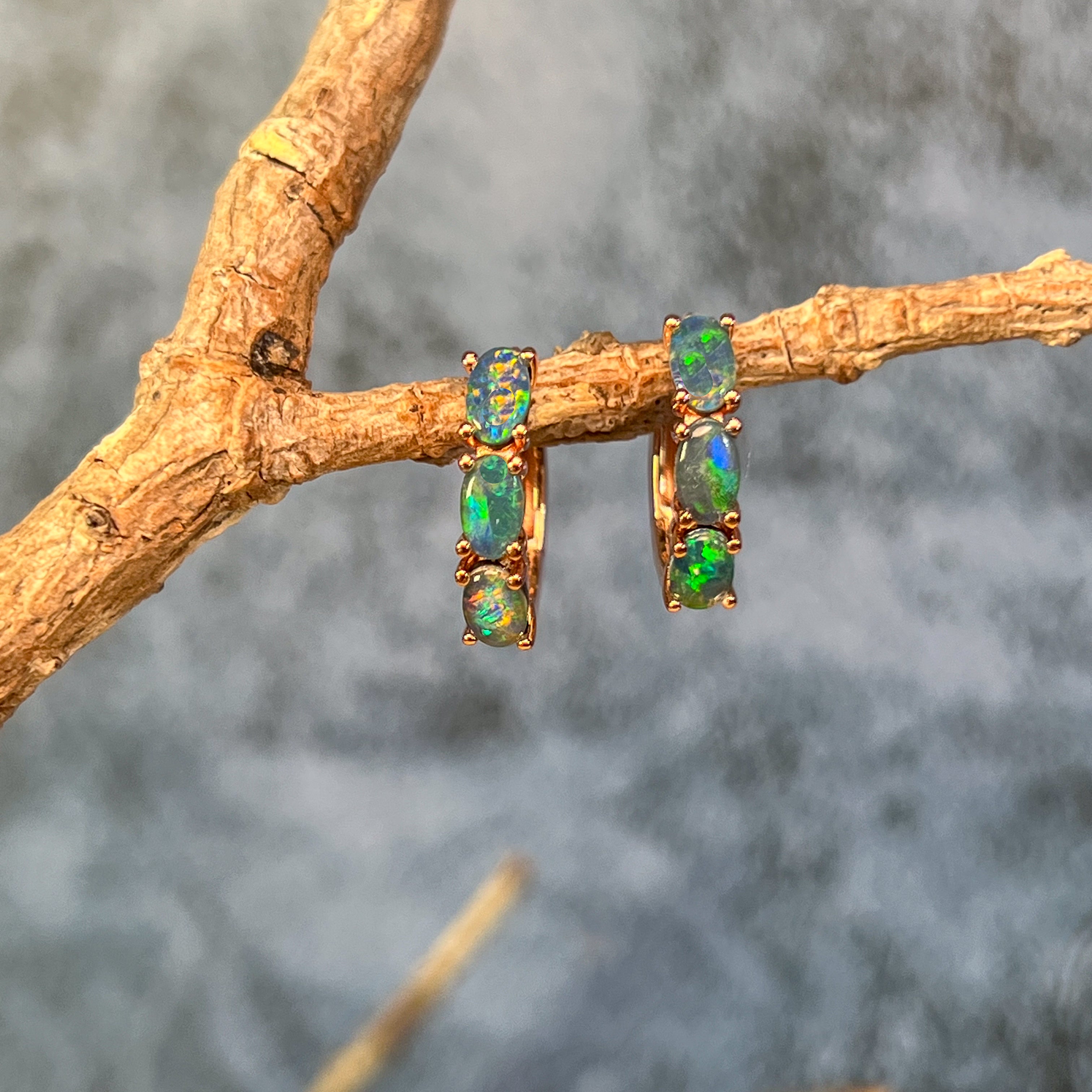 Elegant rose gold plated sterling silver huggie earrings featuring authentic Australian opal triplets. Each pair showcases a vibrant 5x3mm oval opal displaying mesmerising pink, blue, green, and red hues. The compact 15.5mm length makes them perfect for everyday wear or layering. Lightweight at just 1.9g, these versatile studs complement any style while celebrating the natural beauty of Australian opals.