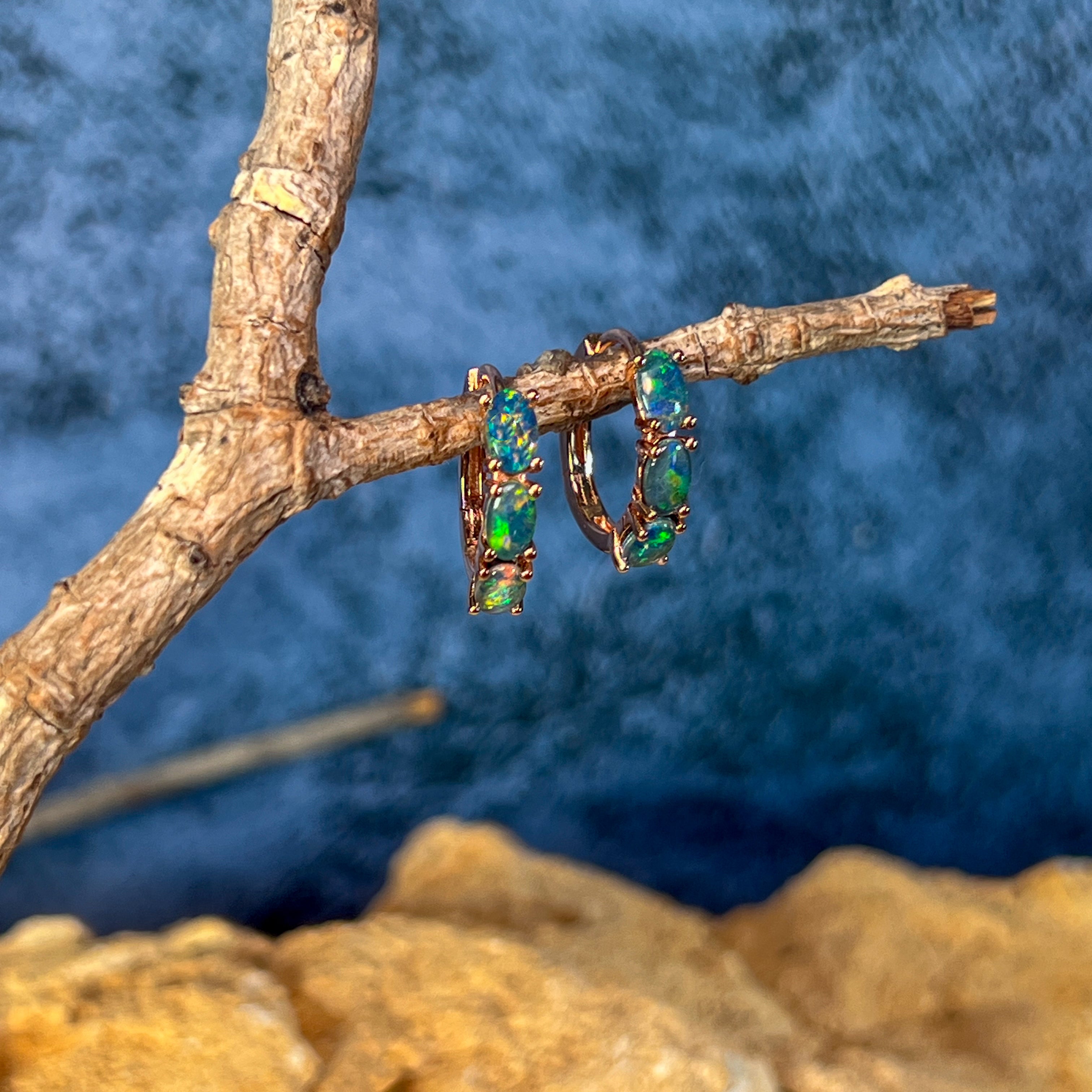Rose Gold plated silver huggie opal triplet 5x3mm earrings