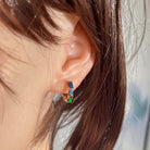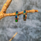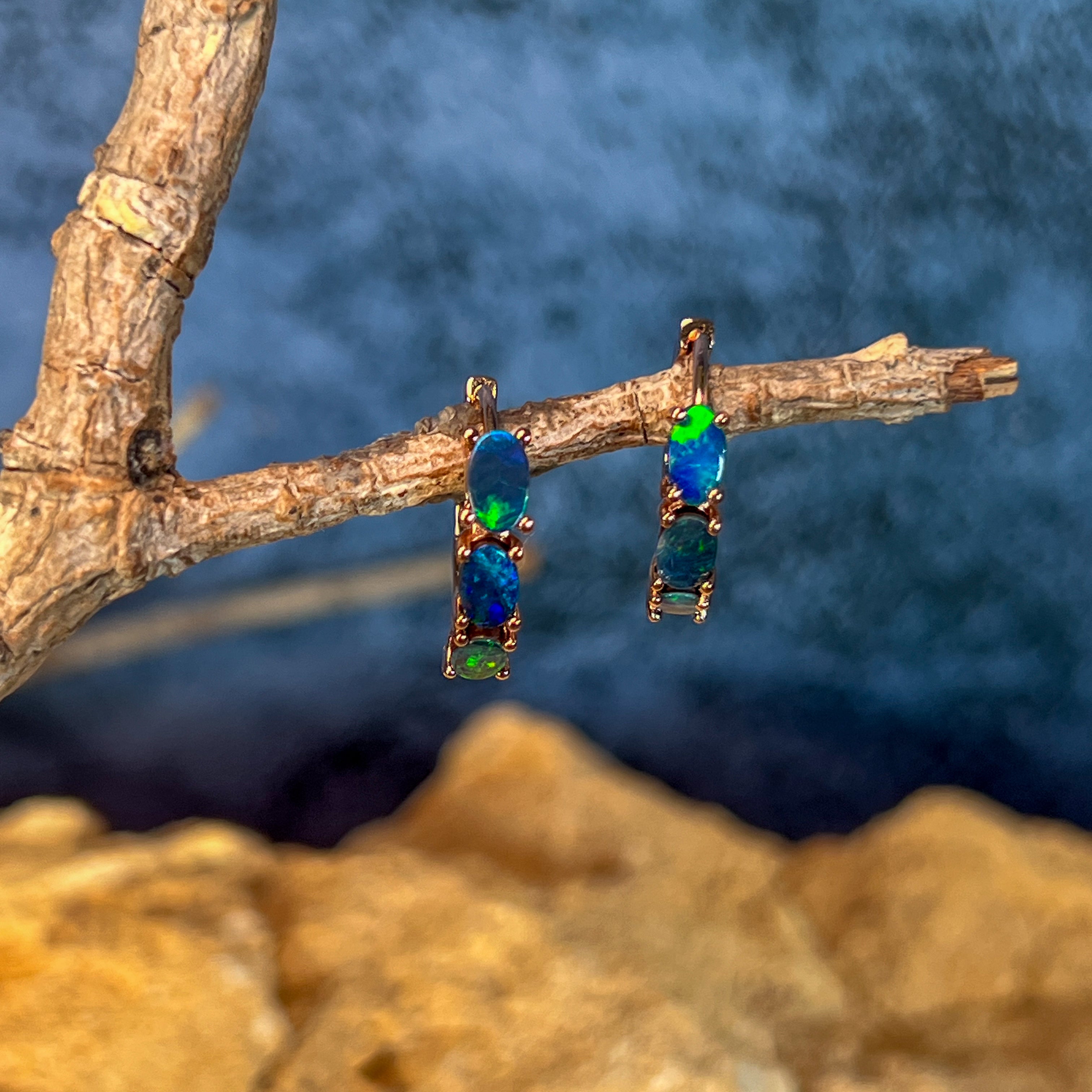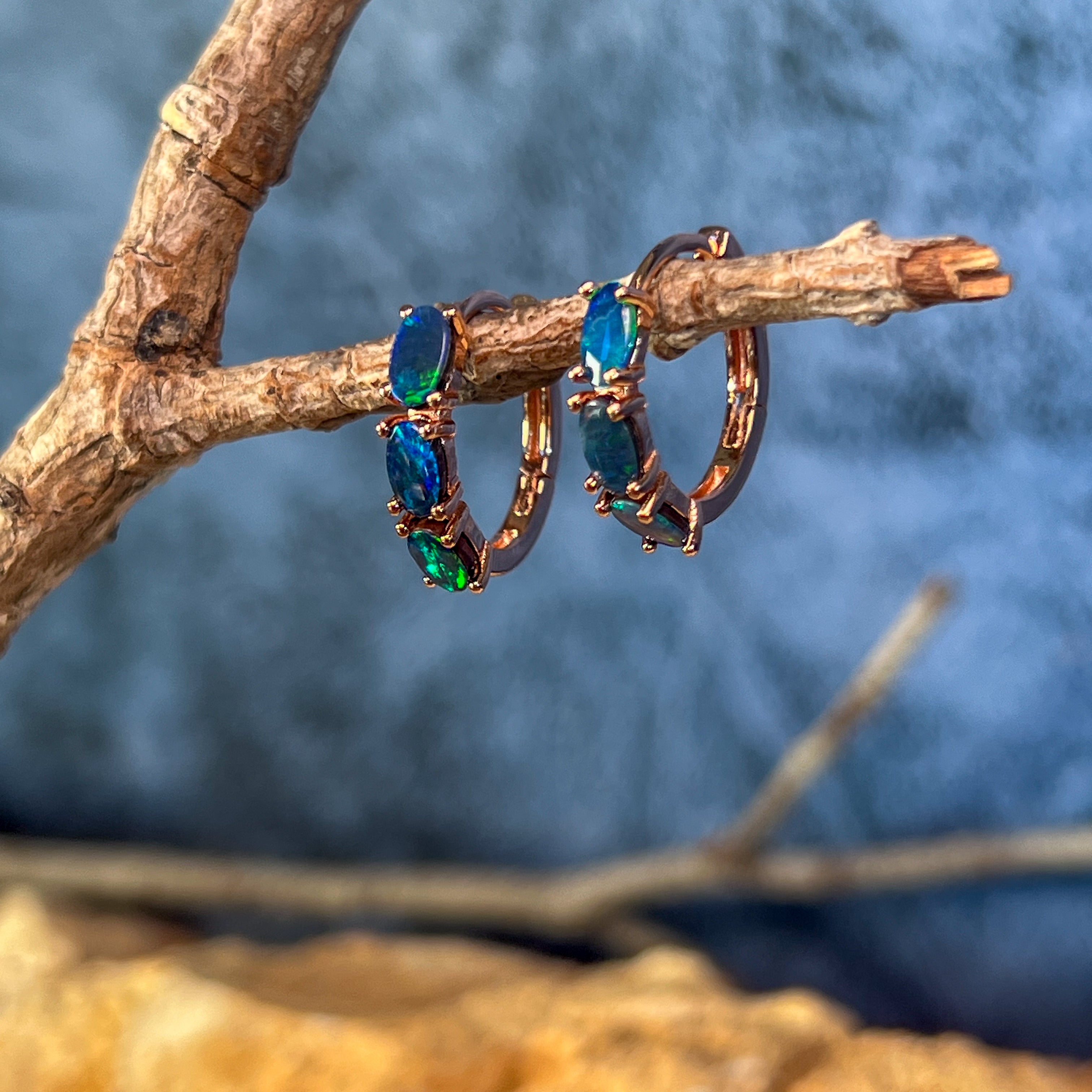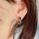 One pair of Rose Gold Plated Sterling Silver huggie earrings featuring stunning Australian Opal Doublets. Each oval opal measures 5x3mm and displays a mesmerizing play of vibrant orange, blue, and green hues that catch the light beautifully. The compact 15.5mm length makes them perfect for everyday wear or layering. Lightweight at just 1.9g, these elegant huggies combine timeless design with the natural fire of genuine Australian opals.
