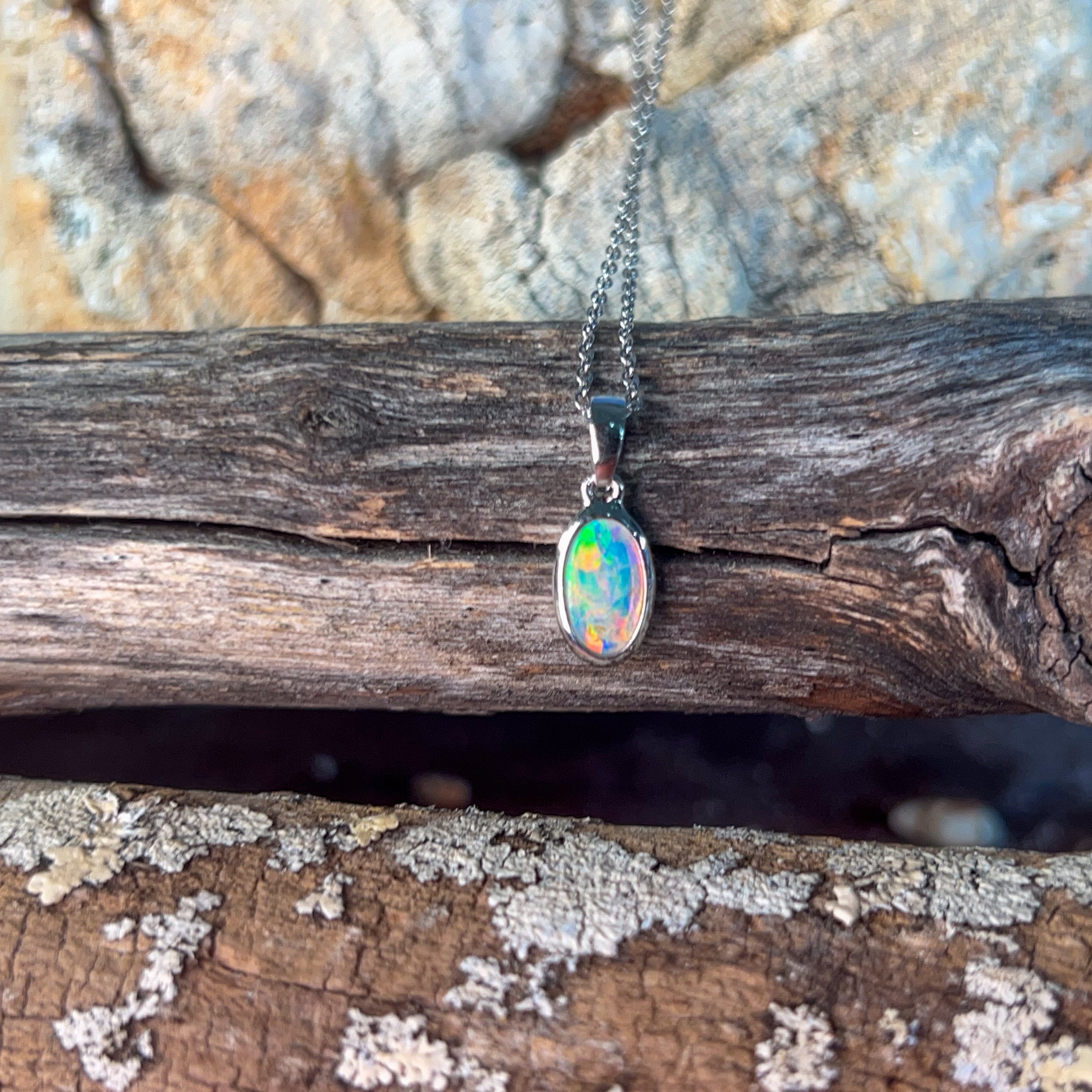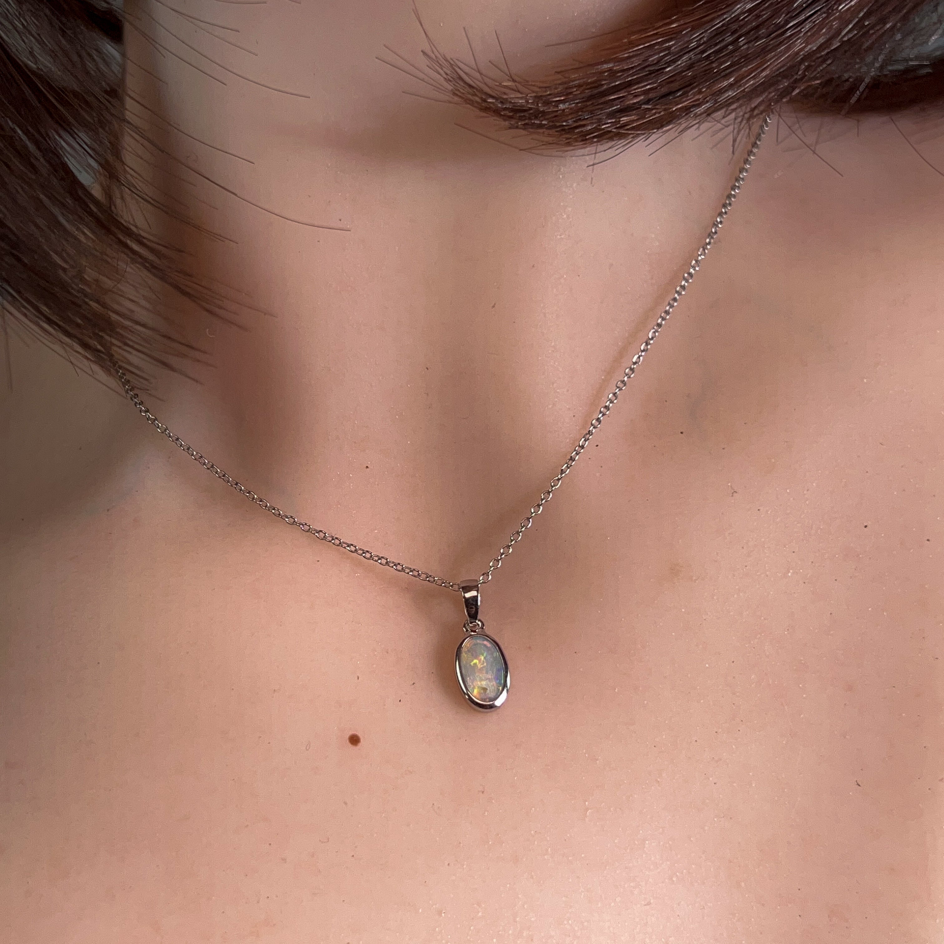 Elevate your everyday elegance with this exquisite sterling silver pendant featuring a stunning 0.5ct black opal in a refined oval setting. The delicate design captures light beautifully, showcasing the opal's mesmerizing play of colour in subtle, sophisticated tones. Perfect for layering or wearing solo, this dainty piece adds a touch of timeless luxury to any occasion—from casual days to special evenings. Crafted with precision in quality sterling silver, it's a versatile treasure you'll reach for again and again.