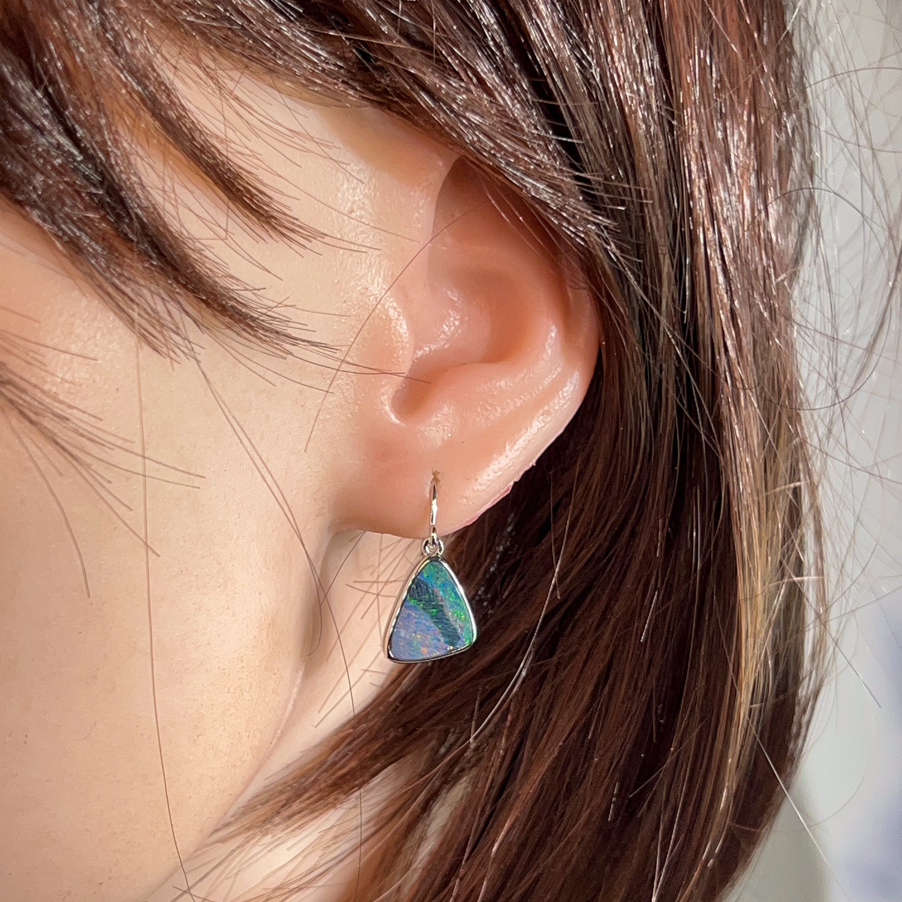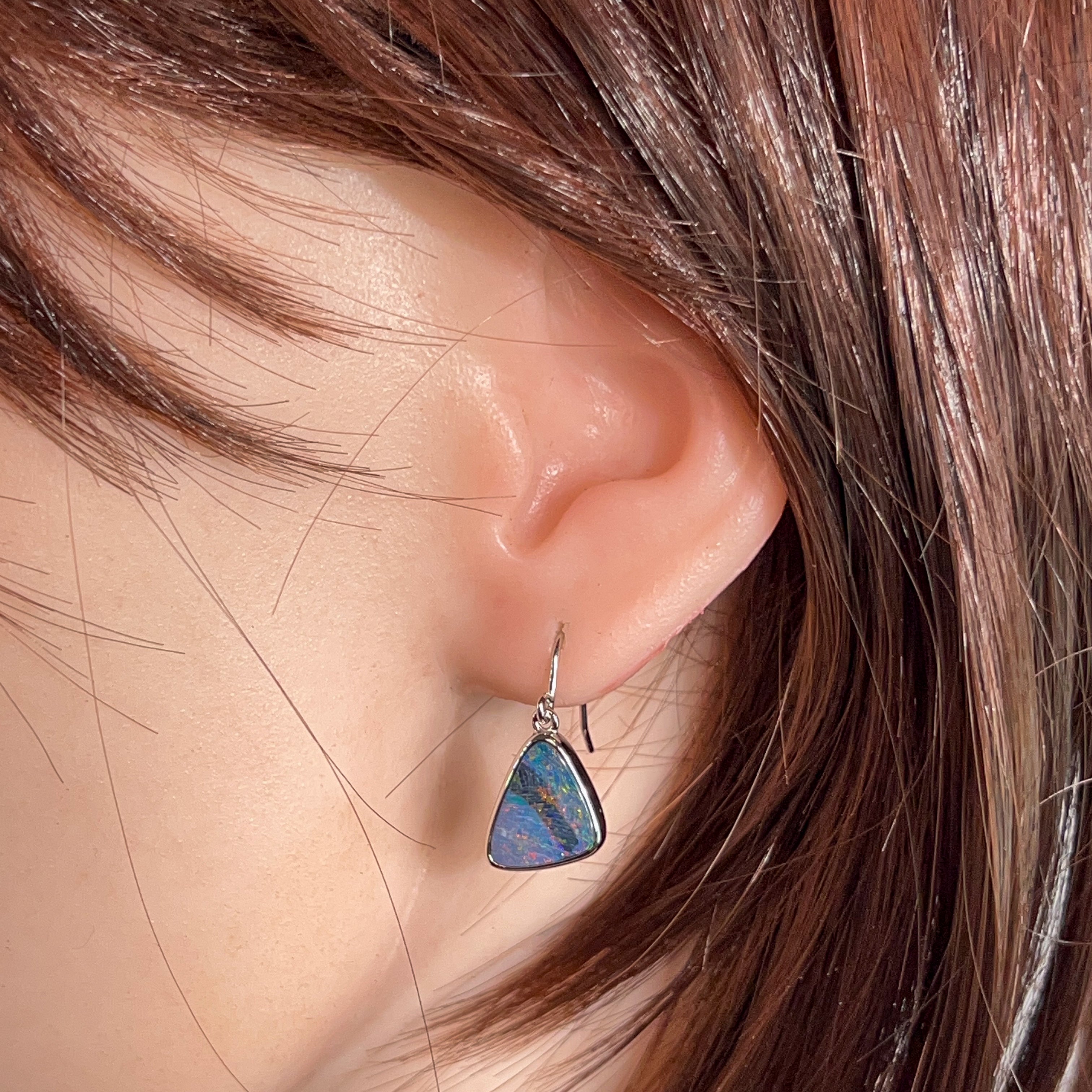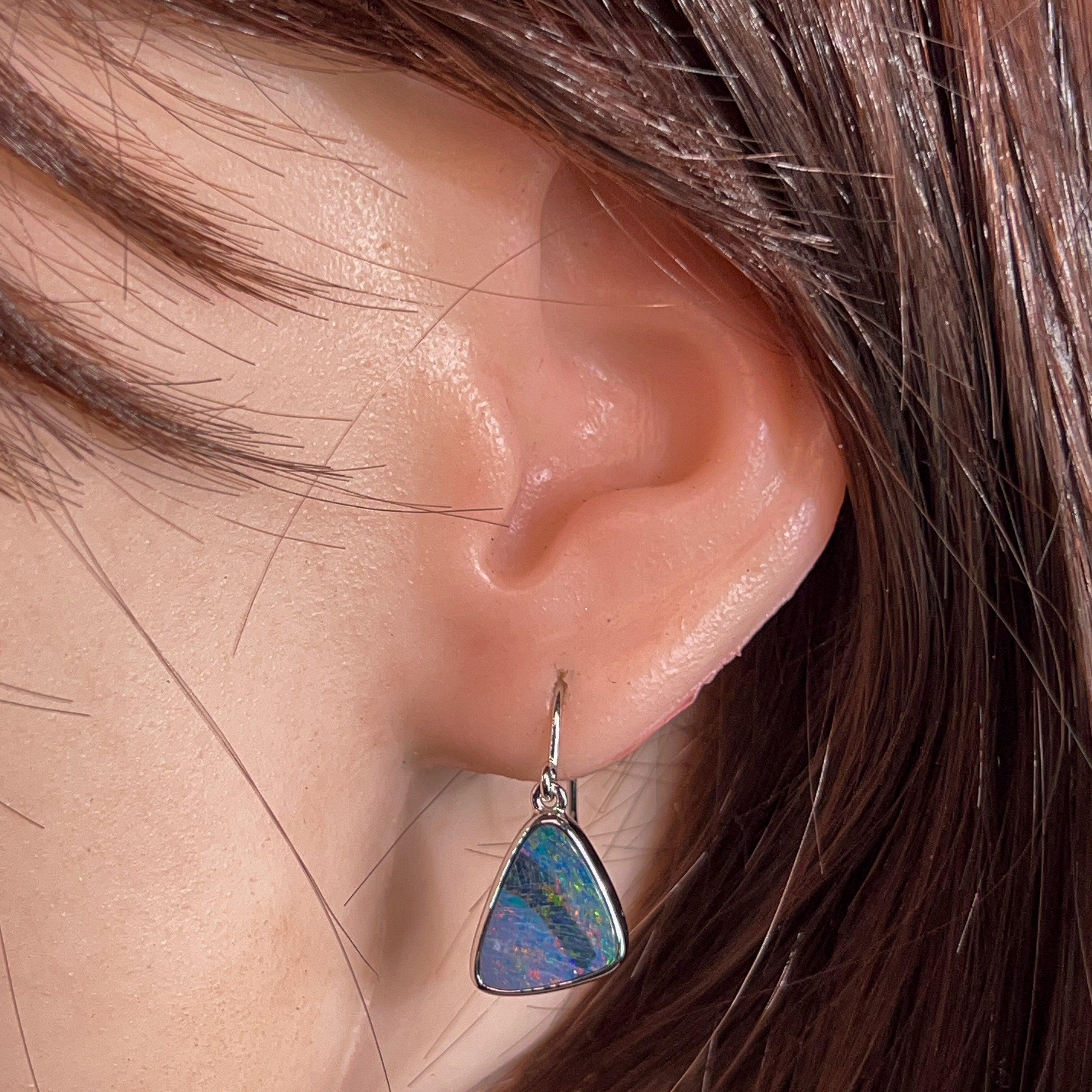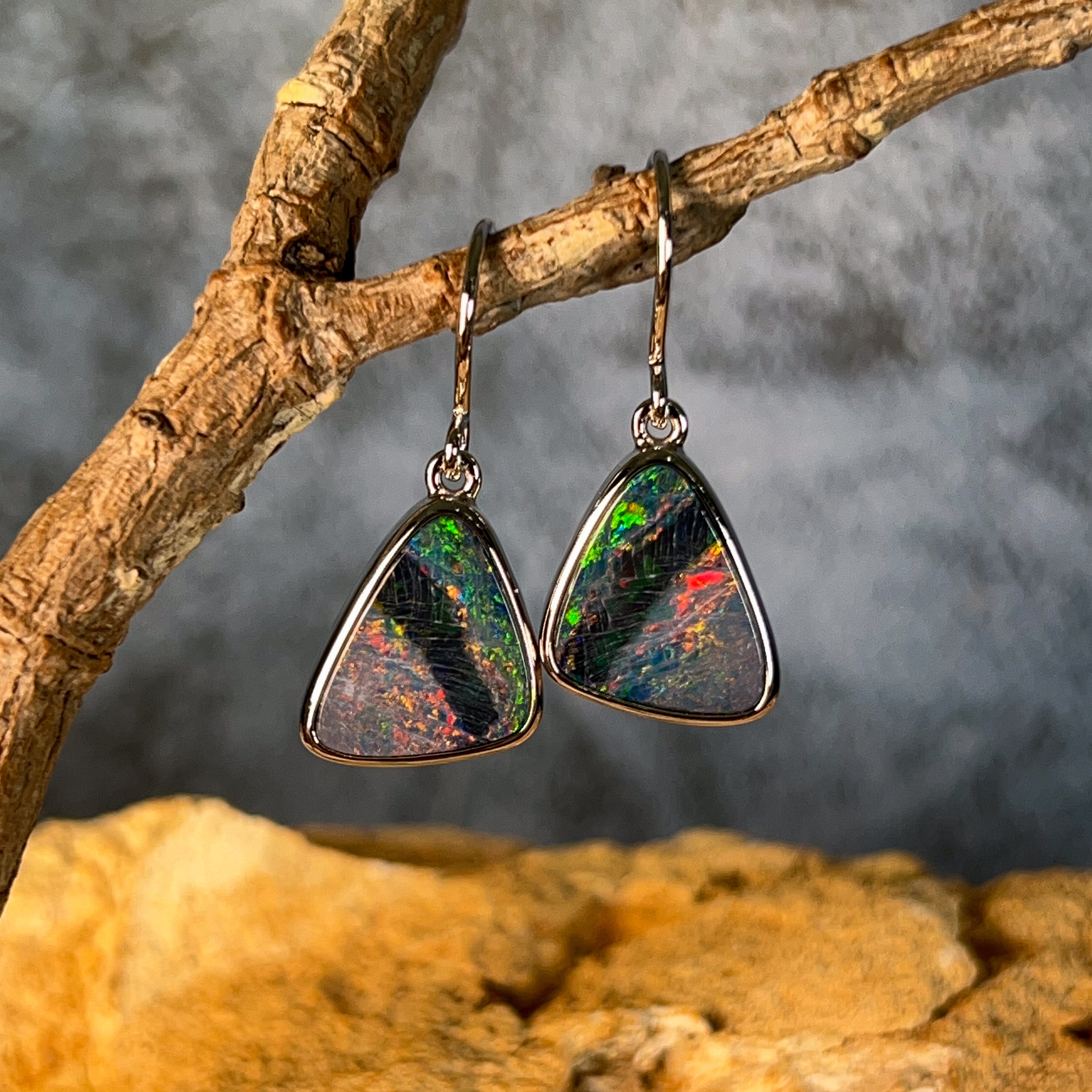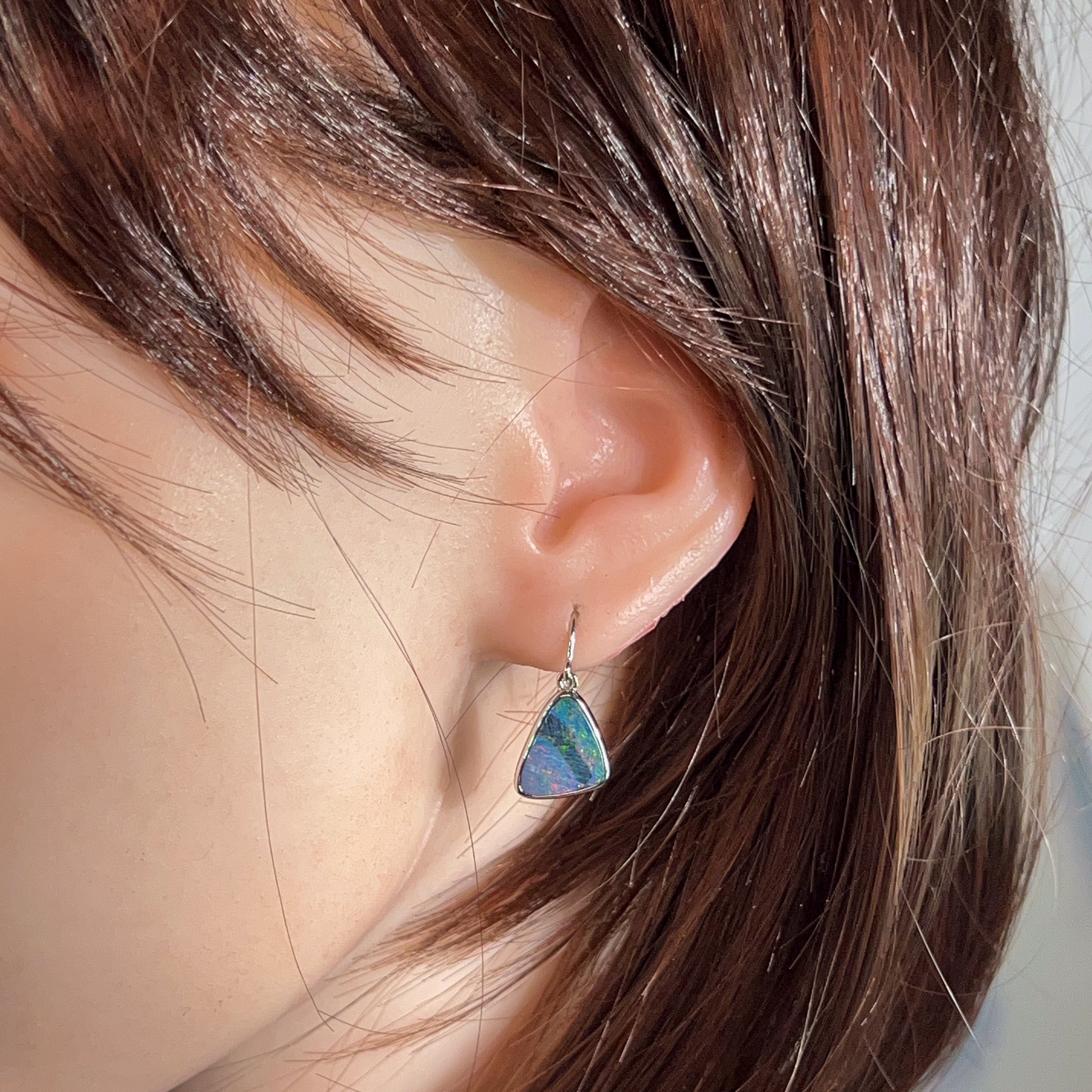 Elevate your everyday elegance with these stunning sterling silver triangle opal doublet earrings. Featuring 5.38 carats of mesmerising opal, each piece showcases nature's most captivating play of colour in a contemporary geometric design. The lightweight dangling style moves gracefully with you, while the premium sterling silver setting ensures lasting durability and timeless appeal. Perfect for those who appreciate modern sophistication with a touch of natural wonder. A versatile addition to any jewellery collection that effortlessly transitions from day to night.