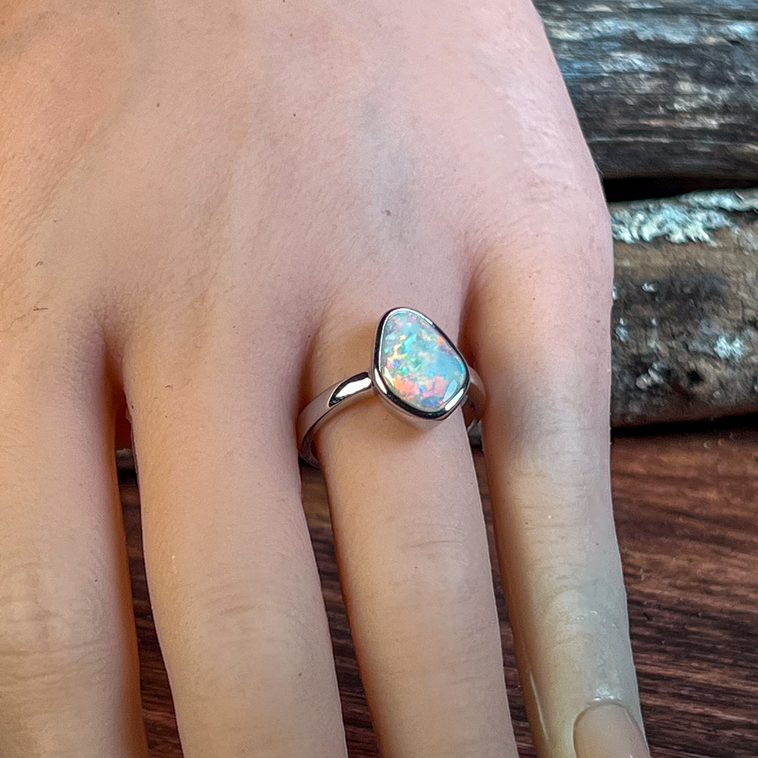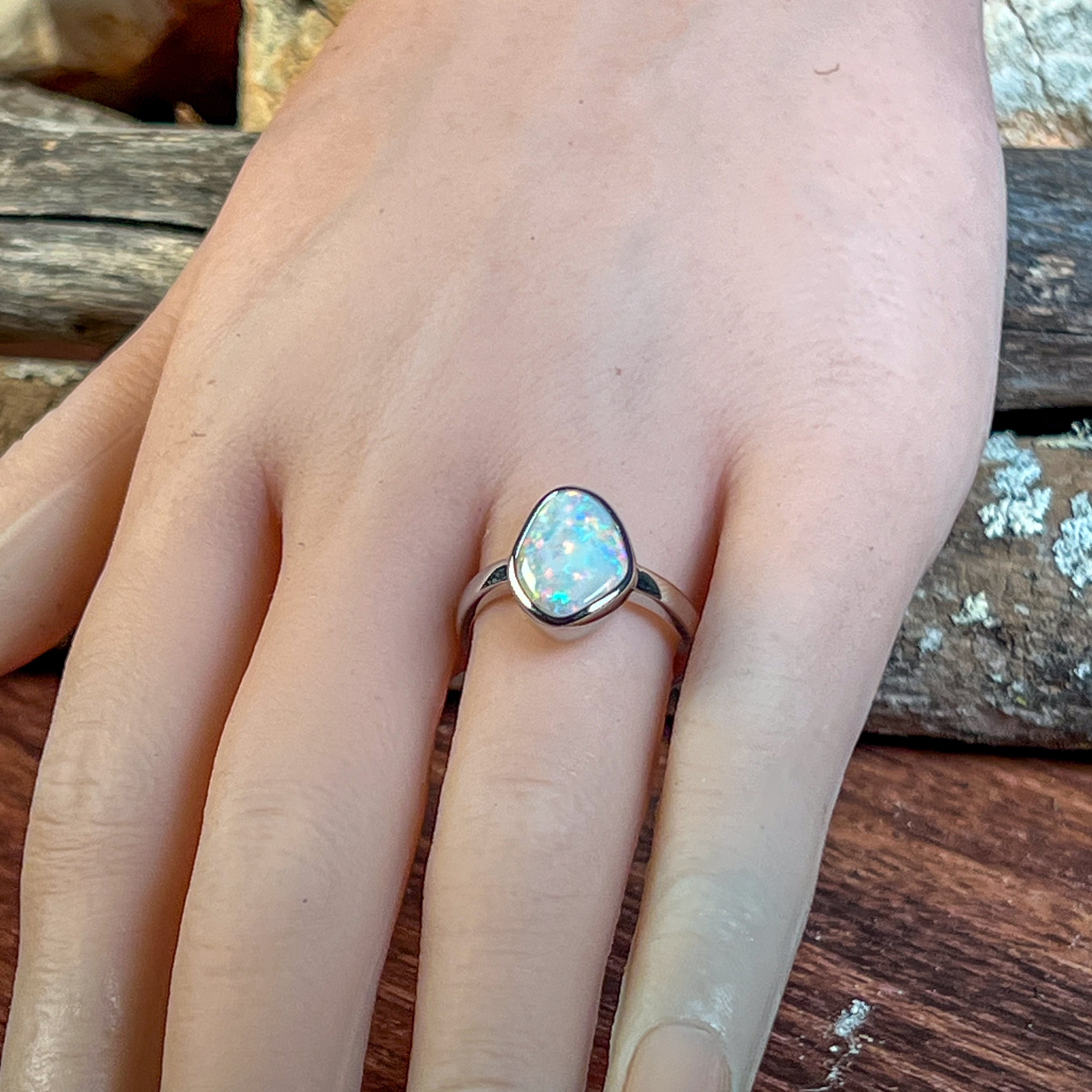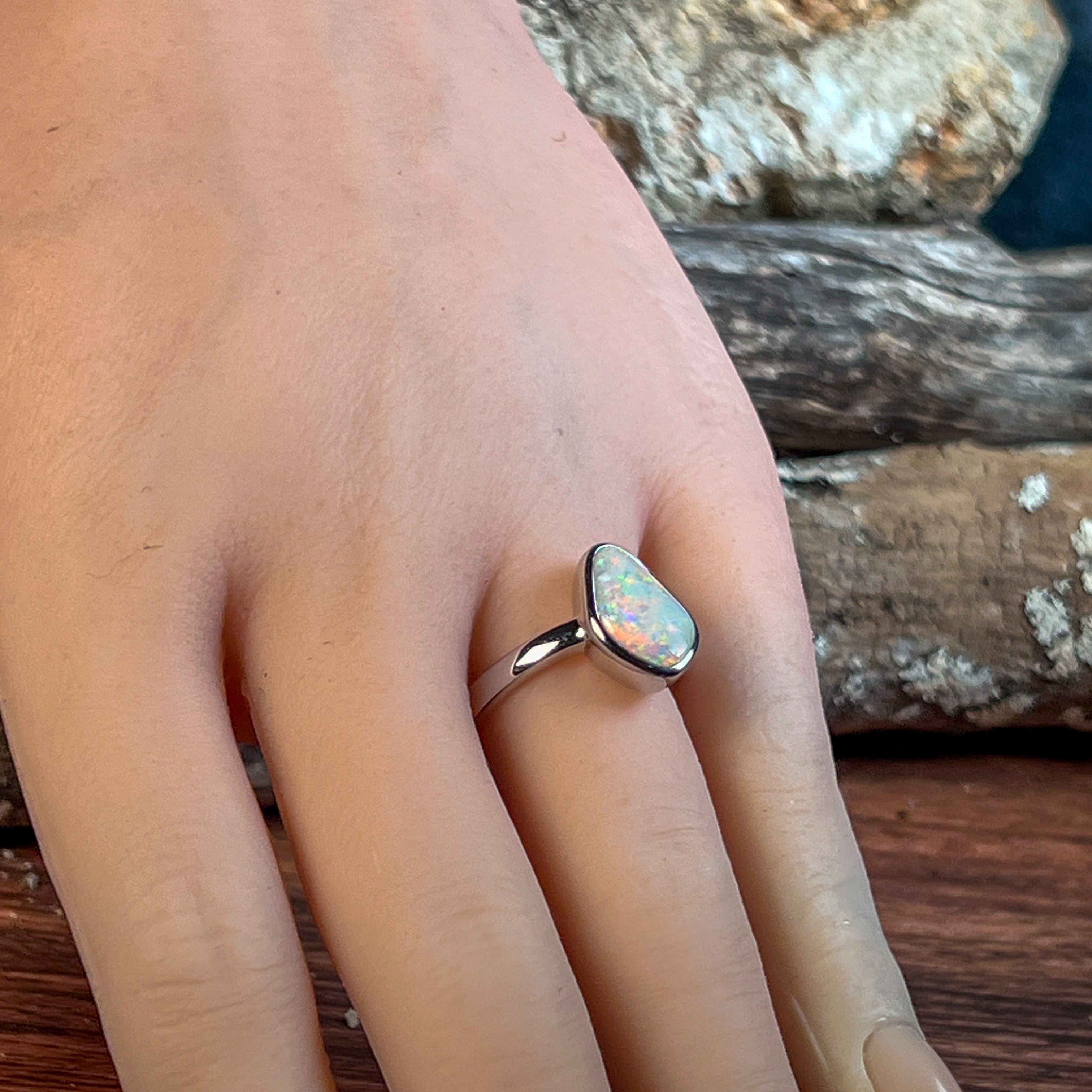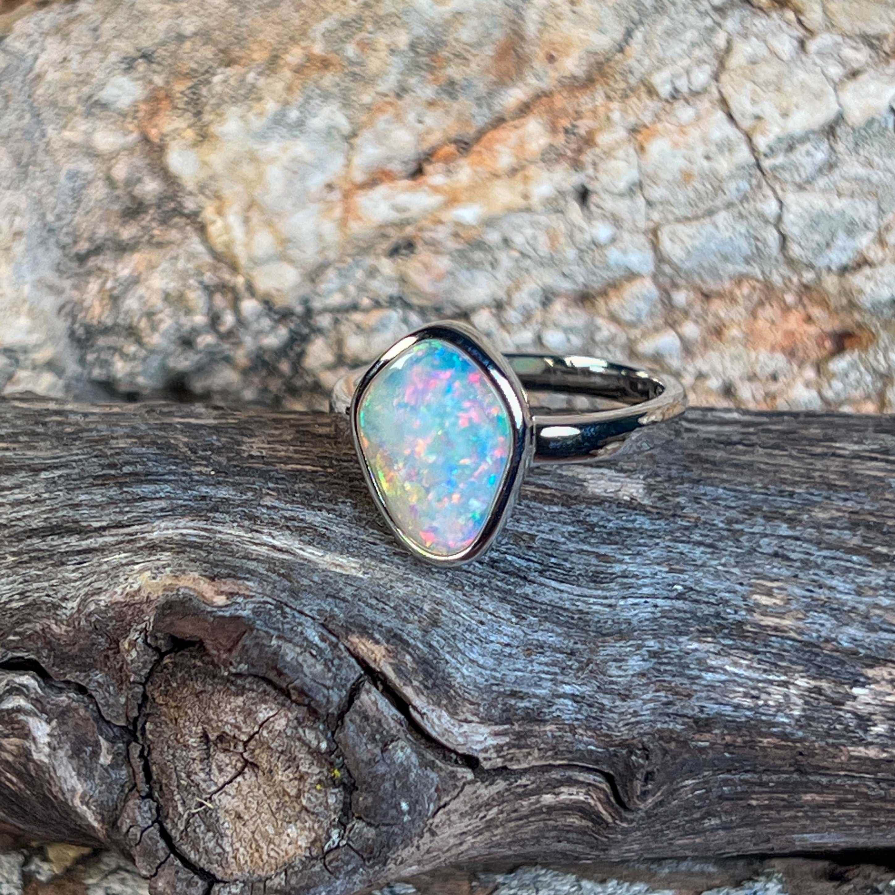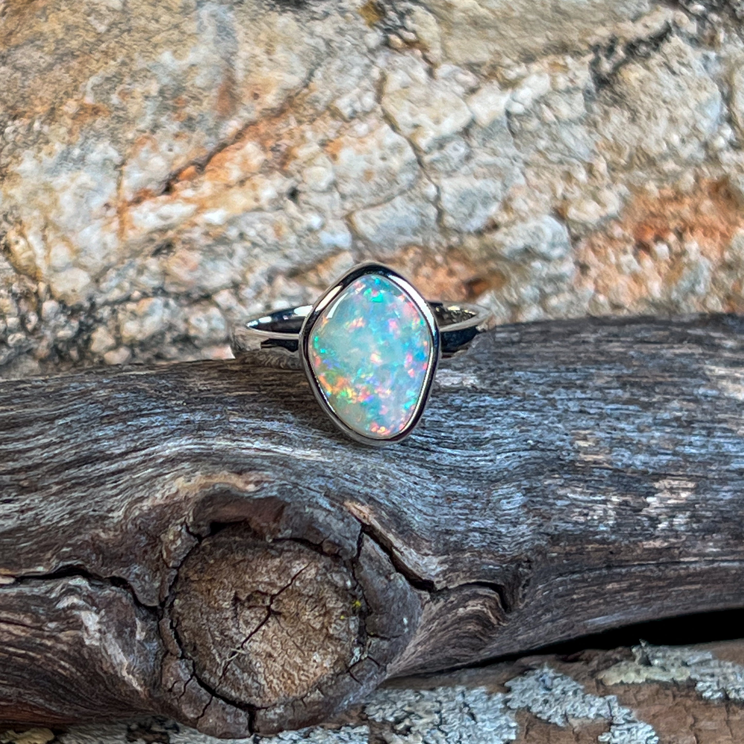 Capture pure elegance with this stunning solitaire featuring a mesmerizing 1.41ct white opal in its natural freeform shape. Set in lustrous sterling silver, this ring celebrates the opal's unique play-of-colour with a minimalist design that lets the gemstone steal the spotlight. Perfect for those who dare to be different—because why settle for ordinary when you can have a one-of-a-kind masterpiece on your finger? A timeless treasure that's anything but predictable.