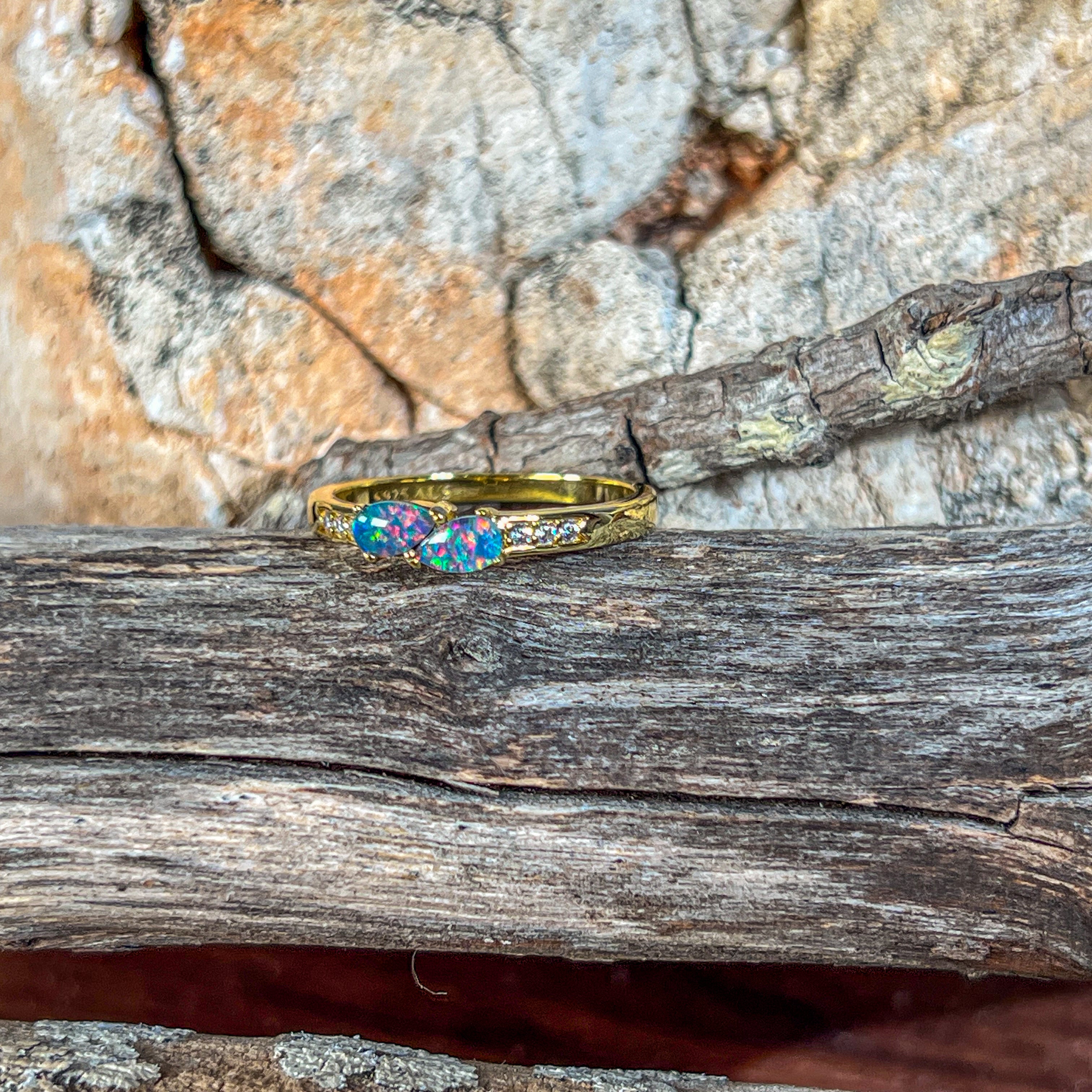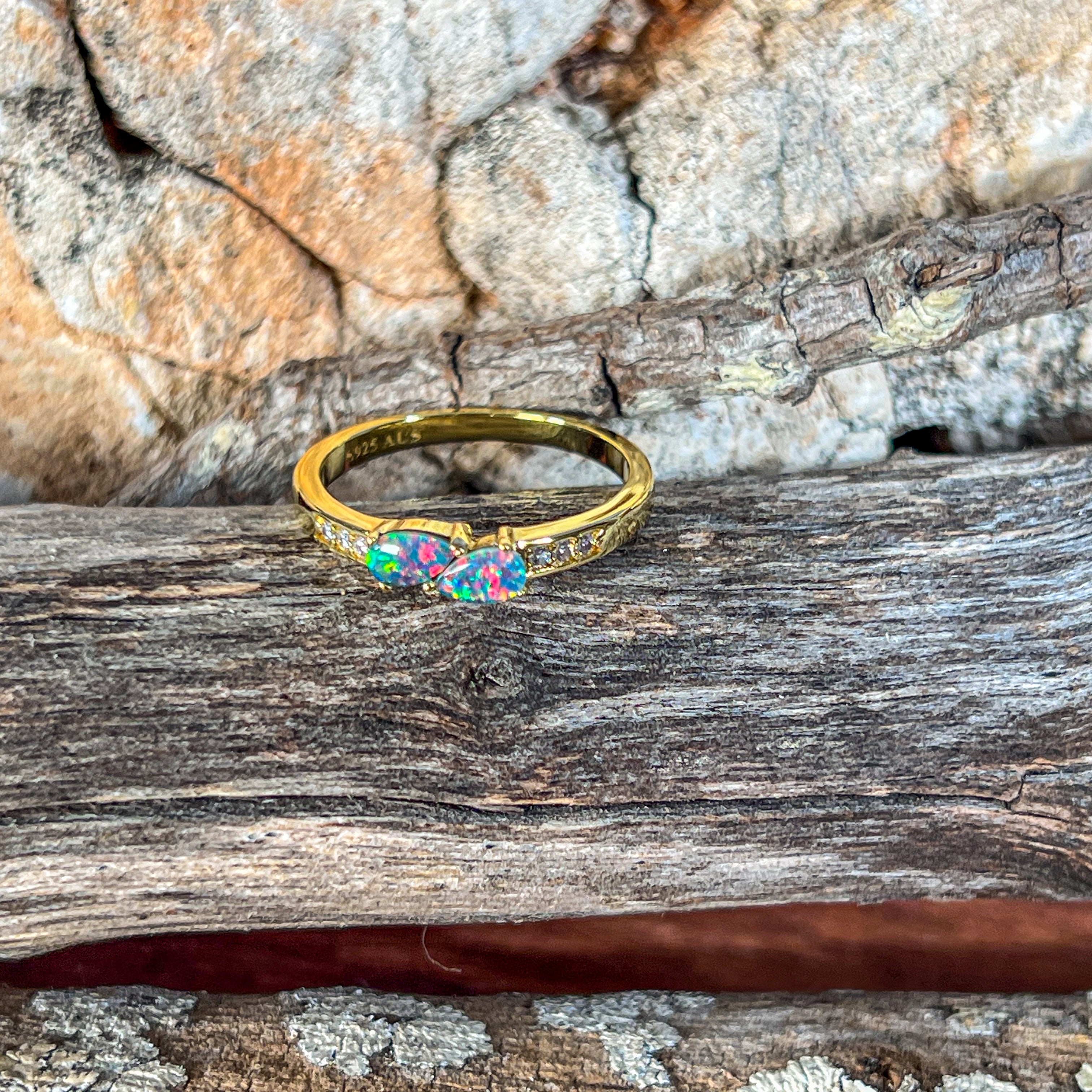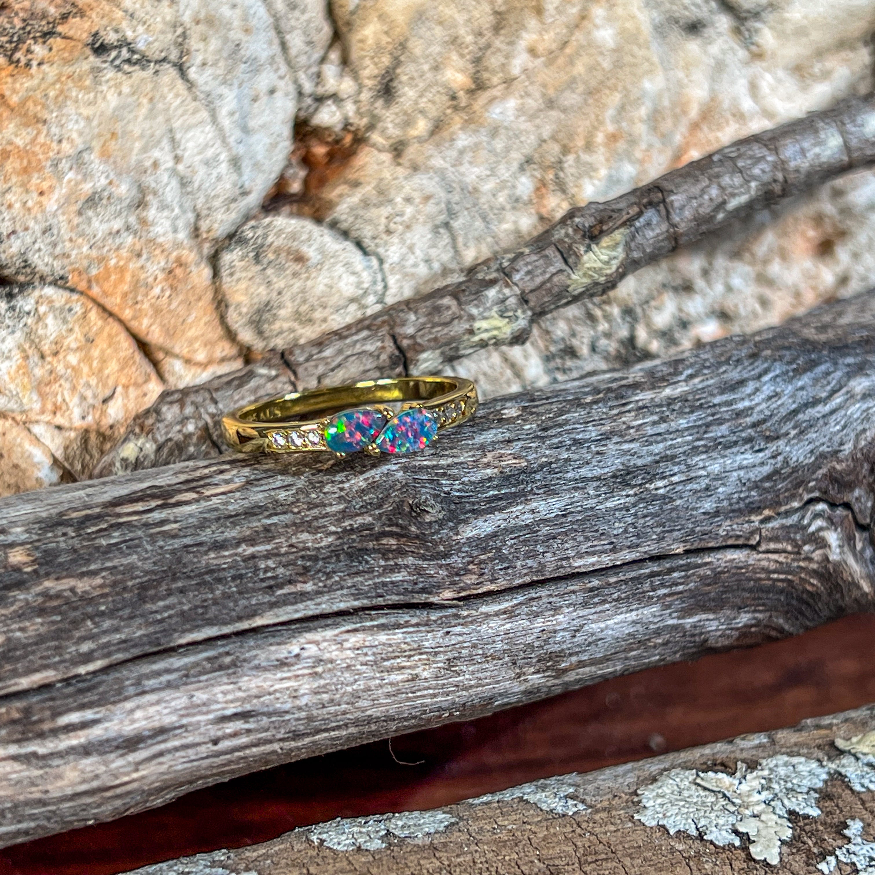 Experience timeless elegance with our Gold plated Silver two pearshape opal triplet 5x3mm ring. The dainty modern design adds a touch of sophistication to any outfit. Feel confident and stylish with this exquisite piece of jewelry.
