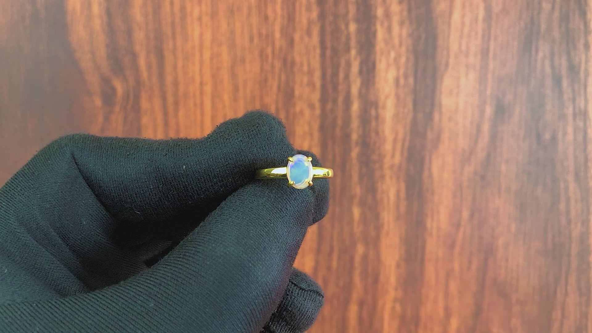 This exquisite gold plated silver ring is designed with a beautiful White Opal stone, 8x6mm, which will fill your wardrobe with a touch of glamour. Add a magical sparkle to your look with a luxurious solitaire ring crafted for a memorable, eye-catching style. Perfect for special occasions or everyday elegance.