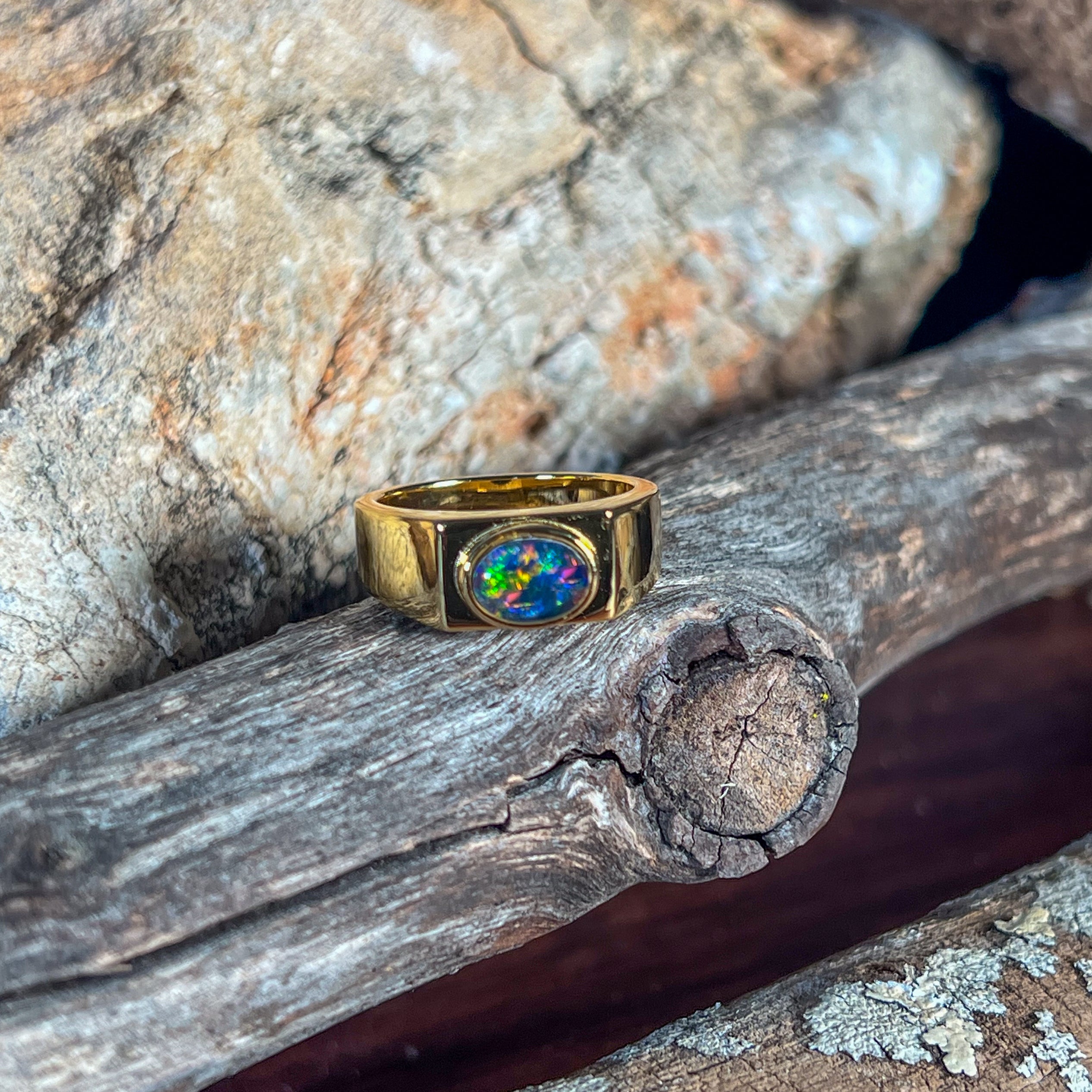 Introducing our unisex solitaire band, featuring a luxurious 8x6mm horizontal set Opal triplet rectangular shape ring. Made with gold plated Sterling Silver, this ring exudes sophistication and exclusivity. Elevate any outfit with this elegant and tasteful piece.