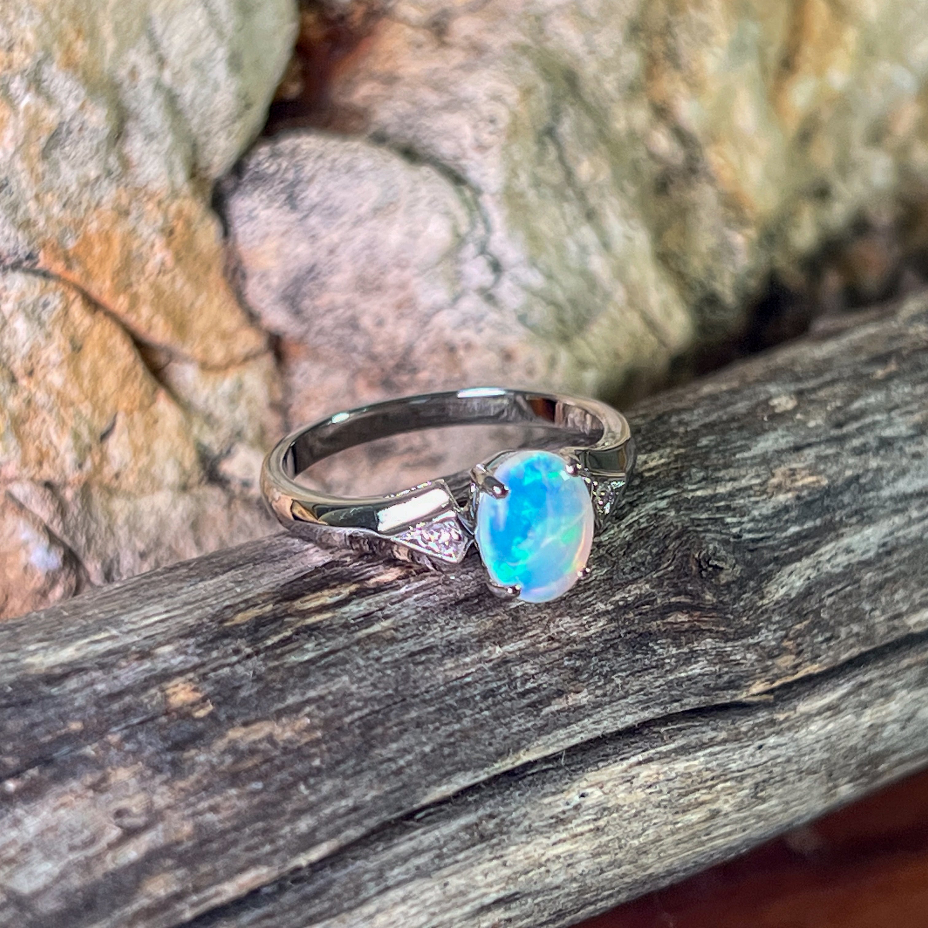 Discover the timeless elegance of our One Sterling Silver 8x6mm Light Opal and side cz ring. This modern minimalist design showcases a beautiful opal stone and sparkling cz accents, making it the perfect addition to any outfit. Elevate your style with this stunning piece that exudes sophistication and beauty.