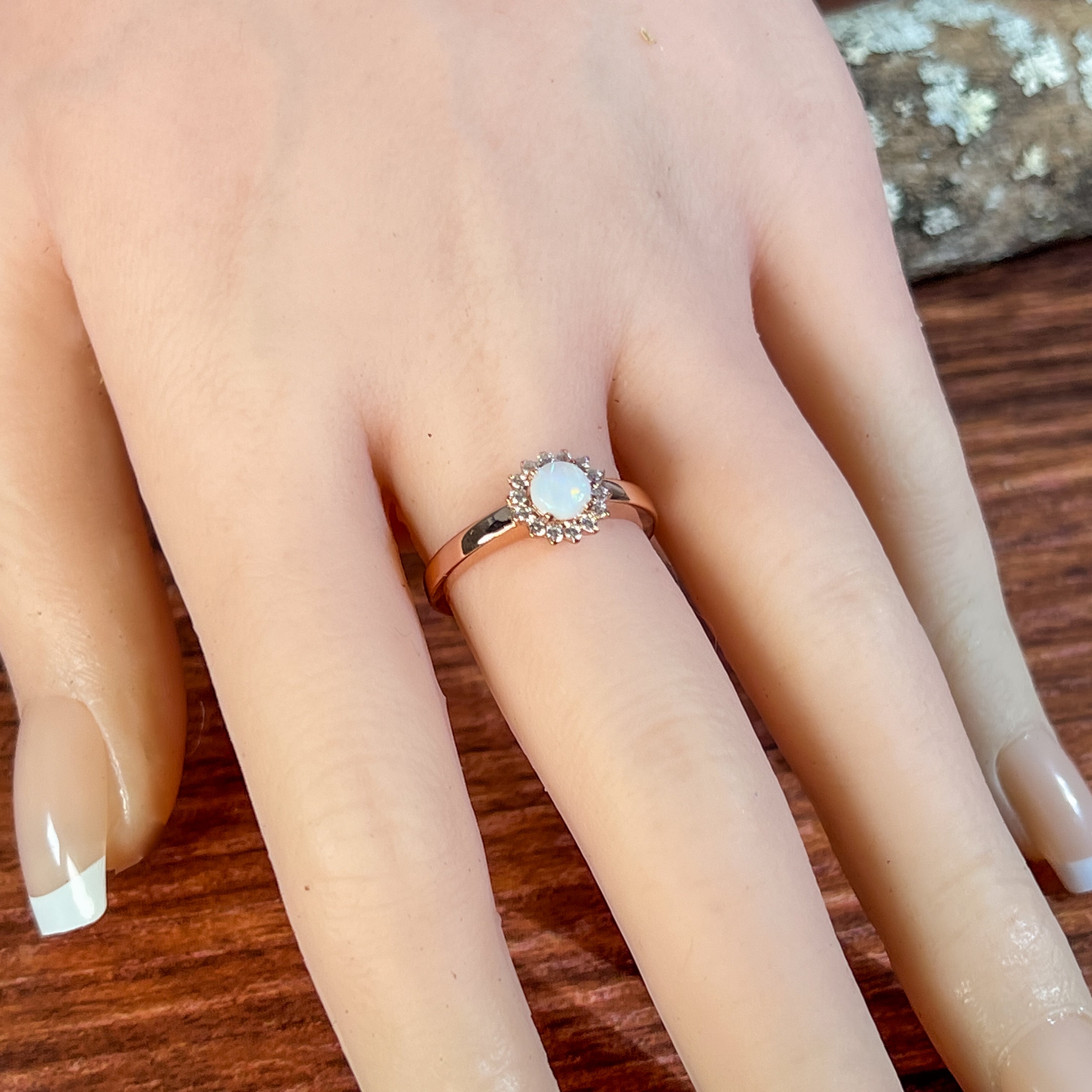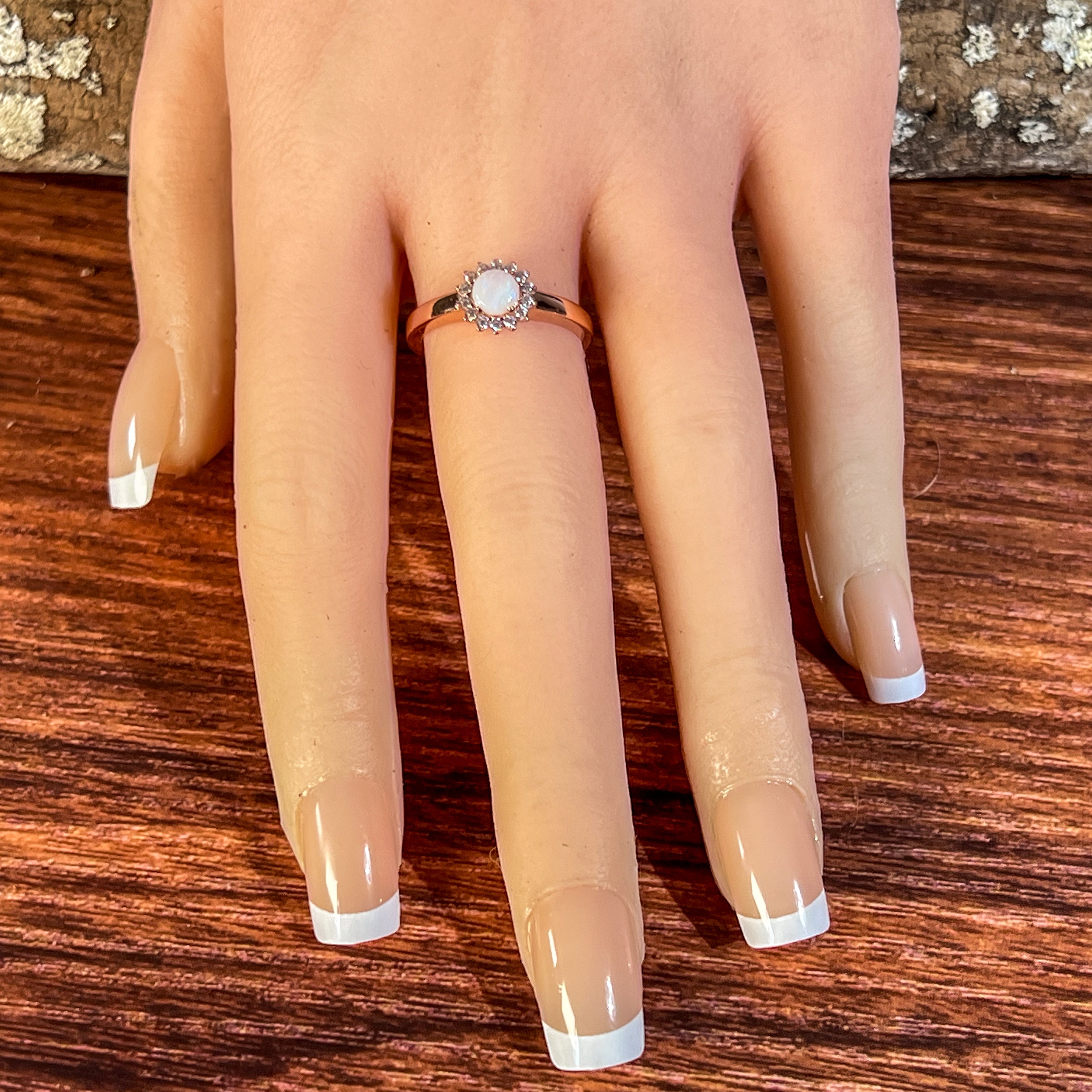 Add a touch of elegance to your jewelry collection with our Rose Gold plated silver cluster ring. The 5mm Round White Opal adds a classic element that will elevate any outfit. Make a statement with this timeless piece!