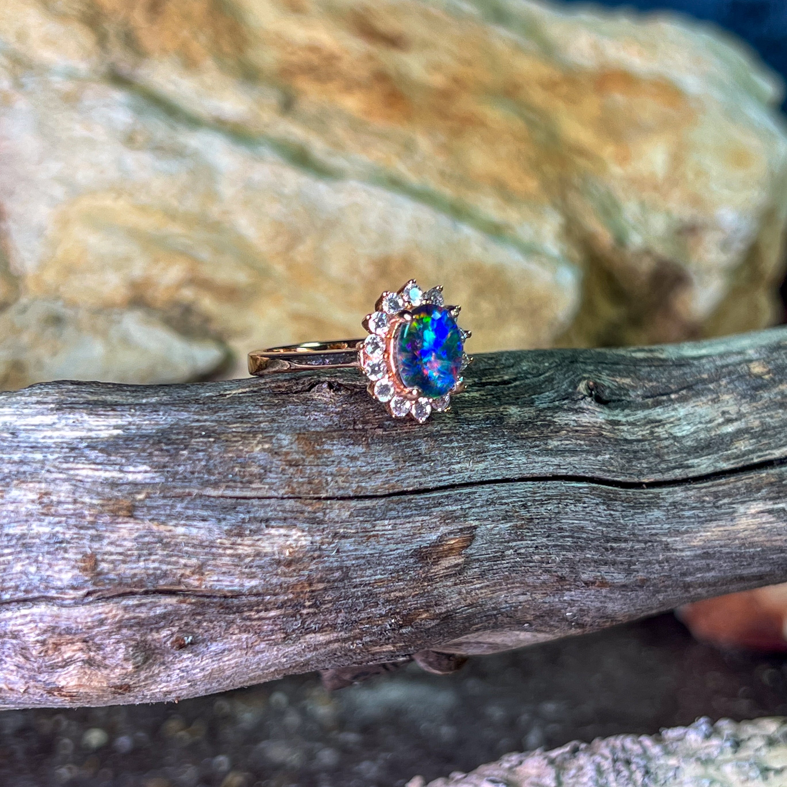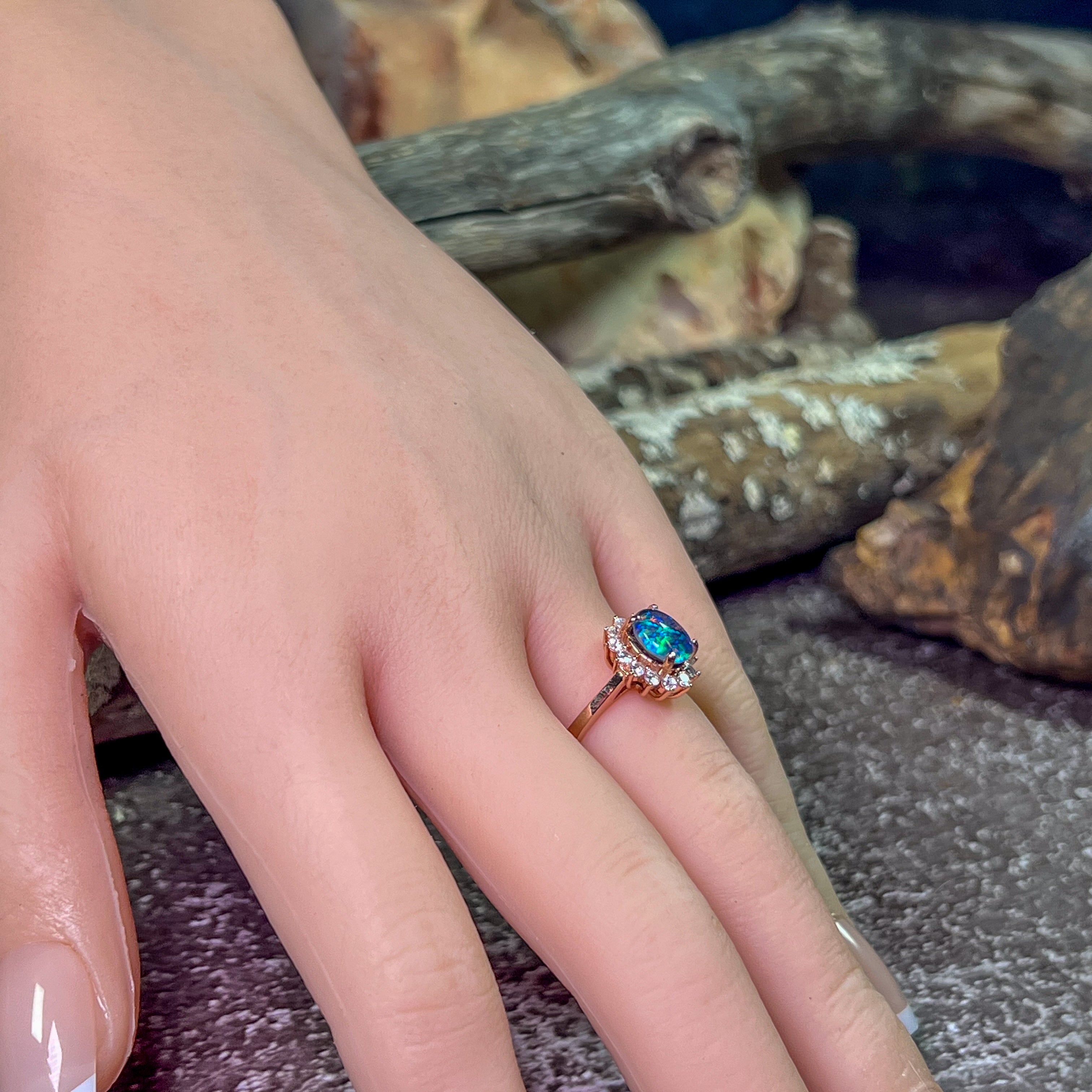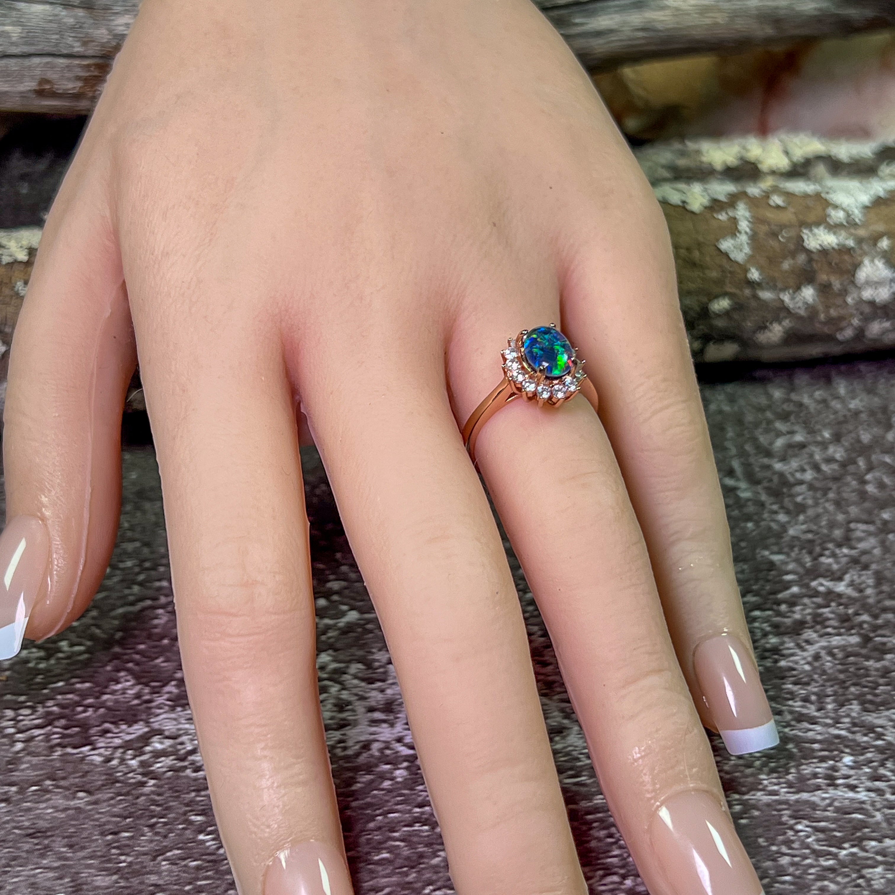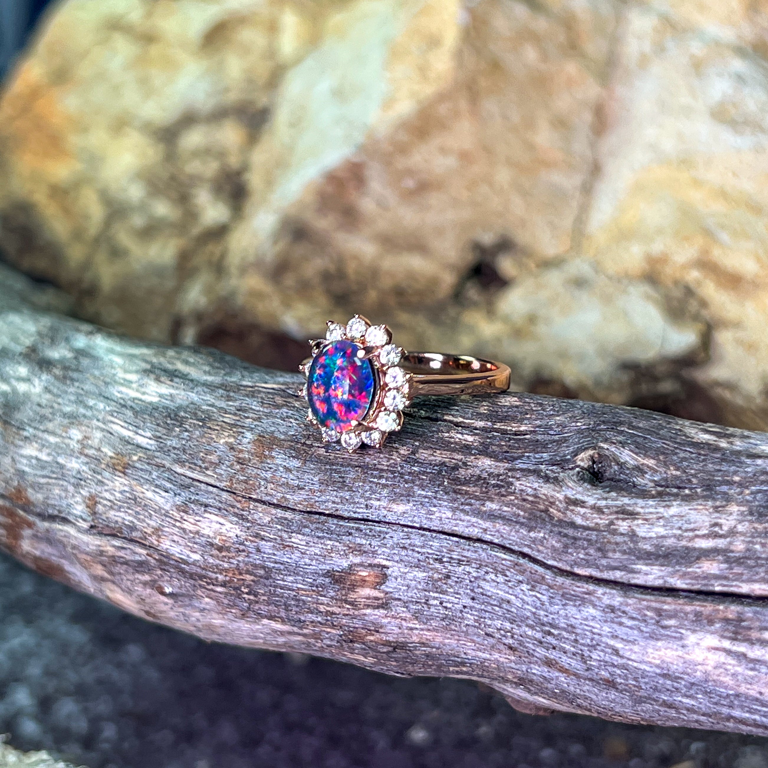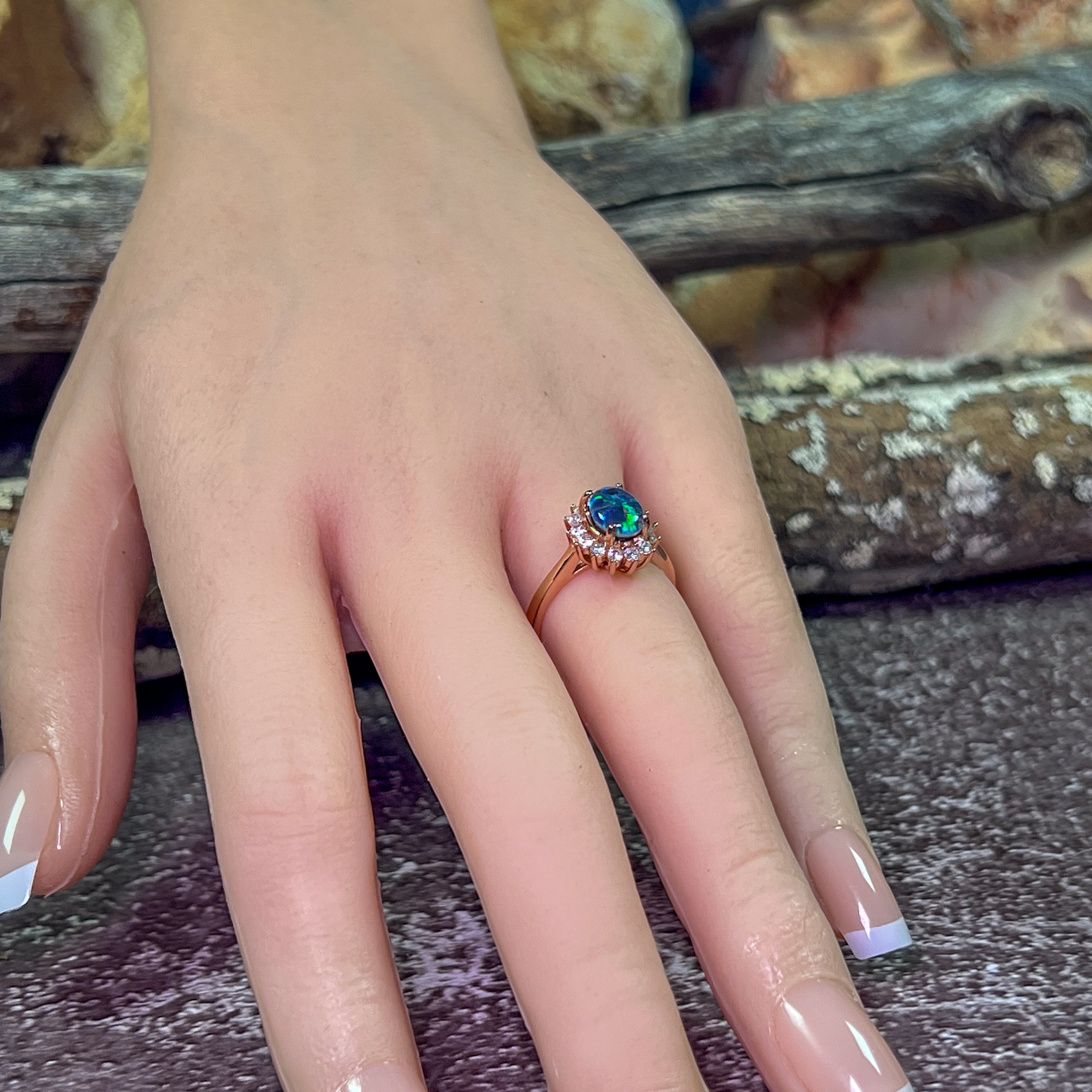 Indulge in luxury with our Rose Gold plated sterling silver 8x6mm cluster ring. Featuring a stunning gold opal birthstone, this ring exudes elegance and sophistication. Elevate any outfit with its unique and timeless design. Fall in love with the beauty and exclusivity of this piece.