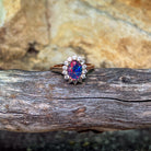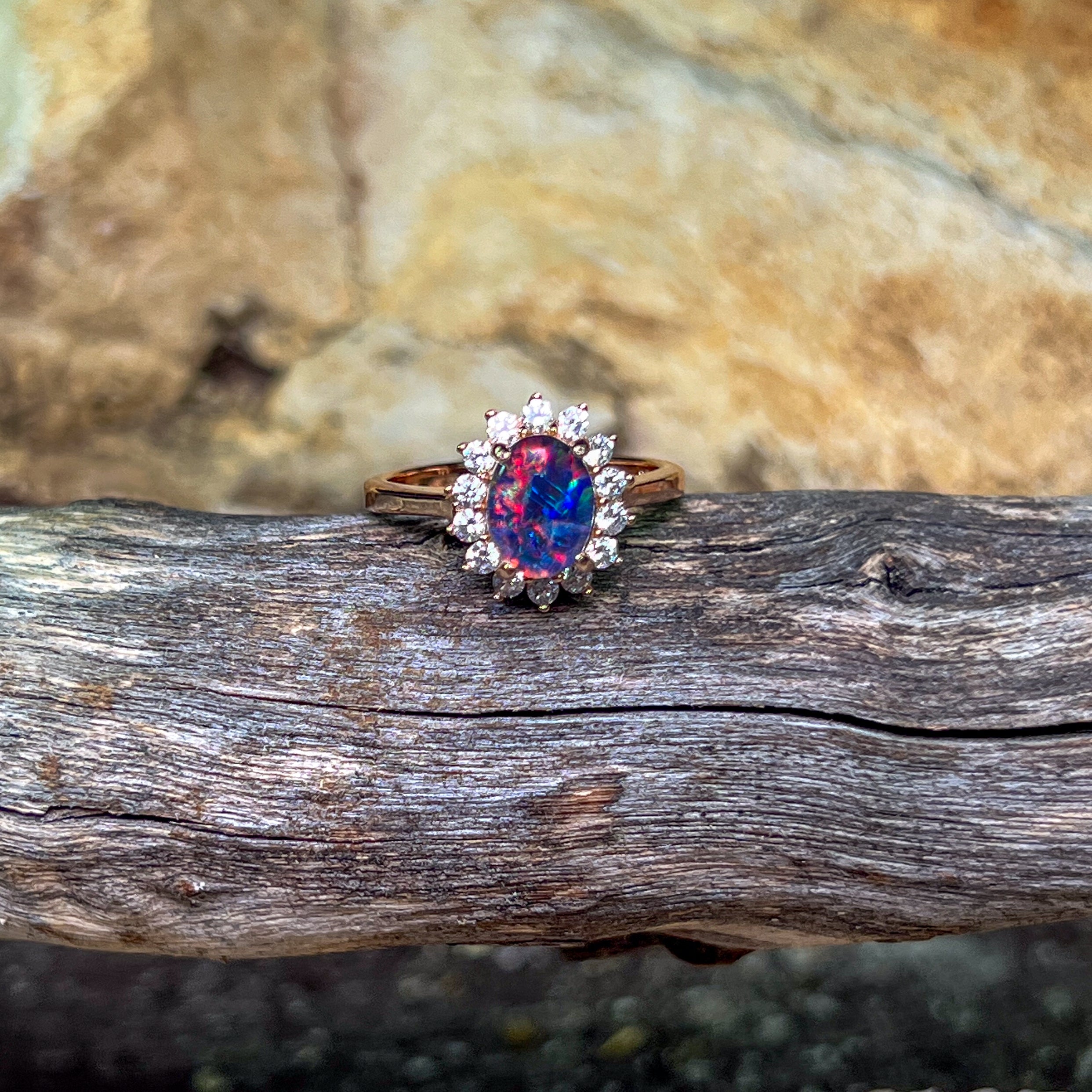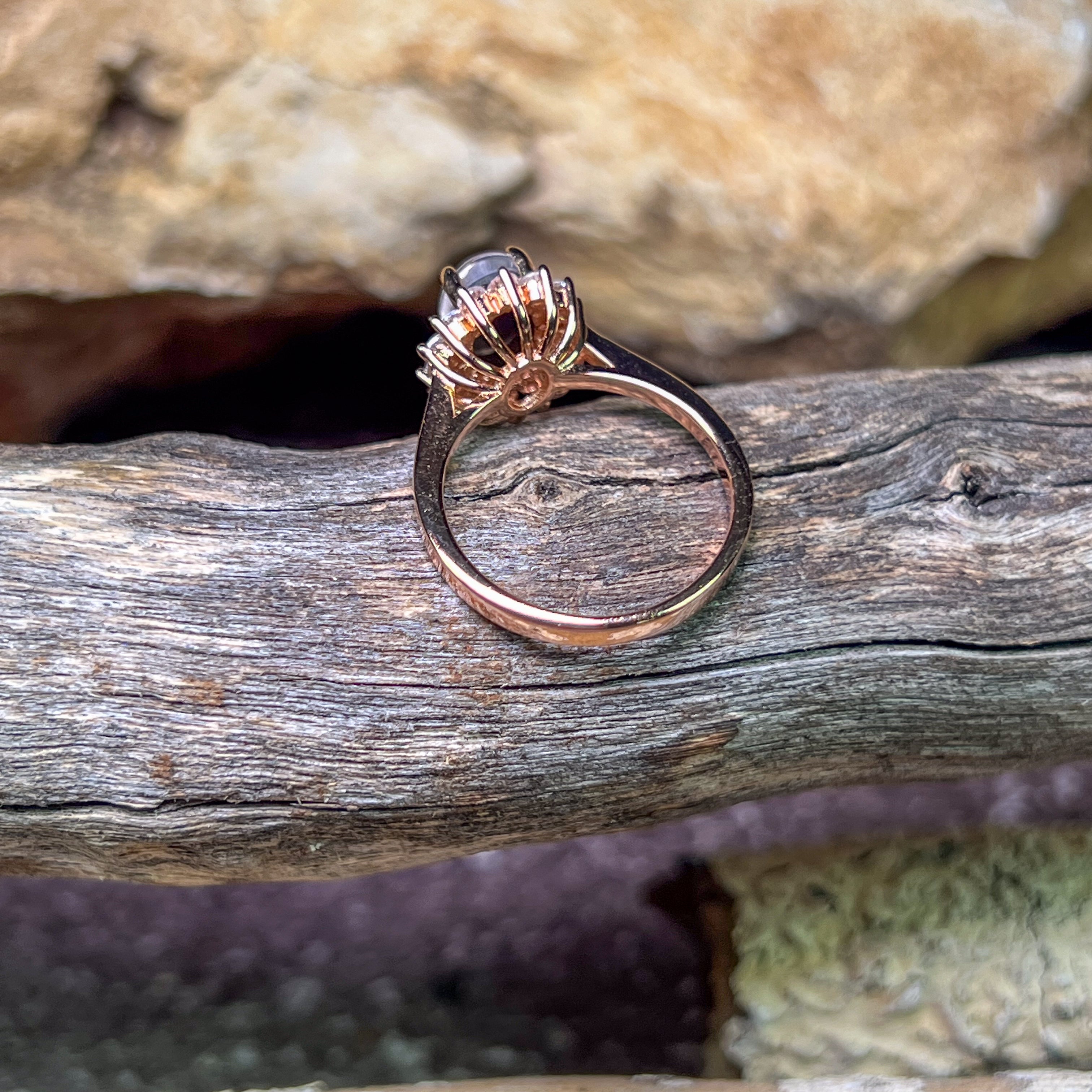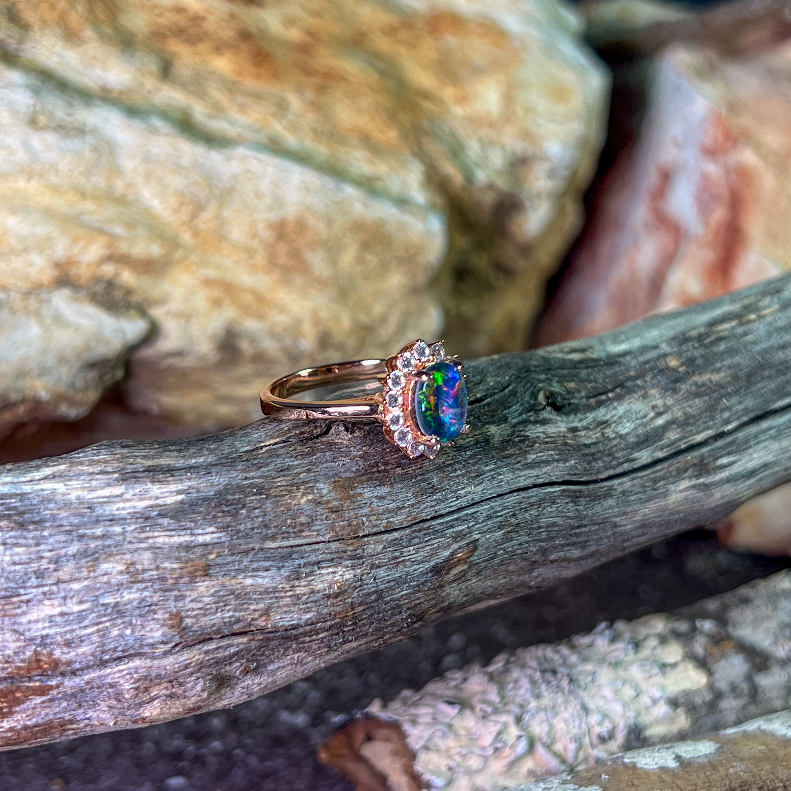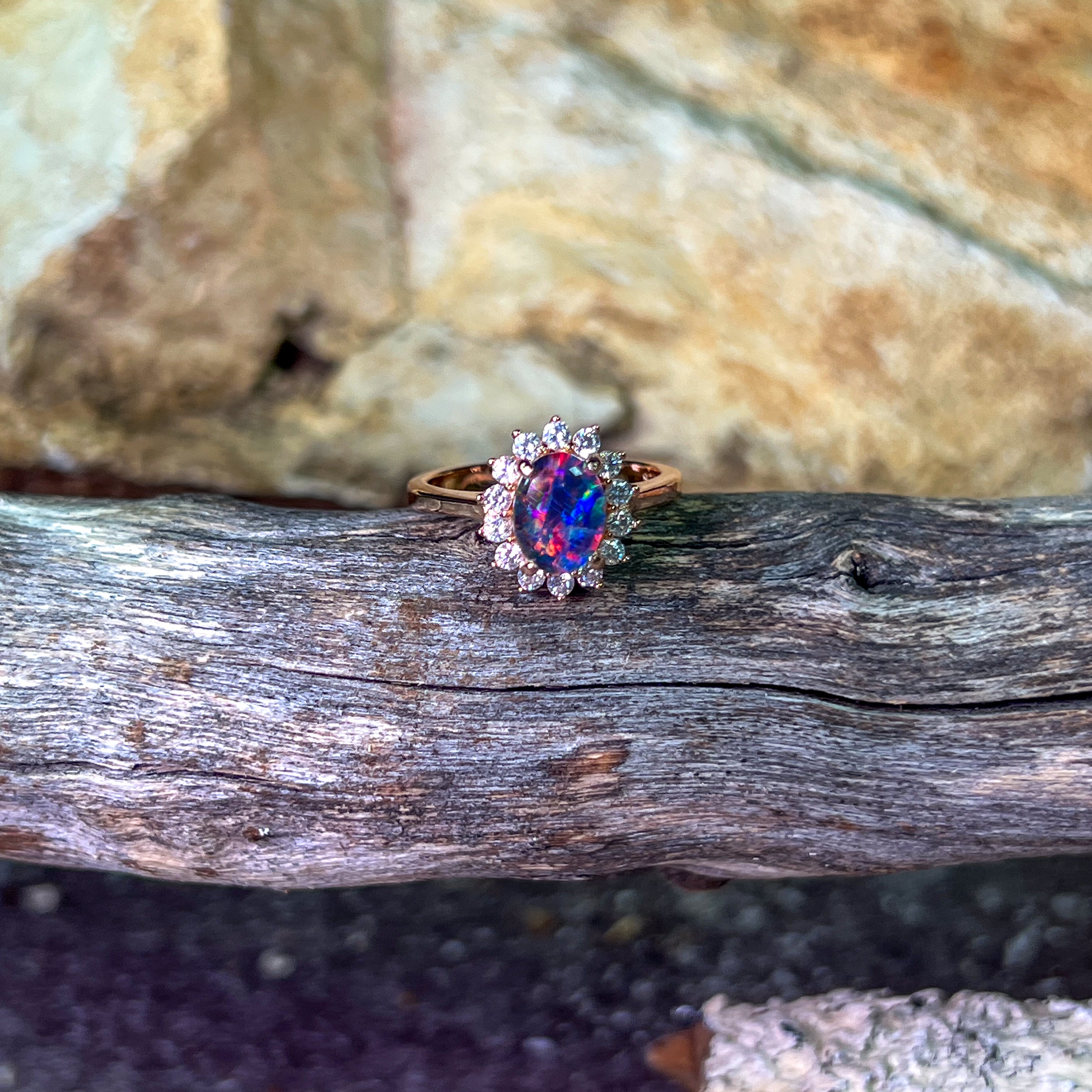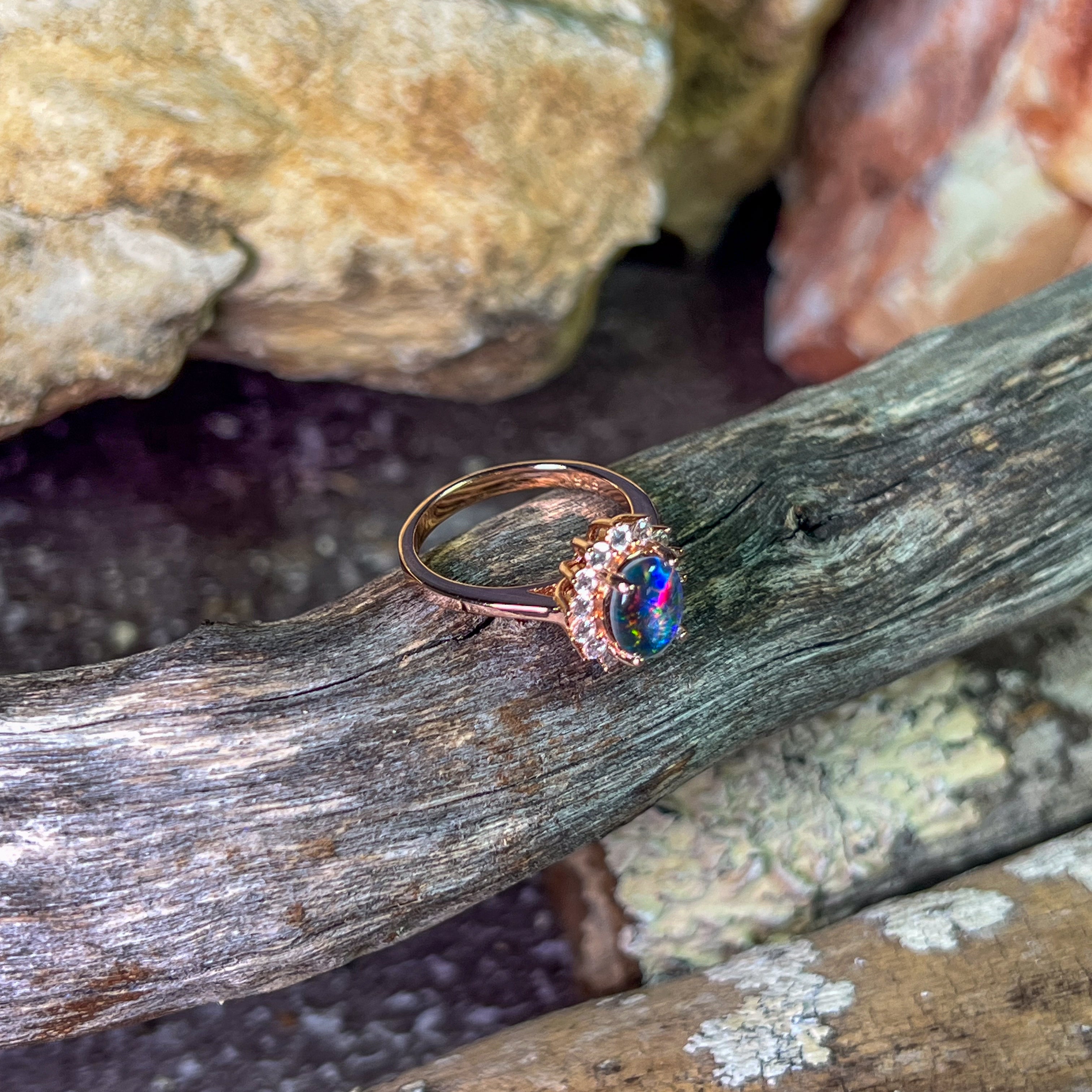 Indulge in luxury with our Rose Gold plated sterling silver 8x6mm cluster ring. Featuring a stunning gold opal birthstone, this ring exudes elegance and sophistication. Elevate any outfit with its unique and timeless design. Fall in love with the beauty and exclusivity of this piece.