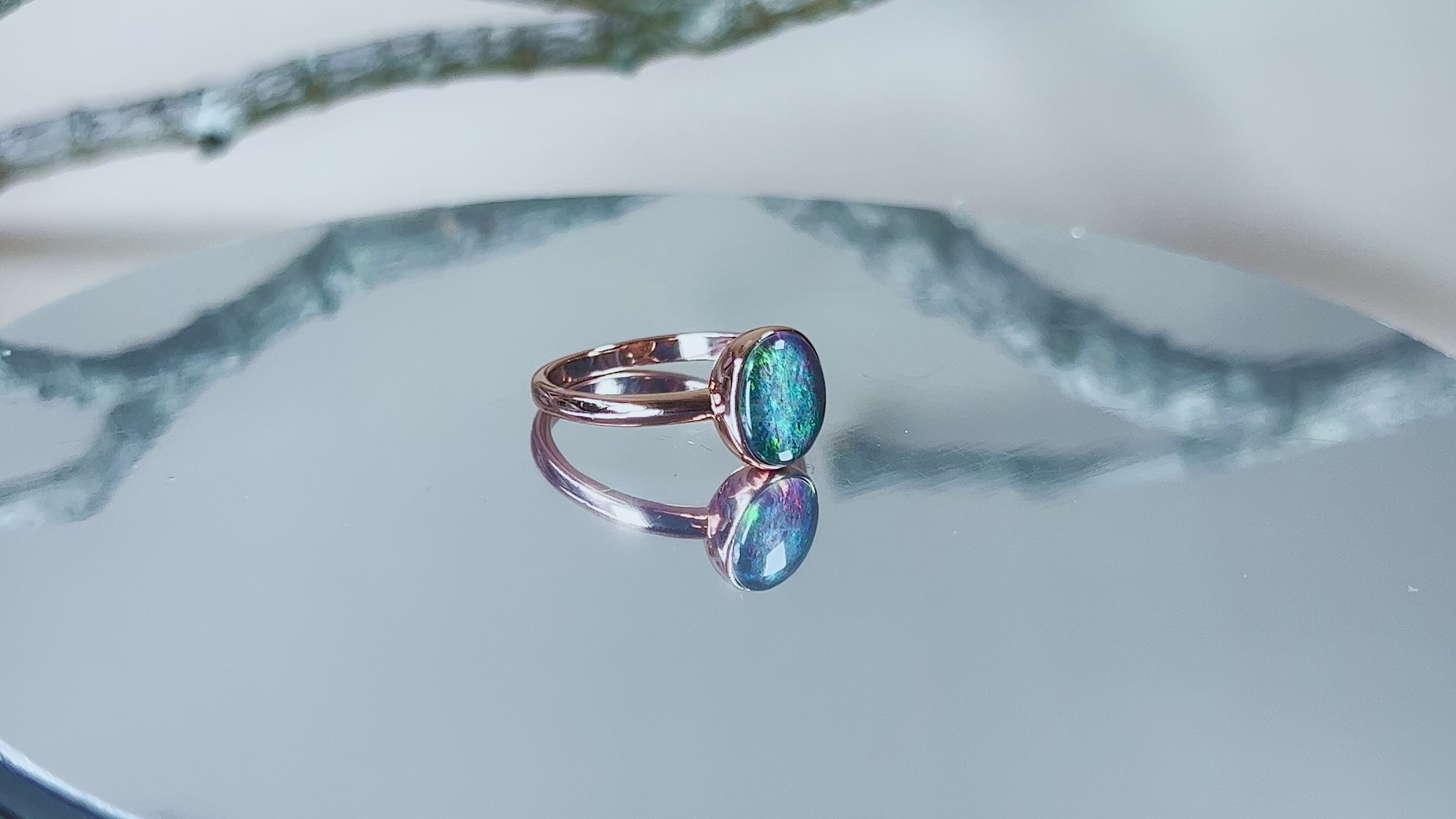 This beautiful rose gold plated sterling silver ring is set with a stunning triplet opal. At 9x7mm, it's the perfect size for everyday wear. Make it your birthstone jewellery and shine on!