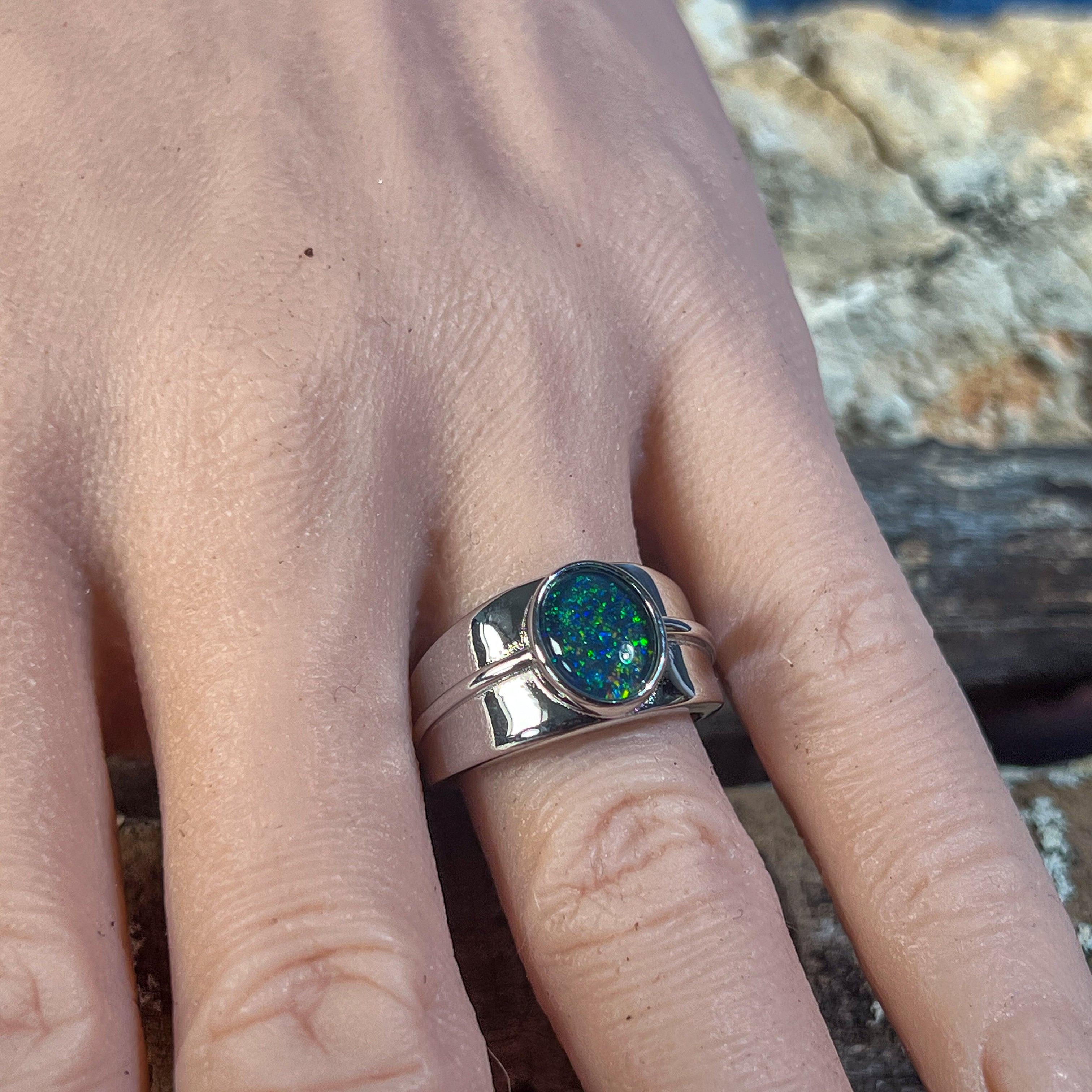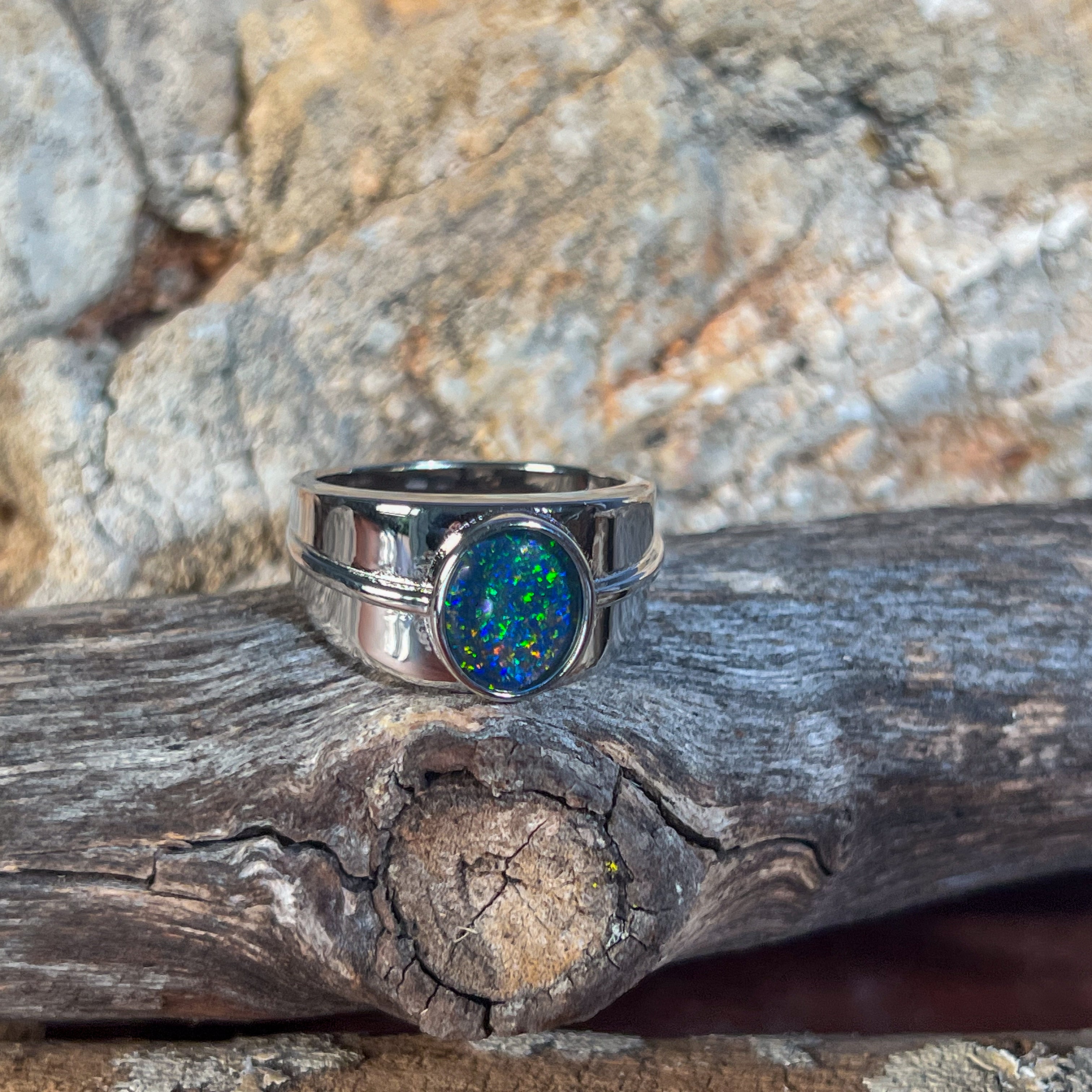 Experience the luxurious shine and sophisticated style of our Sterling Silver Opal Triplet Ring. This broad tapered ring features a unique step shape and a graduating design, perfectly crafted for the modern gentleman. Add a touch of elegance to any outfit with this stunning piece.