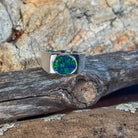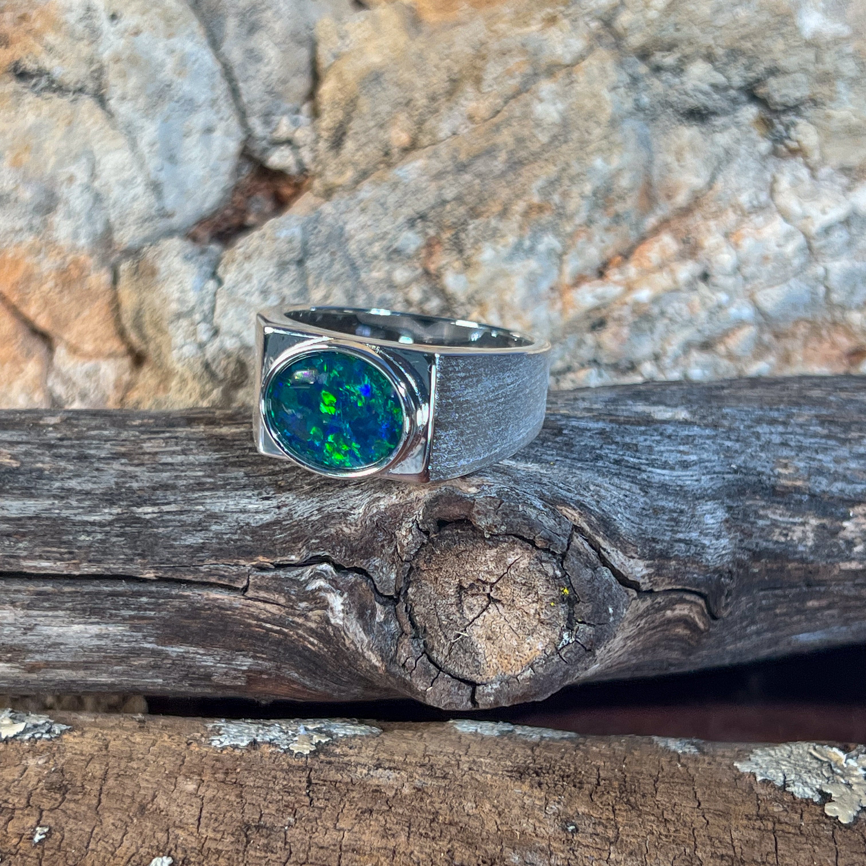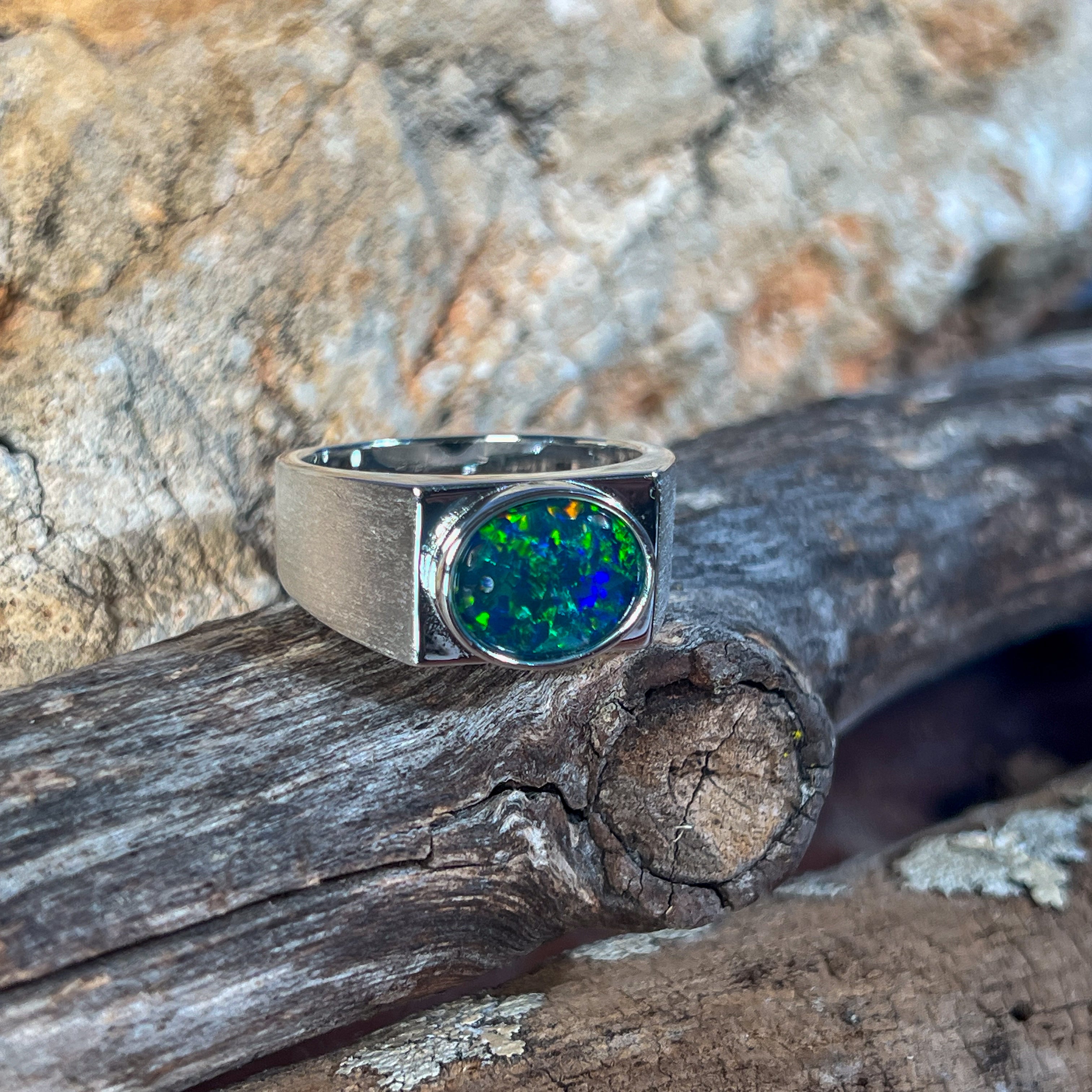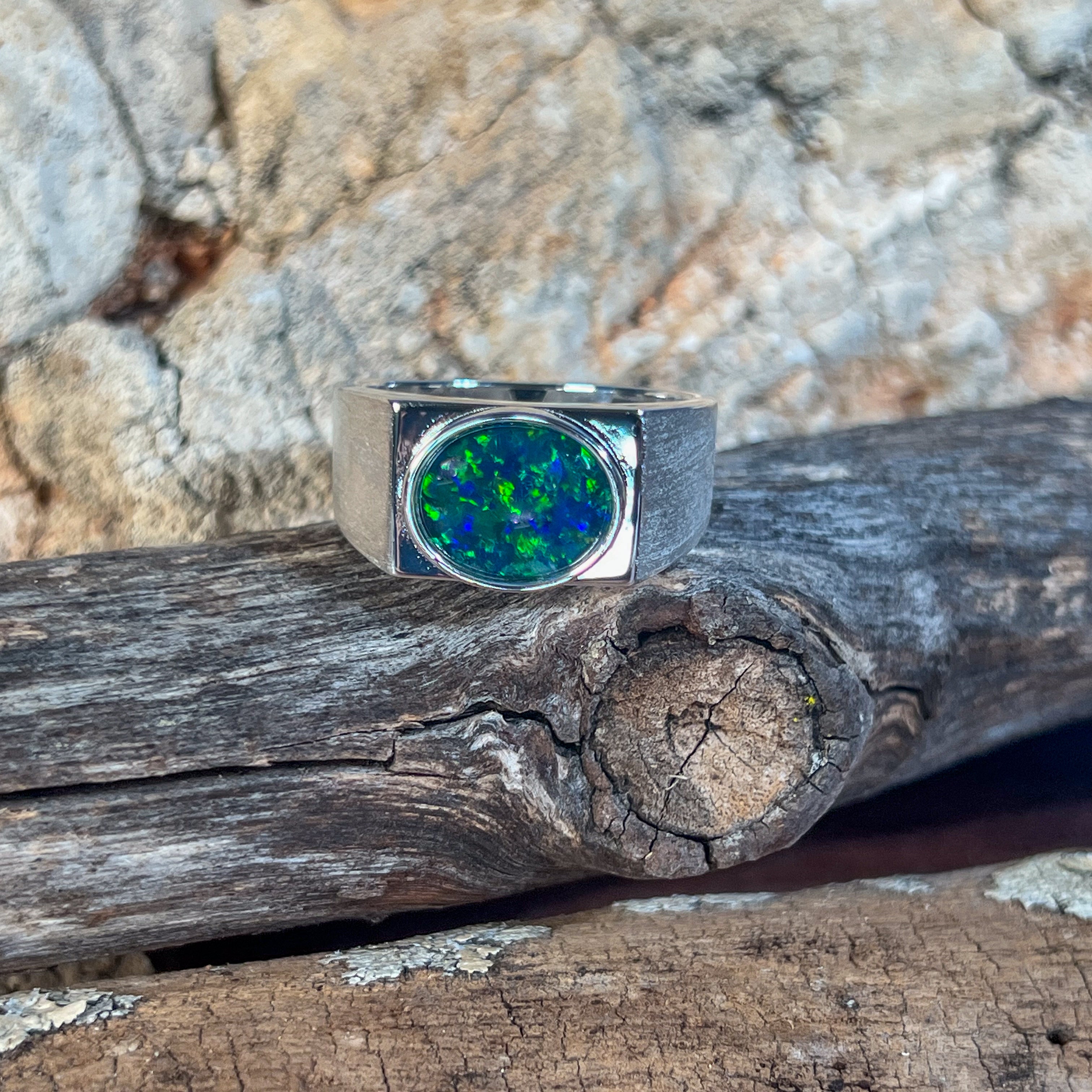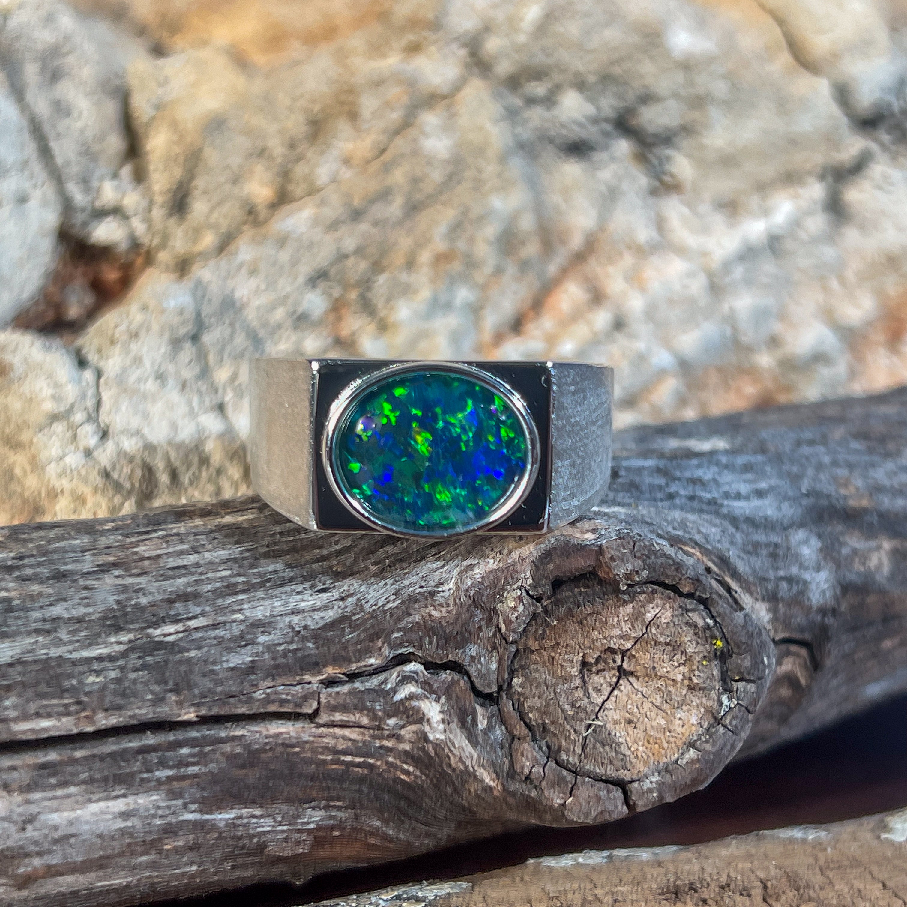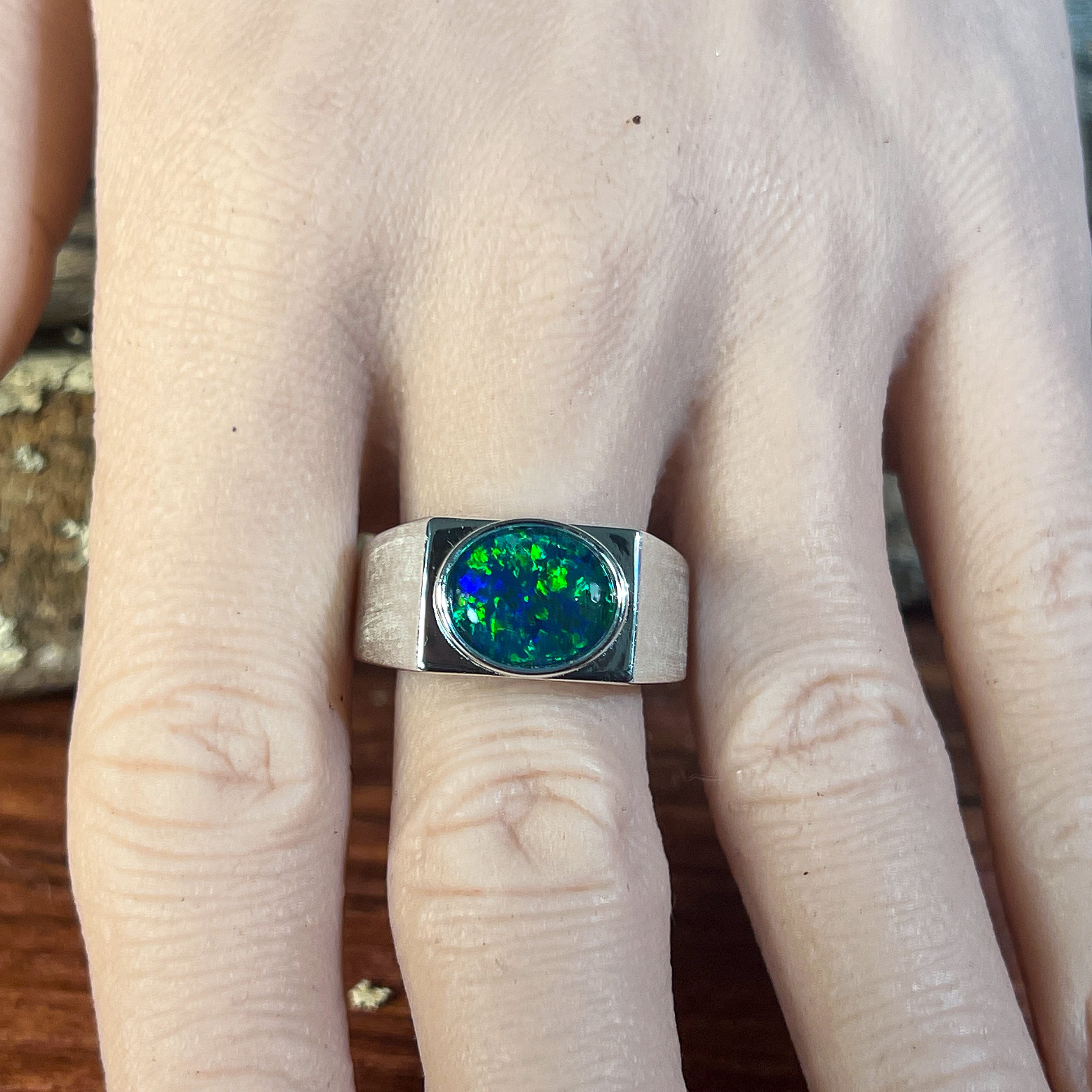 Unleash your unique sense of style with our Sterling Silver Opal Triplet Rectangular Ring. The broad rectangular shape is perfect for men and the matte finish adds a touch of sophistication. This ring is a must-have accessory for those who want to make a bold statement!