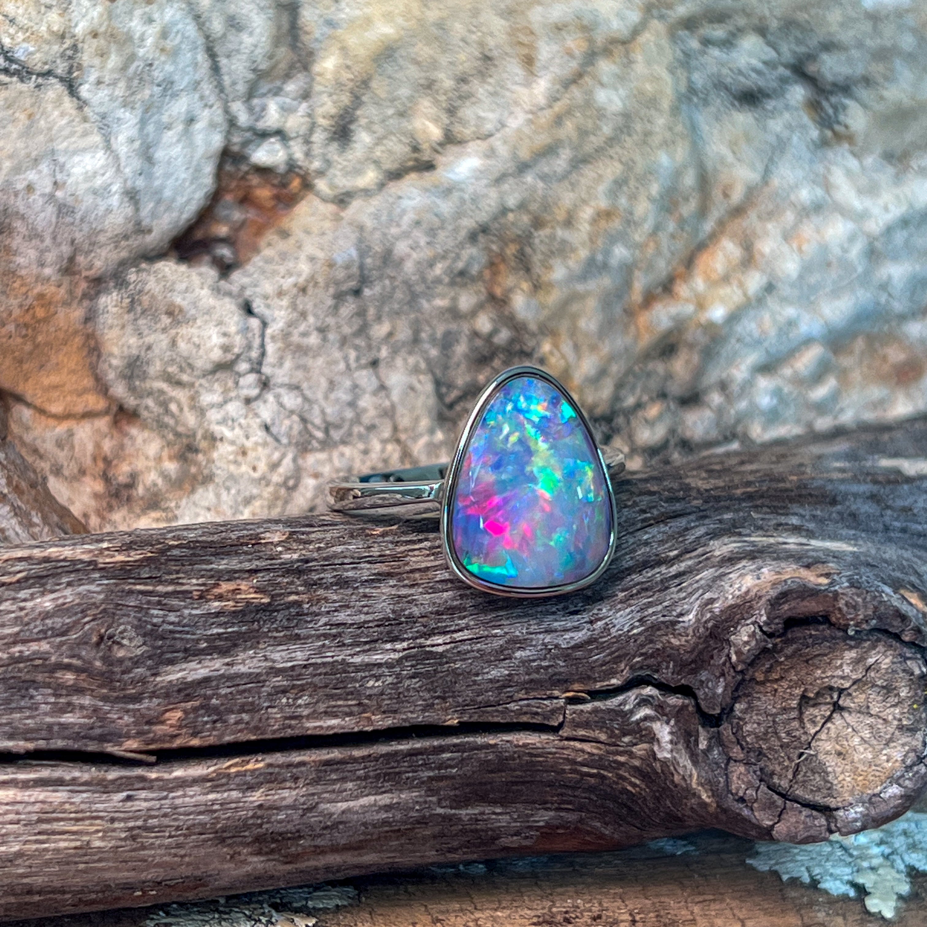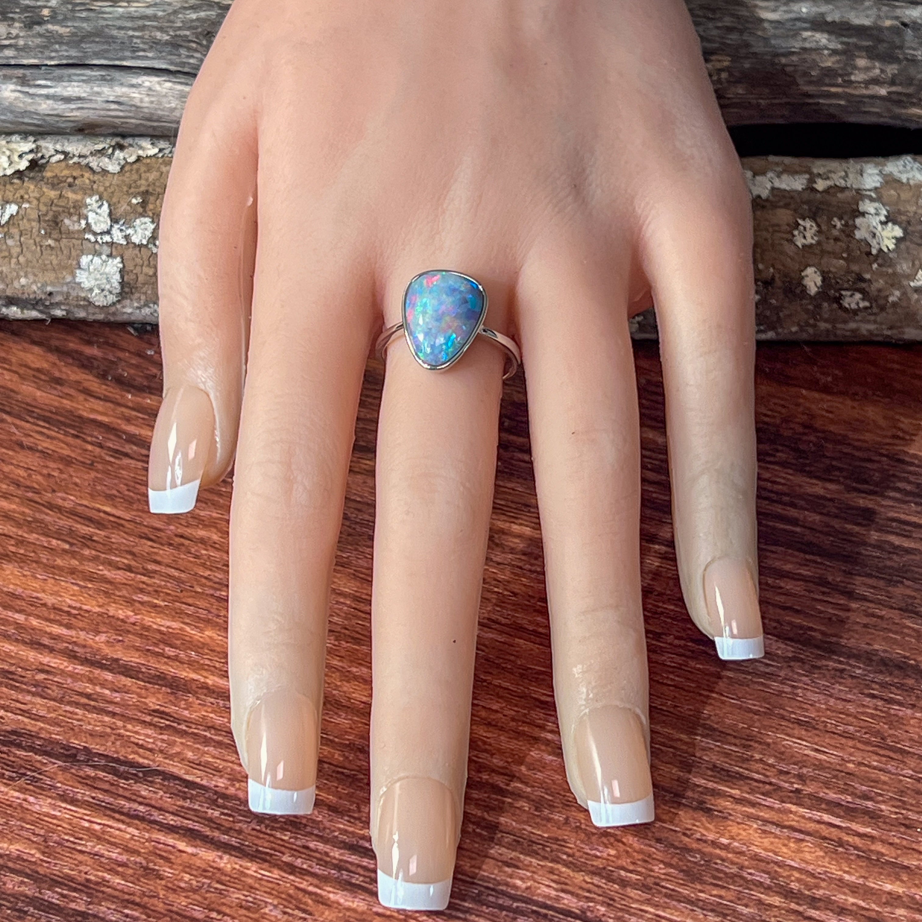 Sterling Silver bezel set Opal Doublet curved solitaire triangle shape ring