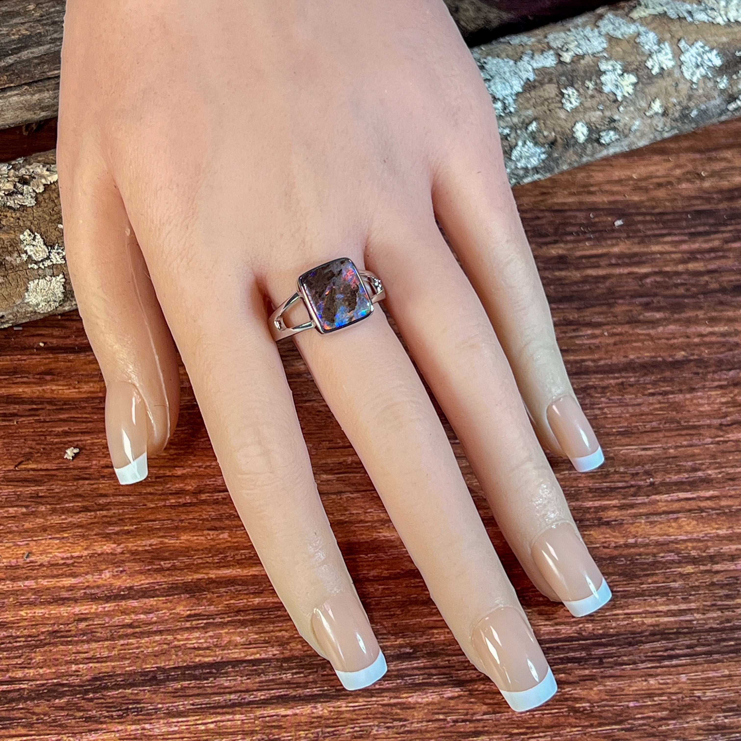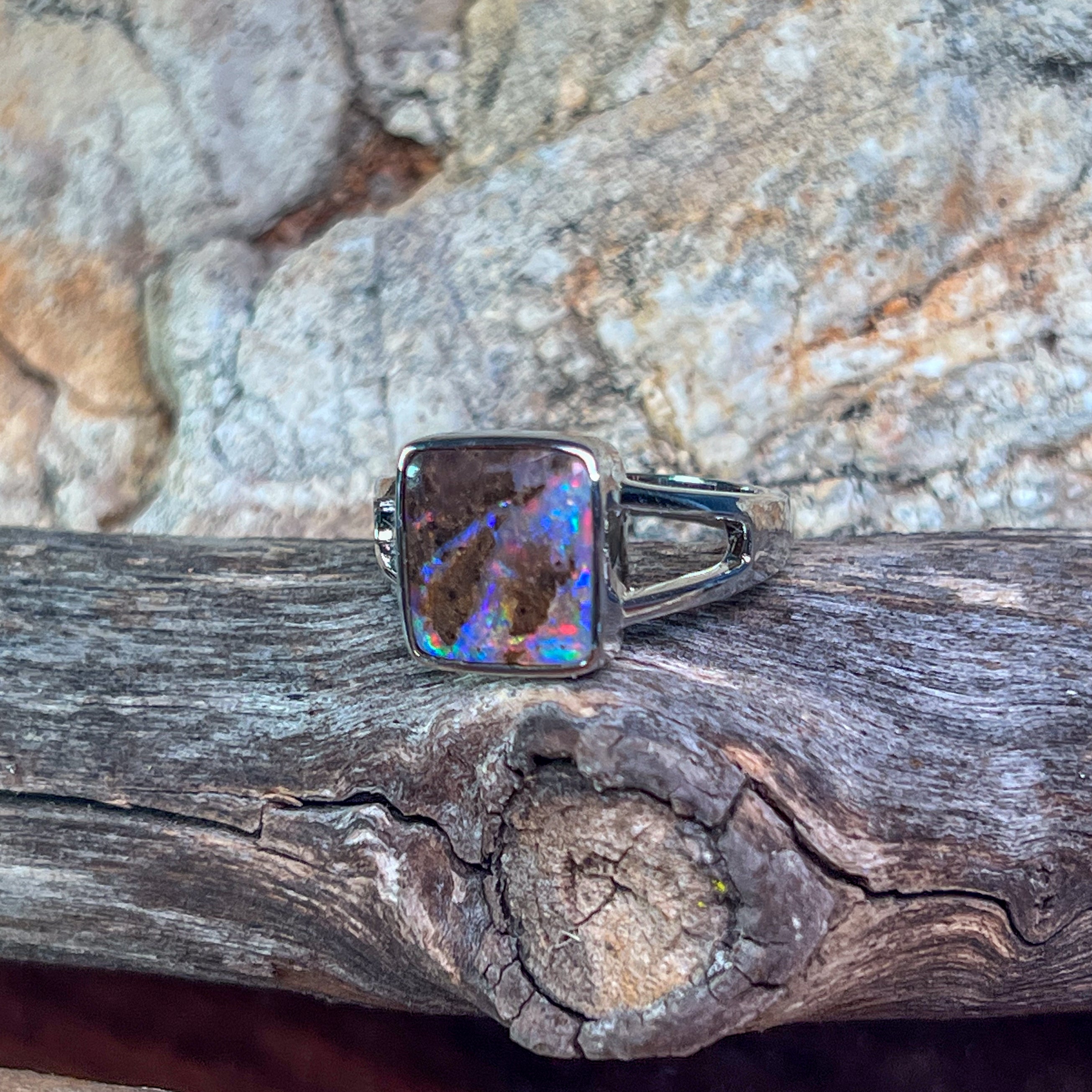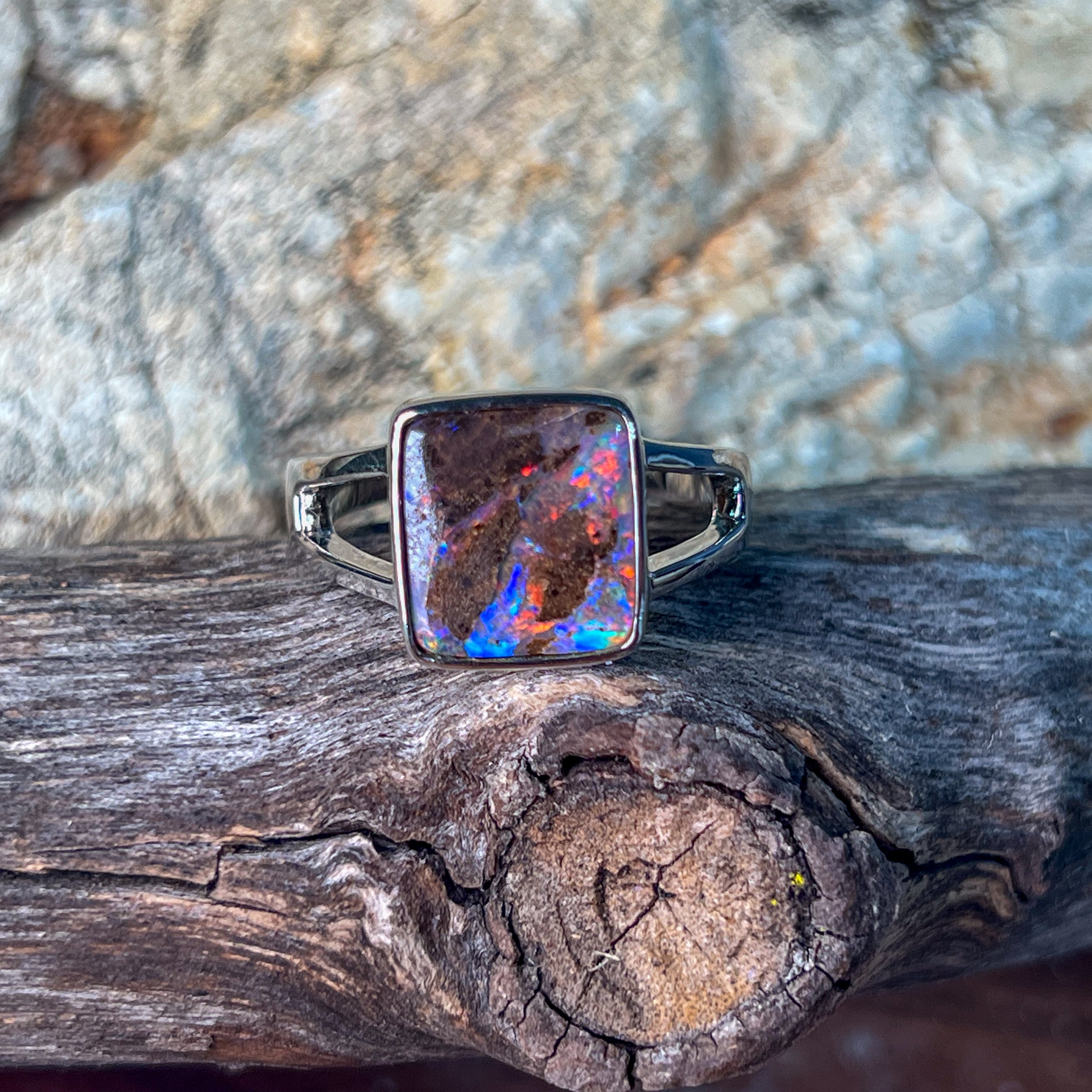 Enhance your style with our Sterling Silver Boulder Opal 4.84ct ring. This opal jewellery piece shines with its unique and colorful boulder opal, set in a sleek silver band. Elevate your look with this stunning opal ring.