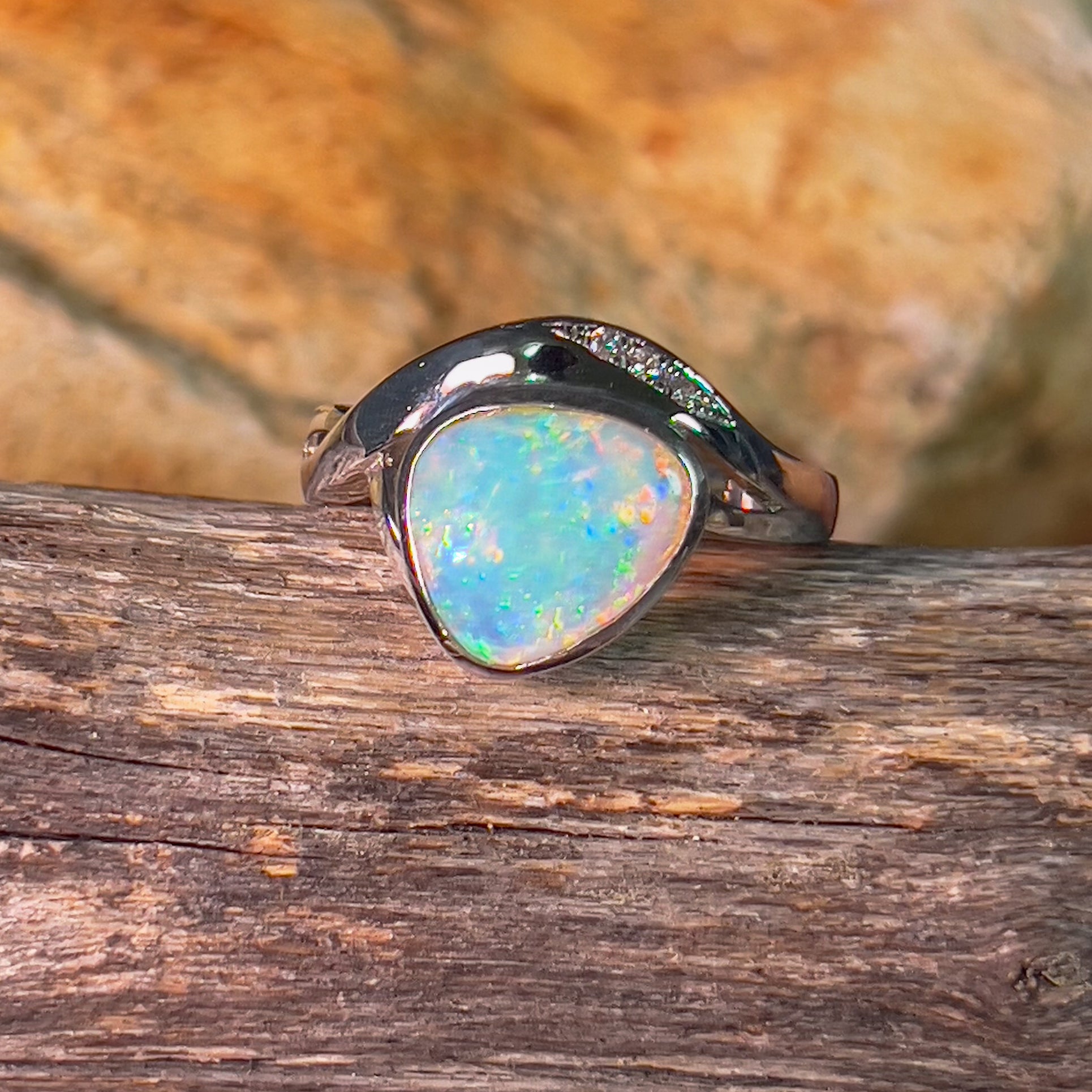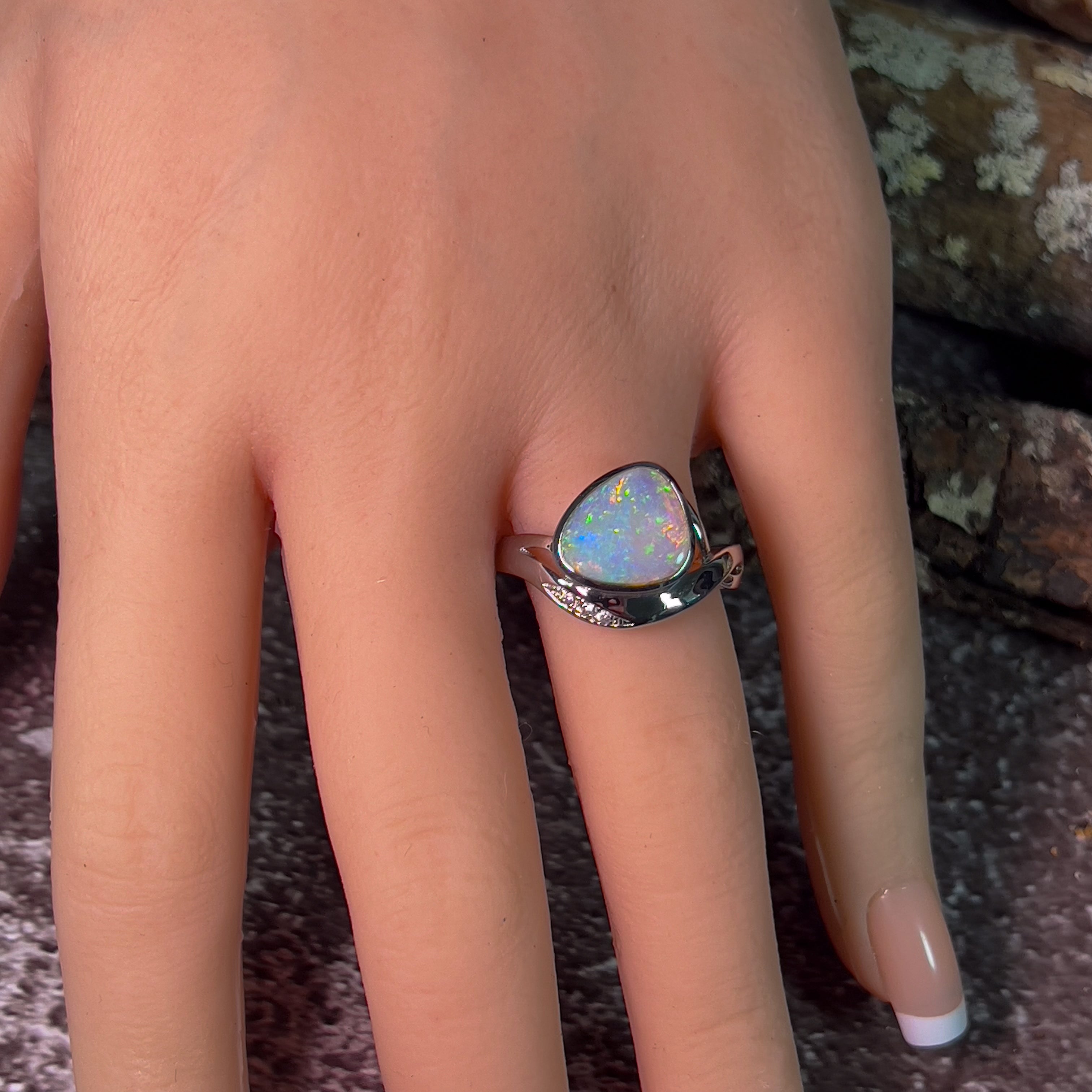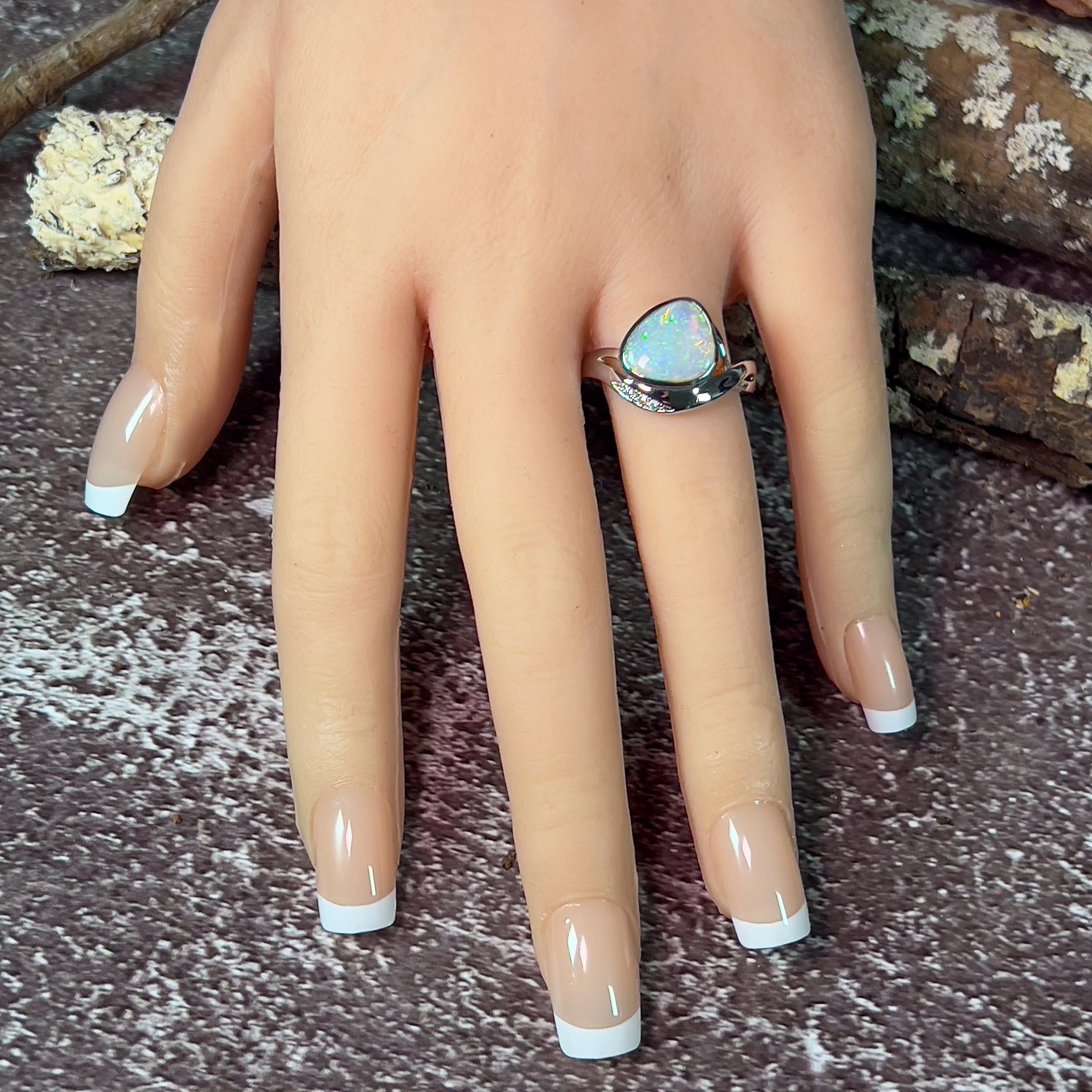 Experience the brilliance of our Sterling Silver Freeform Crystal Opal and CZ Ring! The stunning teal hue of the opal is complemented by sparkling cubic zirconia in a unique freeform design. Add a touch of elegance and color to your accessory game with this statement piece.