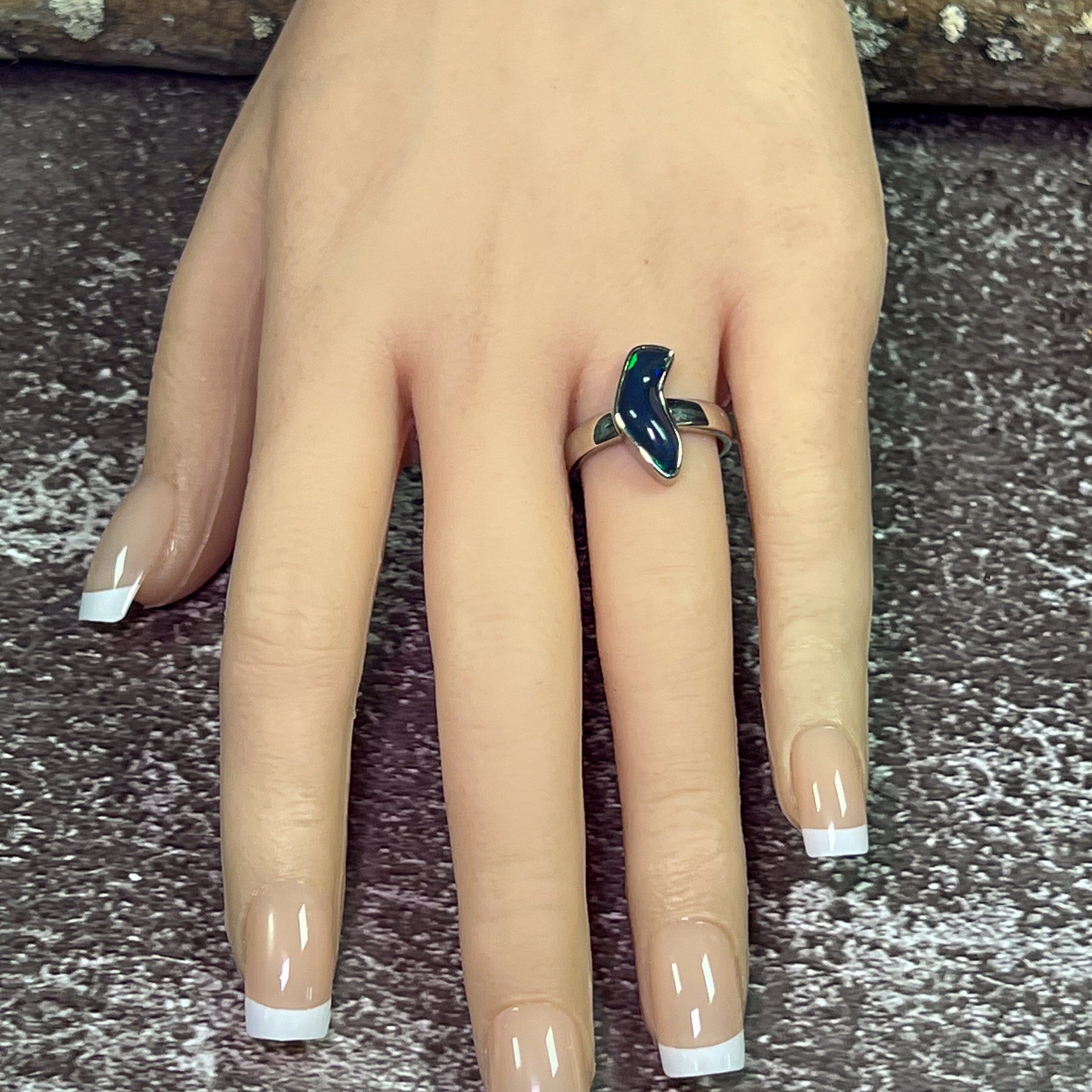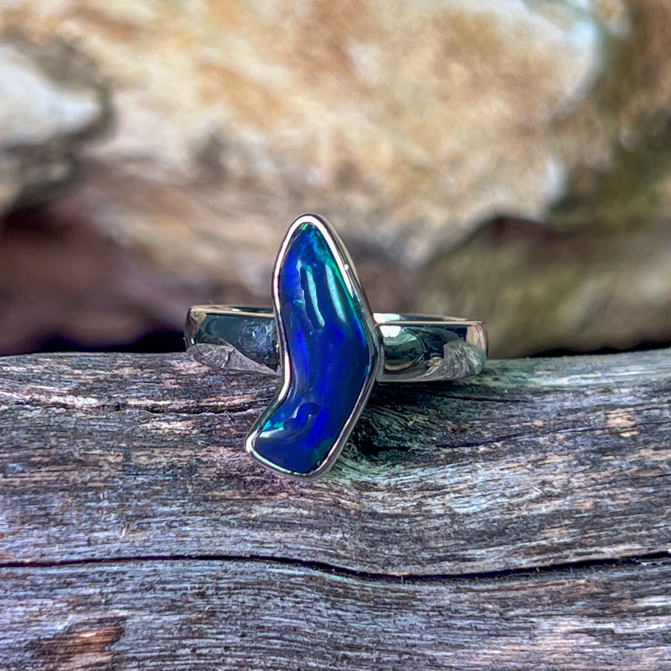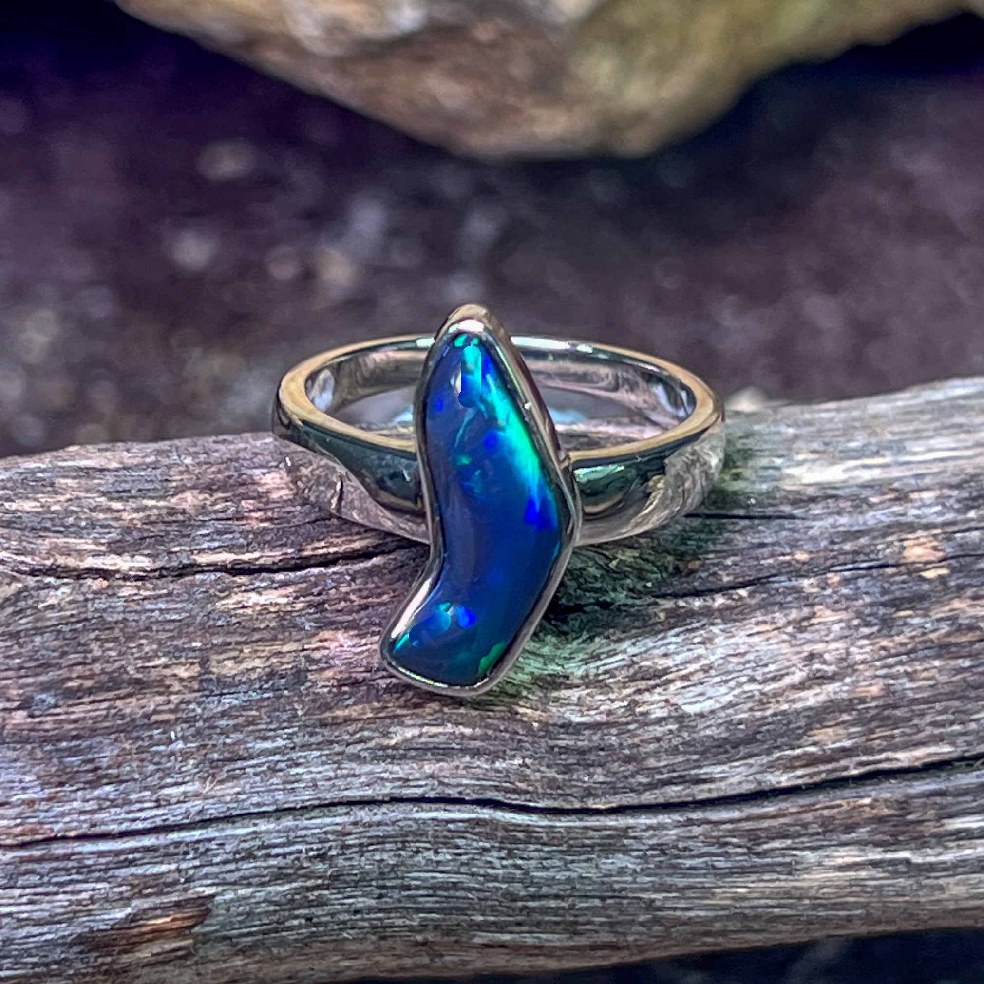 Indulge in the mesmerizing beauty of this Sterling Silver Freeform Green Blue Black Opal 2.15ct ring. The intriguing freeform design showcases a stunning black opal, radiating vibrant green and blue hues. Elevate your style with this unique and elegant piece.