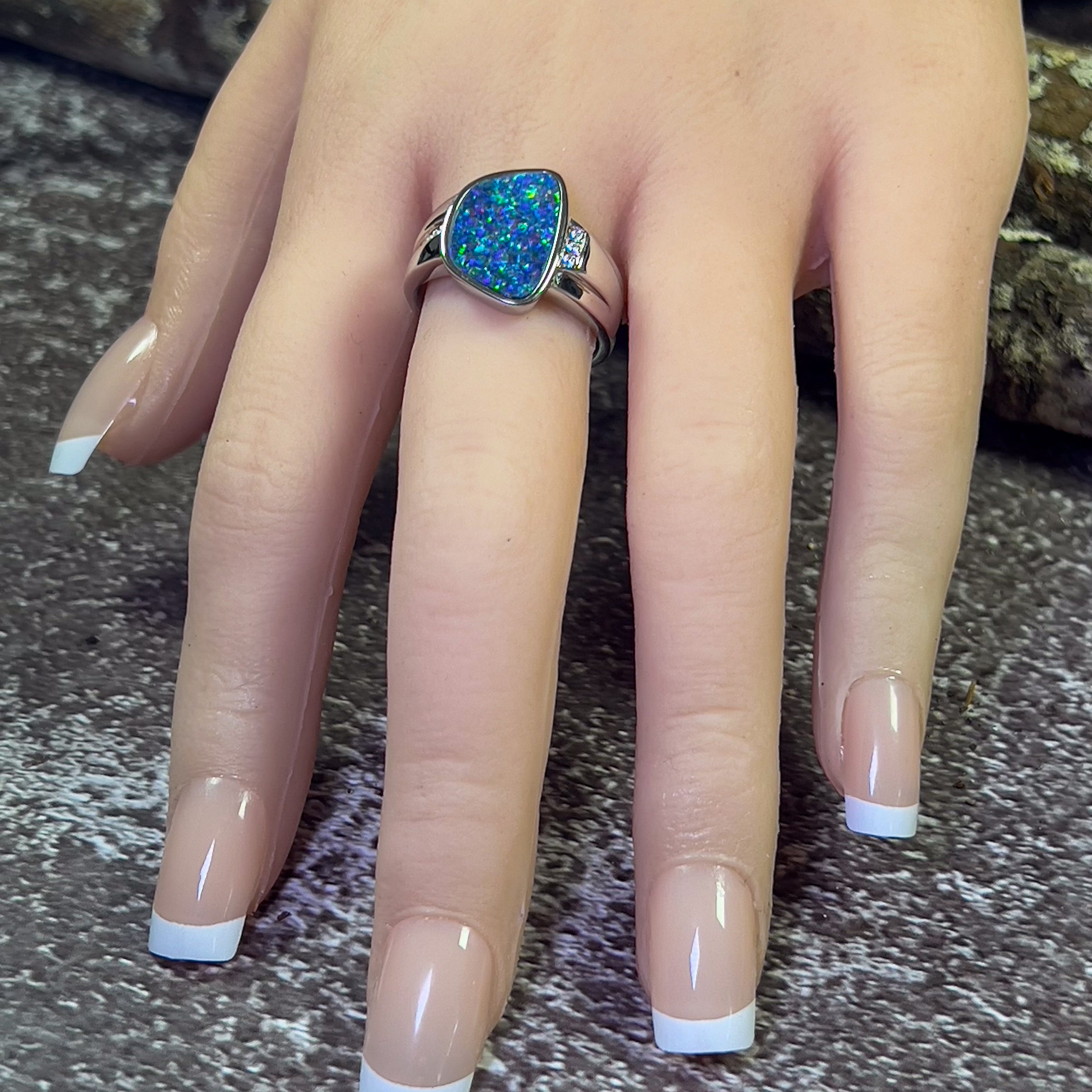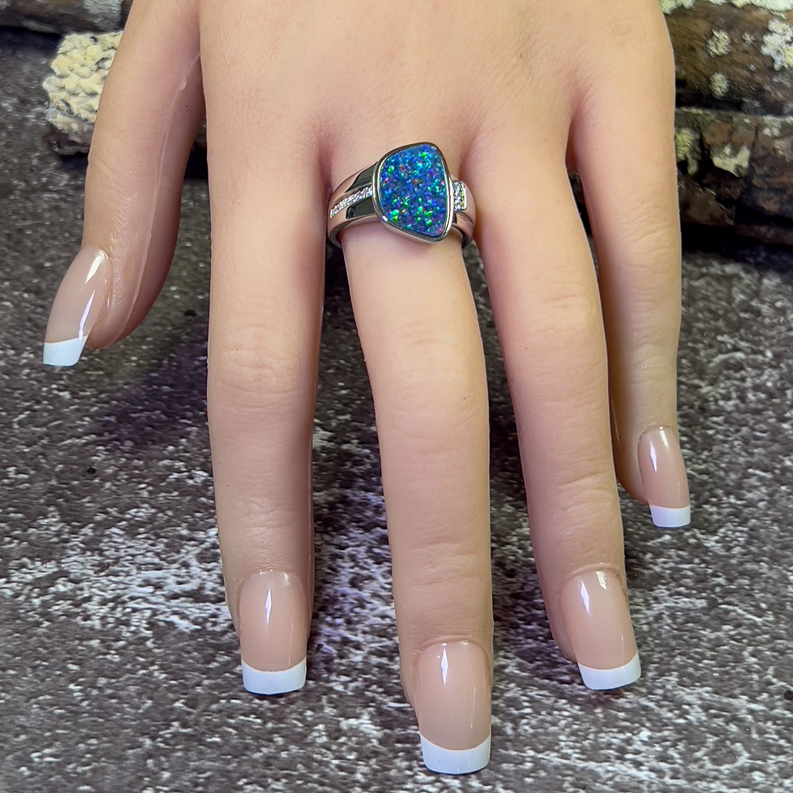 Spruce up your style with this Sterling Silver Opal doublet and cz ring. Perfect for the modern man, this freeform shape ring adds a touch of elegance to any outfit. Dress to impress with this must-have accessory. (Ring band sold separately)