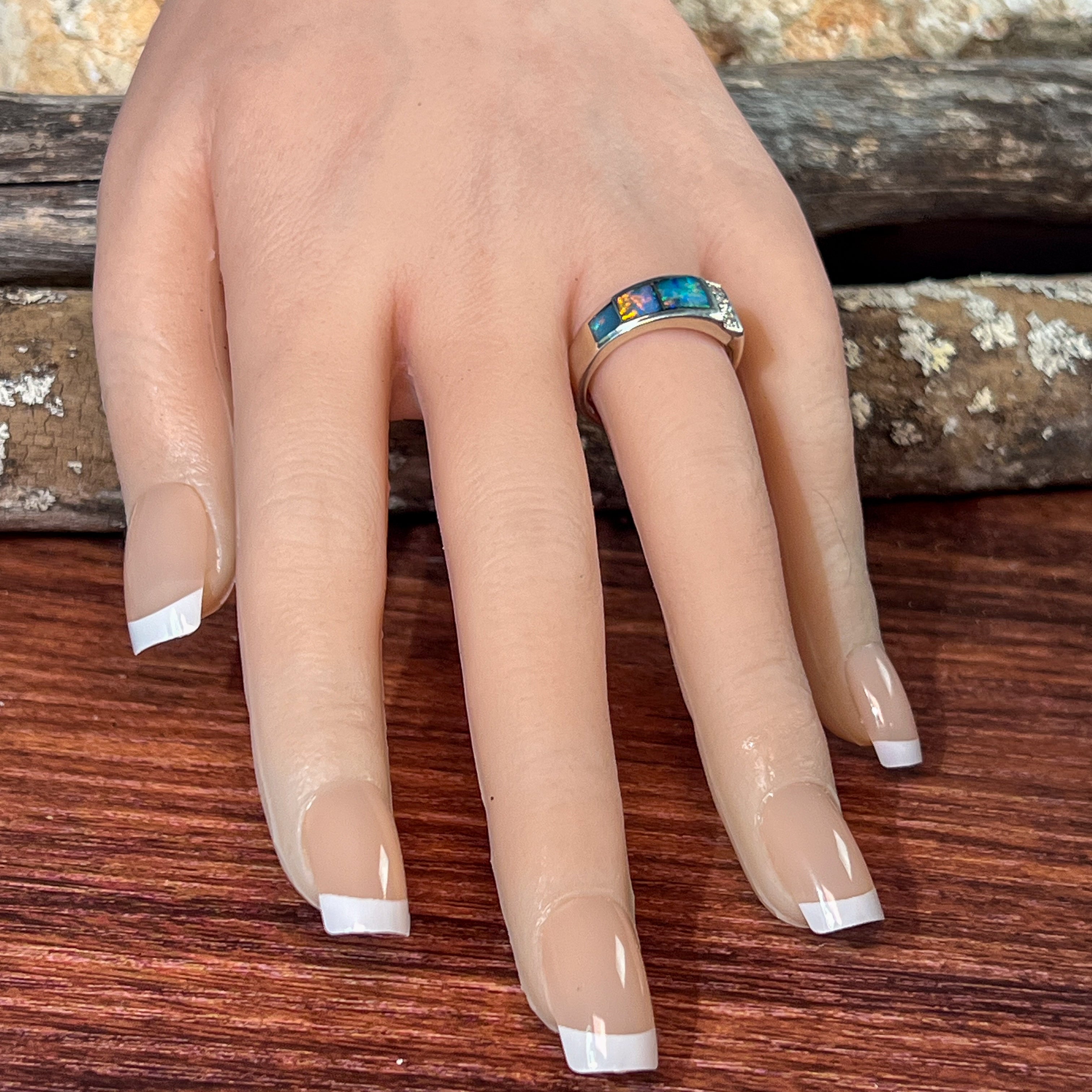 This sterling silver ring features a sleek, modern design with a unique natural opal inlay. The combination of polished silver and vibrant opal creates an elegant piece that stands out for its refined simplicity and lasting quality. Perfect for those seeking a contemporary accessory with a touch of natural beauty.