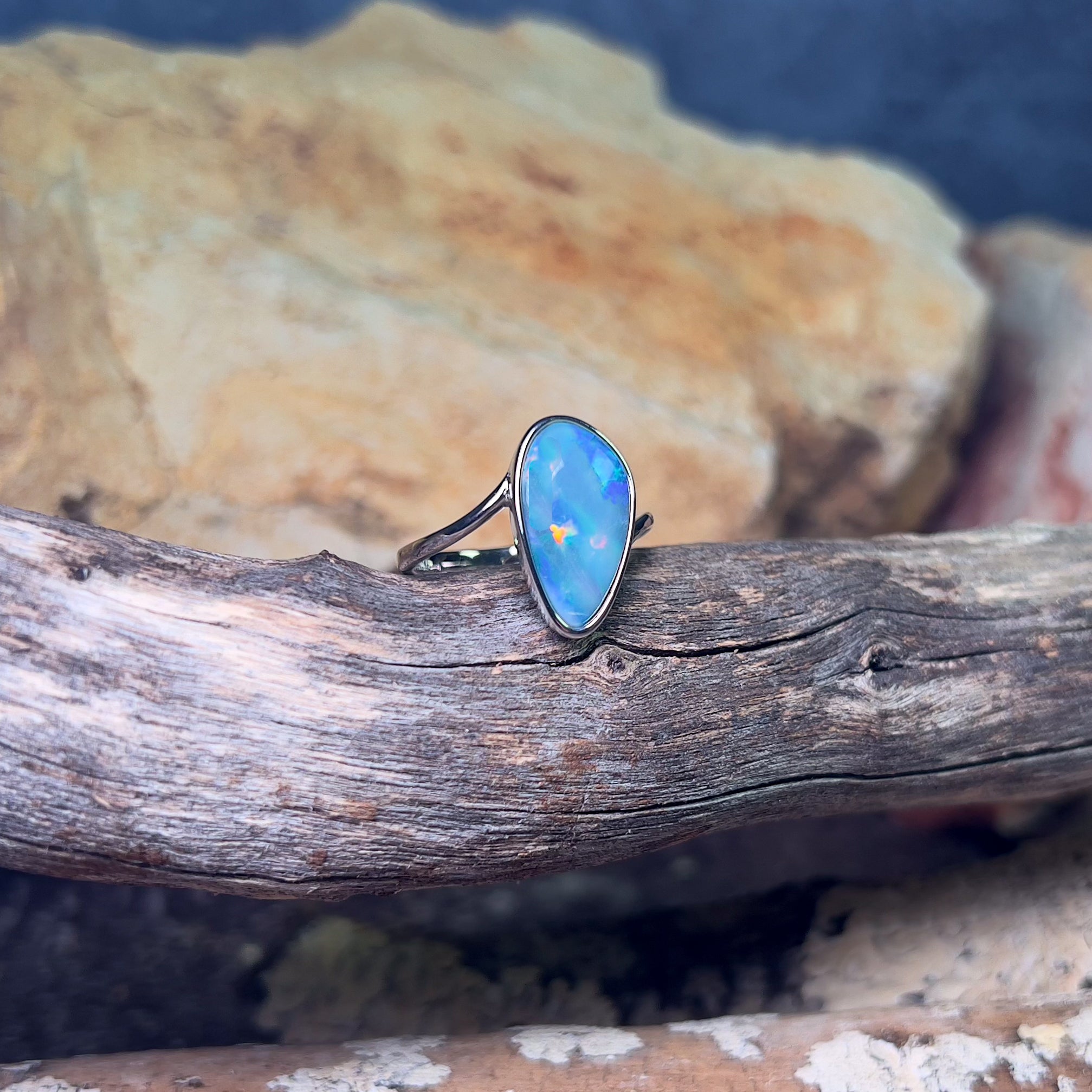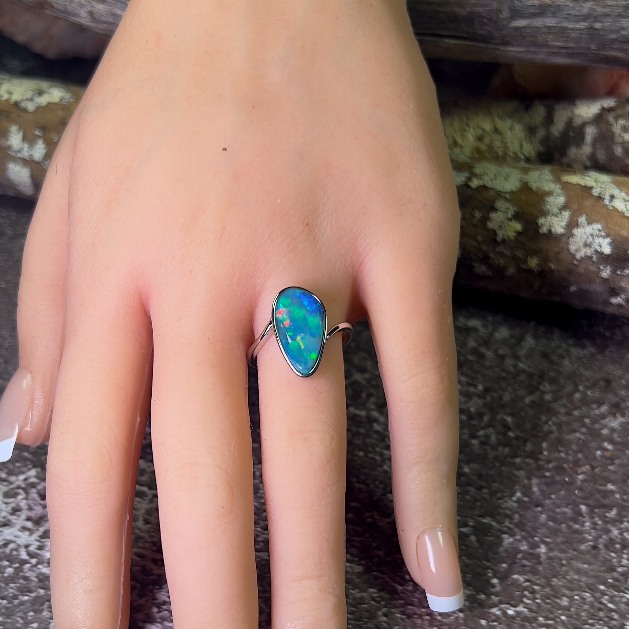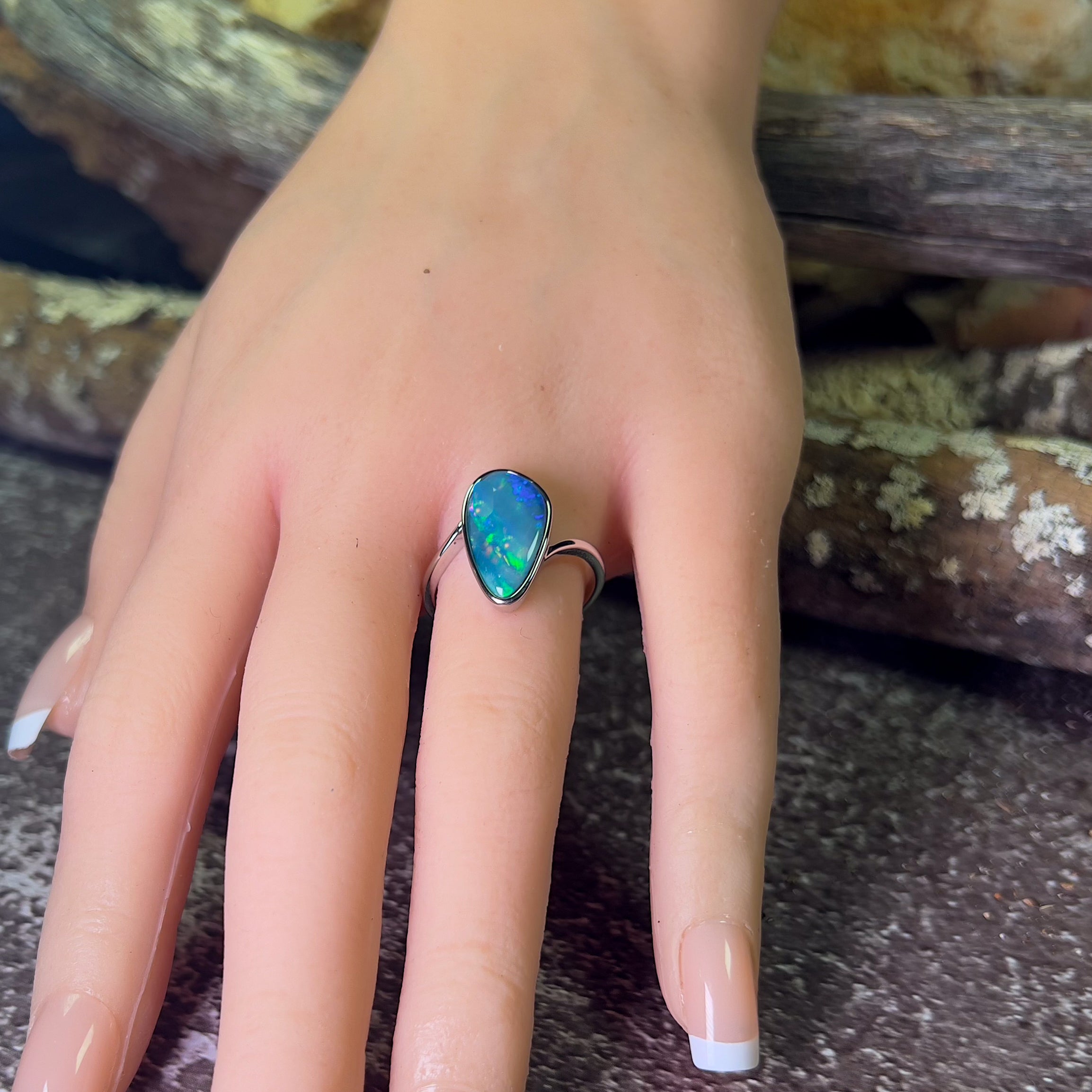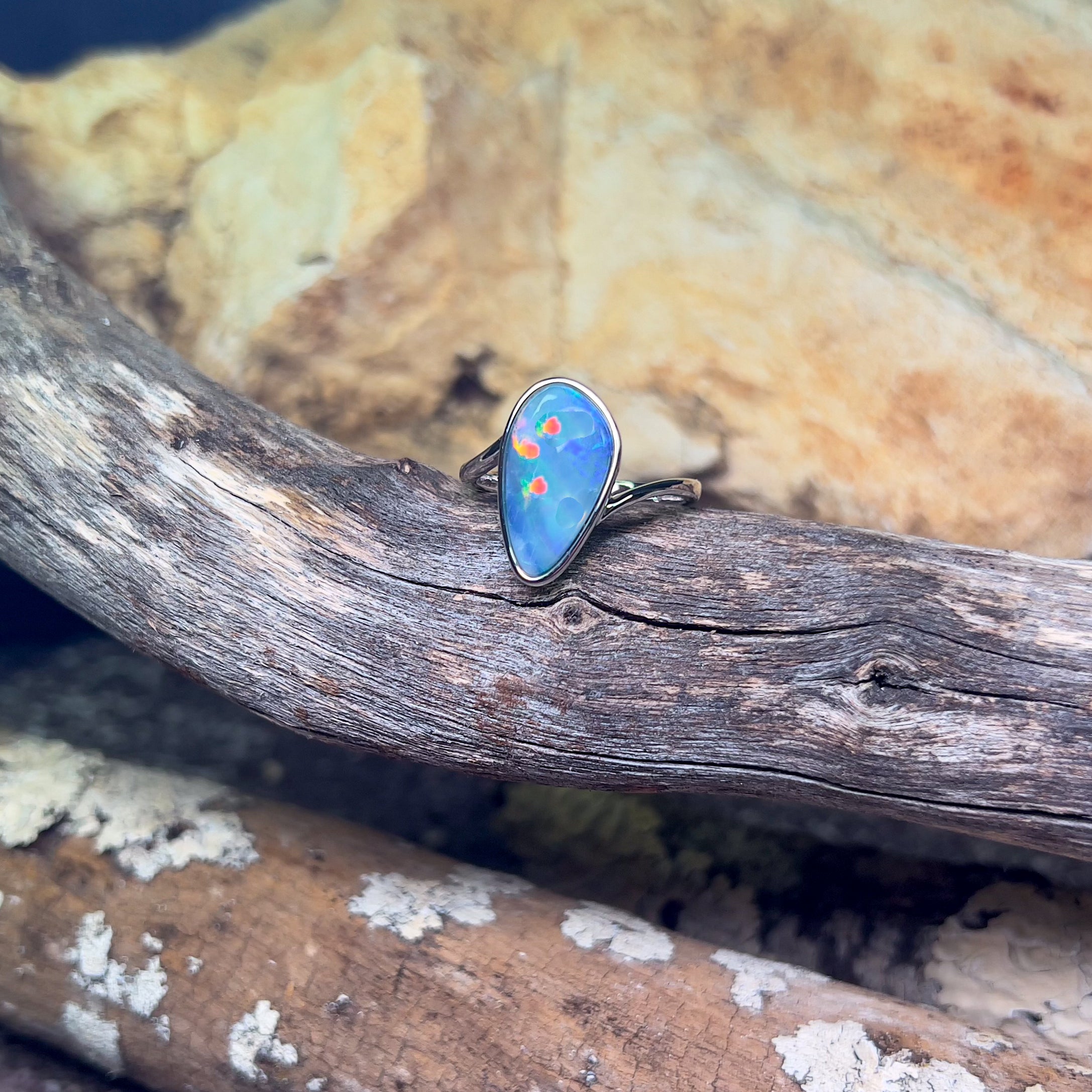 This stunning Sterling Silver Opal doublet solitaire pear shape ring features a natural opal that radiates beauty and elegance. Perfect for adding a touch of sophistication to any outfit, this ring is sure to make a statement and leave a lasting impression. Embrace the natural beauty with this exquisite piece.