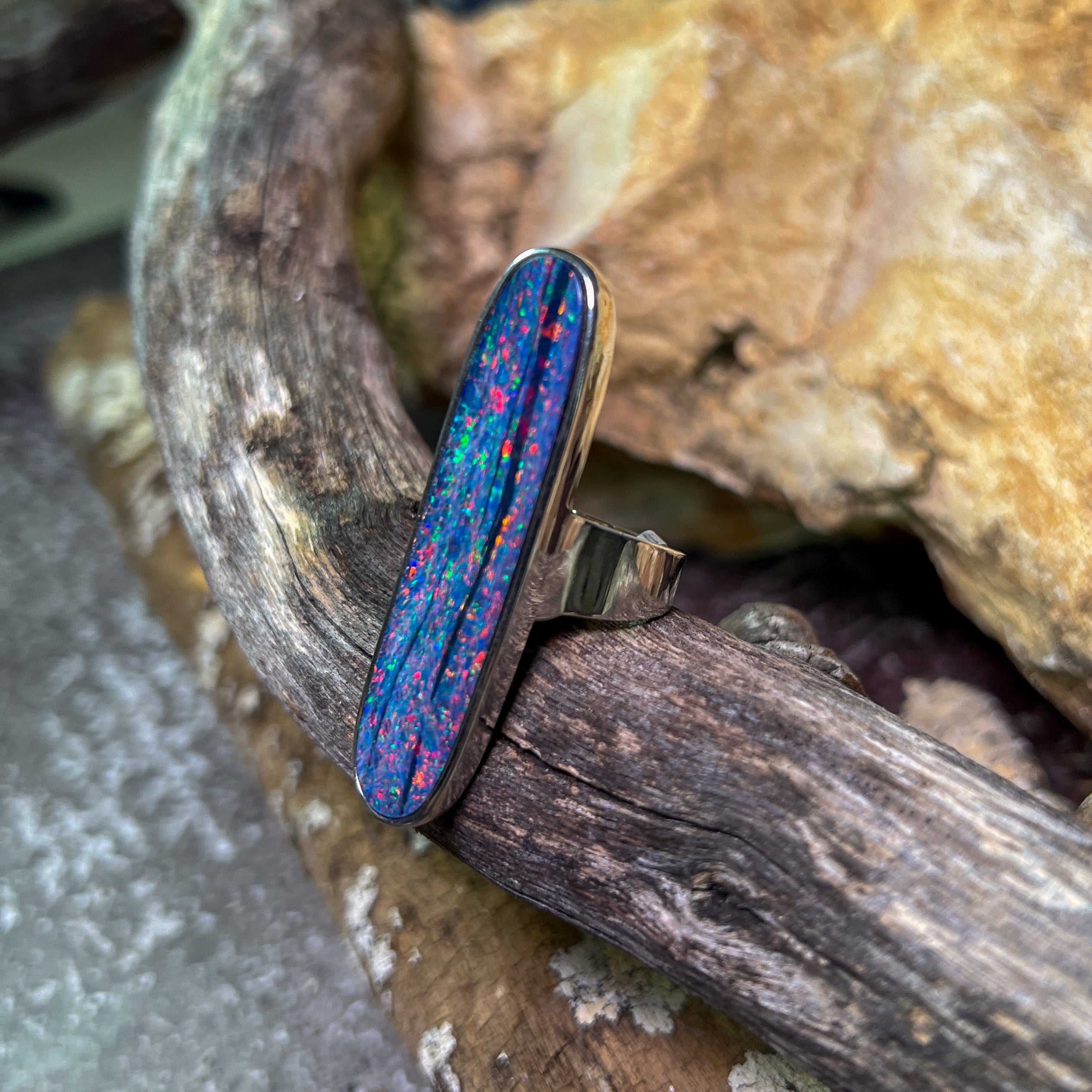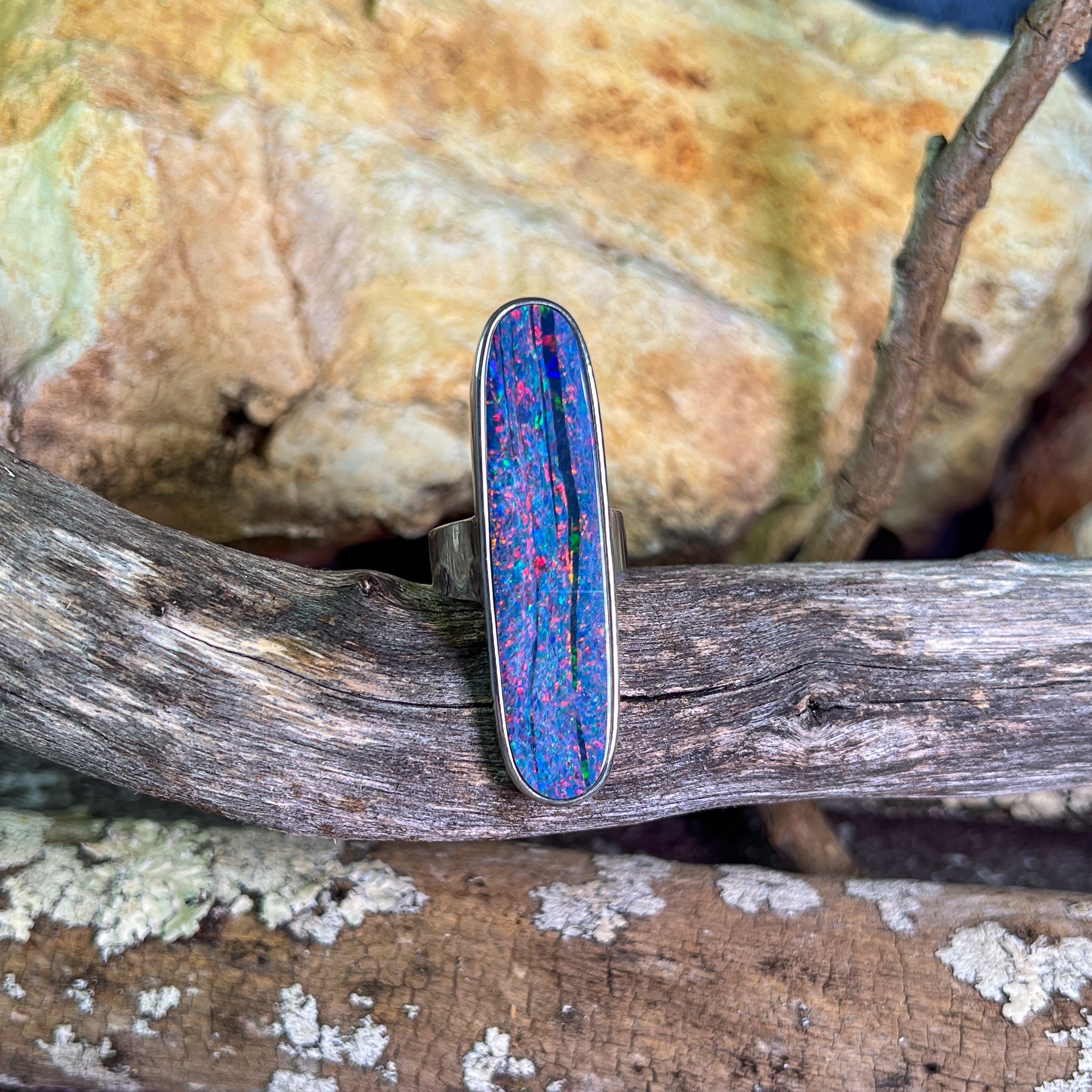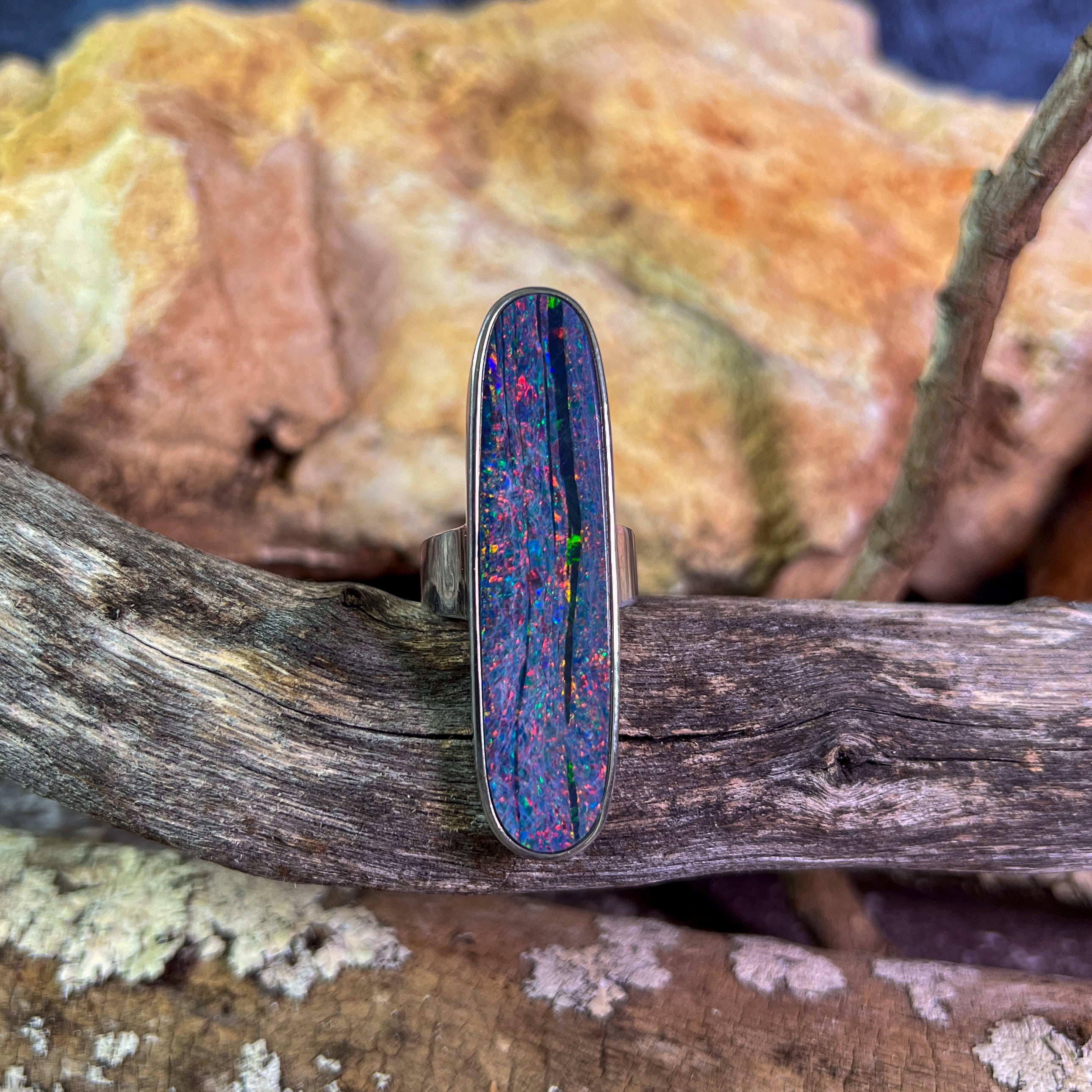 One Sterling Silver 16.5ct Australian Opal doublet bezel set ring with Red Fire and Green Blue colours.