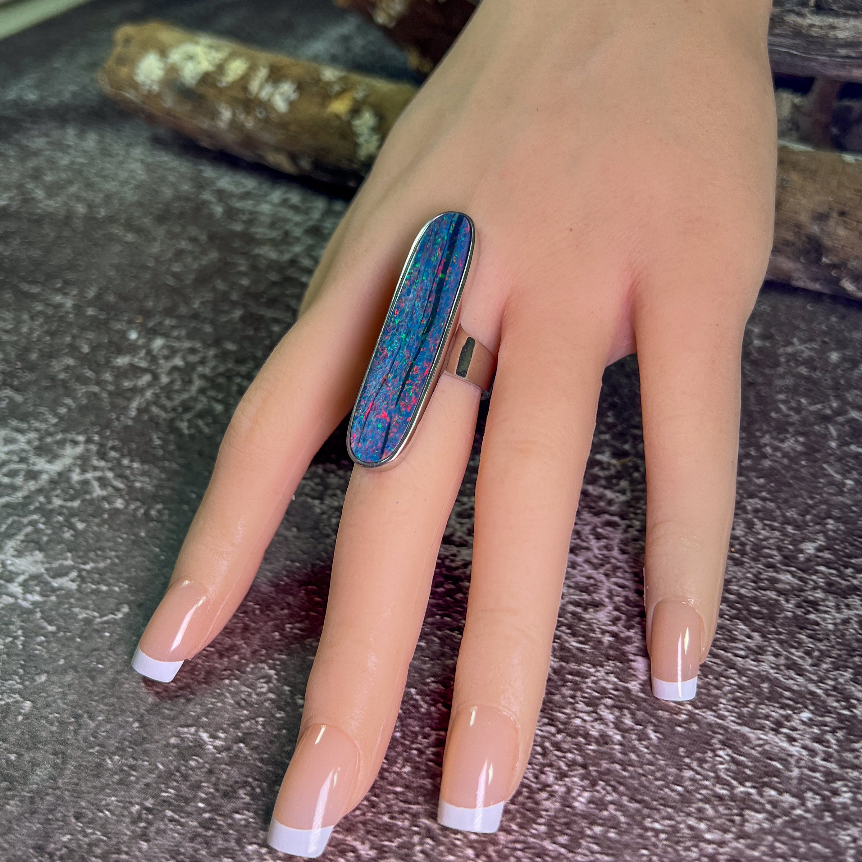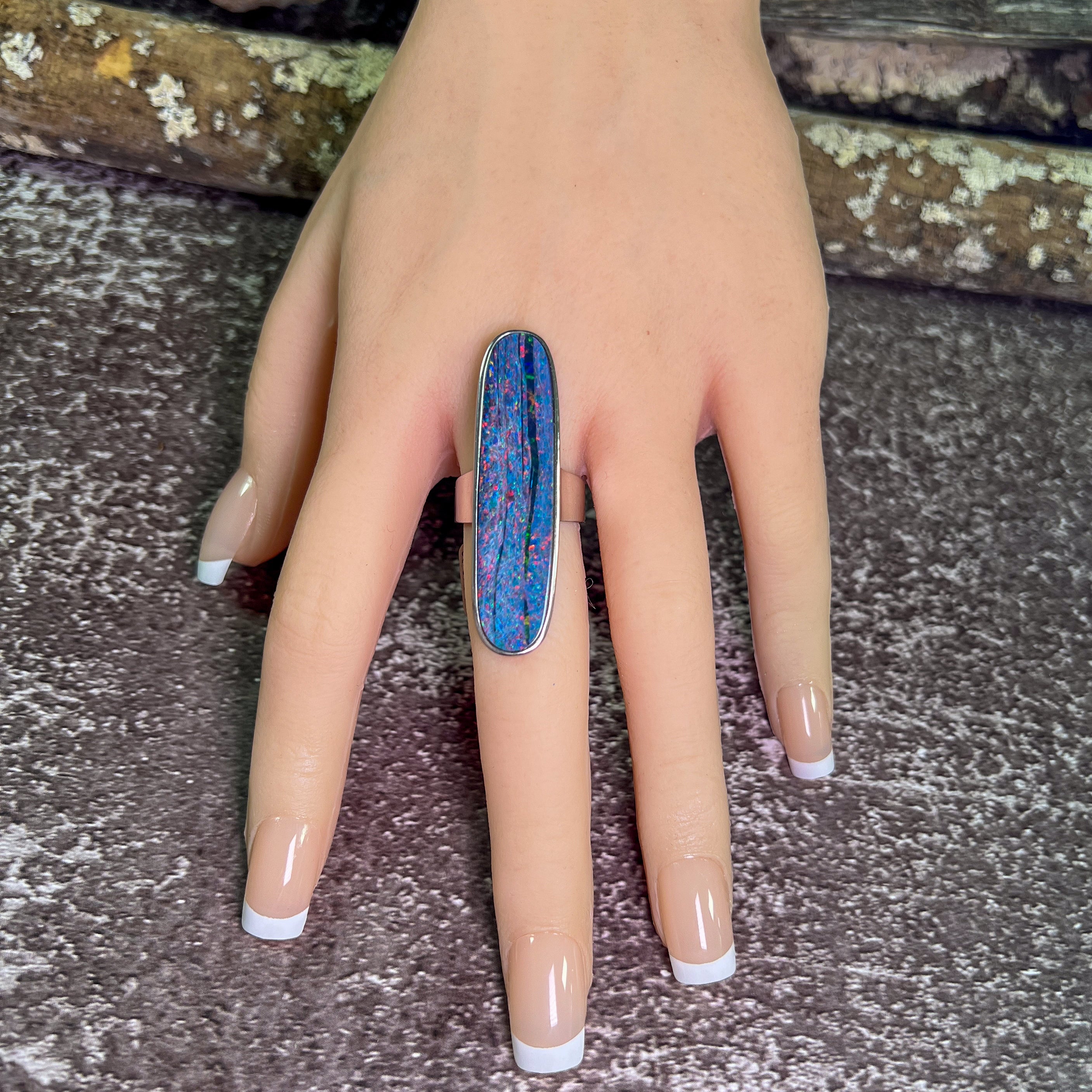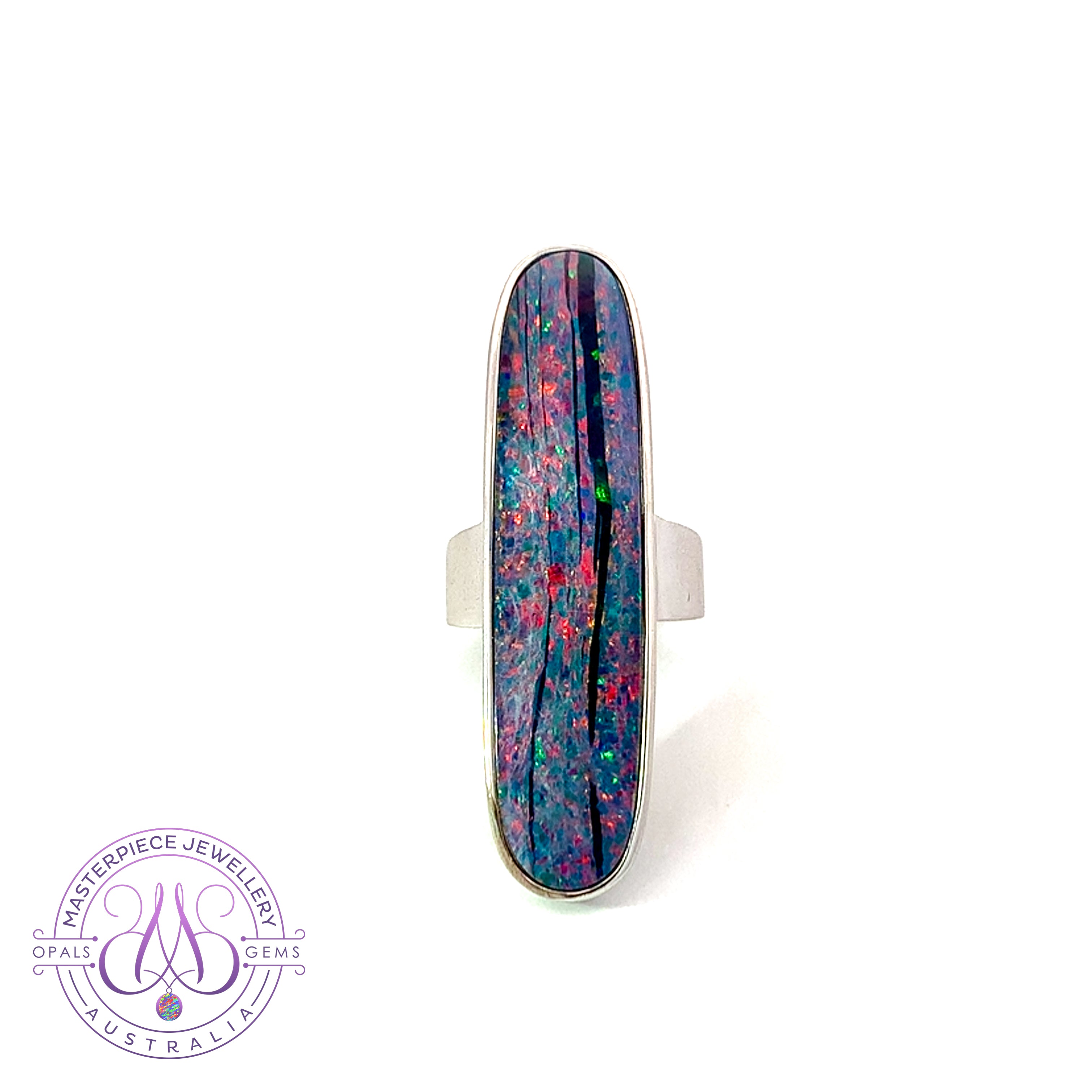 One Sterling Silver 16.5ct Australian Opal doublet bezel set ring with Red Fire and Green Blue colours.