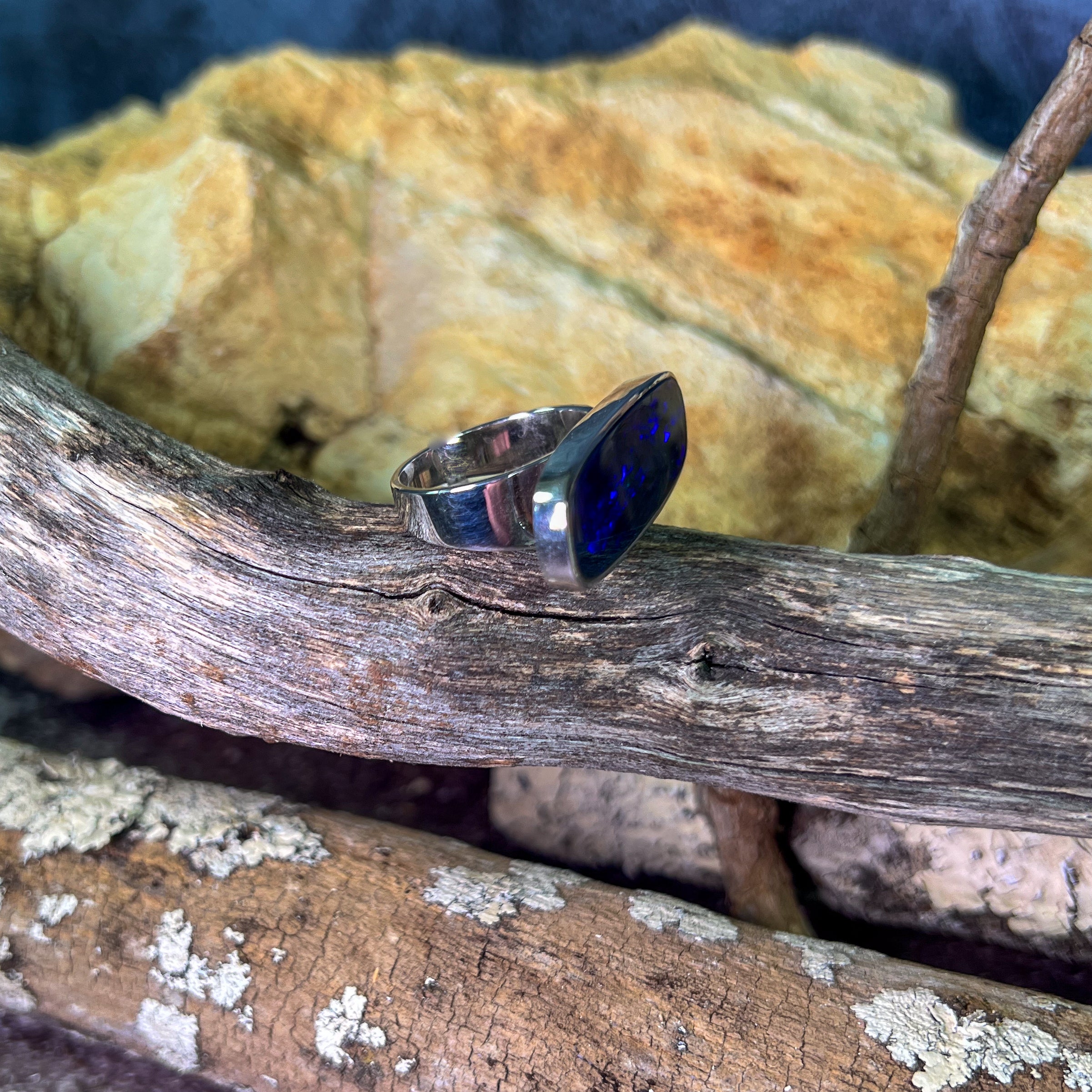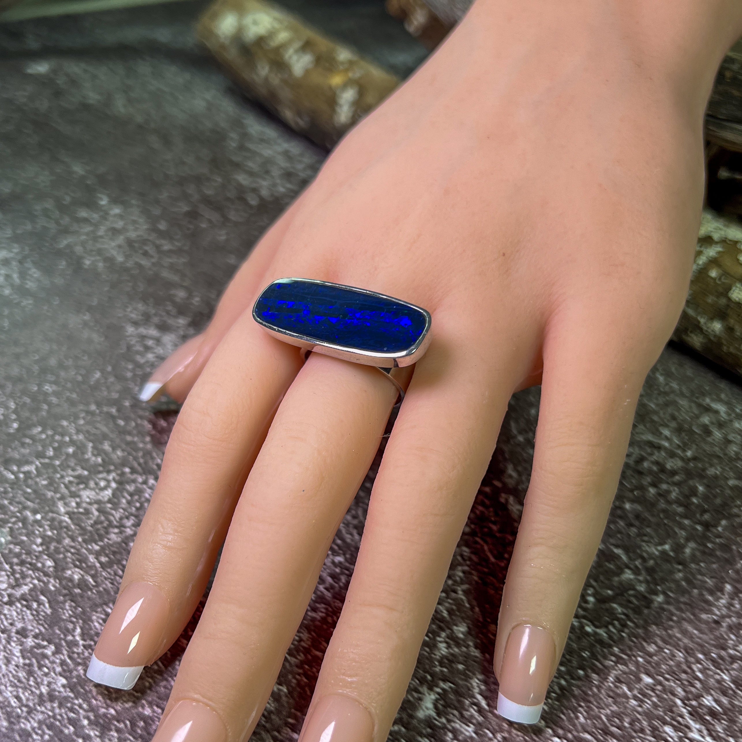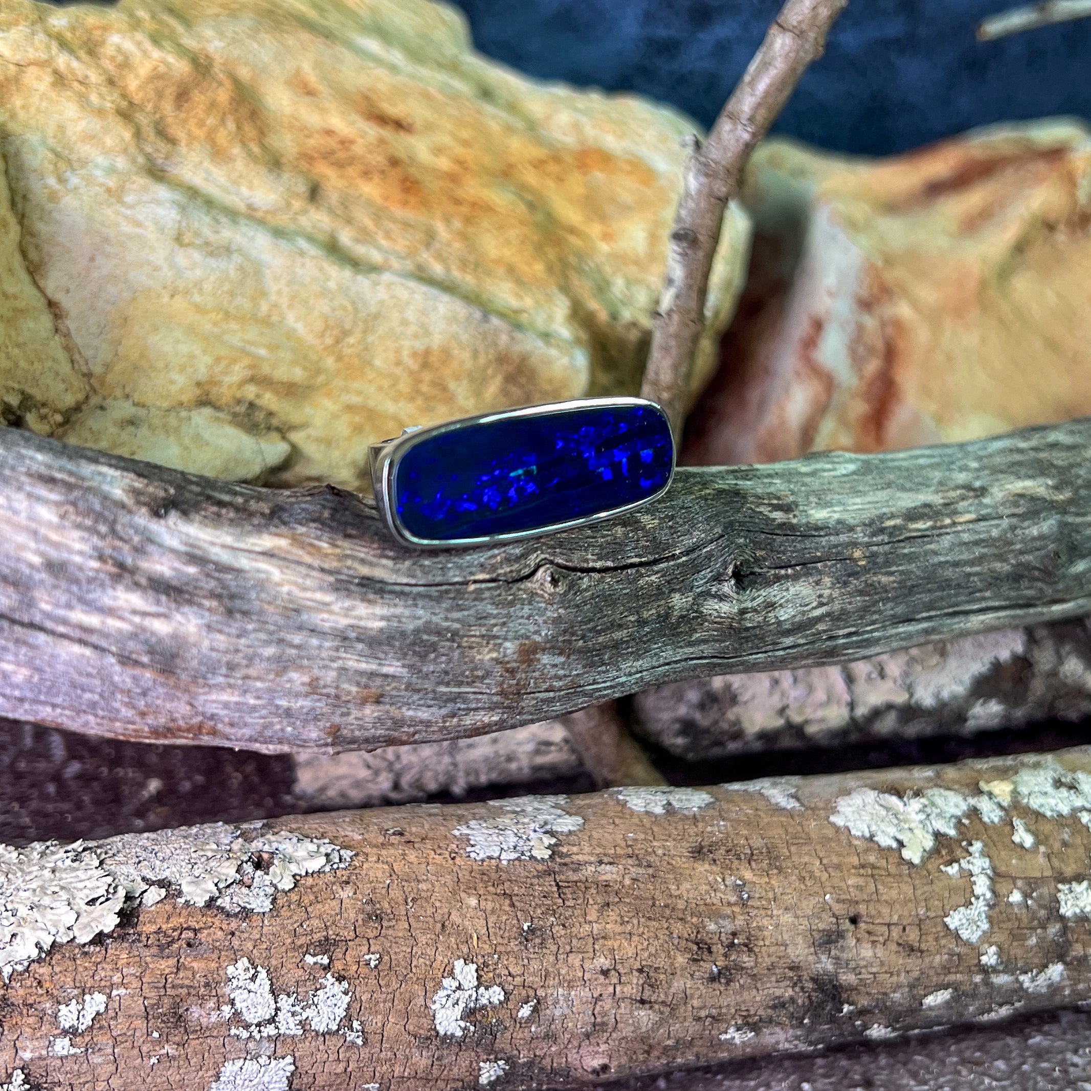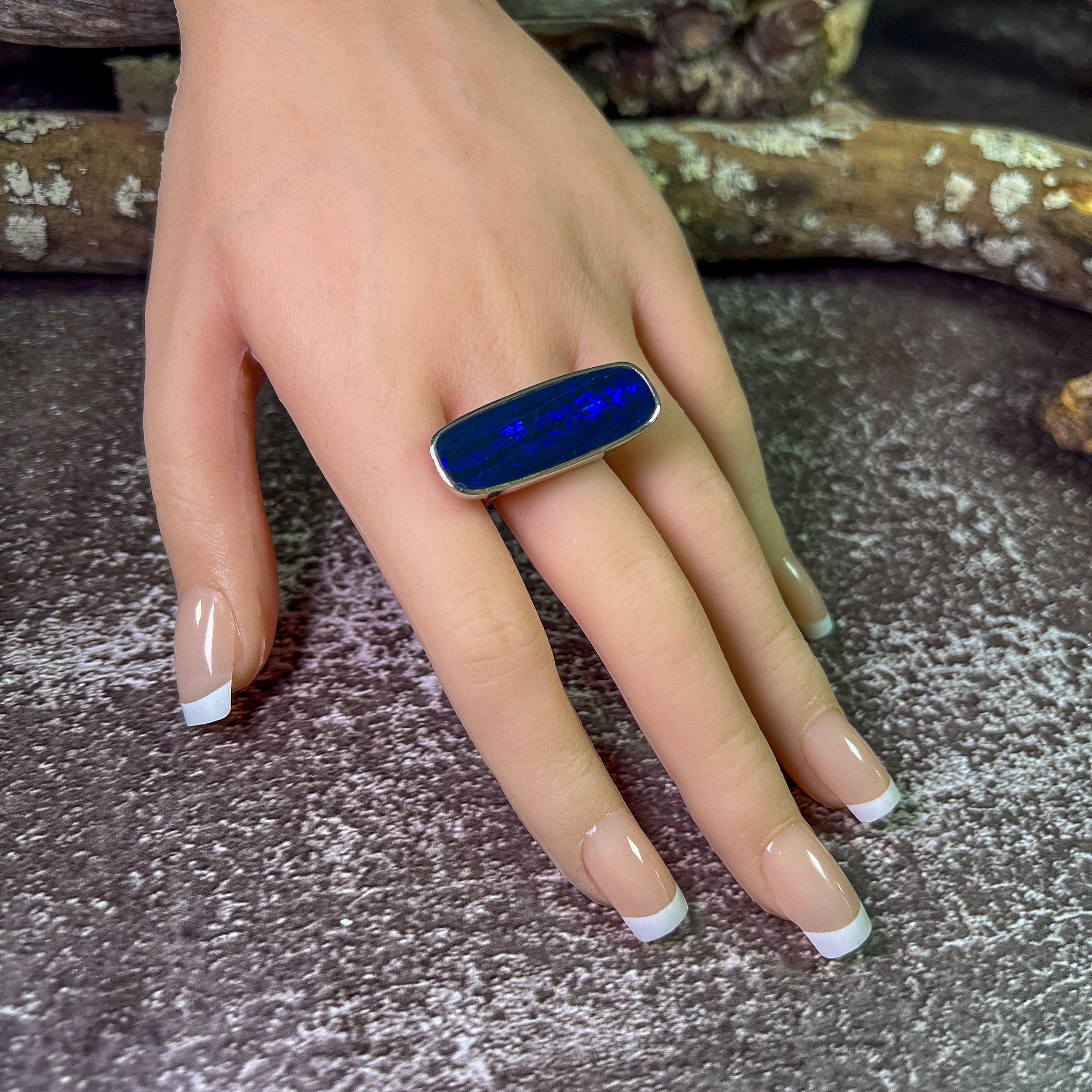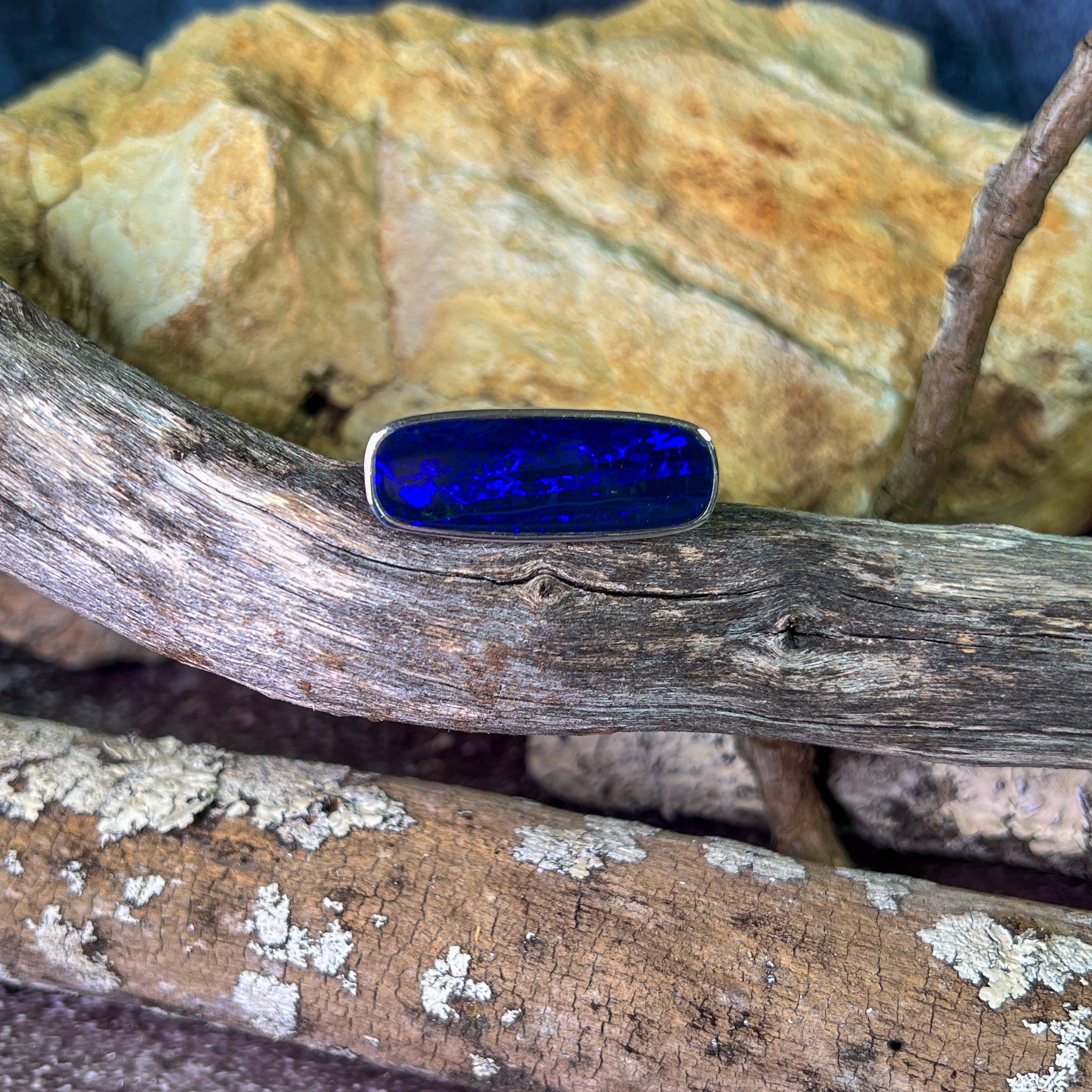 Introduce a touch of opulence with our Sterling Silver Opal ring. The mesmerizing navy blue opal steals the show as it is carefully hand-set on a statement ring. This unique piece, set sideways, is a true display of elegance and exclusivity. Elevate any outfit with this one-of-a-kind opal ring.