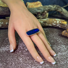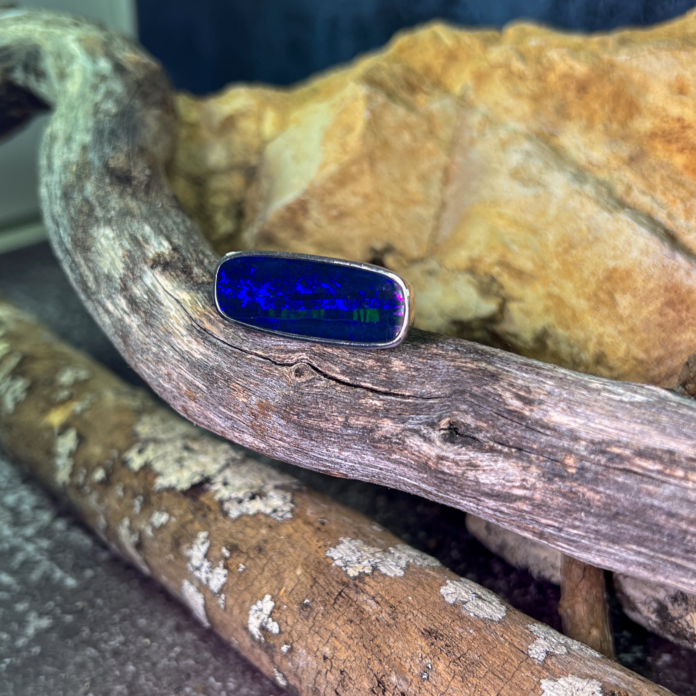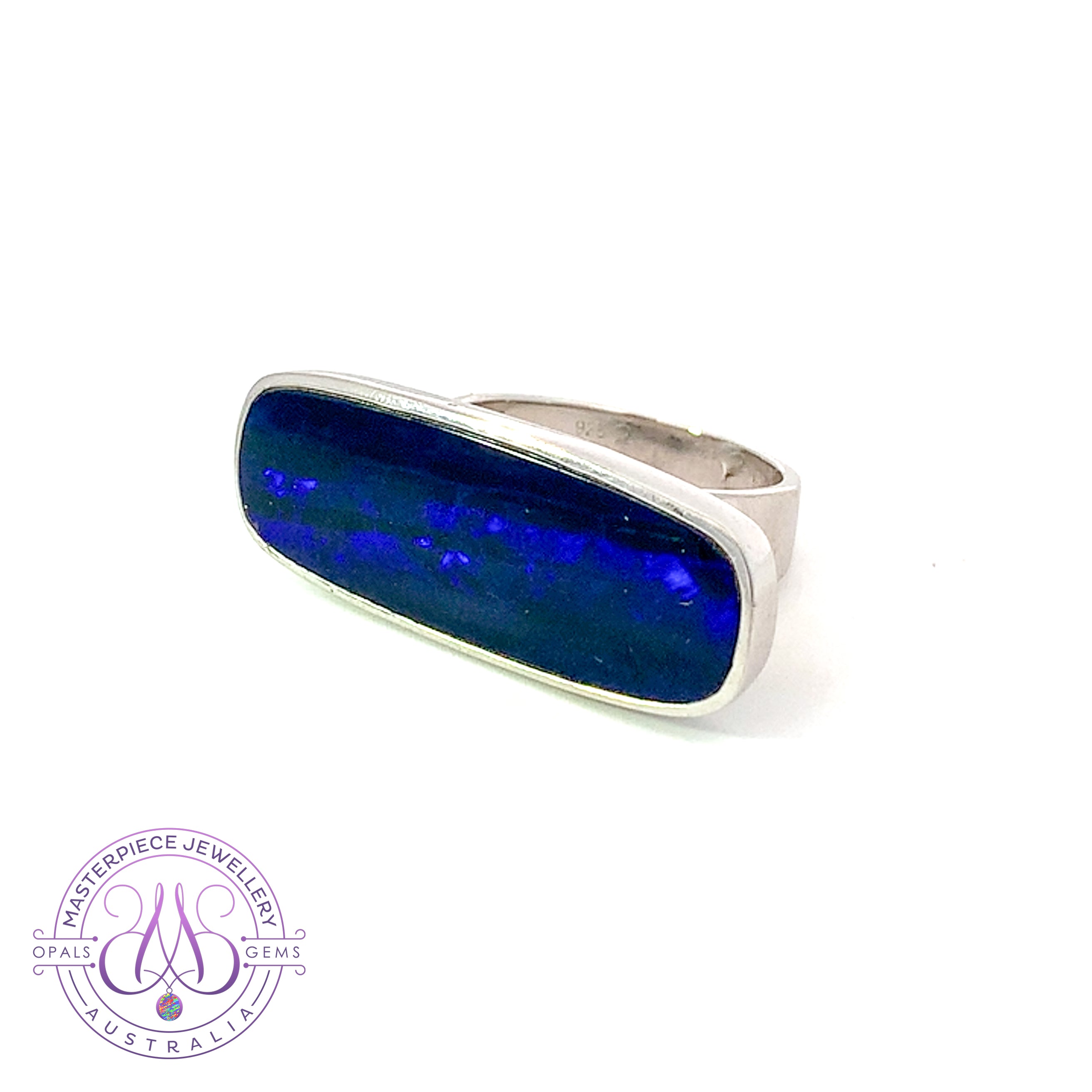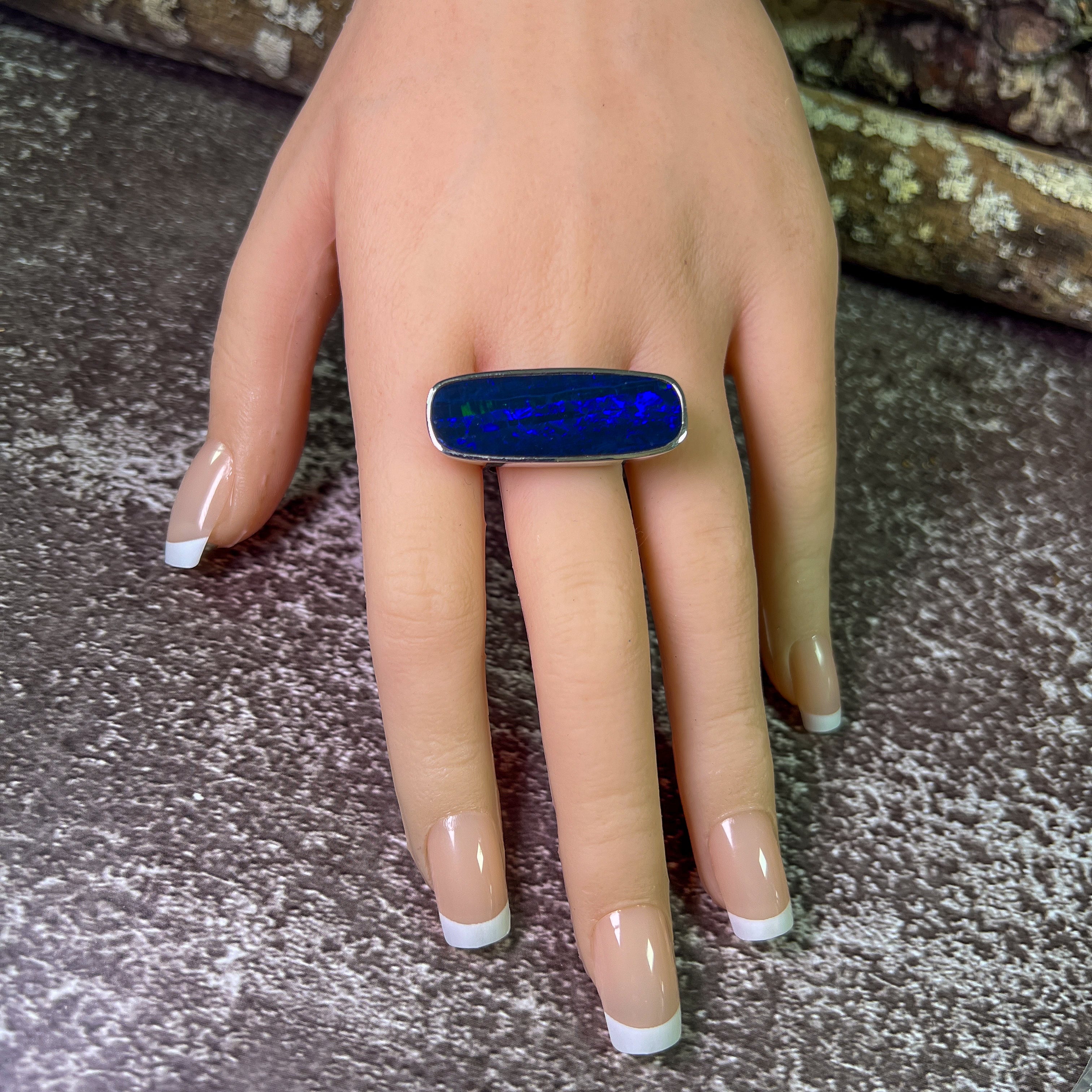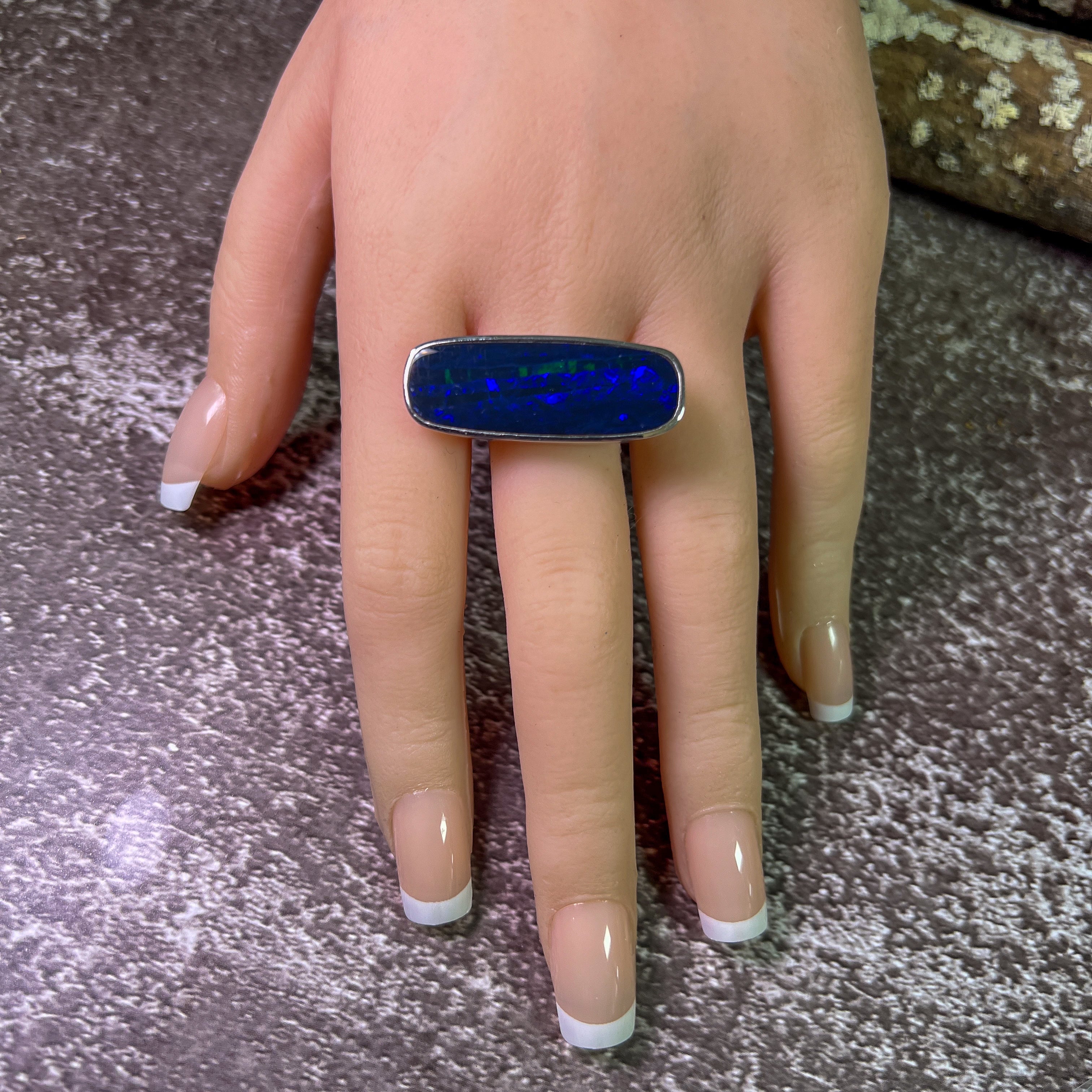 Introduce a touch of opulence with our Sterling Silver Opal ring. The mesmerizing navy blue opal steals the show as it is carefully hand-set on a statement ring. This unique piece, set sideways, is a true display of elegance and exclusivity. Elevate any outfit with this one-of-a-kind opal ring.