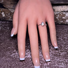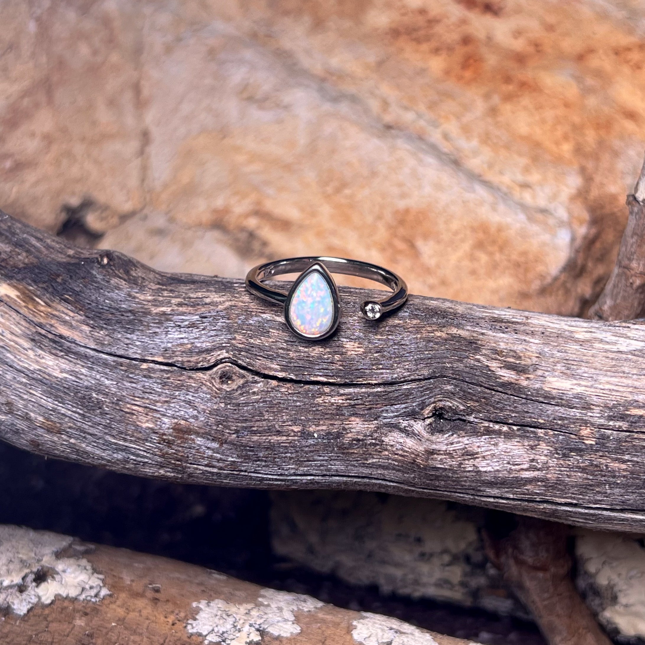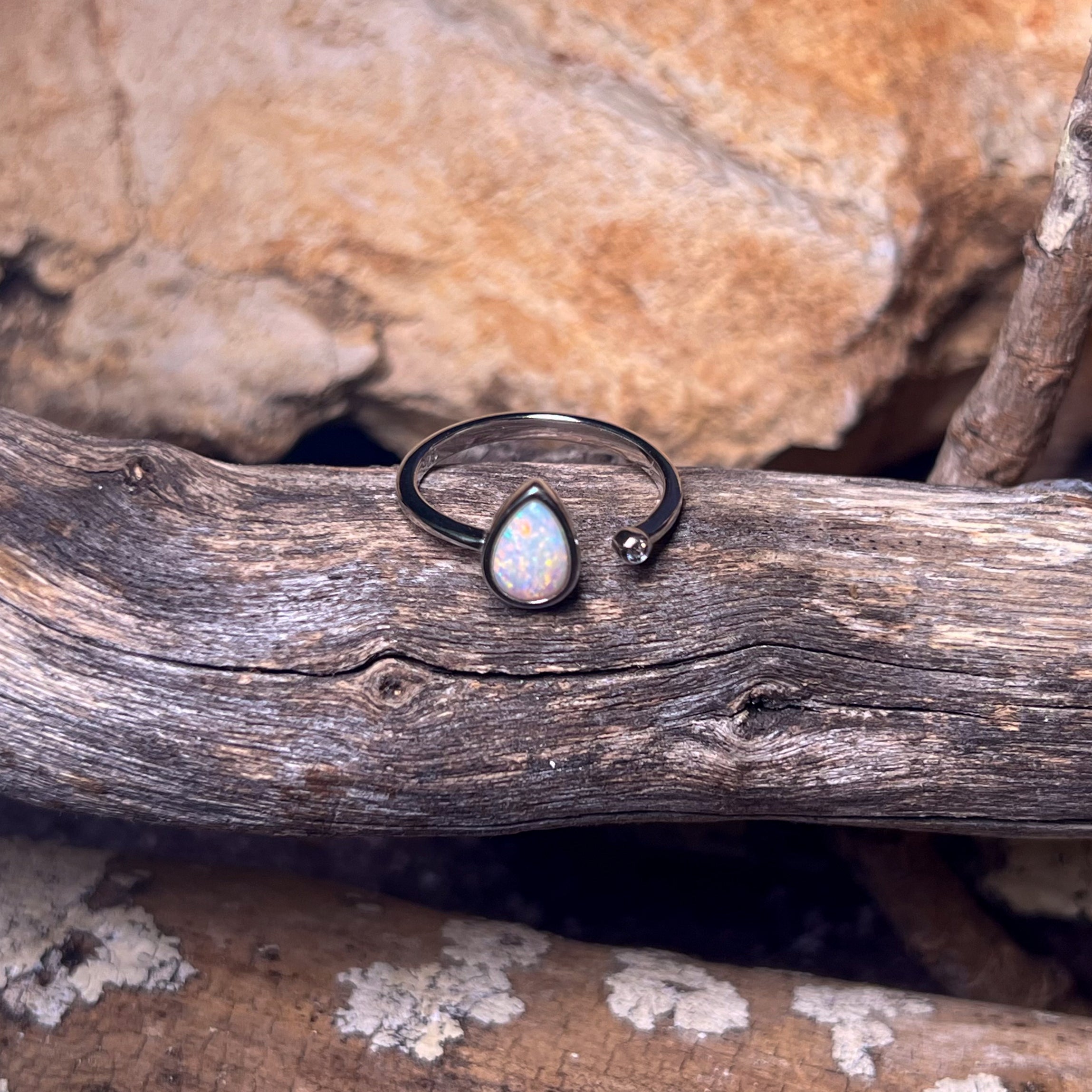 This stunning open ring features a dainty white opal set in a beautiful pear shape. Made with high-quality sterling silver, this solitaire ring is the perfect accessory to add a touch of elegance and sophistication to any outfit. The unique design allows for easy adjustability and comfort, making it a must-have for any jewelry lover. Elevate your style with this timeless piece.