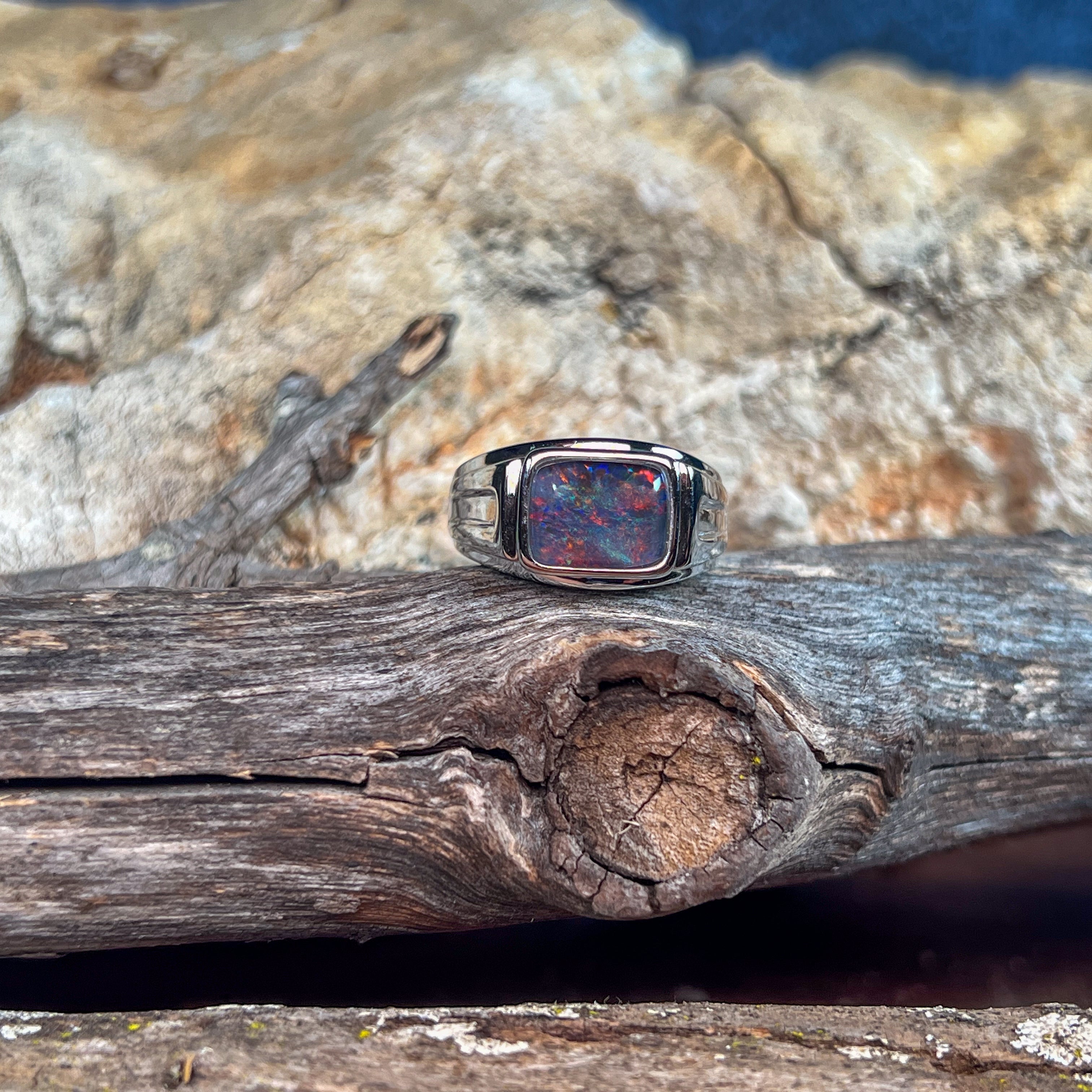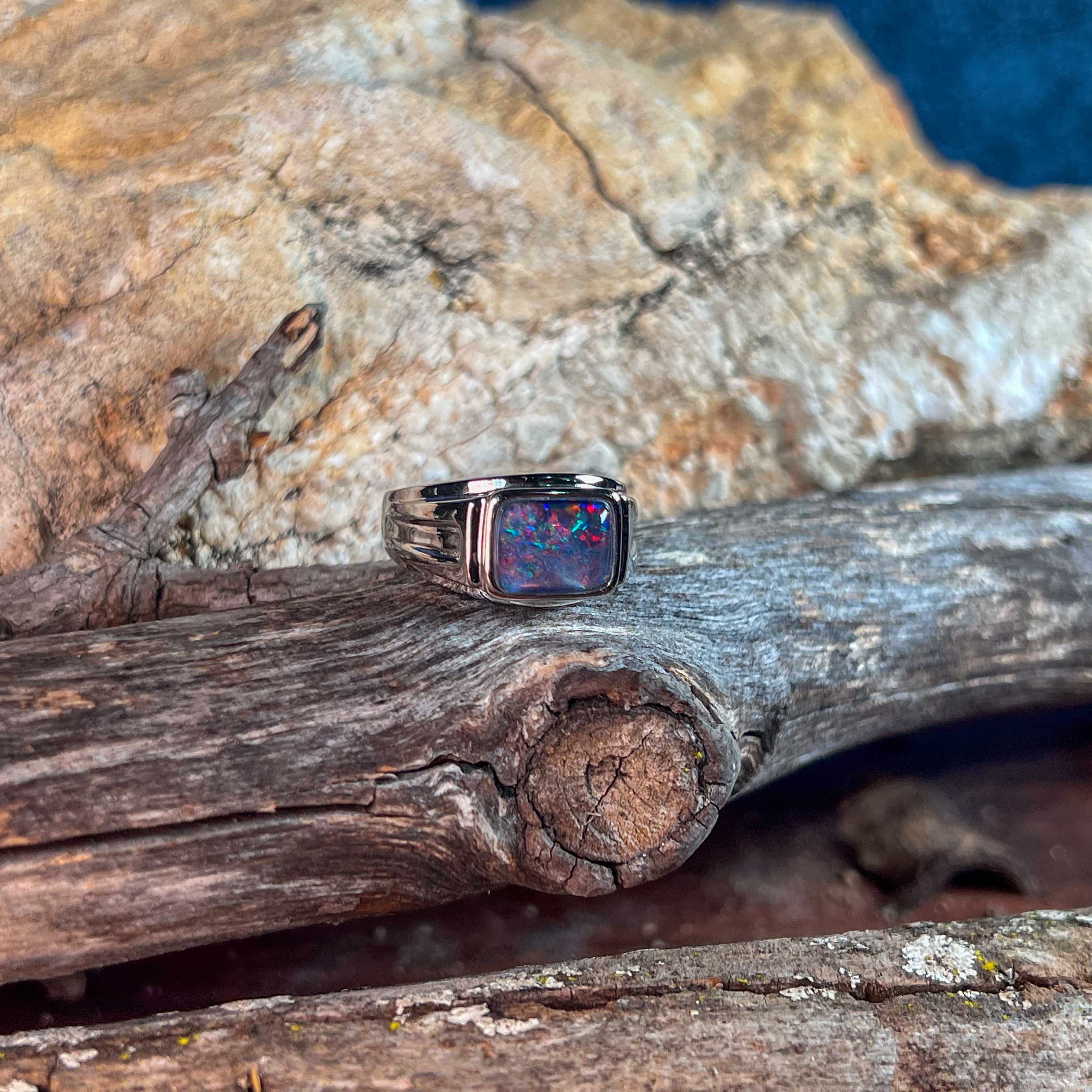 Sterling Silver rectangular Opal Triplet bezel set ring