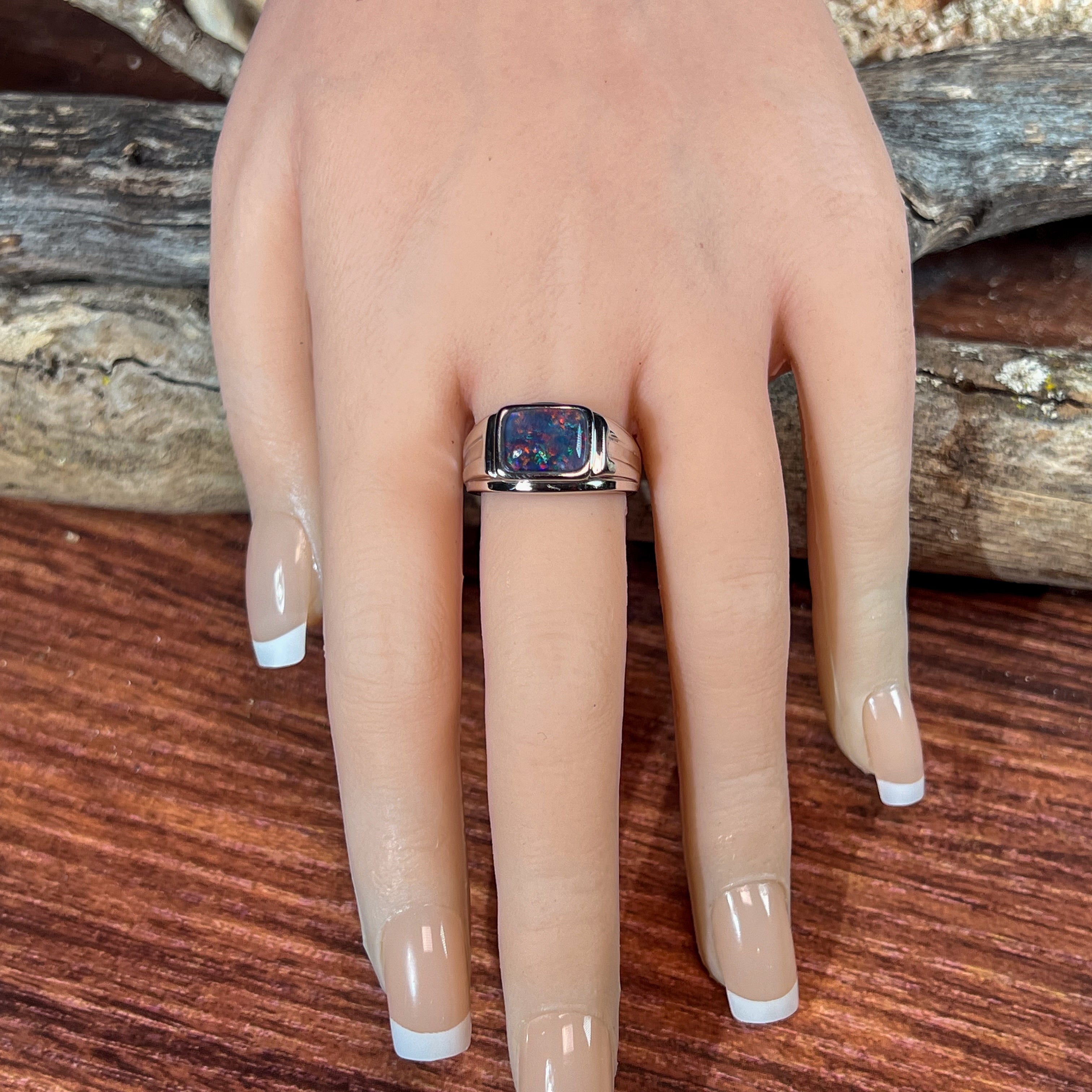 Elevate your style with this sterling silver ring featuring a striking rectangular opal triplet, expertly bezel set for lasting security. The vibrant opal displays a captivating play of color, making it a perfect statement piece that adds elegance to any outfit. Crafted with care, this ring combines durability and unique beauty, ideal for those who appreciate fine craftsmanship and timeless