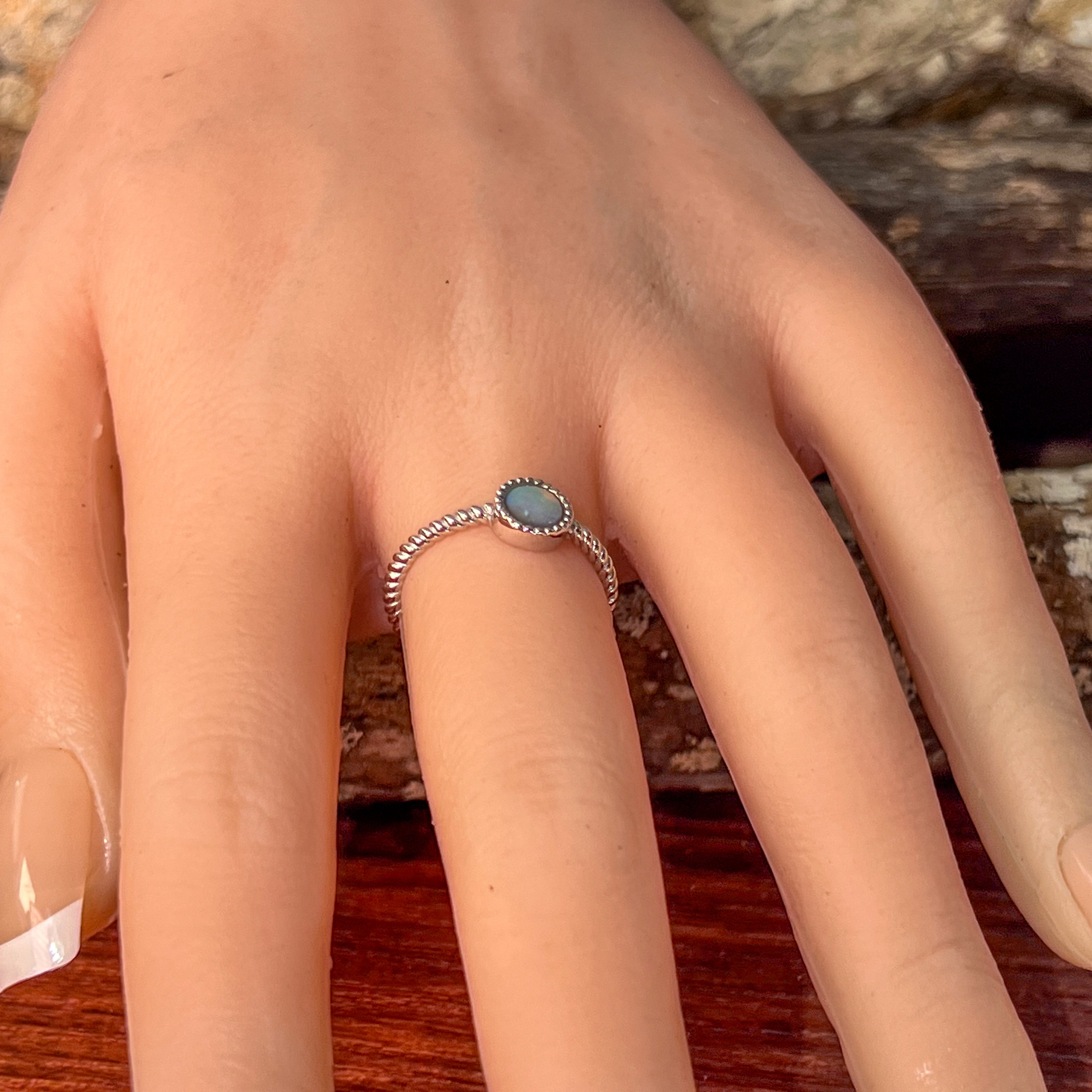 Add a splash of sparkle to your day with this Sterling Silver rope design solitaire Crystal Opal ring. Its twisting rope band wraps around a dazzling crystal opal, catching the light and turning heads wherever you go. Perfect for those who love a little whimsy with their elegance, this ring brings charm and shine to any outfit.