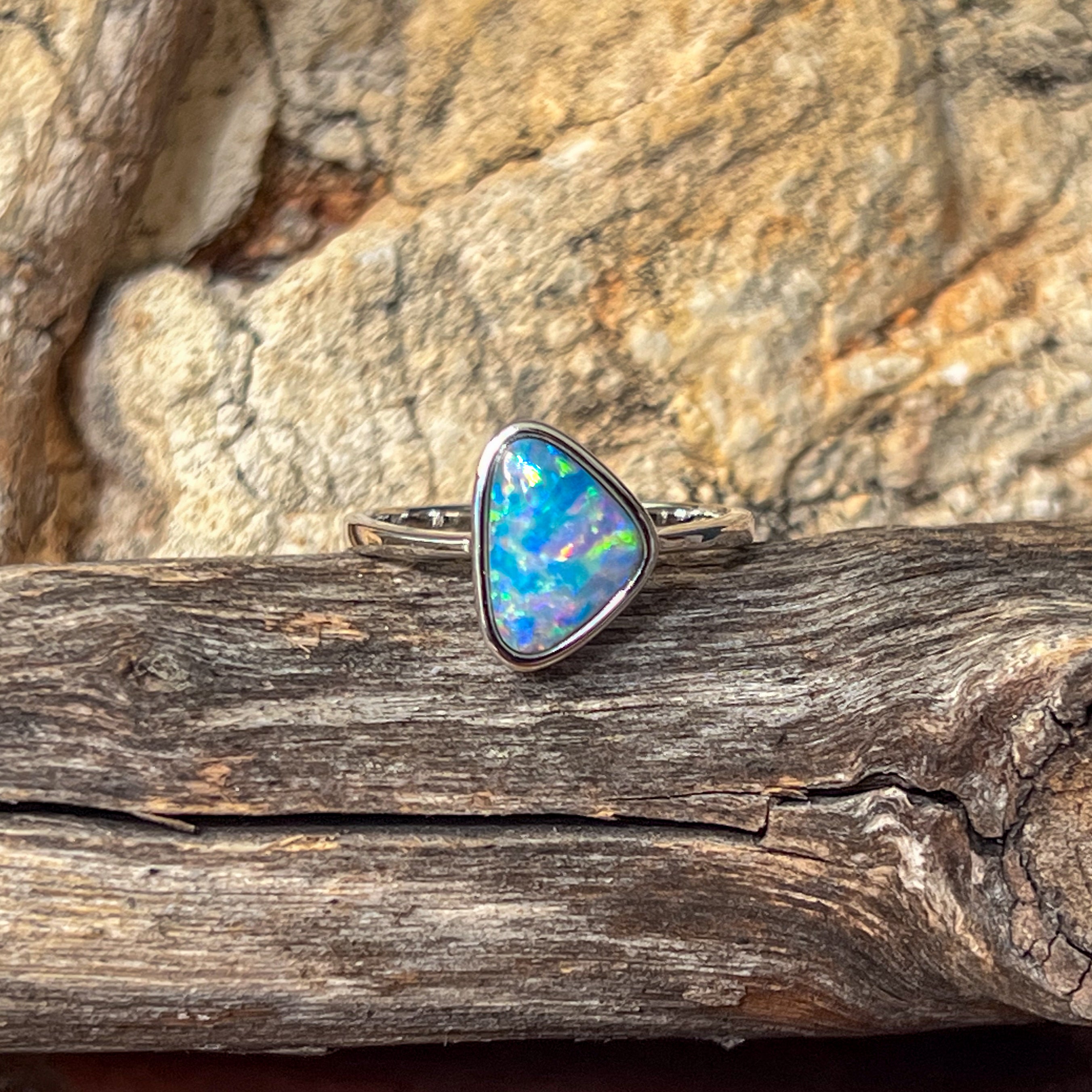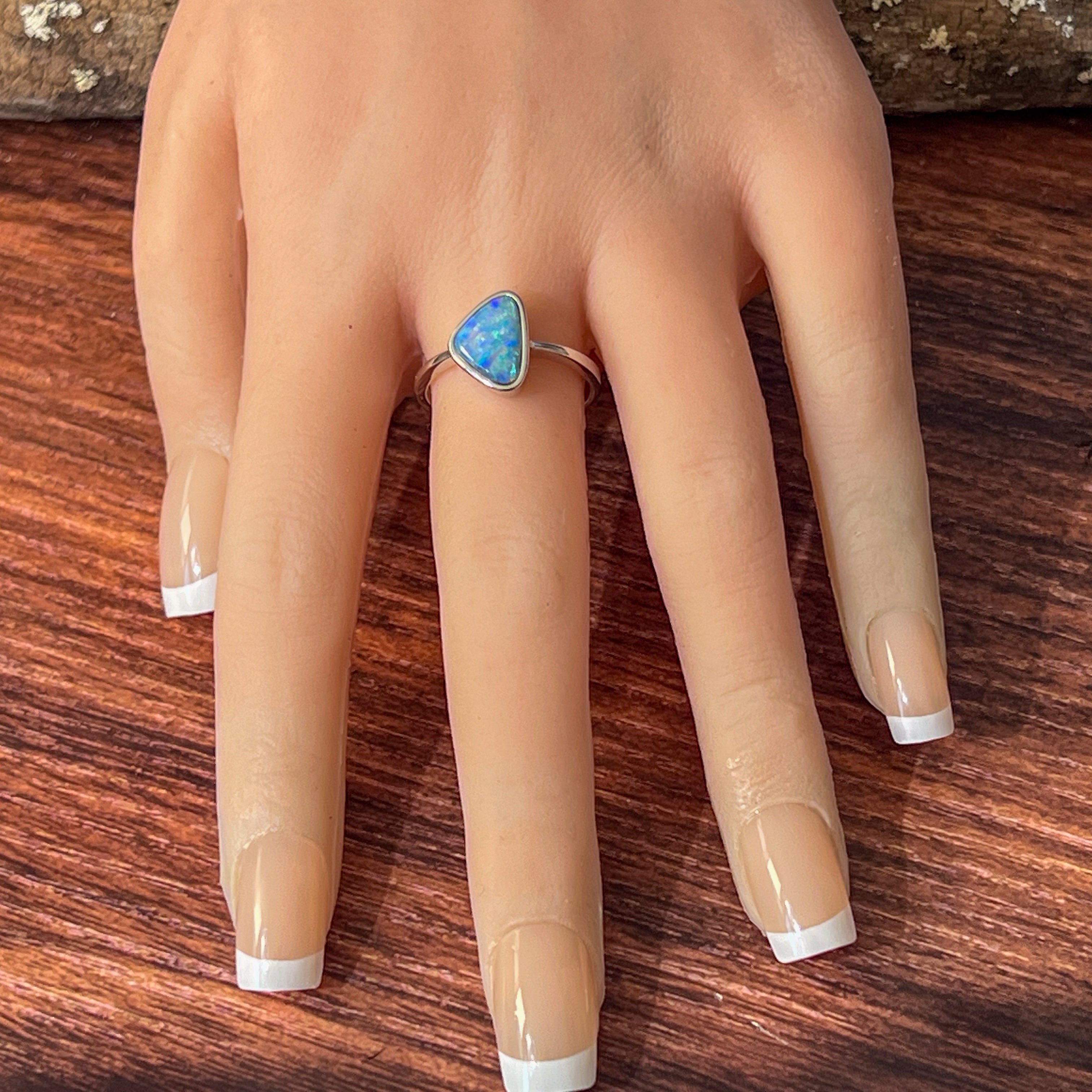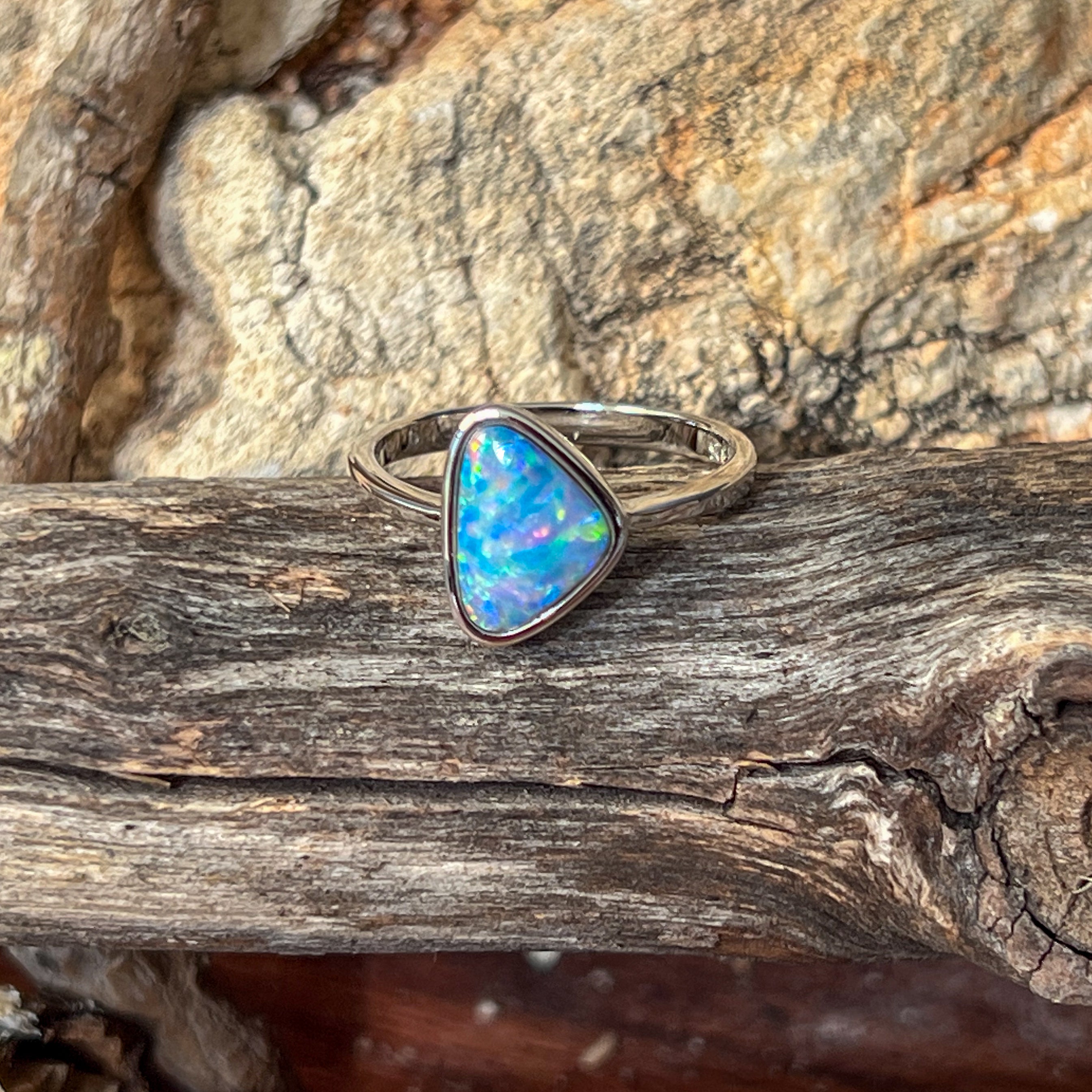 Sterling Silver Triangle Blue Green Yellow Opal doublet bezel set solitaire ring