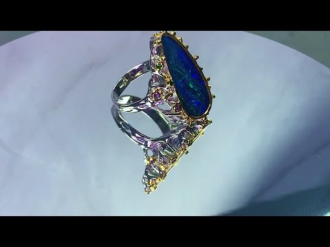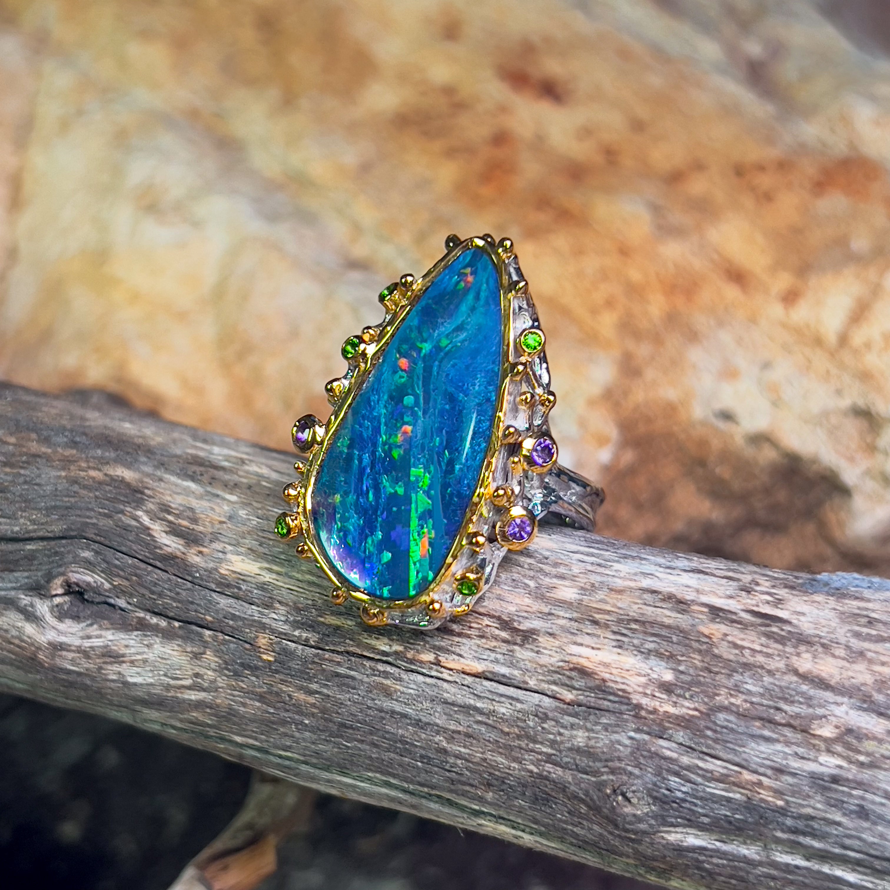 Sterling Silver Two Tone Opal doublet and multi colour Coral design ring