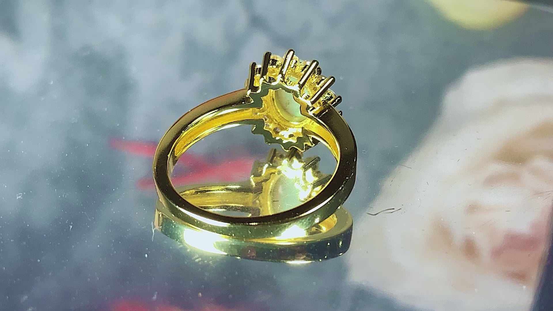 Express your unique style with this elegant yellow gold plated silver cluster ring featuring a stunning 8x6mm white opal, perfect for adding a touch of refinement to any look. This sophisticated and tasteful ring is perfect for any special occasion.