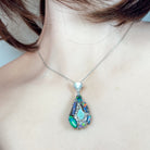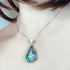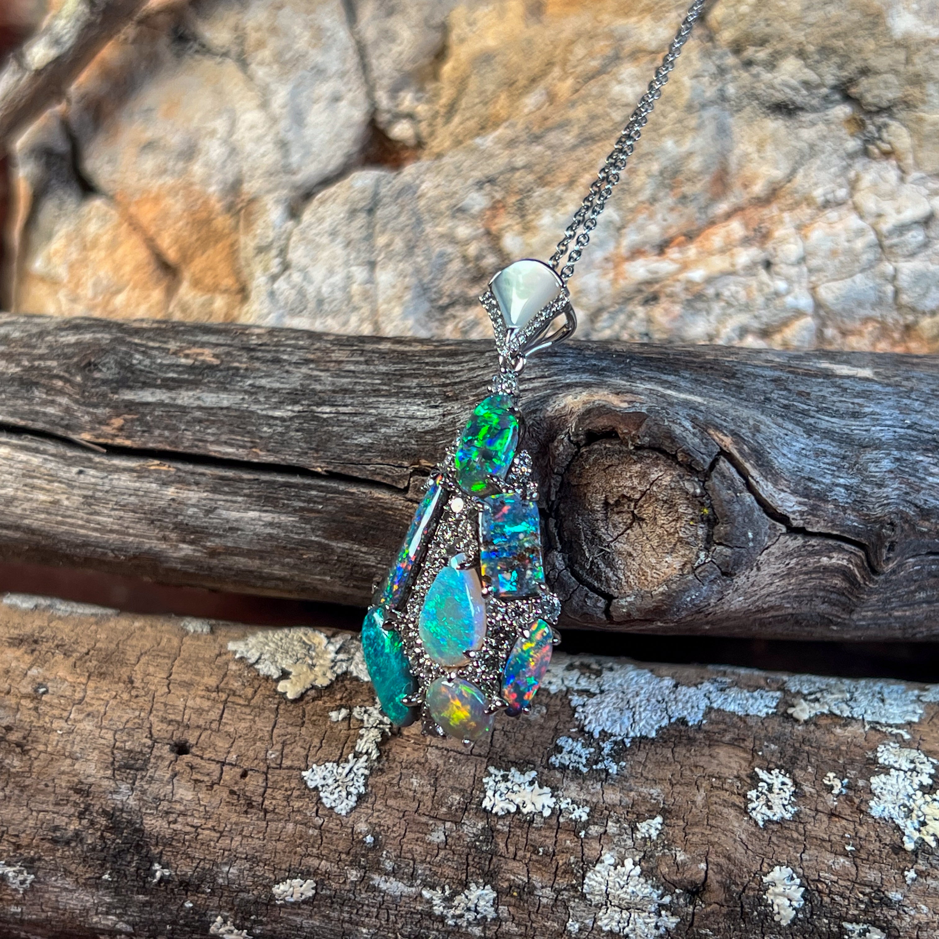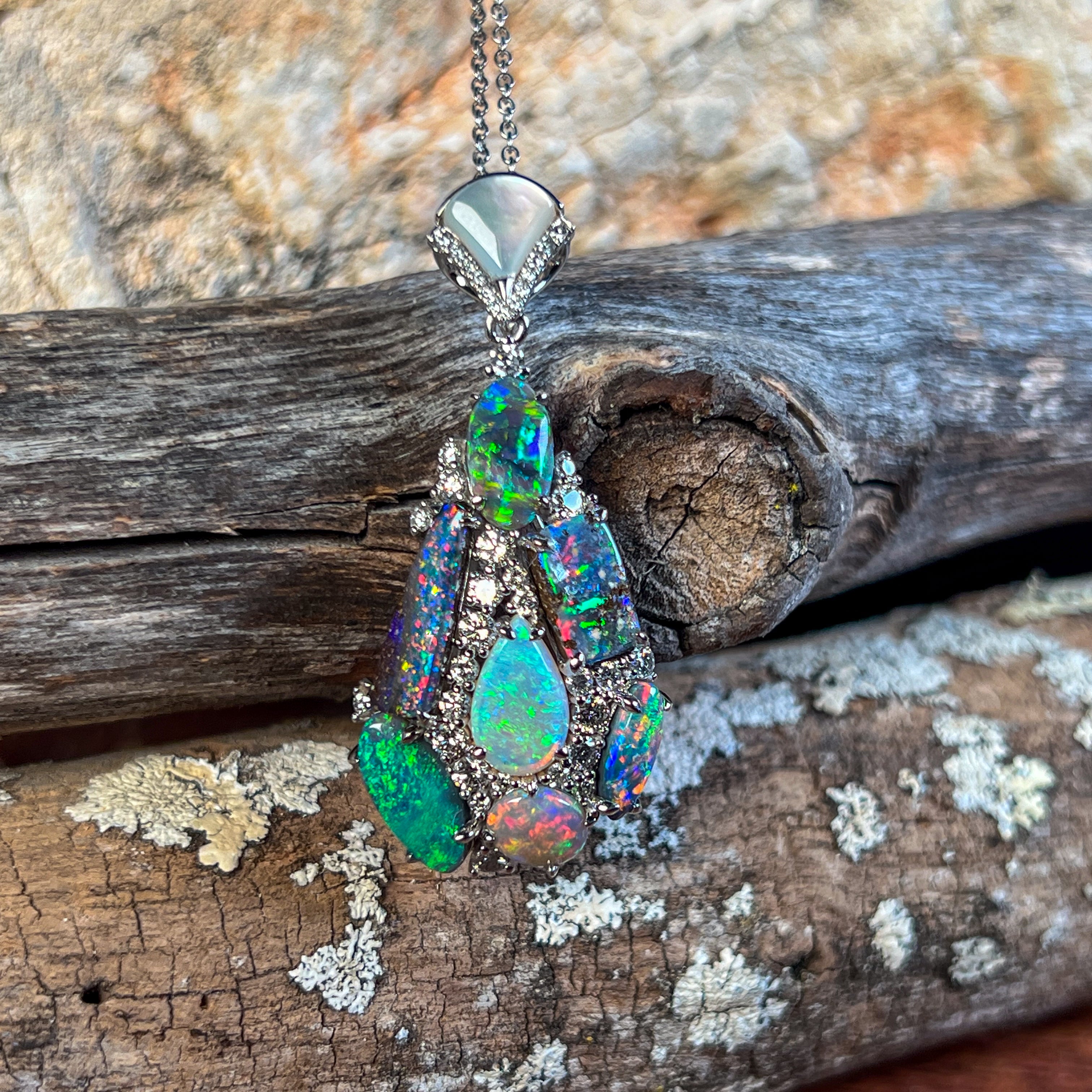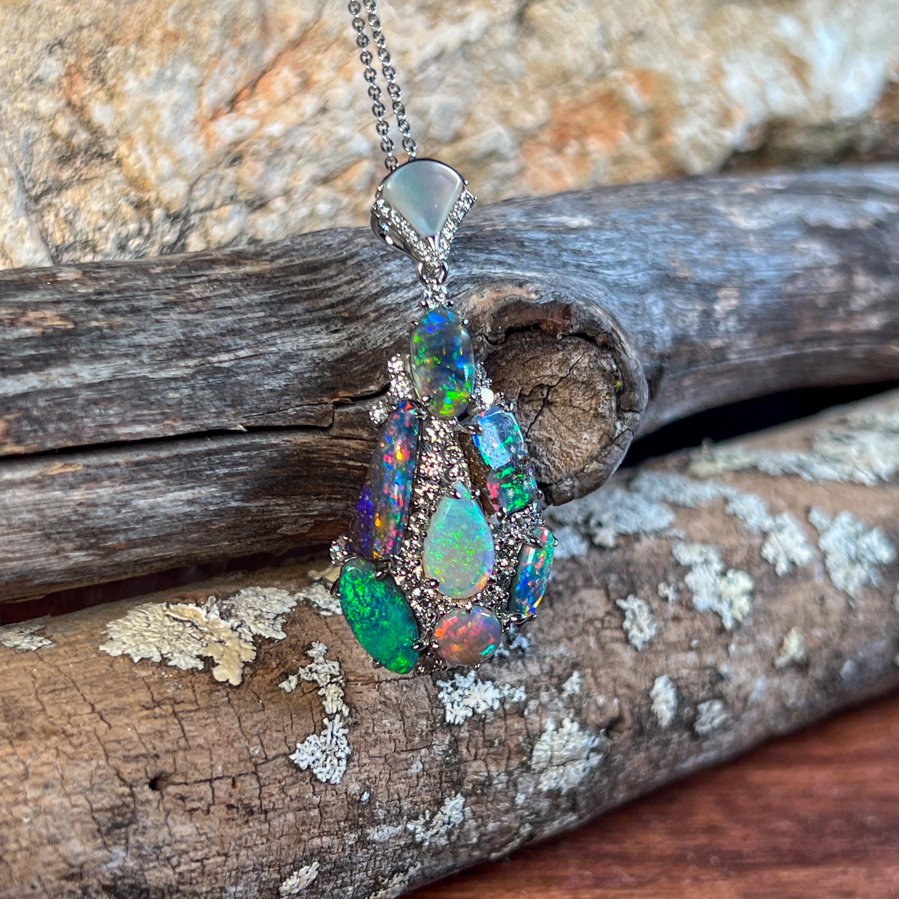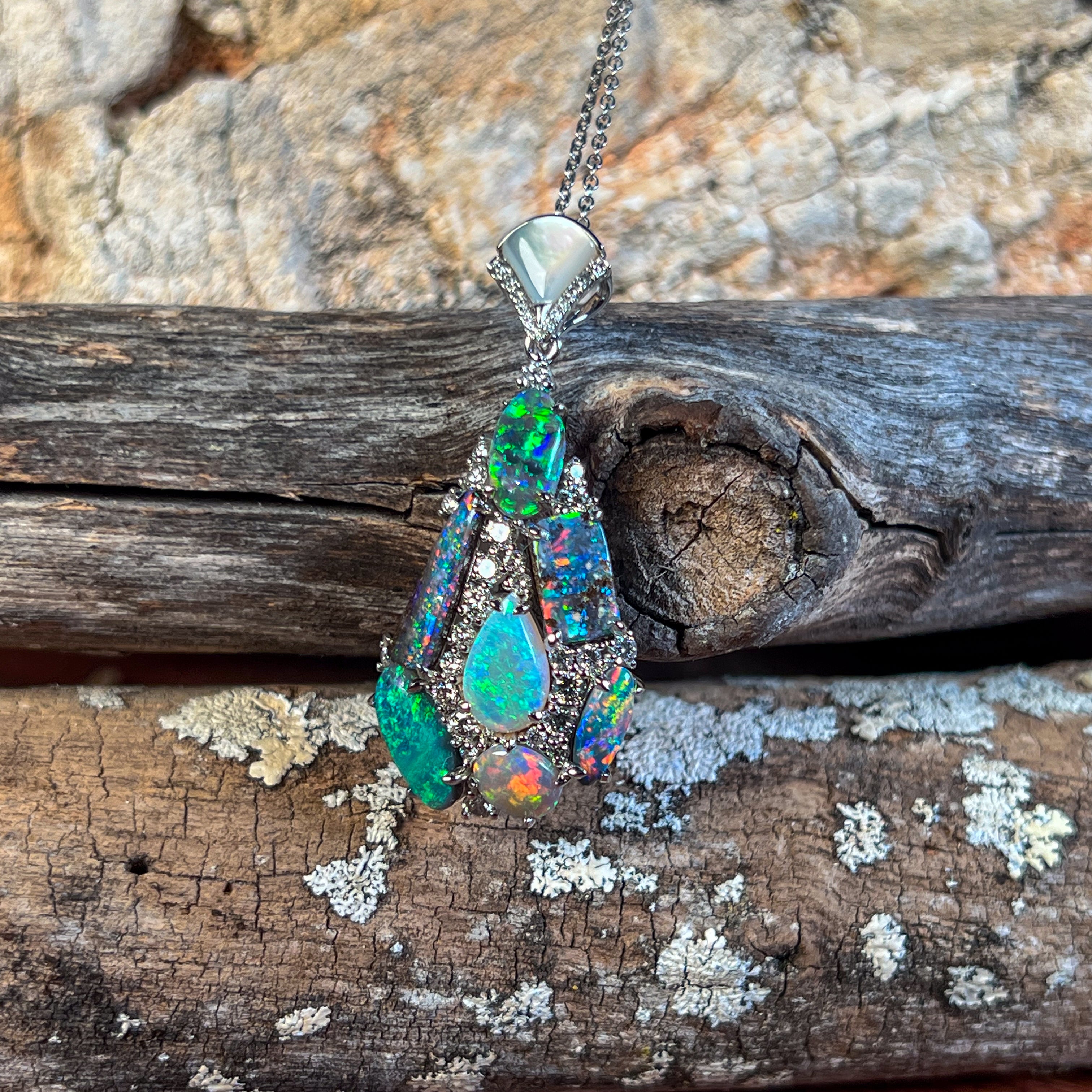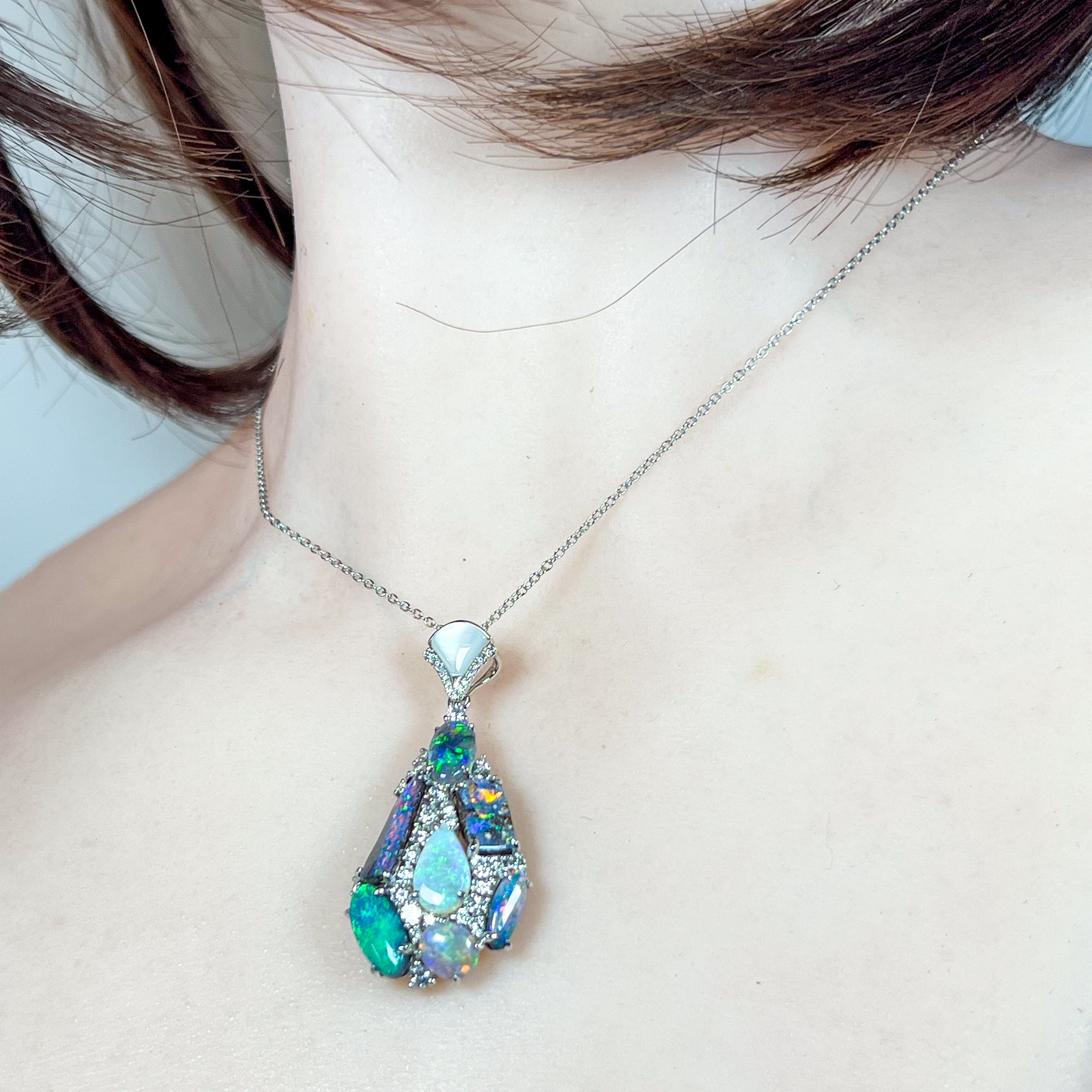 This exquisite 18kt white gold pendant showcases a stunning freeform opal drop as its captivating centrepiece, complemented by lustrous mother of pearl and sparkling diamonds in a sophisticated cluster design. Each piece is a one-of-a-kind statement that celebrates the natural beauty and iridescent play of colour unique to Australian opals. Perfect for those who appreciate fine craftsmanship and desire jewellery that truly stands out, this pendant transforms any occasion into an elegant affair while serving as a conversation-starting treasure you'll treasure for years to come.