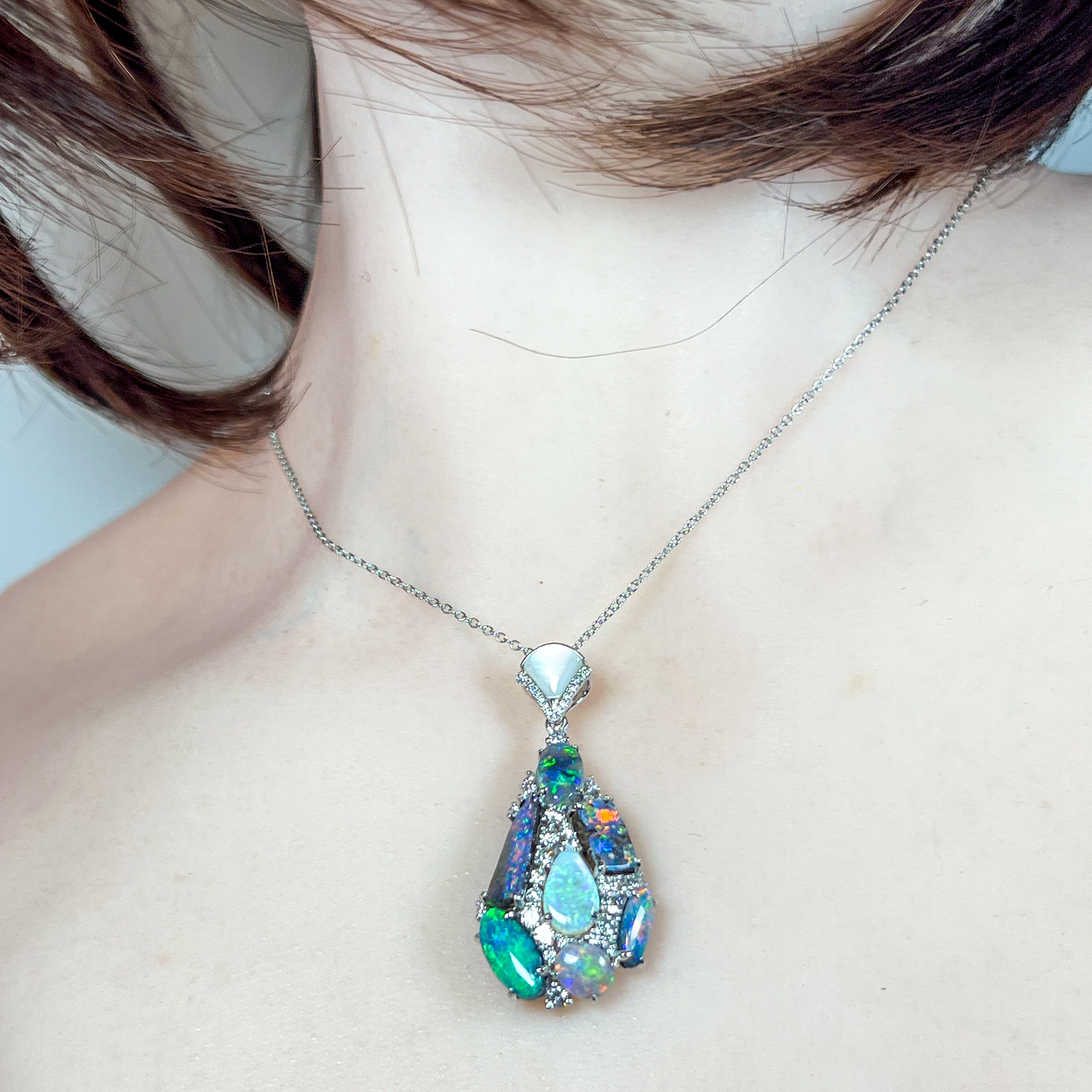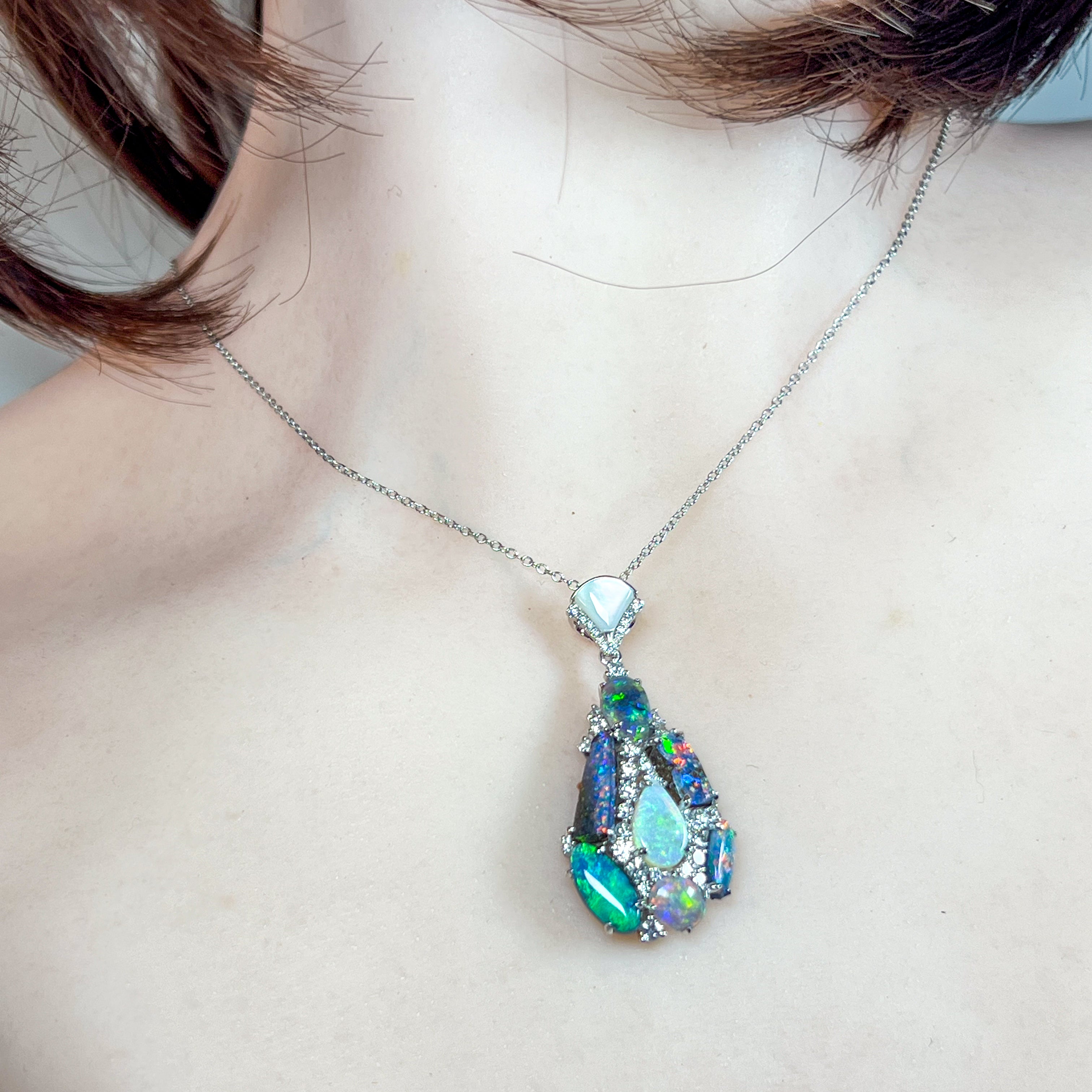 18kt White Gold cluster freeform Drop shape Opal pendant with mother of Pearl and diamonds