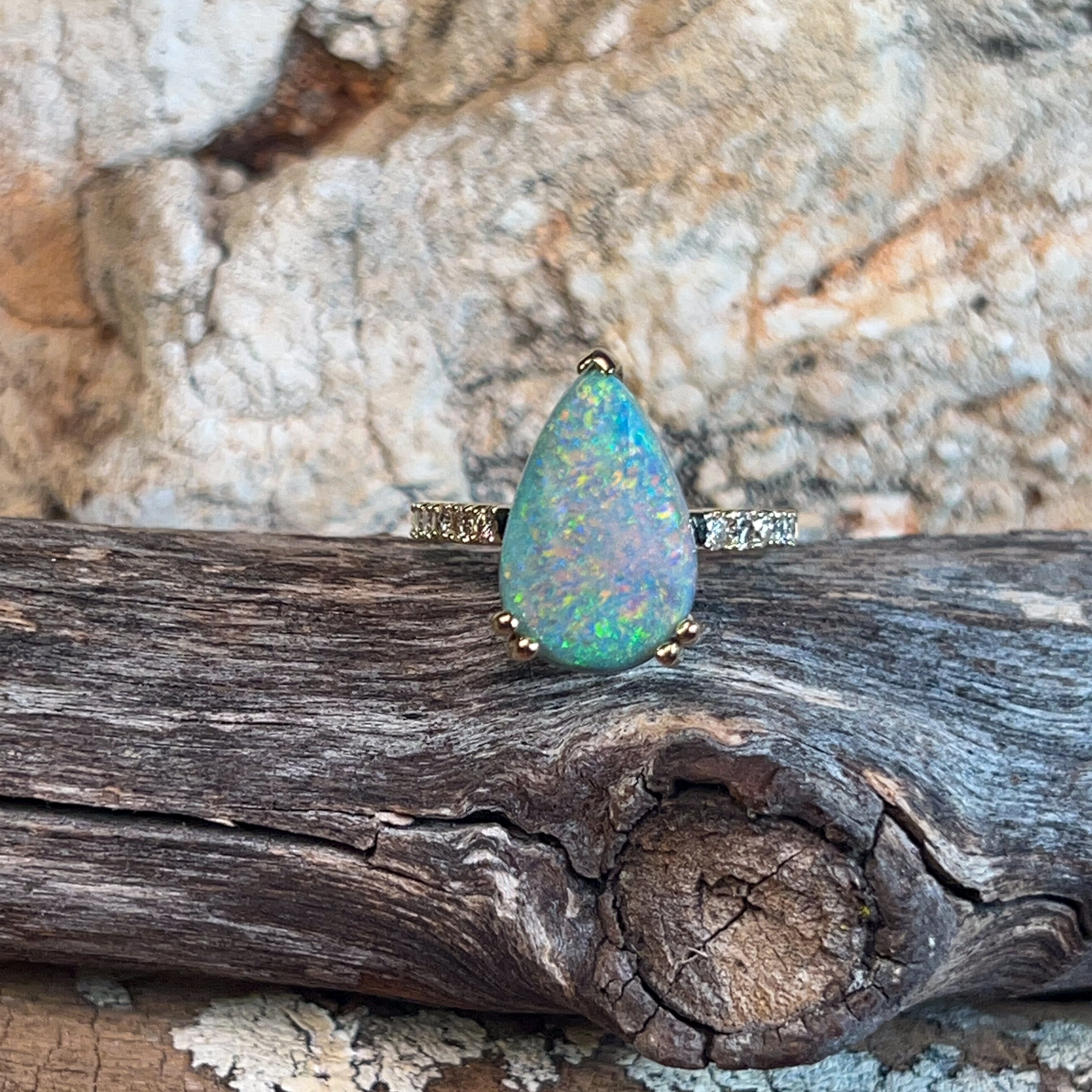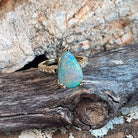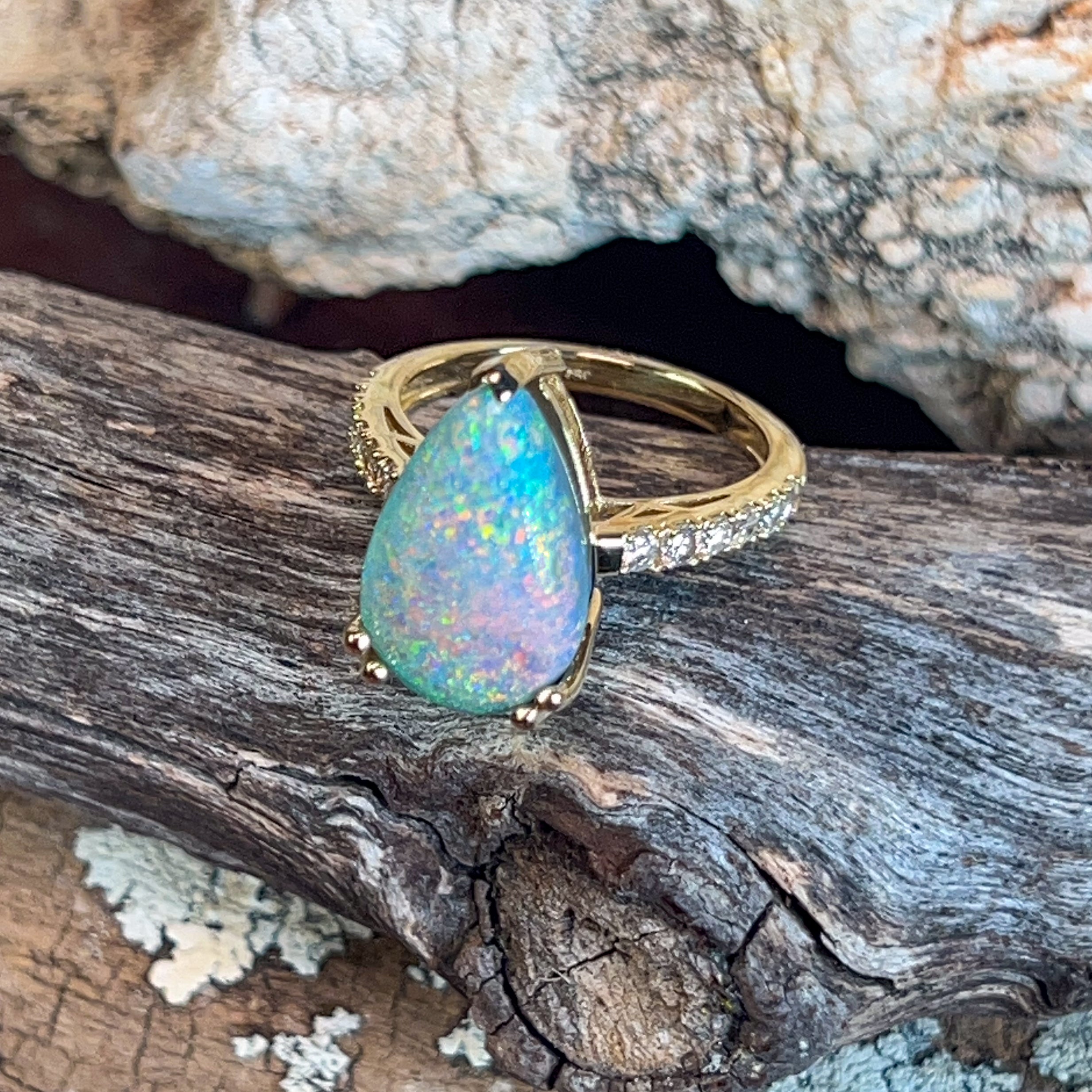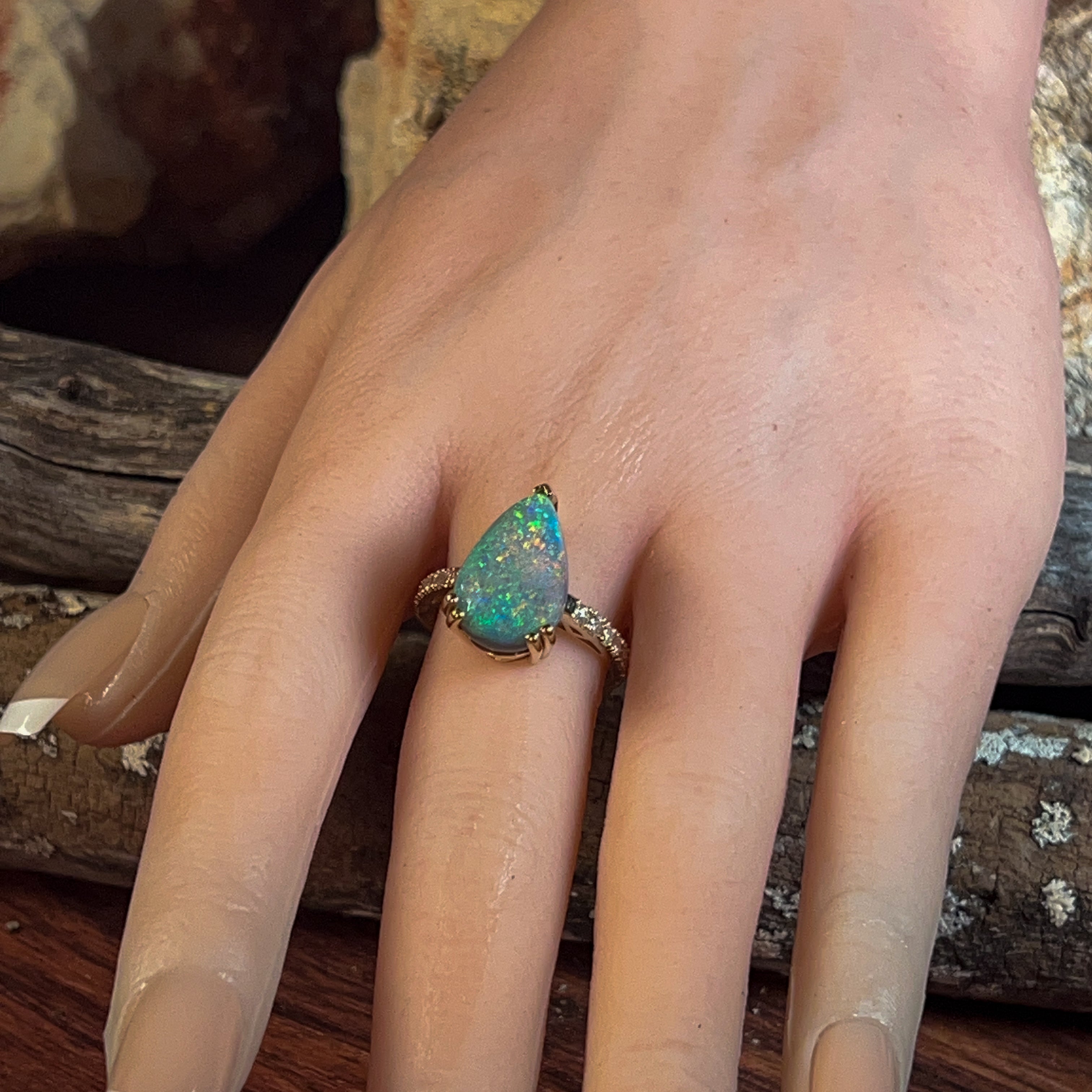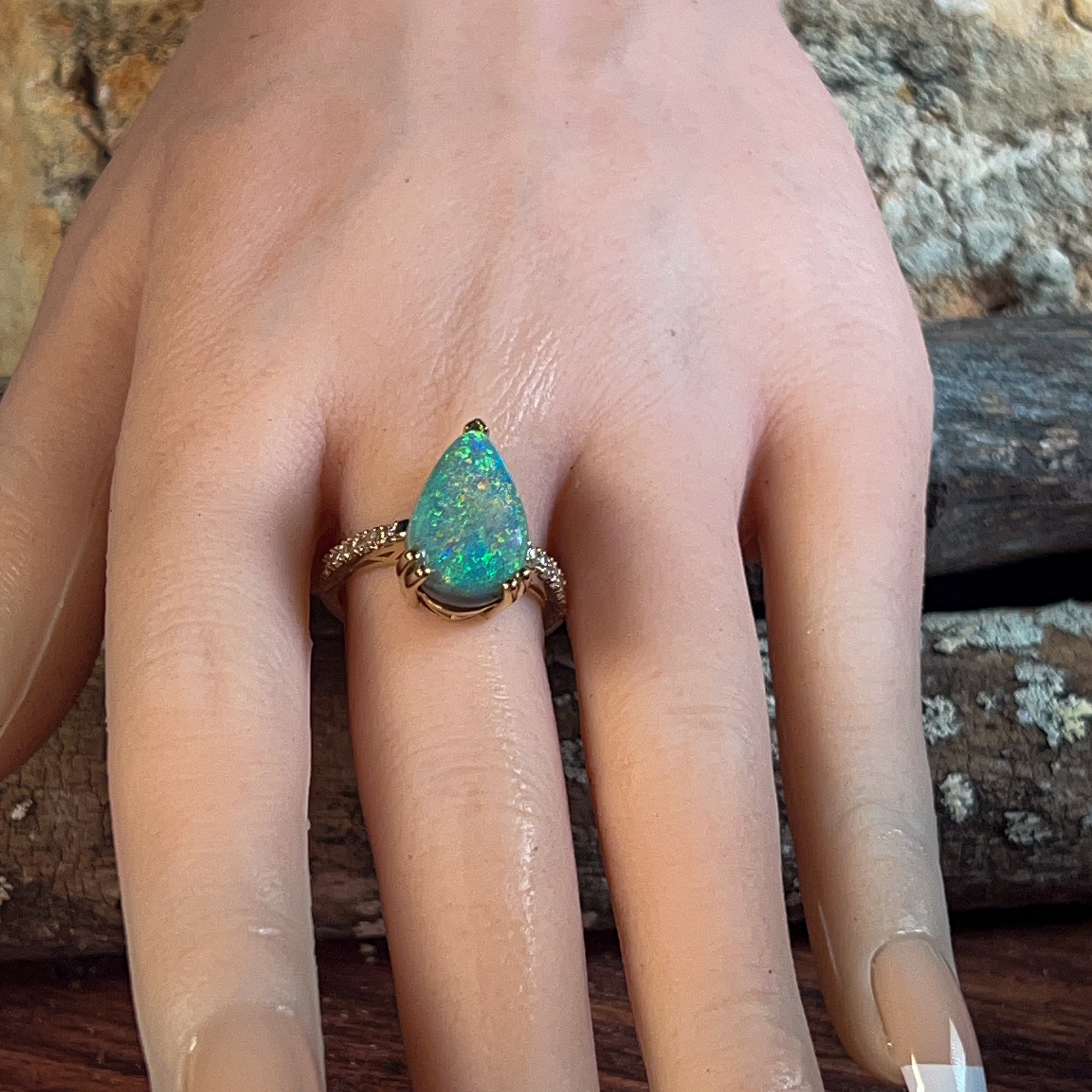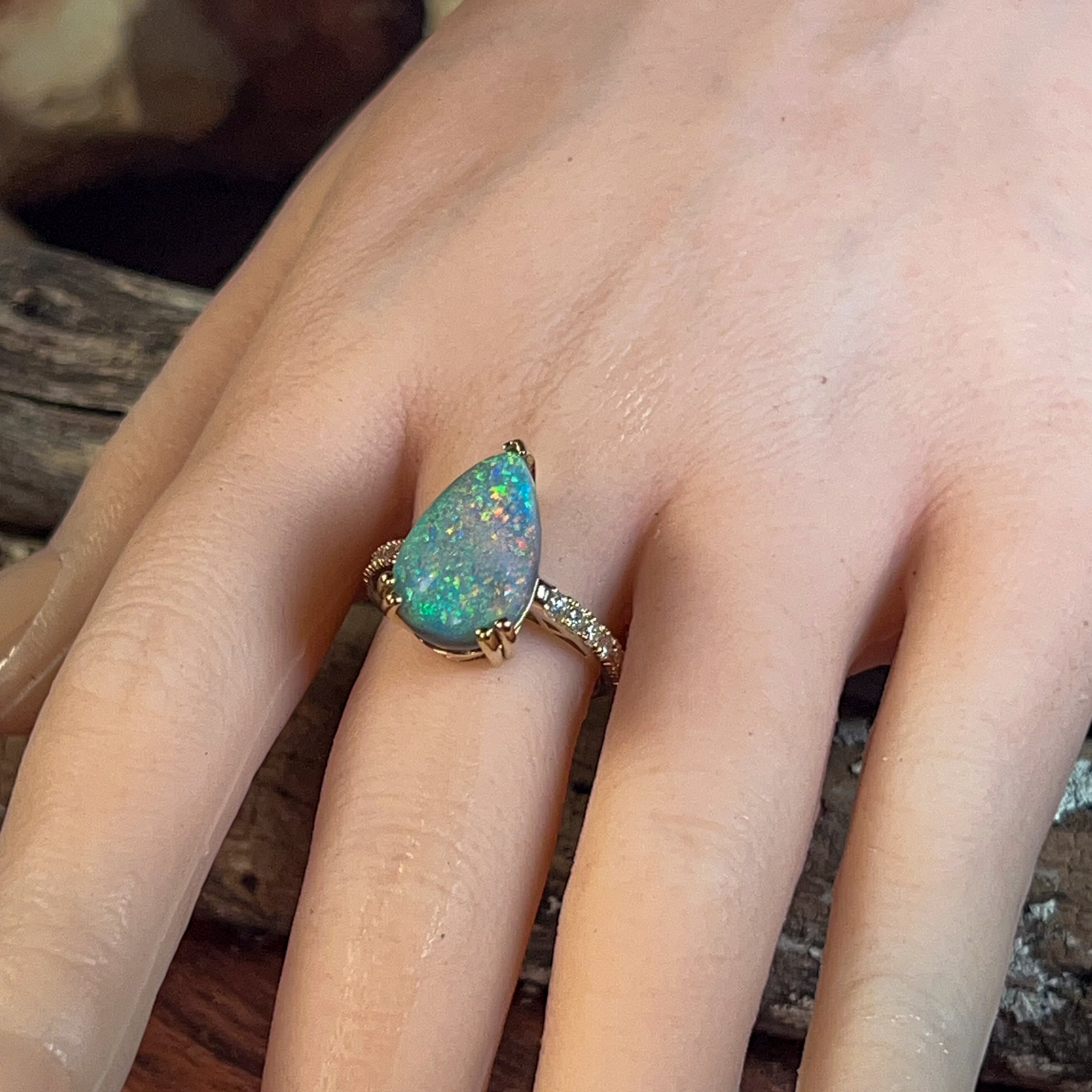 18kt Yellow Gold Black Opal Pear shape 6.8ct and diamond ring