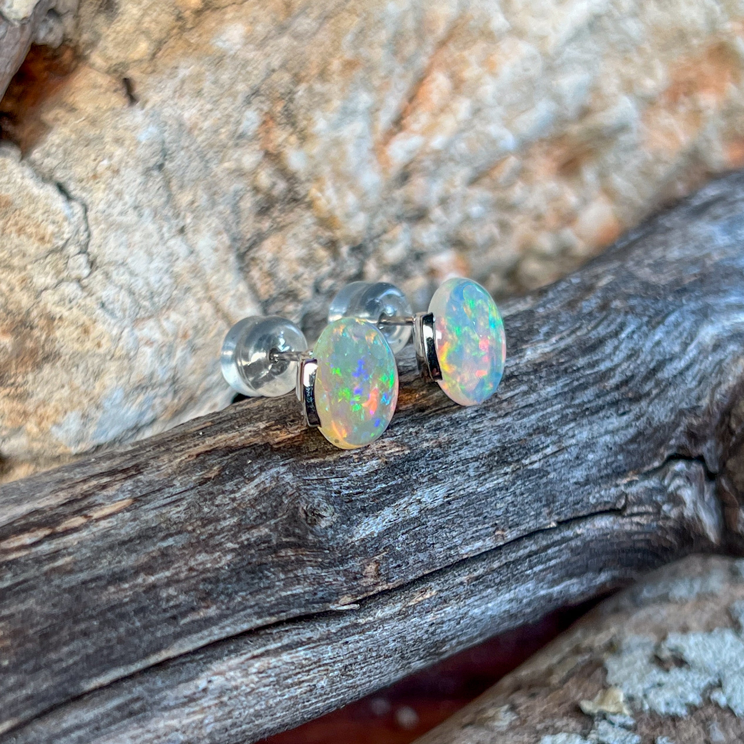 Pair of 14kt White Gold Opal earrings studs half bezel set