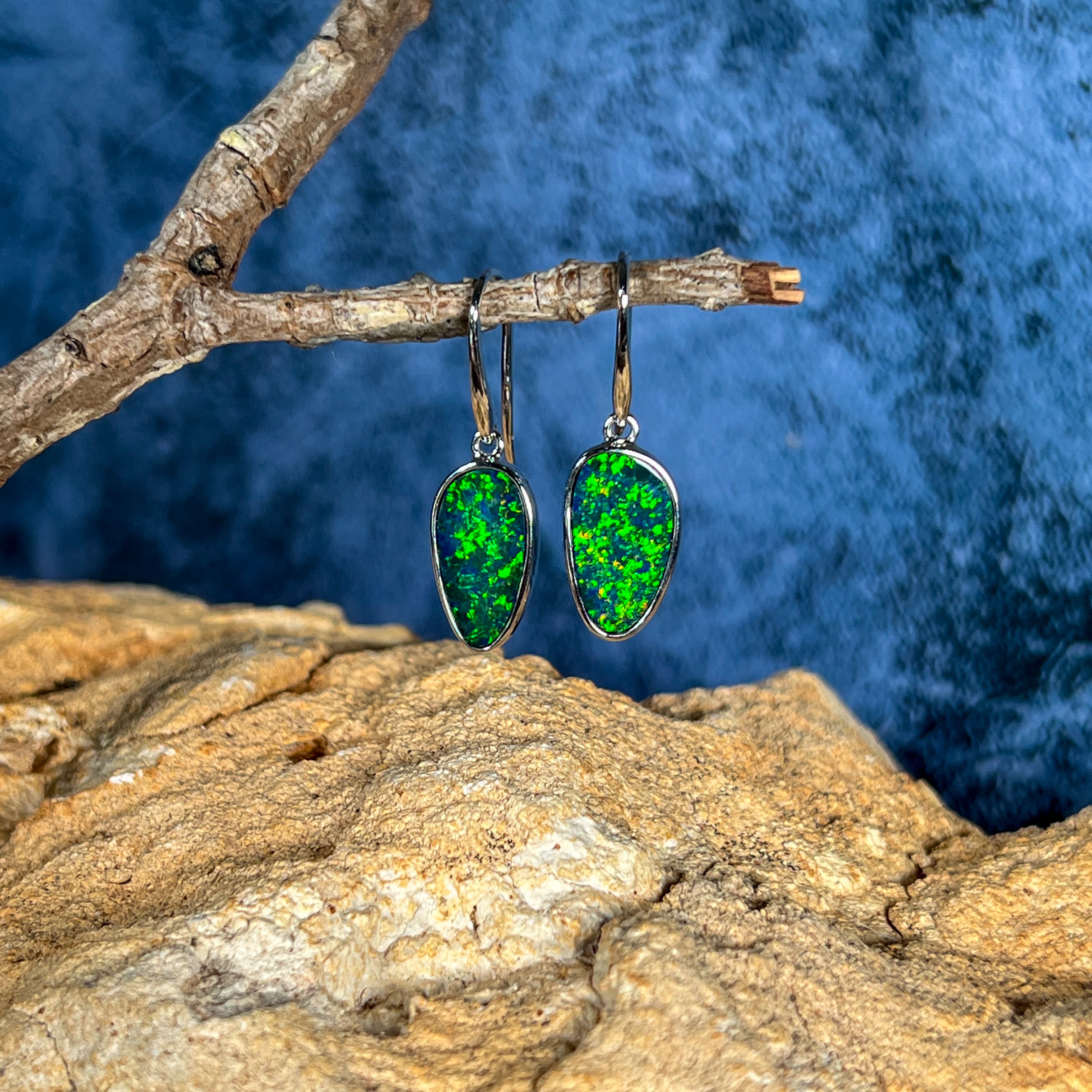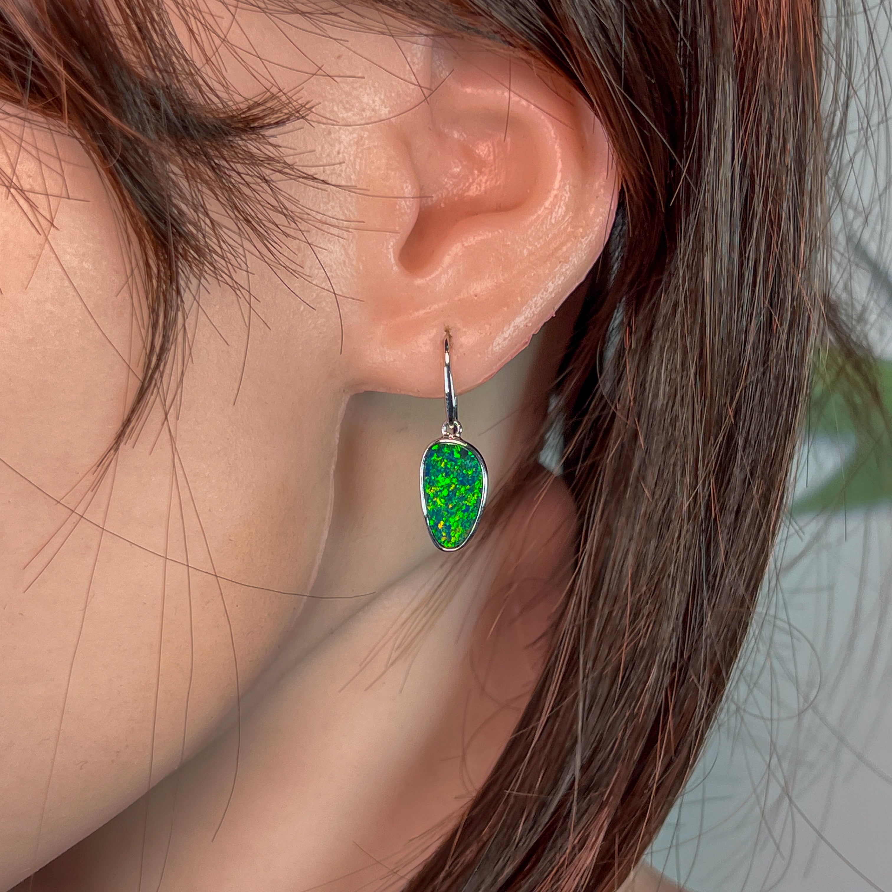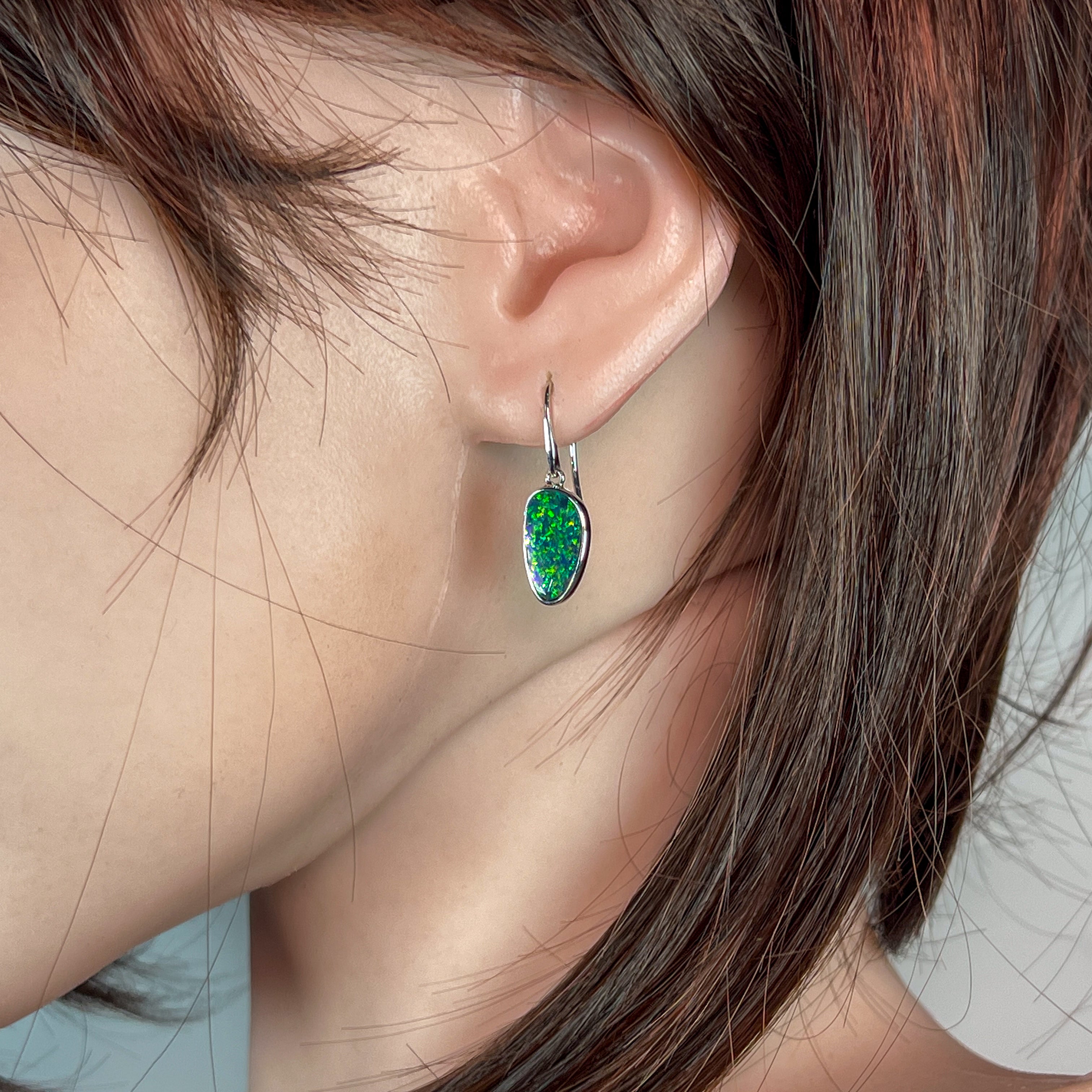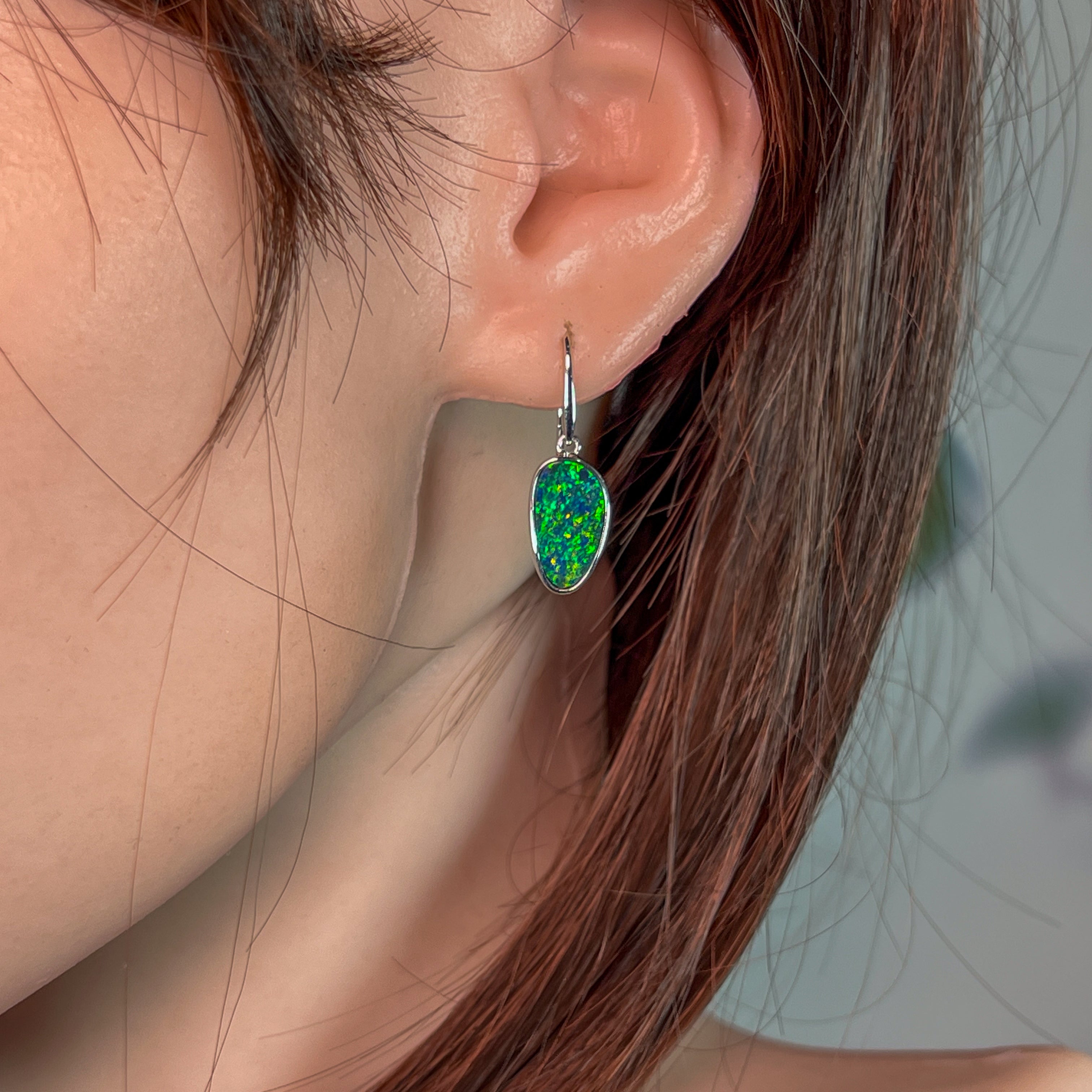 Elevate your style with these 14kt white gold dangling hook earrings featuring dazzling opal doublets that flash sharp green sparkles with every movement. Their luminous play of color adds a captivating touch of elegance, making them perfect for both everyday wear and special occasions. Lightweight and eye-catching, these earrings bring a refined yet striking accent to your jewelry collection.
