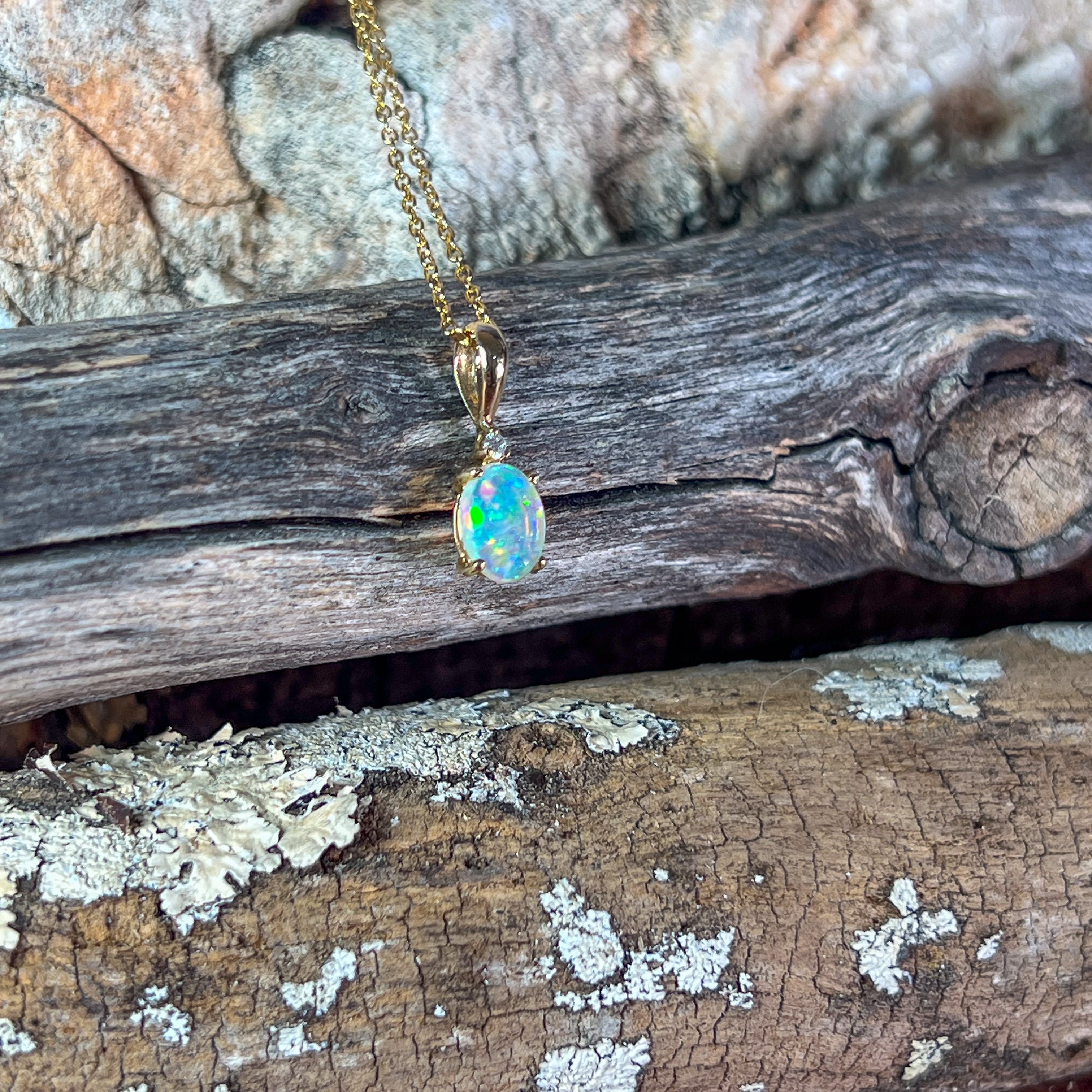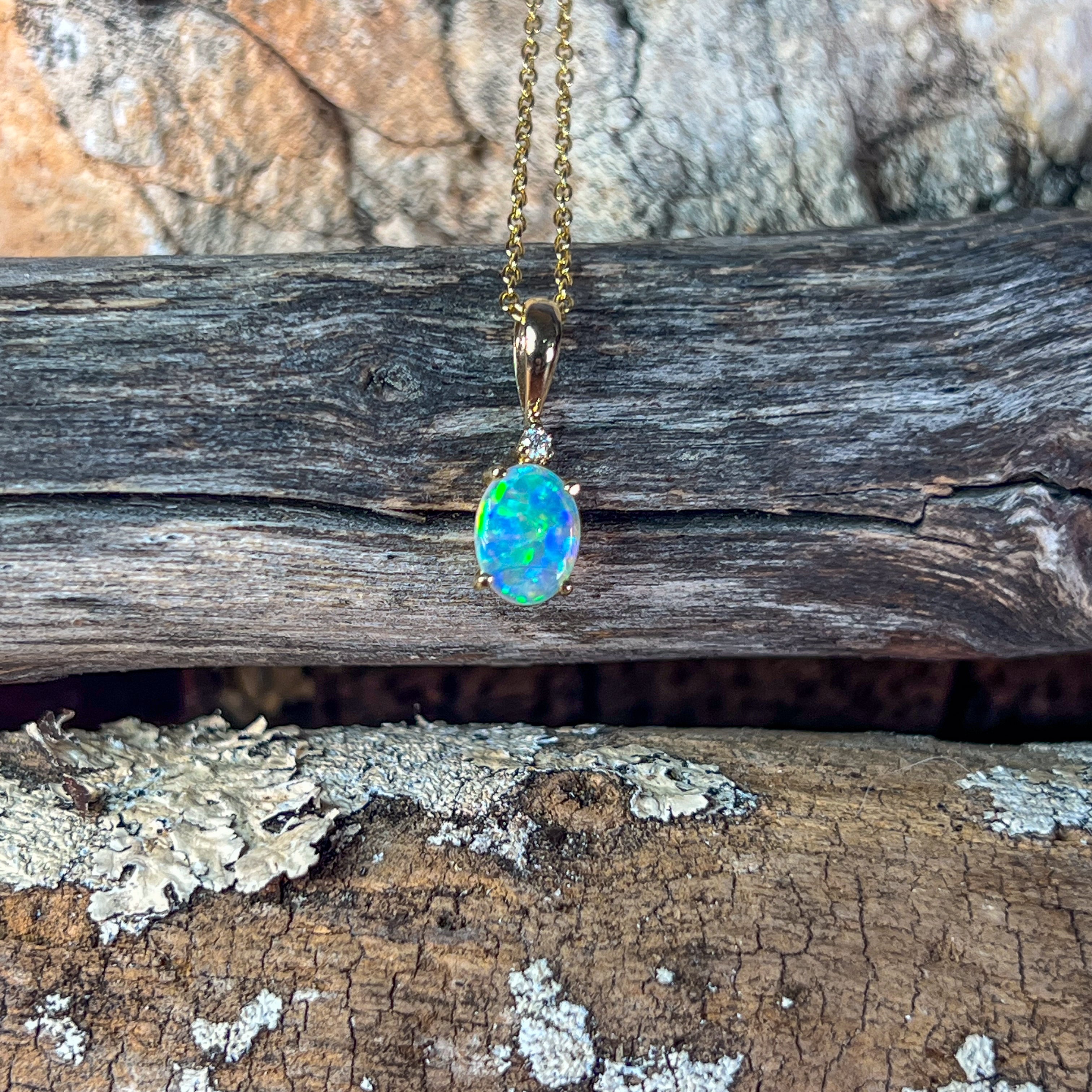 One 14kt Yellow Gold Crystal Opal drop style pendant featuring a stunning Oval Australian Crystal Opal that radiates vibrant colours of yellow, red, blue and green. The 8x6mm opal (0.60ct) is complemented by a sparkling Round Brilliant cut diamond (0.02ct G VS). Item dimensions: 17x6mm. Total weight: 0.66g.