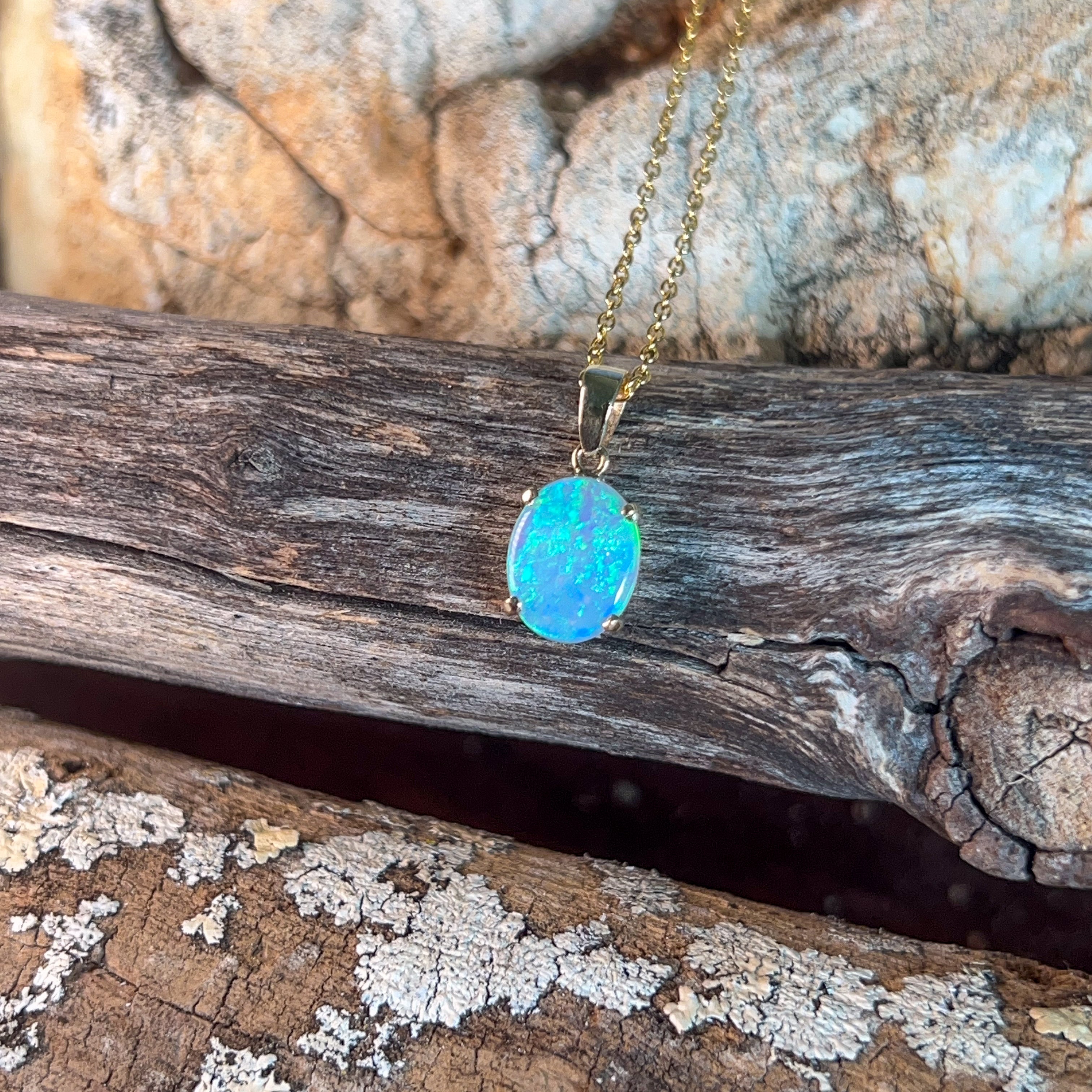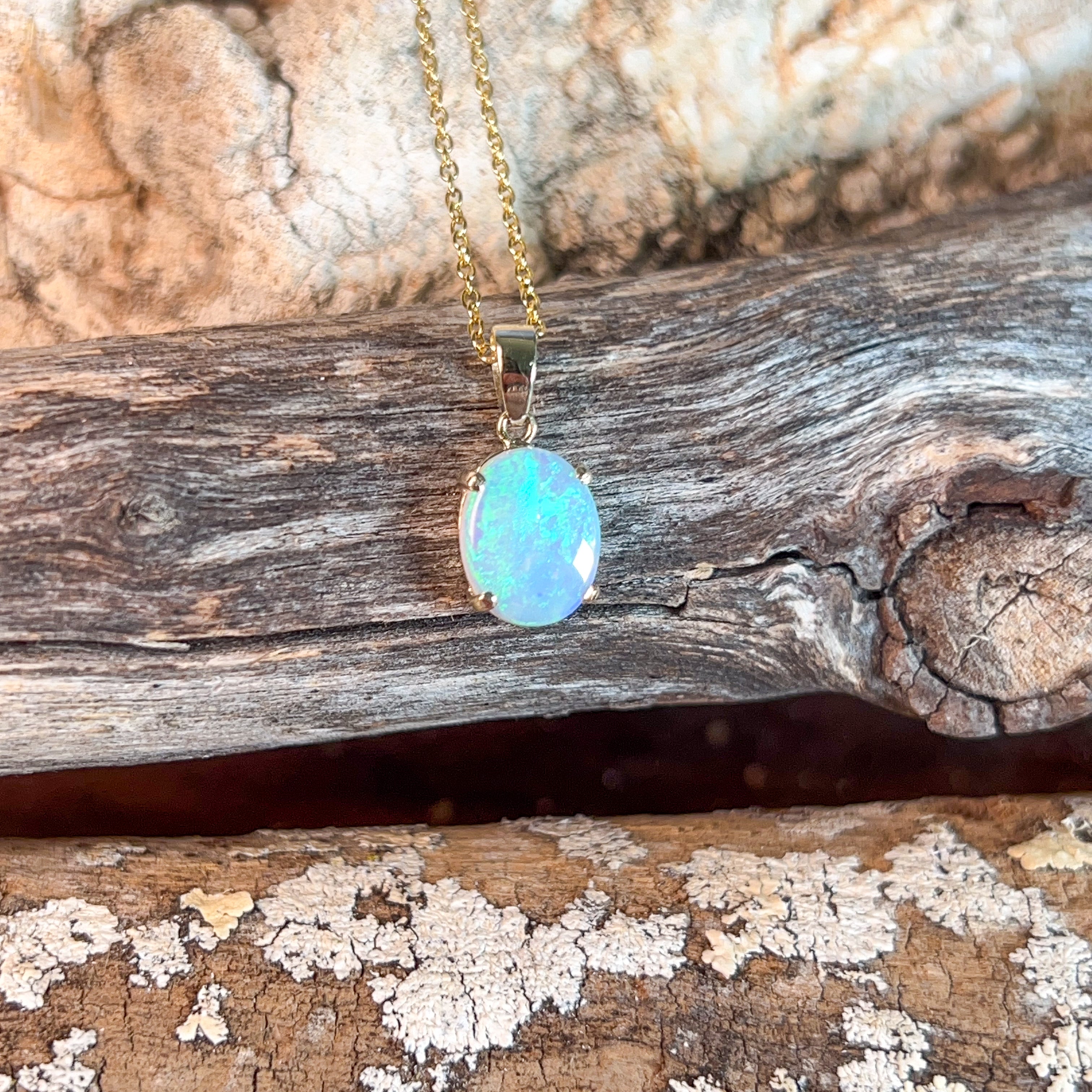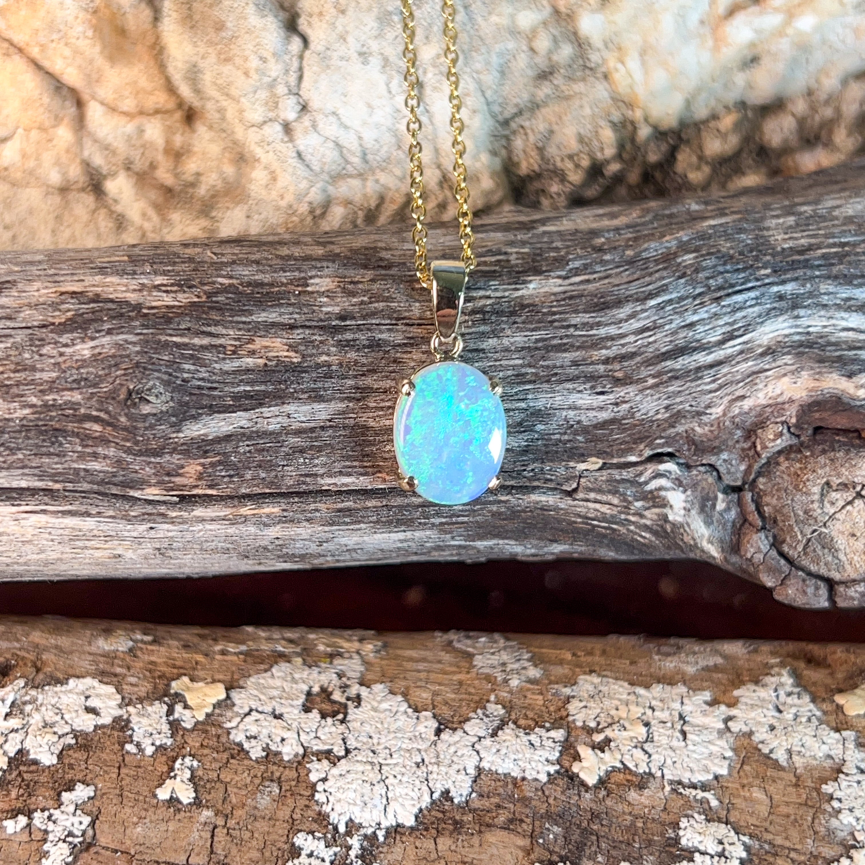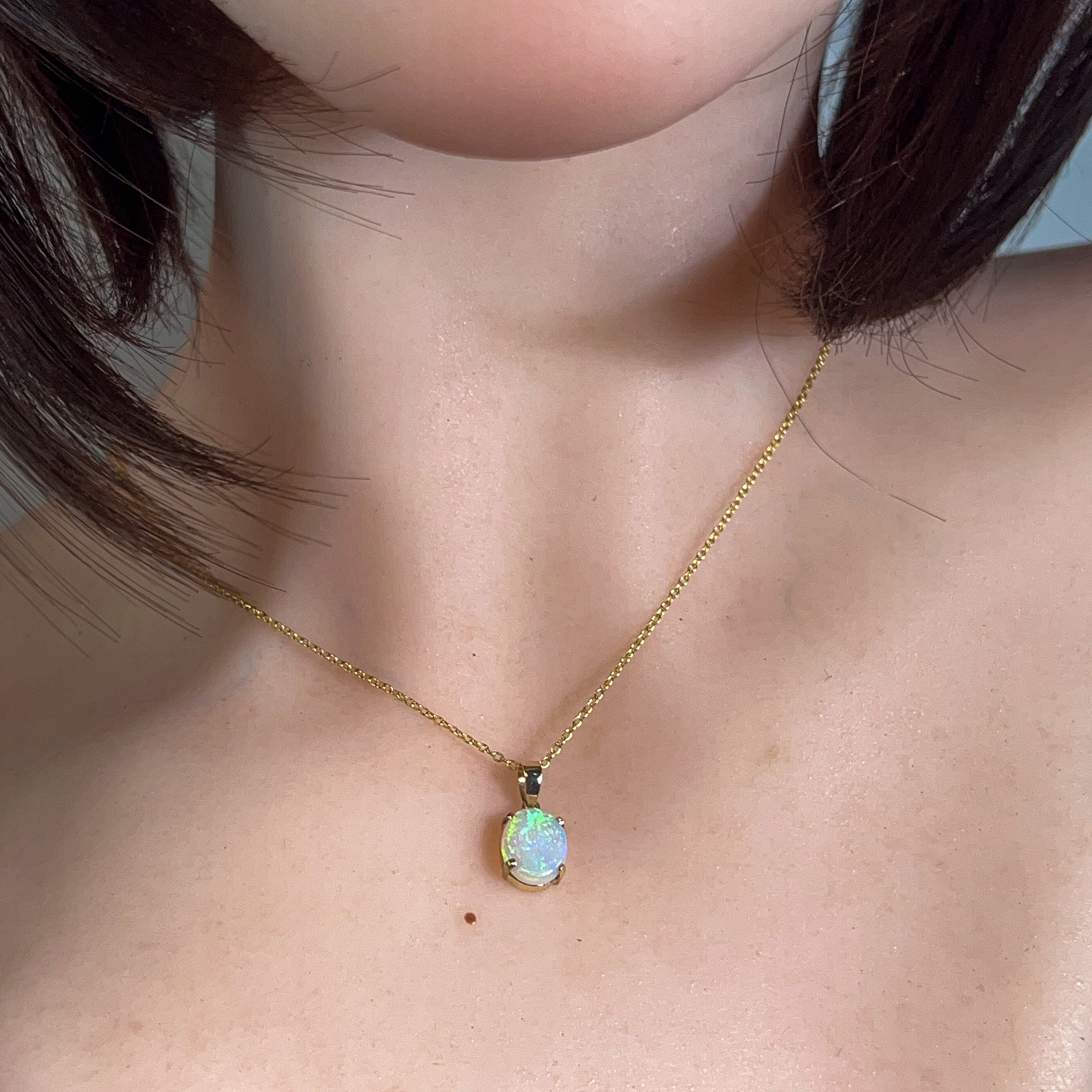Wear a slice of Australian magic around your neck! This stunning 14kt yellow gold pendant showcases a radiant 10x8mm crystal opal that dances with mesmerizing flashes of colour. The timeless design lets your opal take centre stage, while the warm gold frame adds elegance and sophistication. Perfect for everyday sparkle or special occasions, this classic beauty captures the natural wonder of one of Earth's most enchanting gemstones. A true masterpiece that'll have everyone asking where you found it.