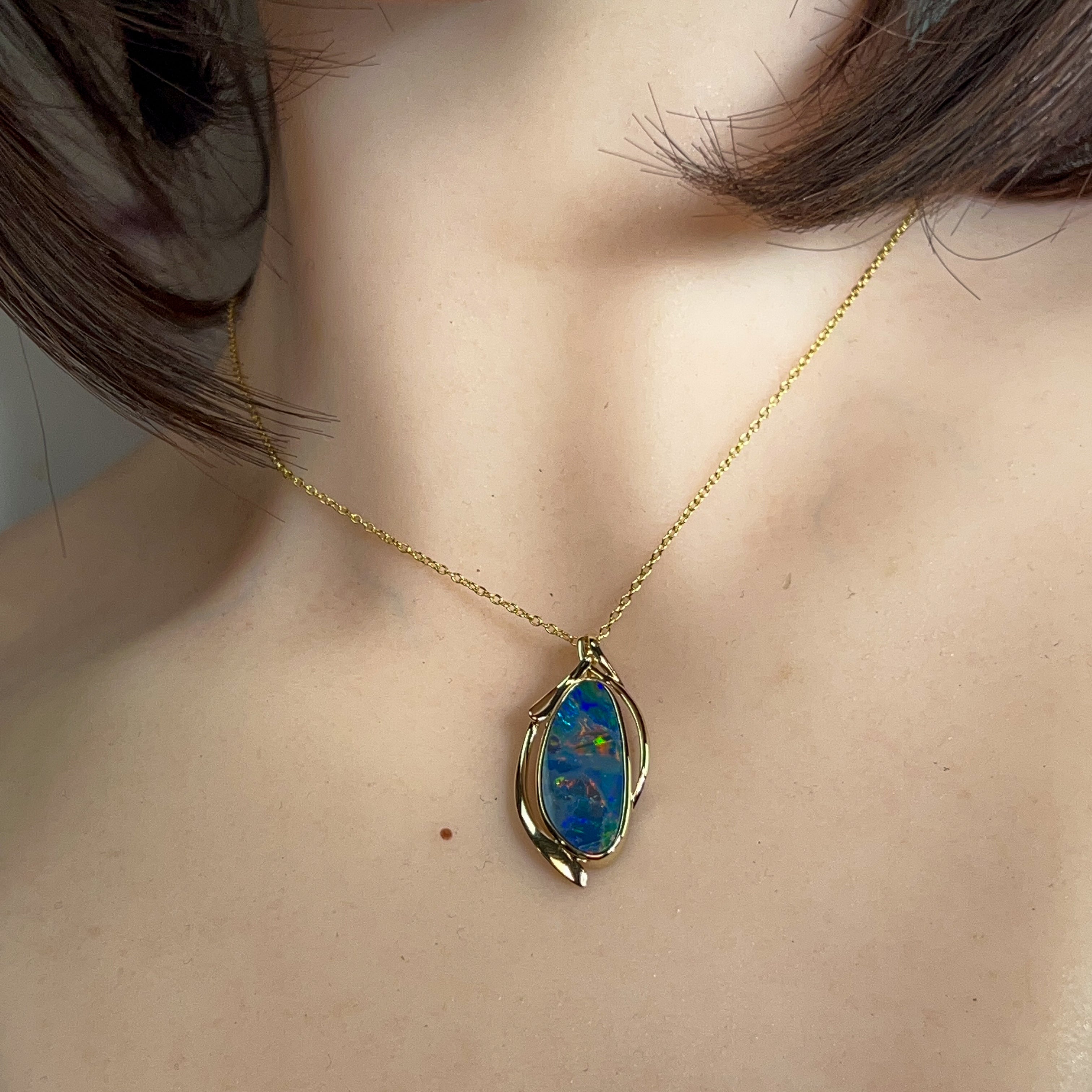 Ignite your elegance with this stunning 14kt yellow gold fire opal doublet pendant, showcasing a mesmerizing 4.6ct gemstone that blazes with intense red and orange hues. The vibrant play of colour captures light beautifully, creating a dynamic glow that commands attention. Crafted in premium yellow gold, this piece combines timeless sophistication with bold, fiery character. Perfect for those who dare to make a statement, this pendant transforms any outfit into something extraordinary. A true showstopper that celebrates the raw beauty of nature's most captivating gem.