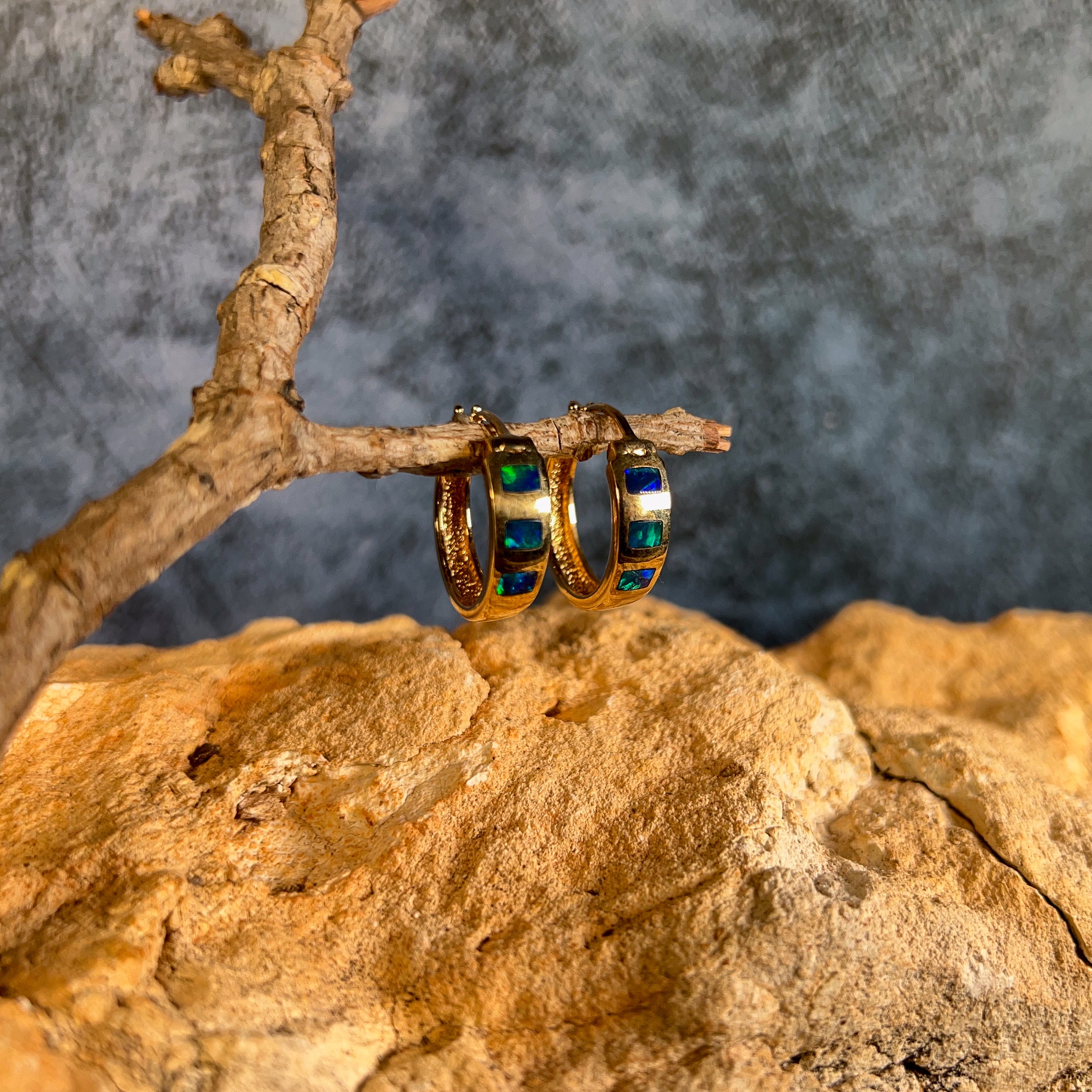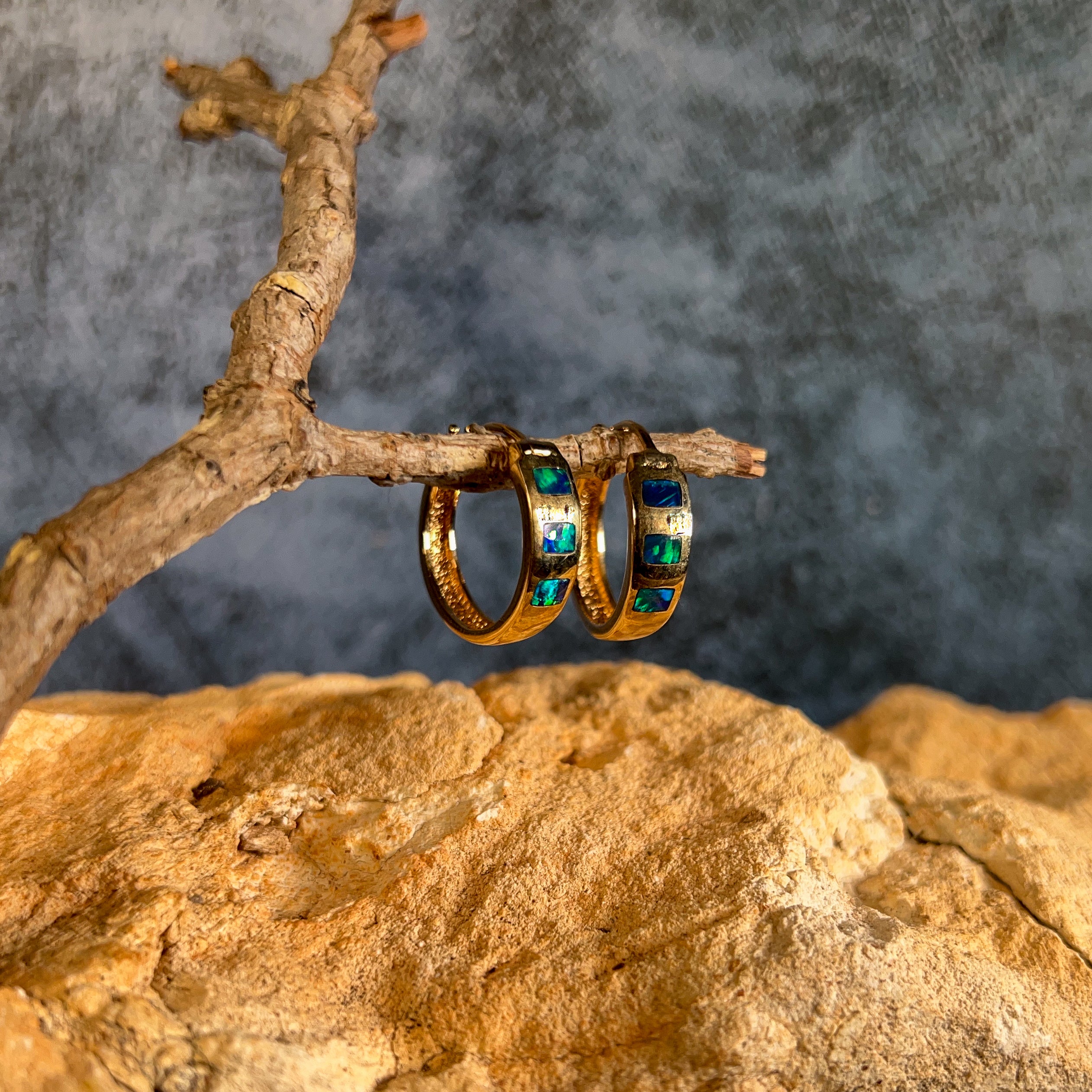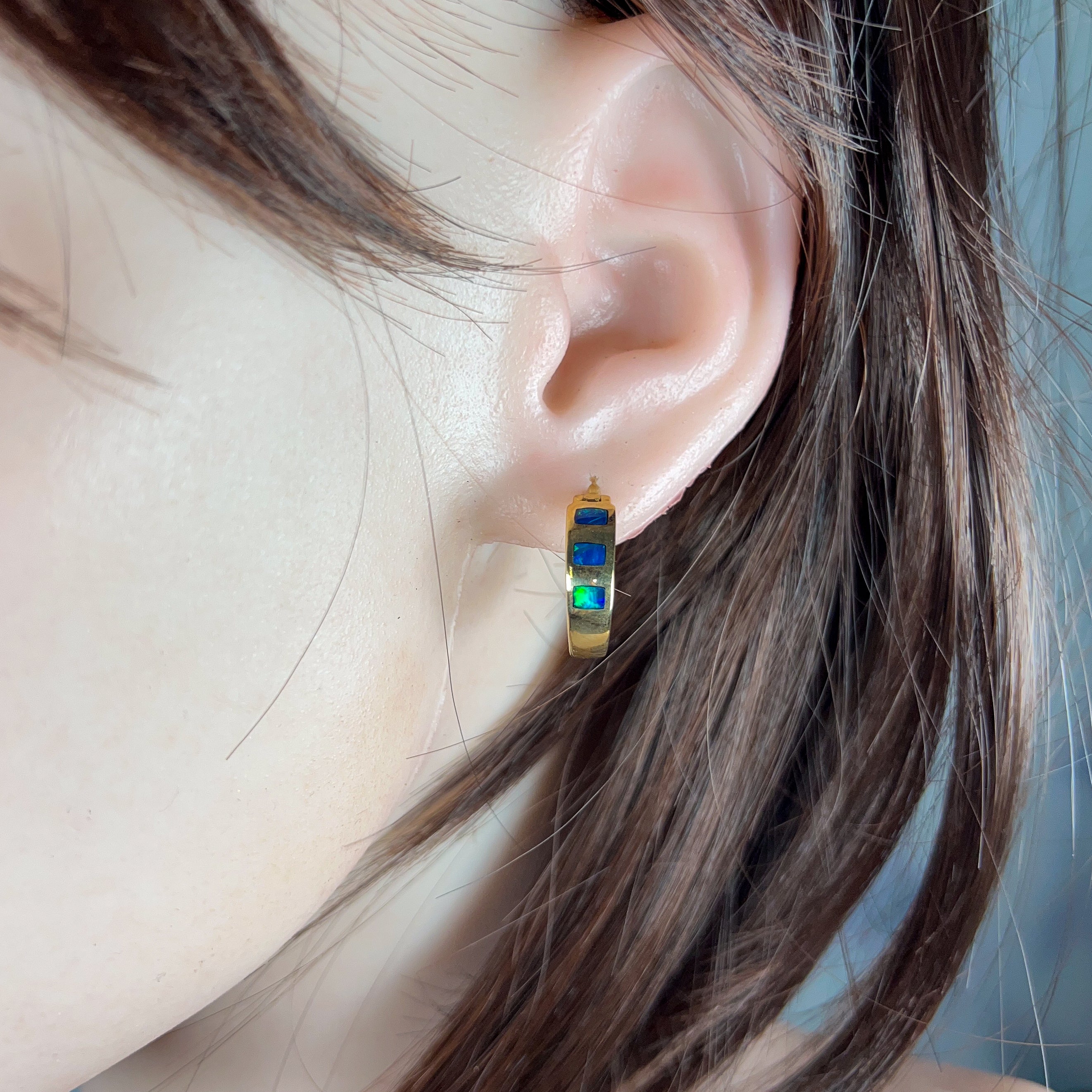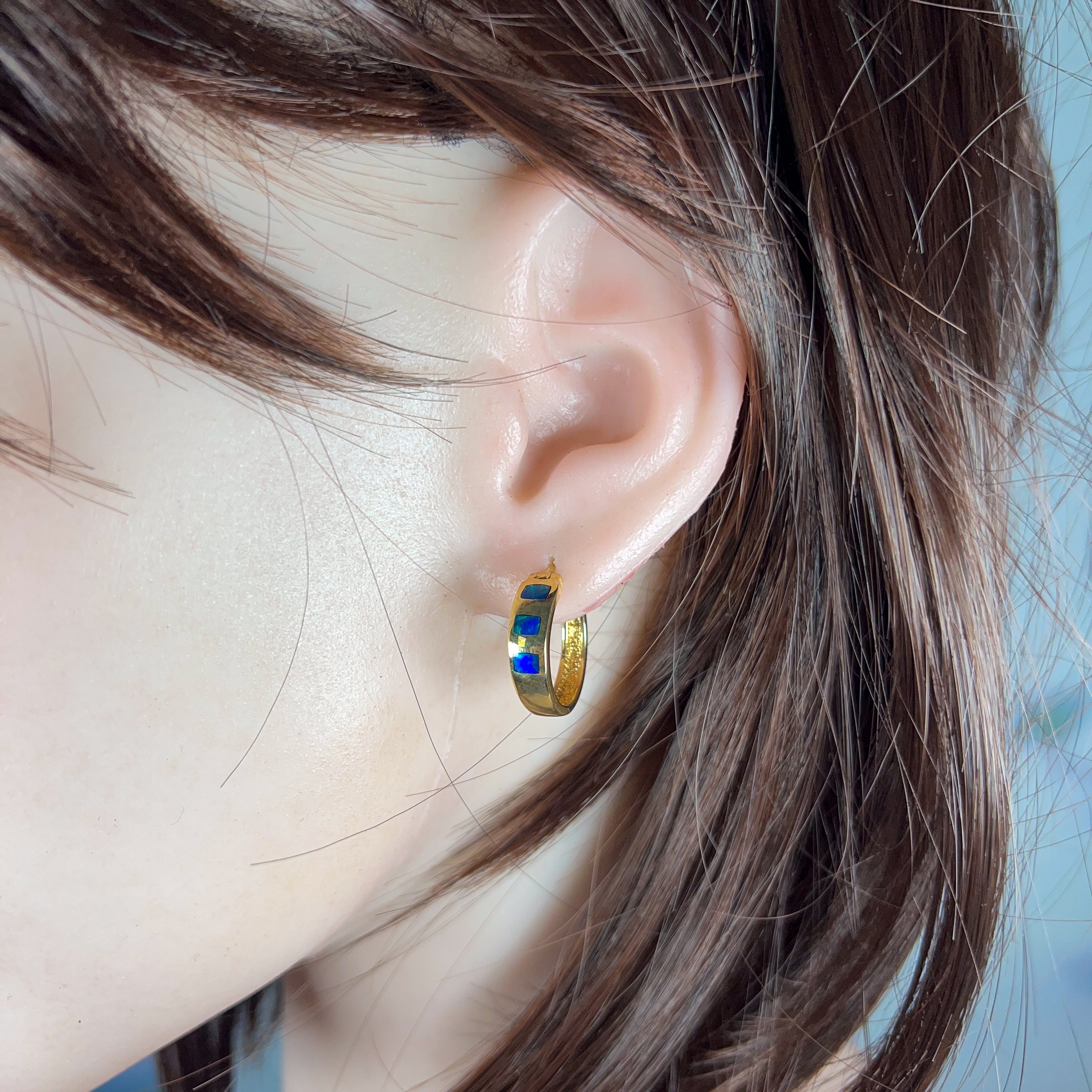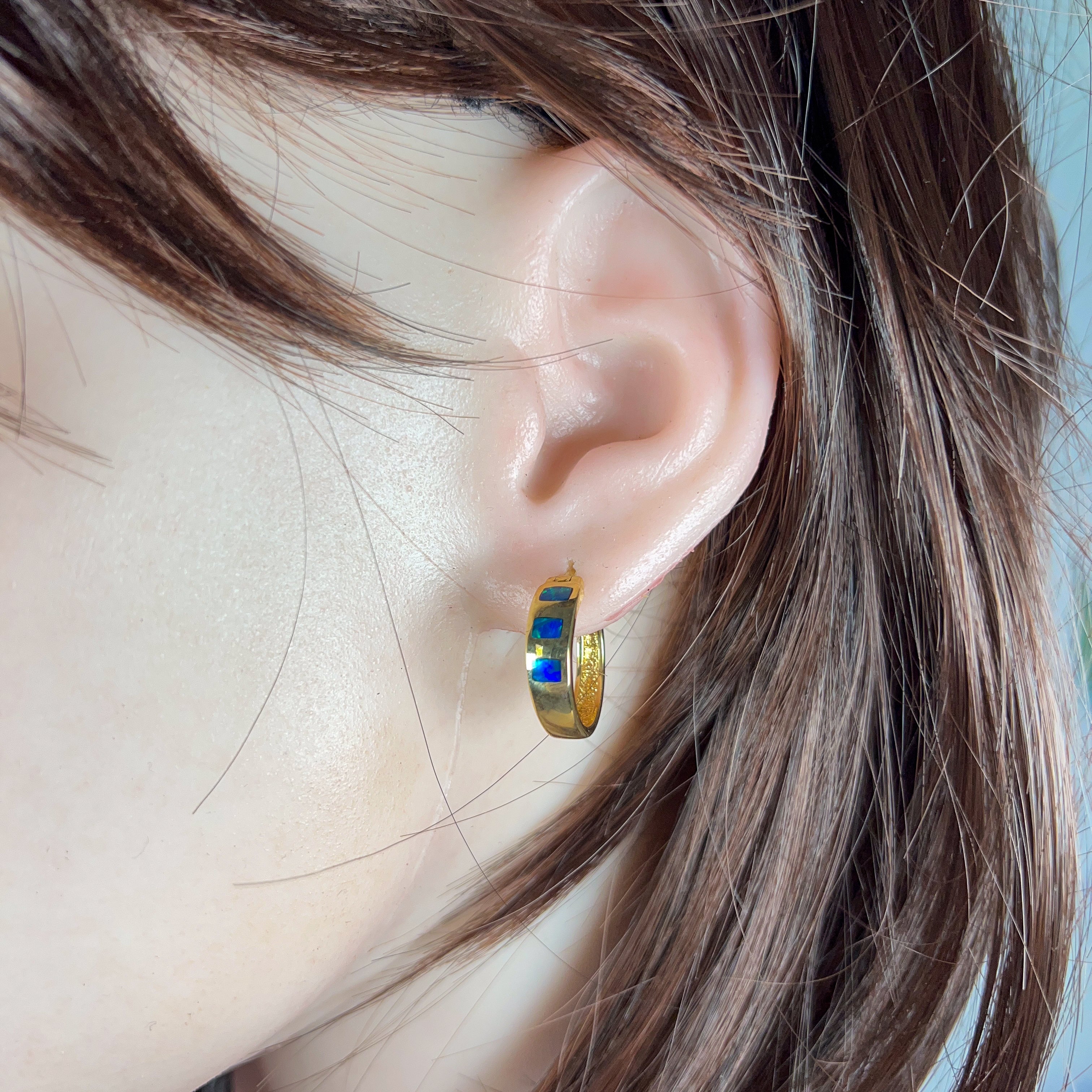 14kt Yellow Gold hoop inlay Opal earrings