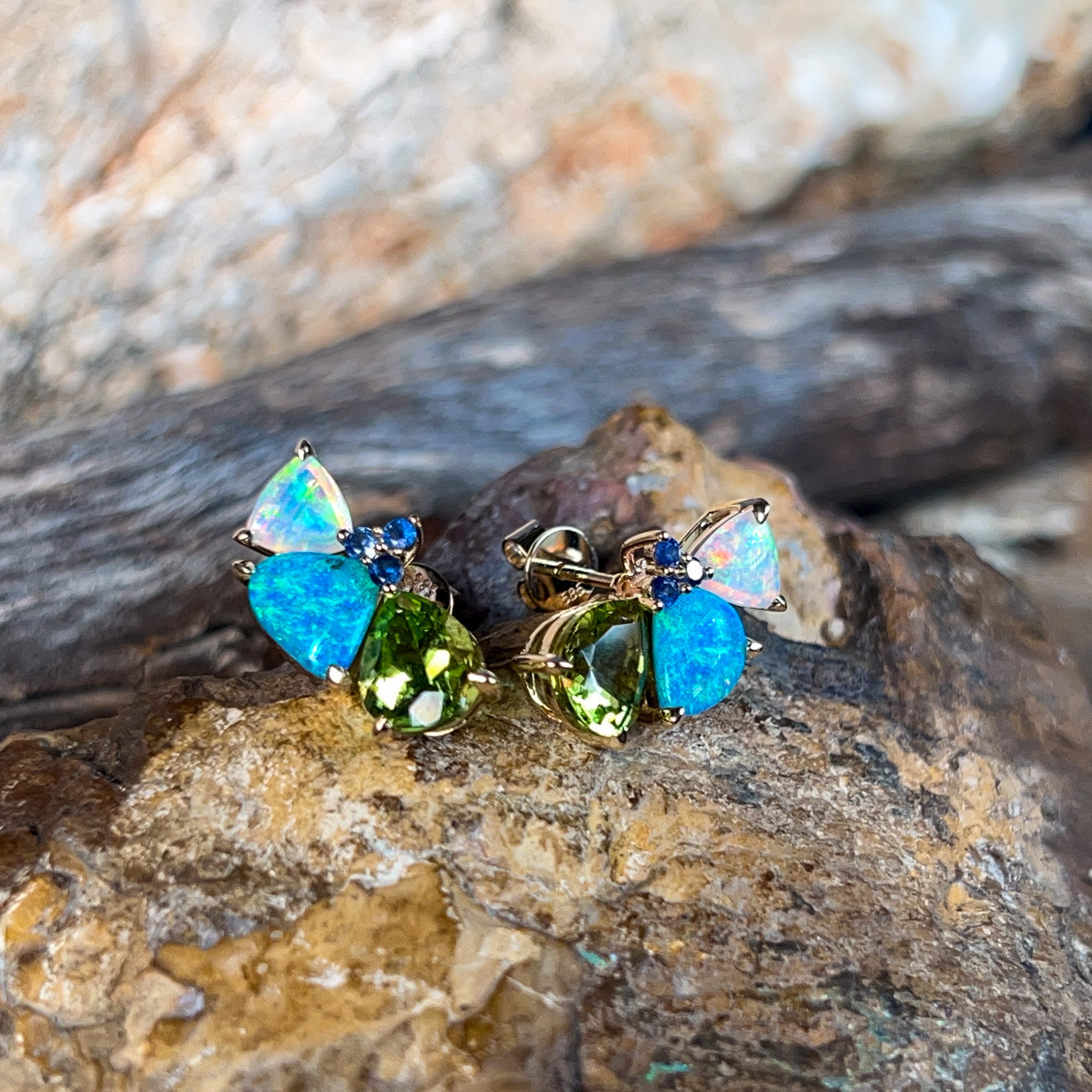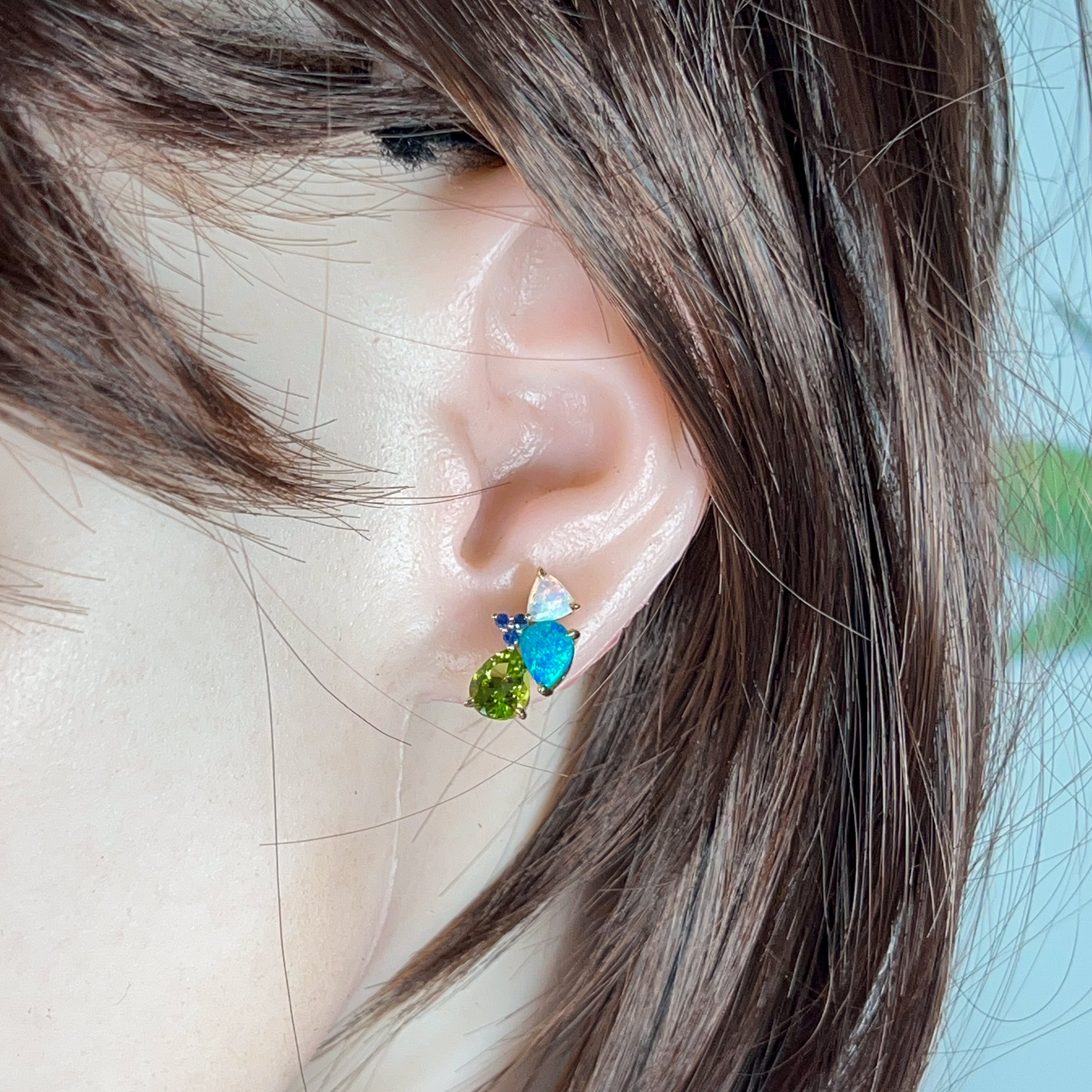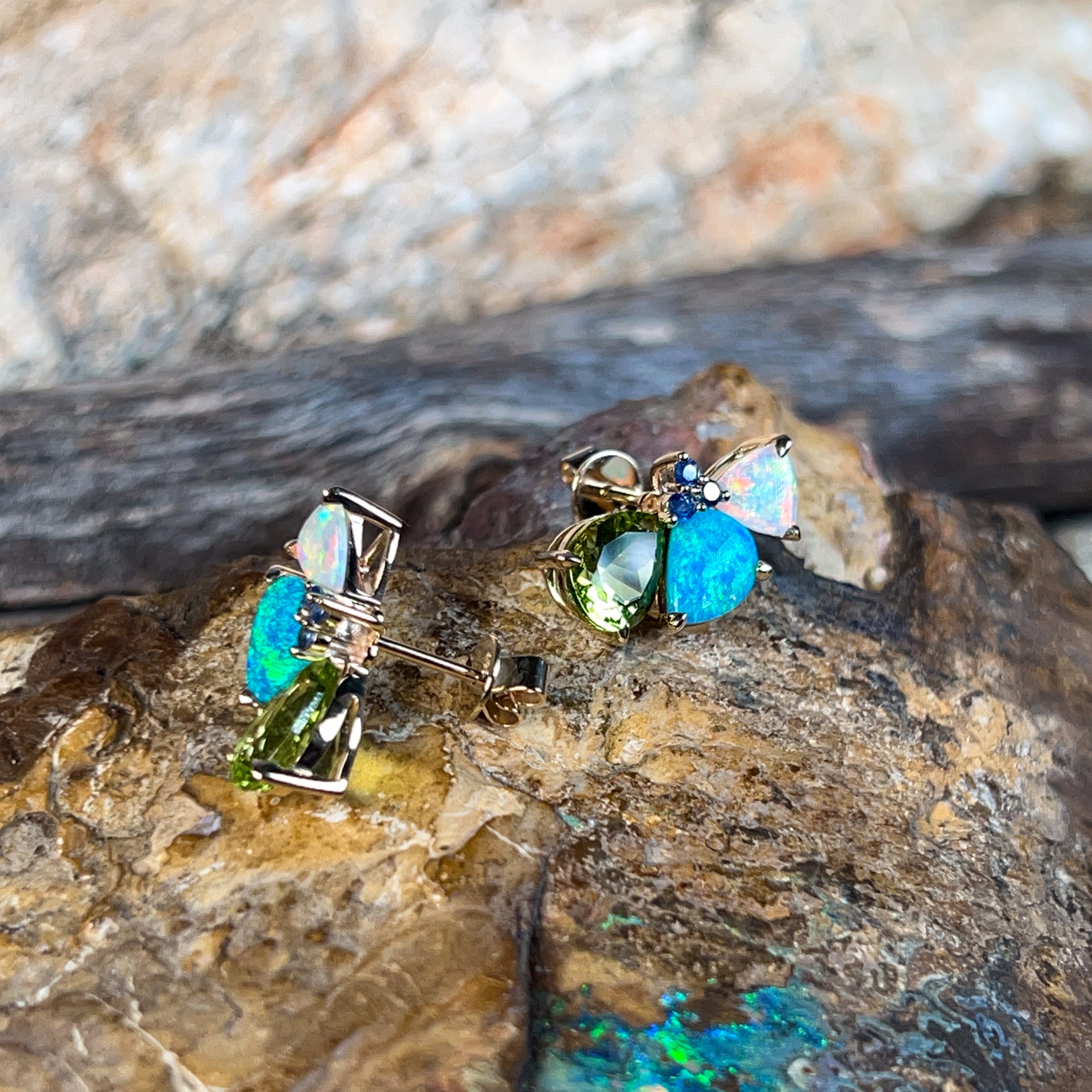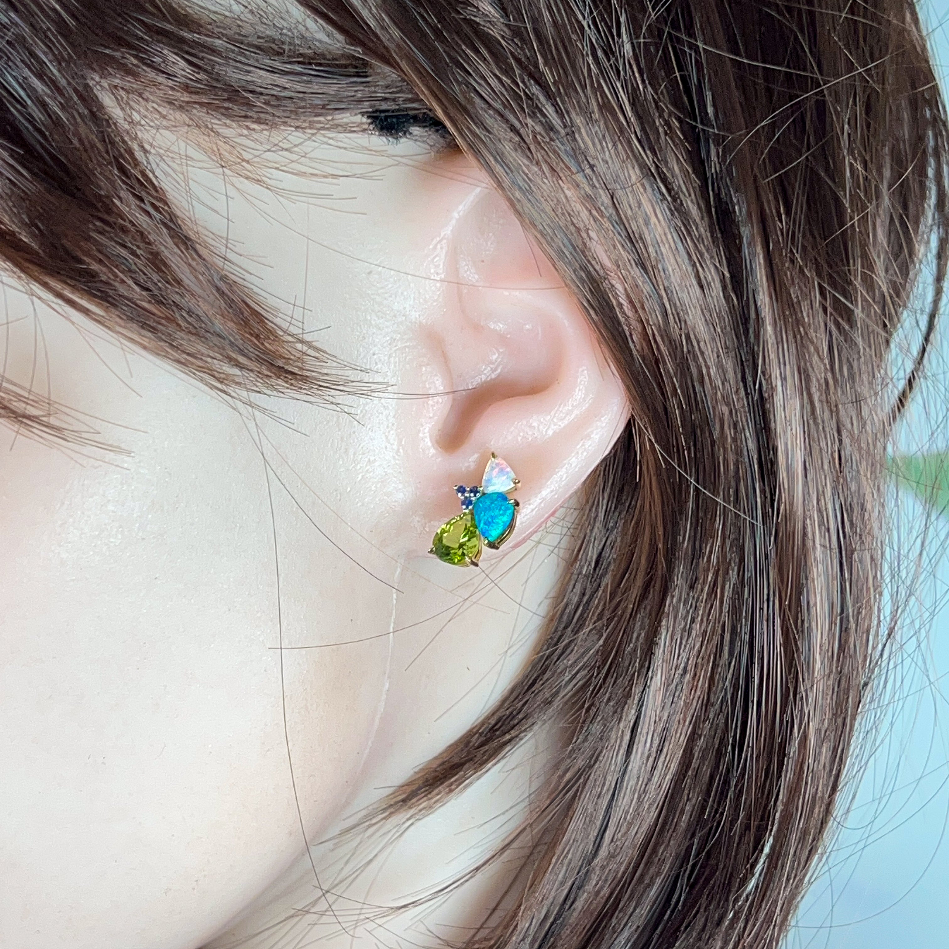14kt Yellow Gold multi colour studs with Opal, Sapphires and Peridot
