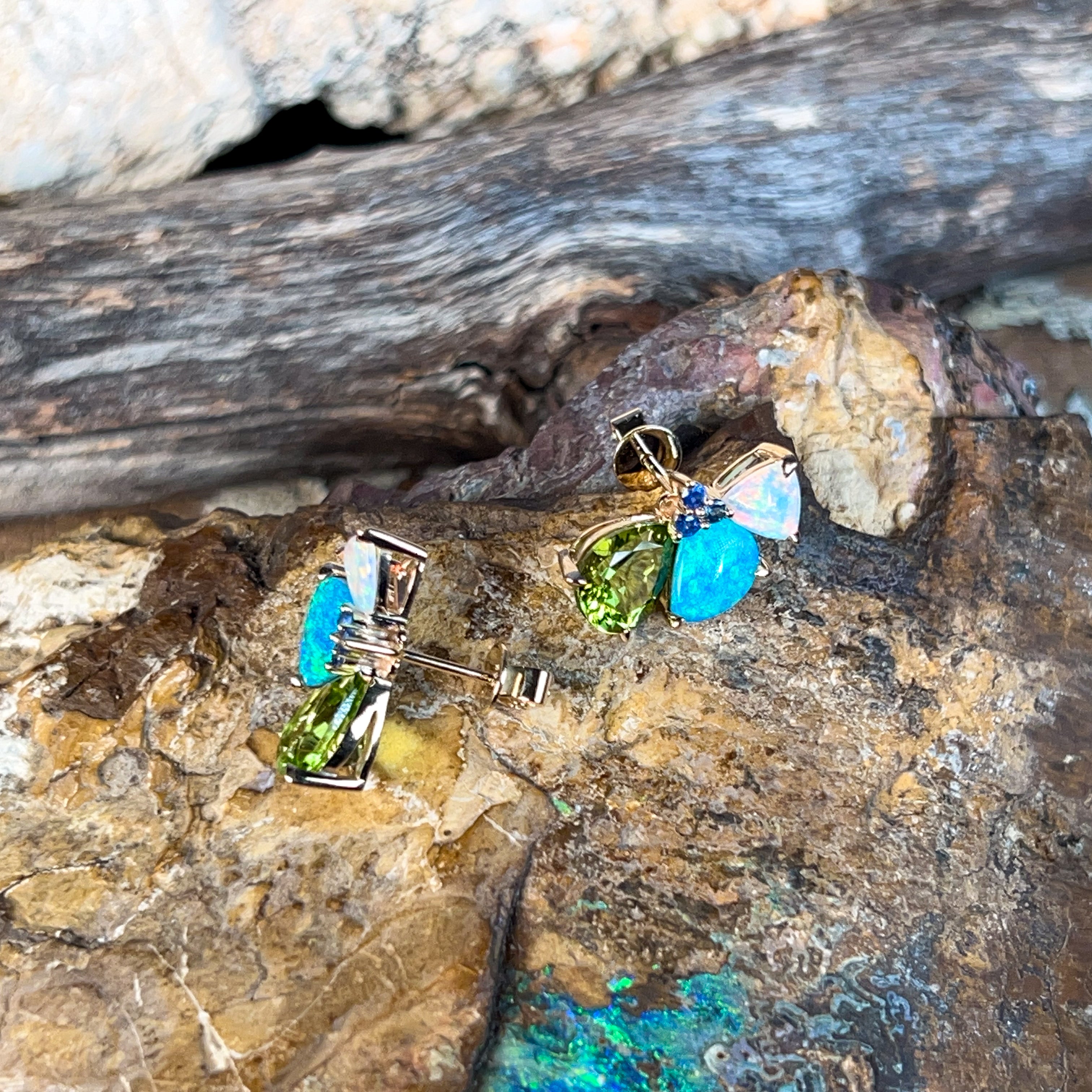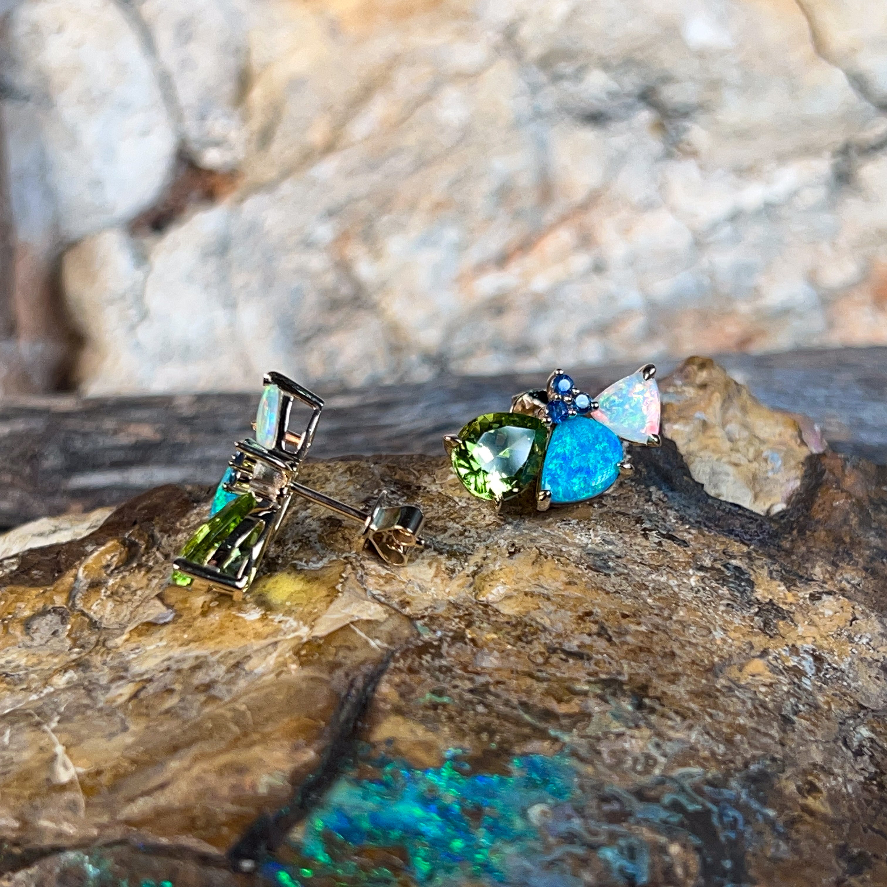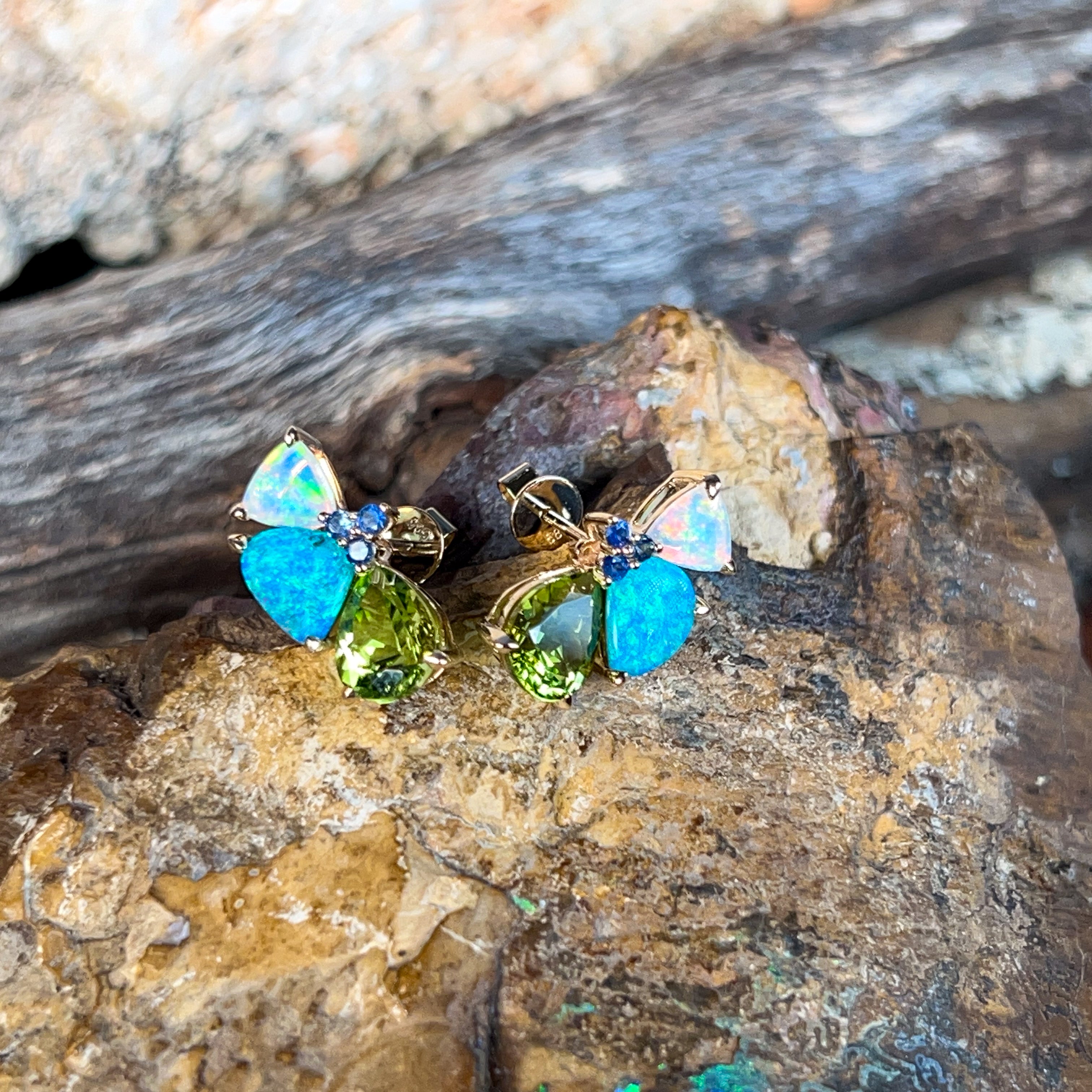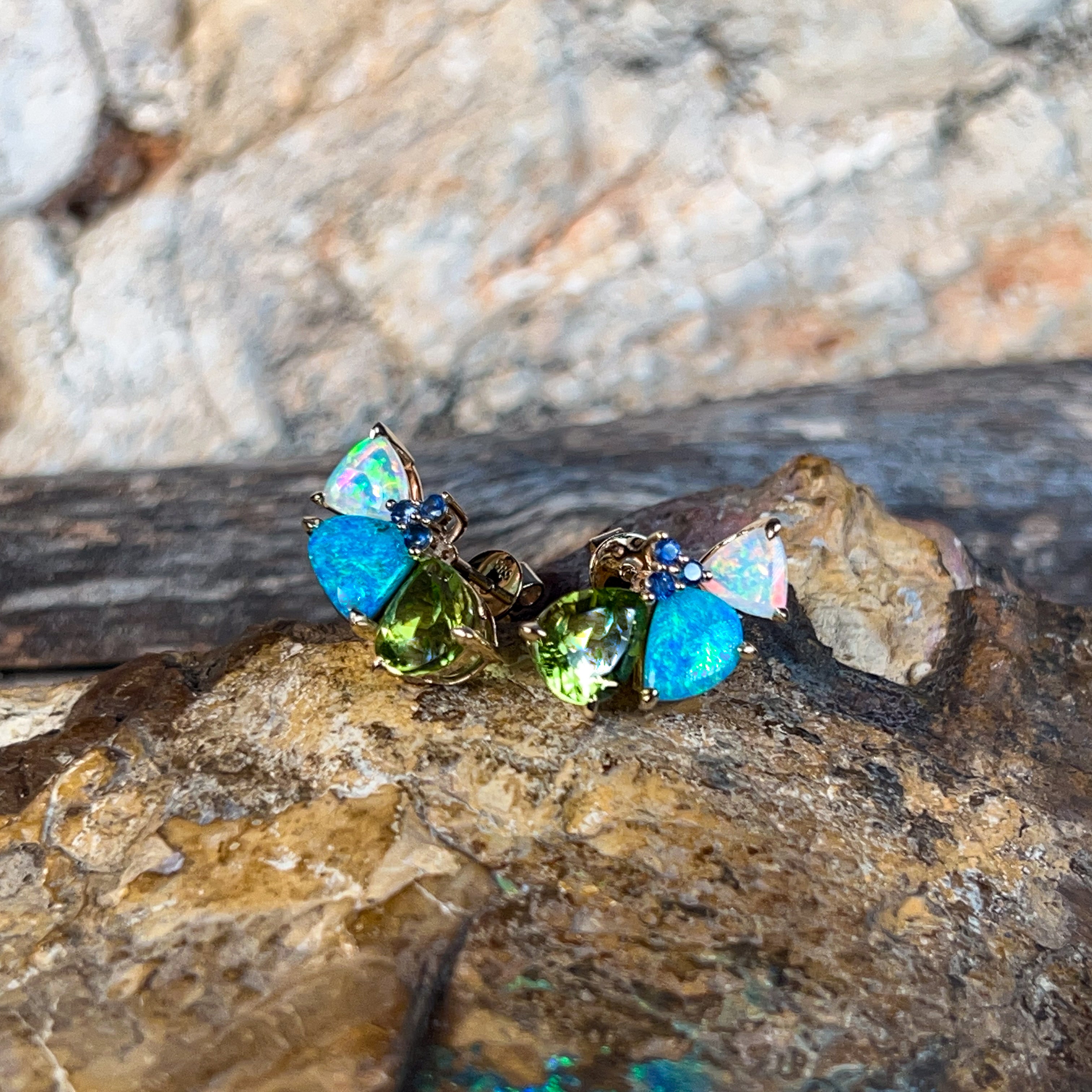 14kt Yellow Gold multi colour studs with Opal, Sapphires and Peridot
