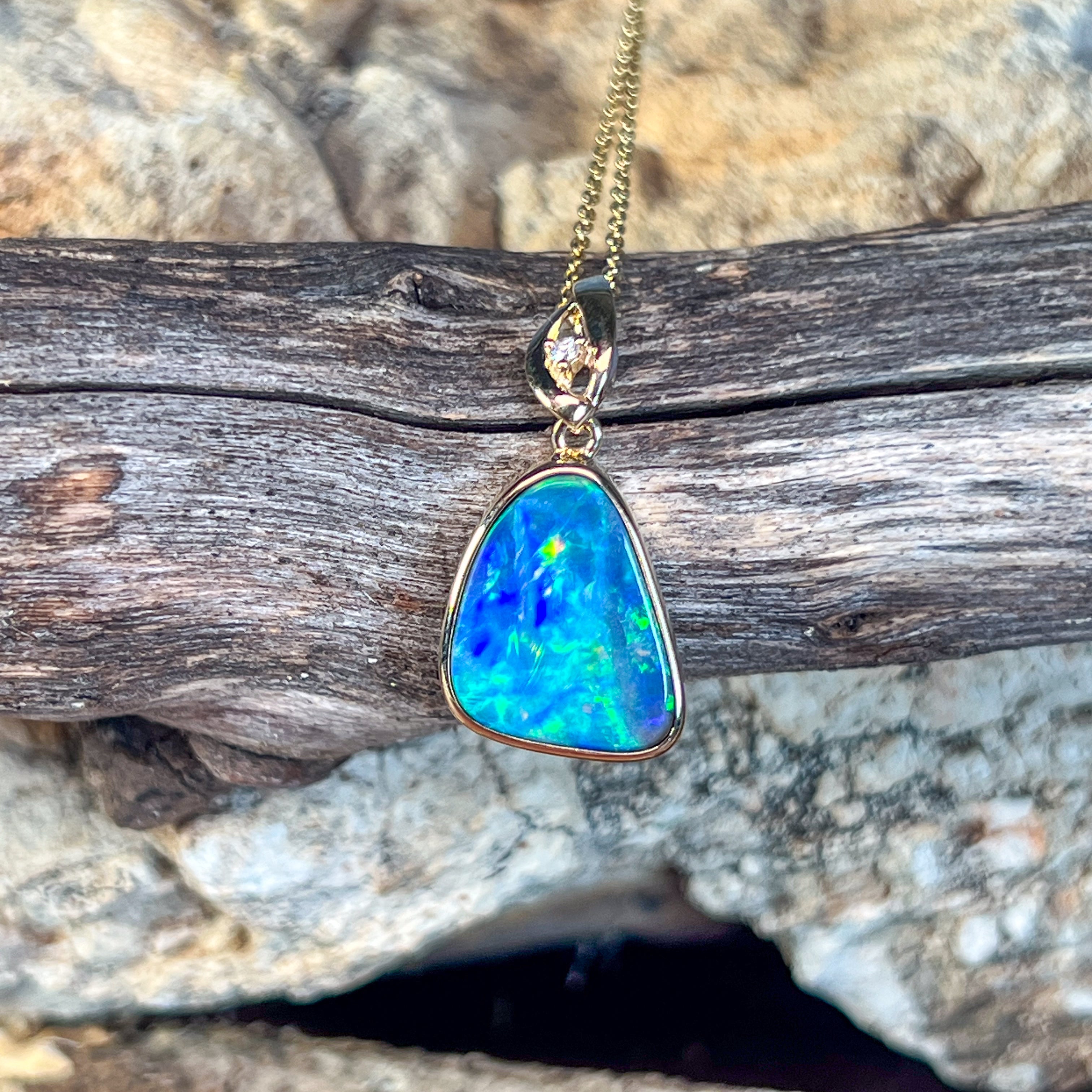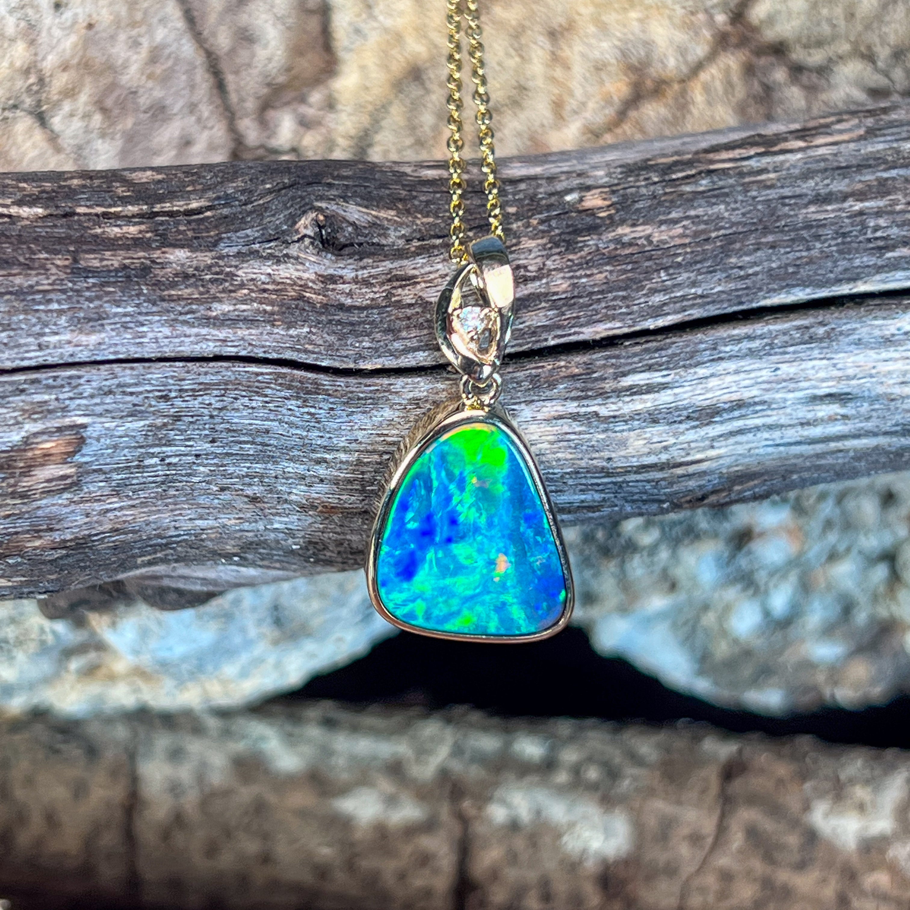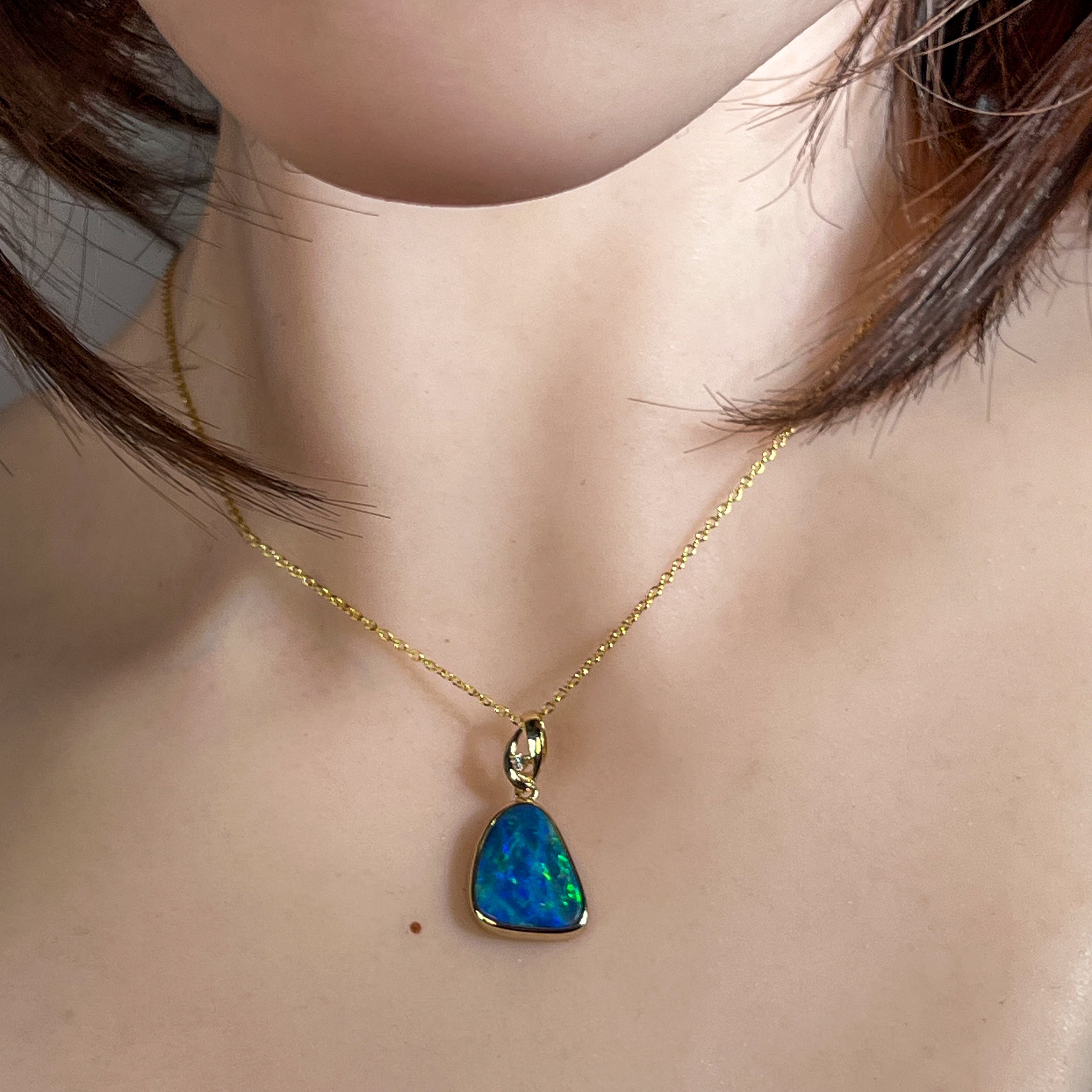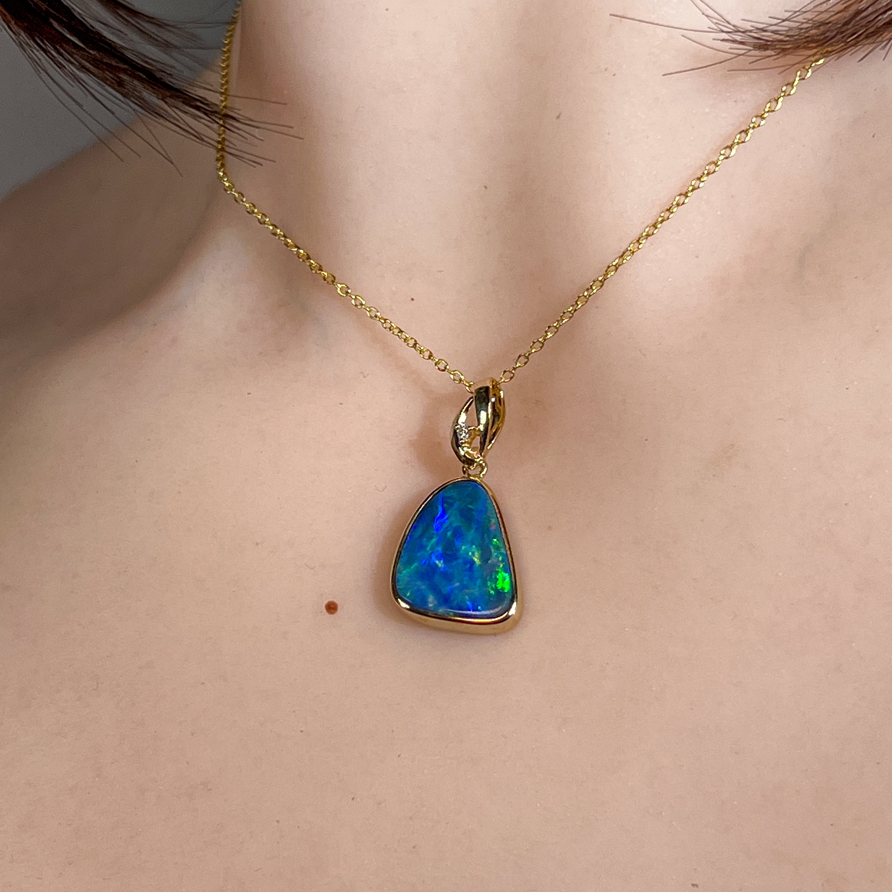 14kt Yellow Gold Opal Doublet Pendant Capture the essence of the ocean with this stunning Australian opal pendant. The freeform doublet opal showcases mesmerising blue and green hues, complemented by flashes of red and yellow that dance across its surface. Set in warm 14kt yellow gold with a classic bezel setting, this piece combines timeless elegance with natural beauty. The 4.4ct opal (17x13mm) is accented with a brilliant diamond (0.02ct, F, VS1) for added sparkle. At just 2.54g and measuring 27x14mm, it's the perfect size for everyday wear or special occasions.